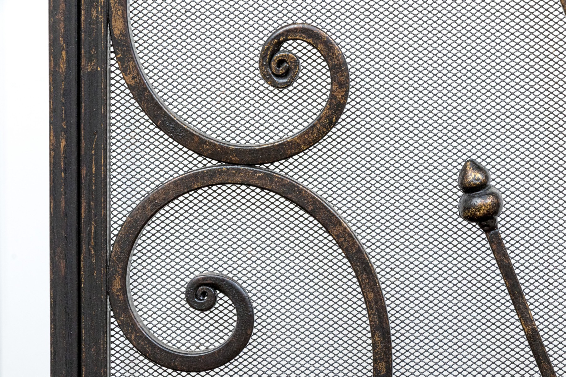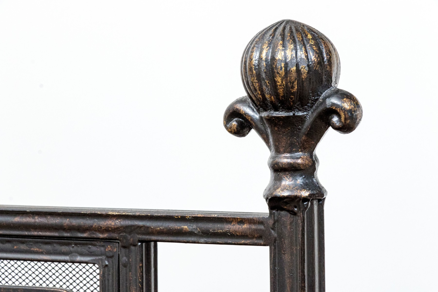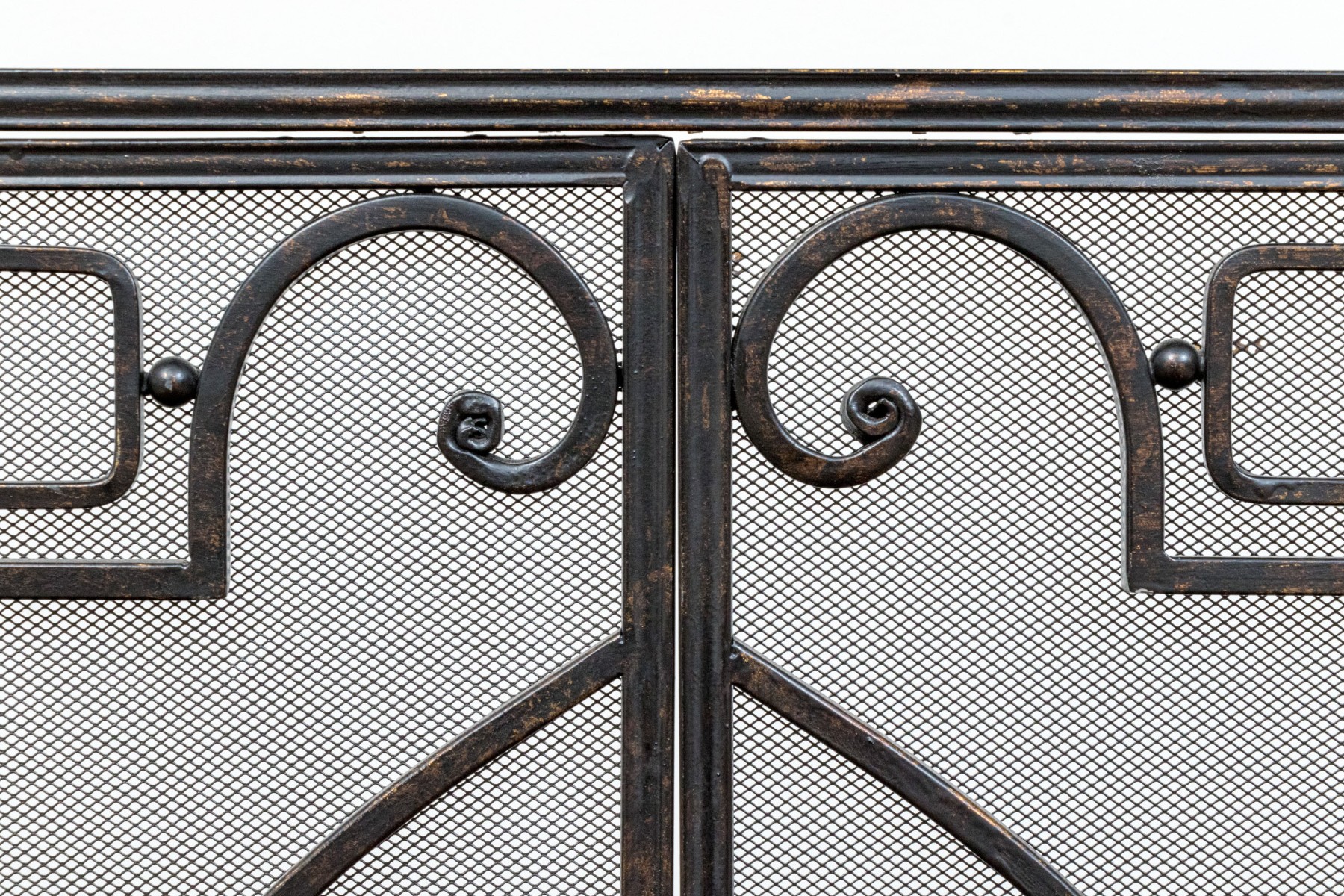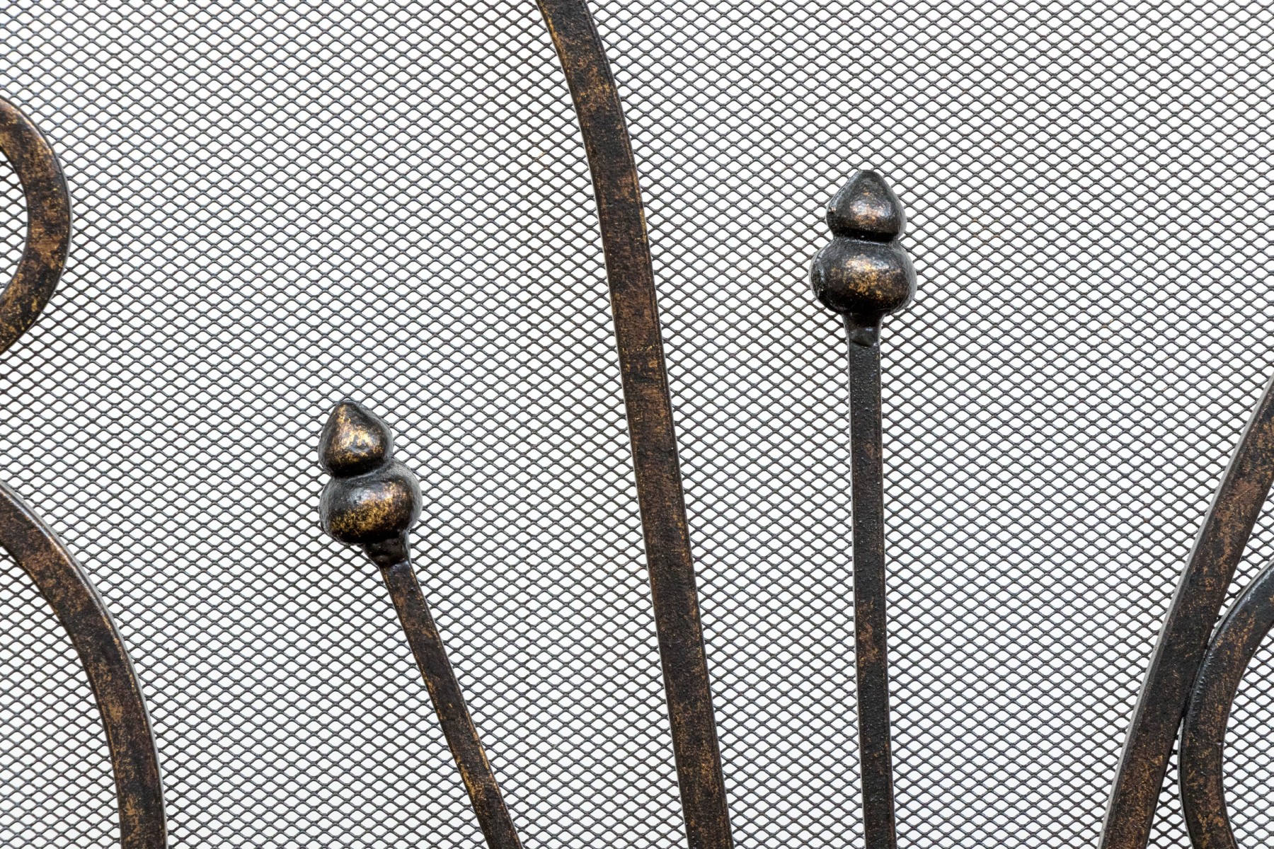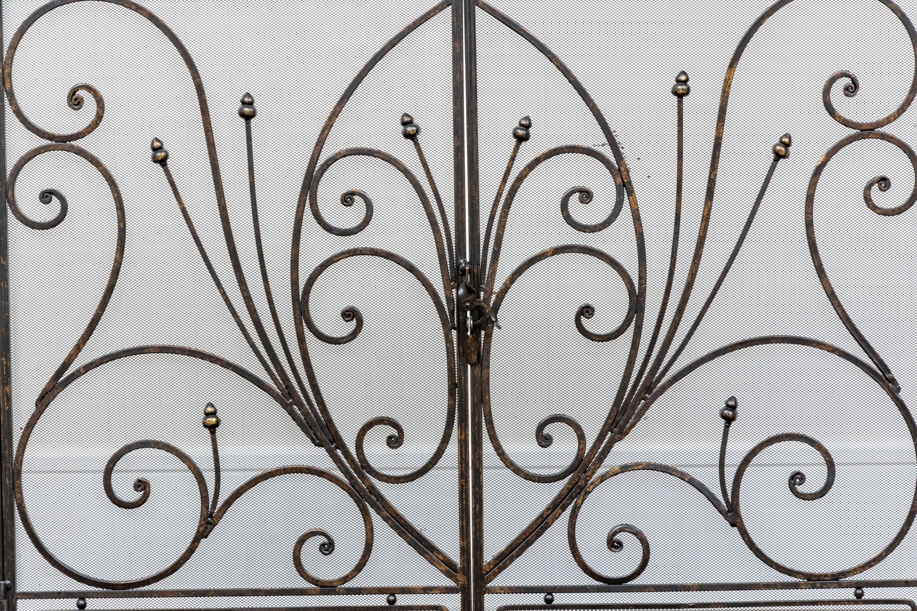 A handsome Art Nouveau style black finished fire spark screen with overlaid scrolling decoration over the mesh interior with a pair of doors that can be opened to access the fireplace when placing more wood in for example.