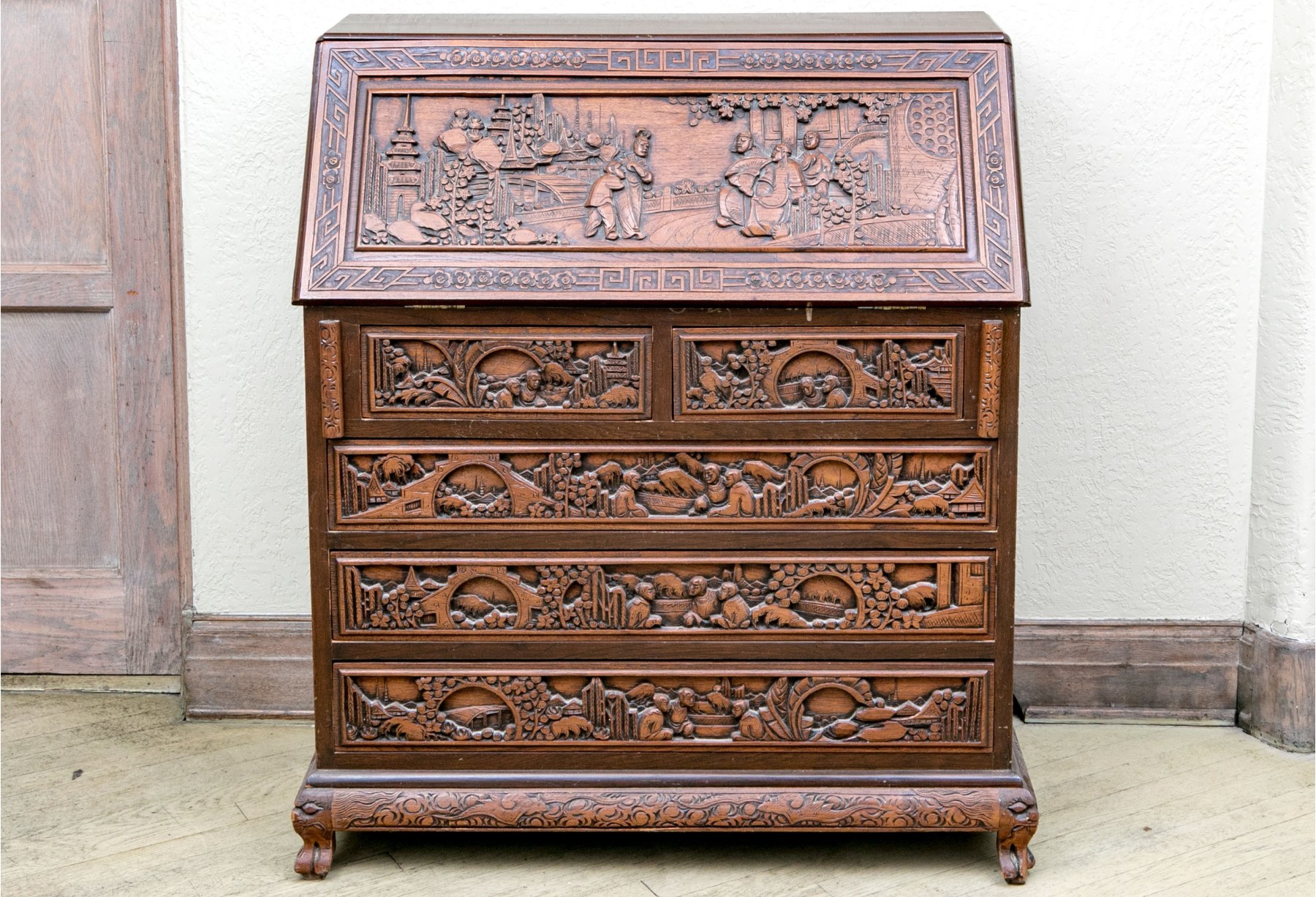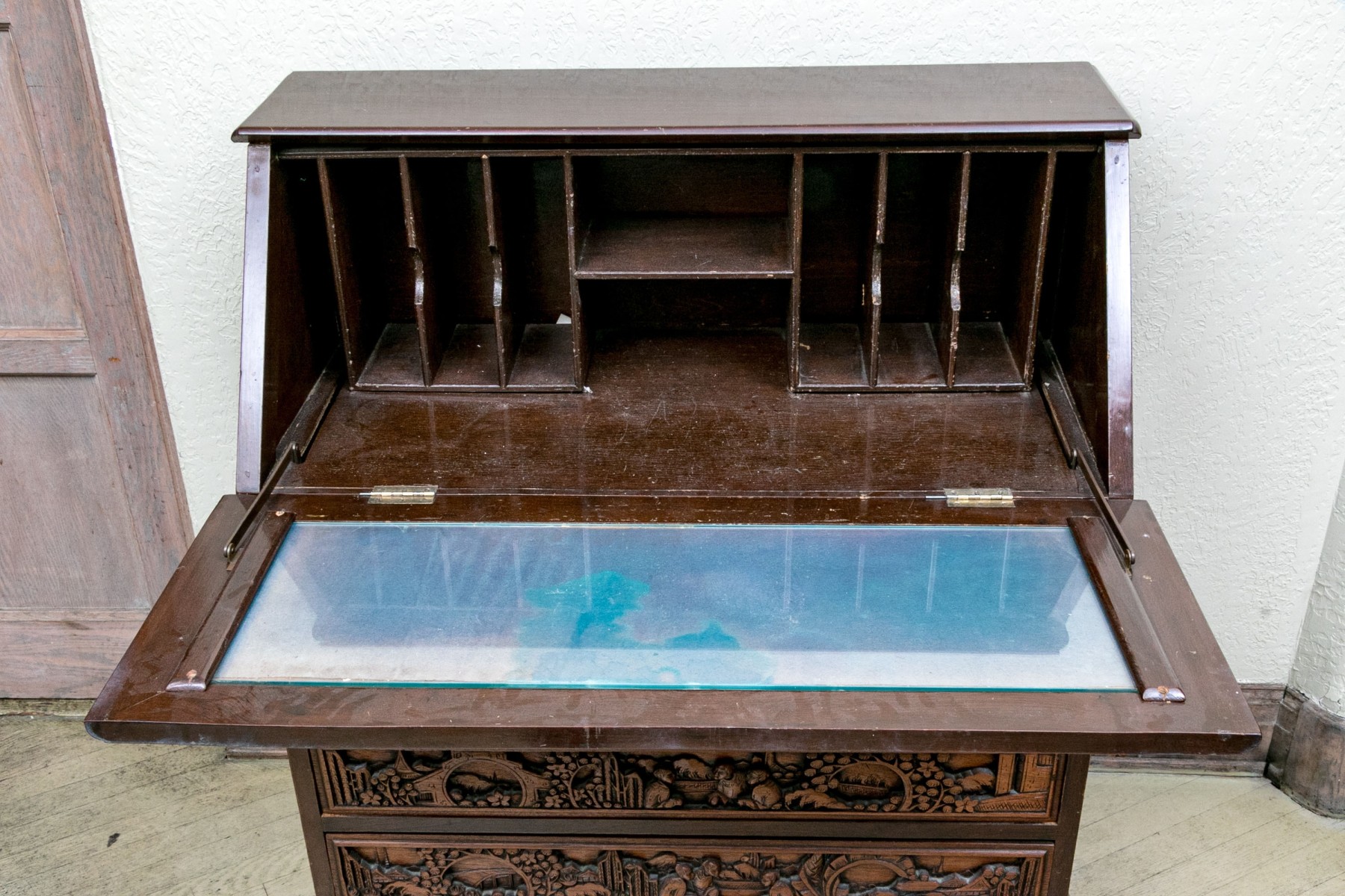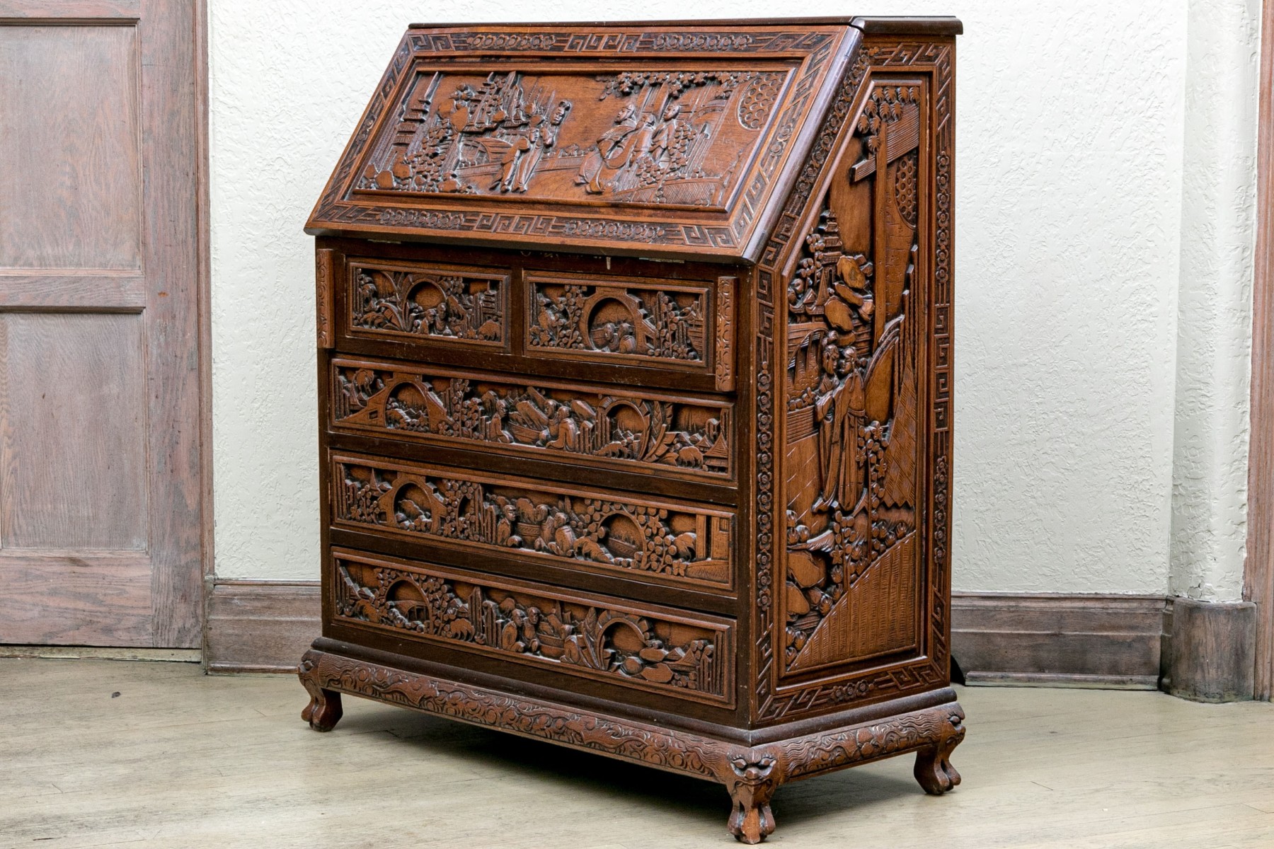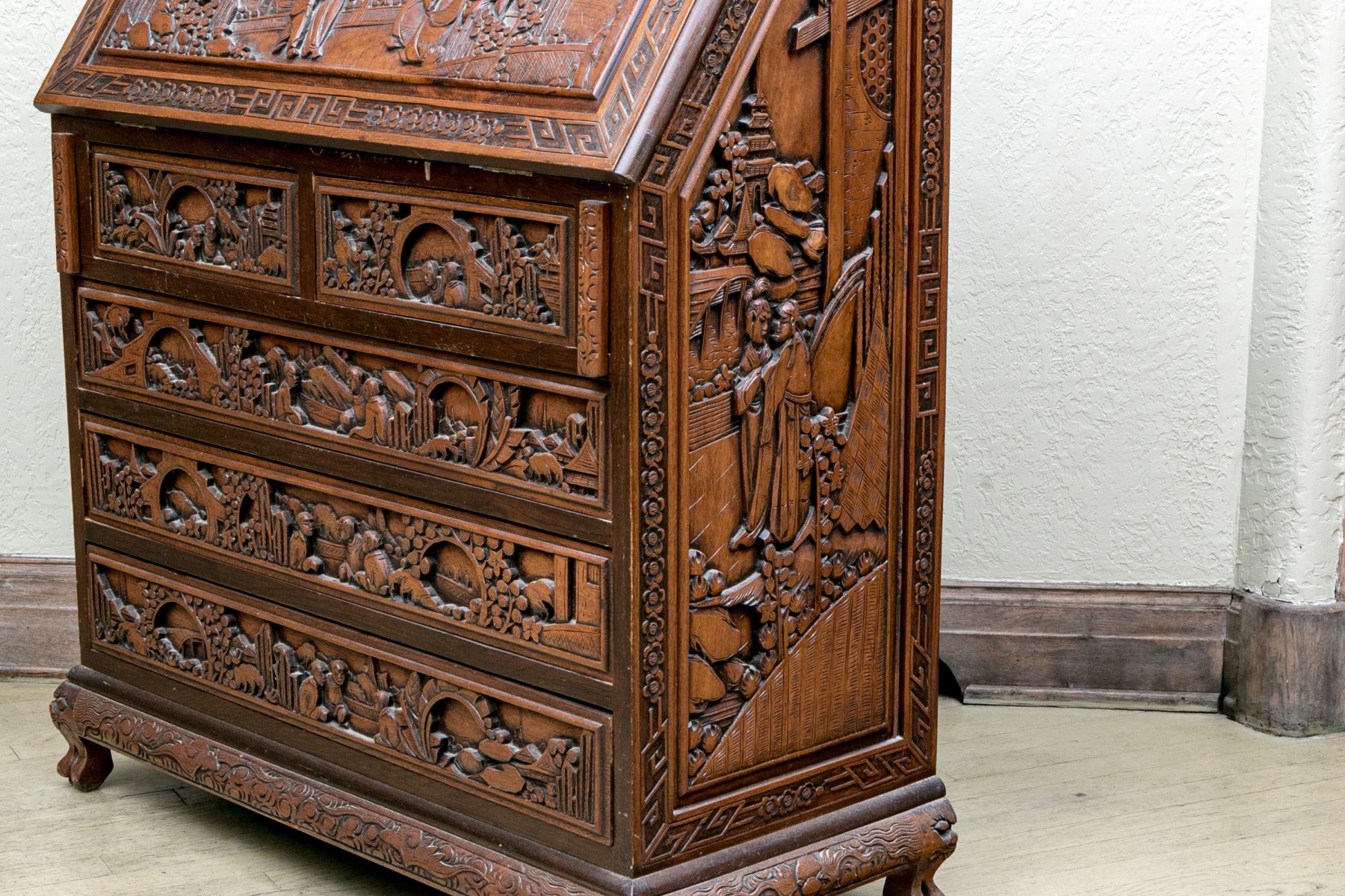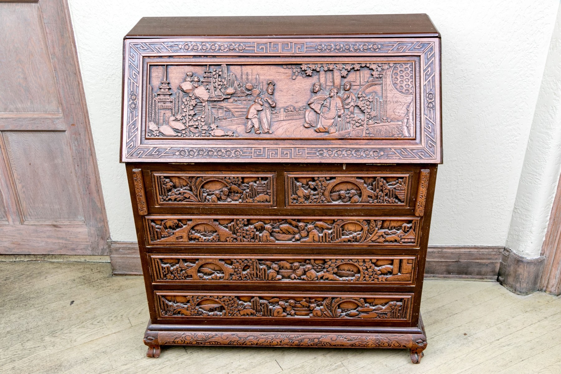 A stunning chinoiserie secretary in honeyed medium brown finished wood, boasting eye-catching carved relief throughout the flip top and five drawers to depict scenes of figues, arched architecture, and lush foliage. The flip top opens to a blue-tinted glass insert and a hutch of slotted compartments, with slide out supports flanking two short drawers over three long drawers. Raised on stout, carved paw feet with figural lion head motifs around the corners.