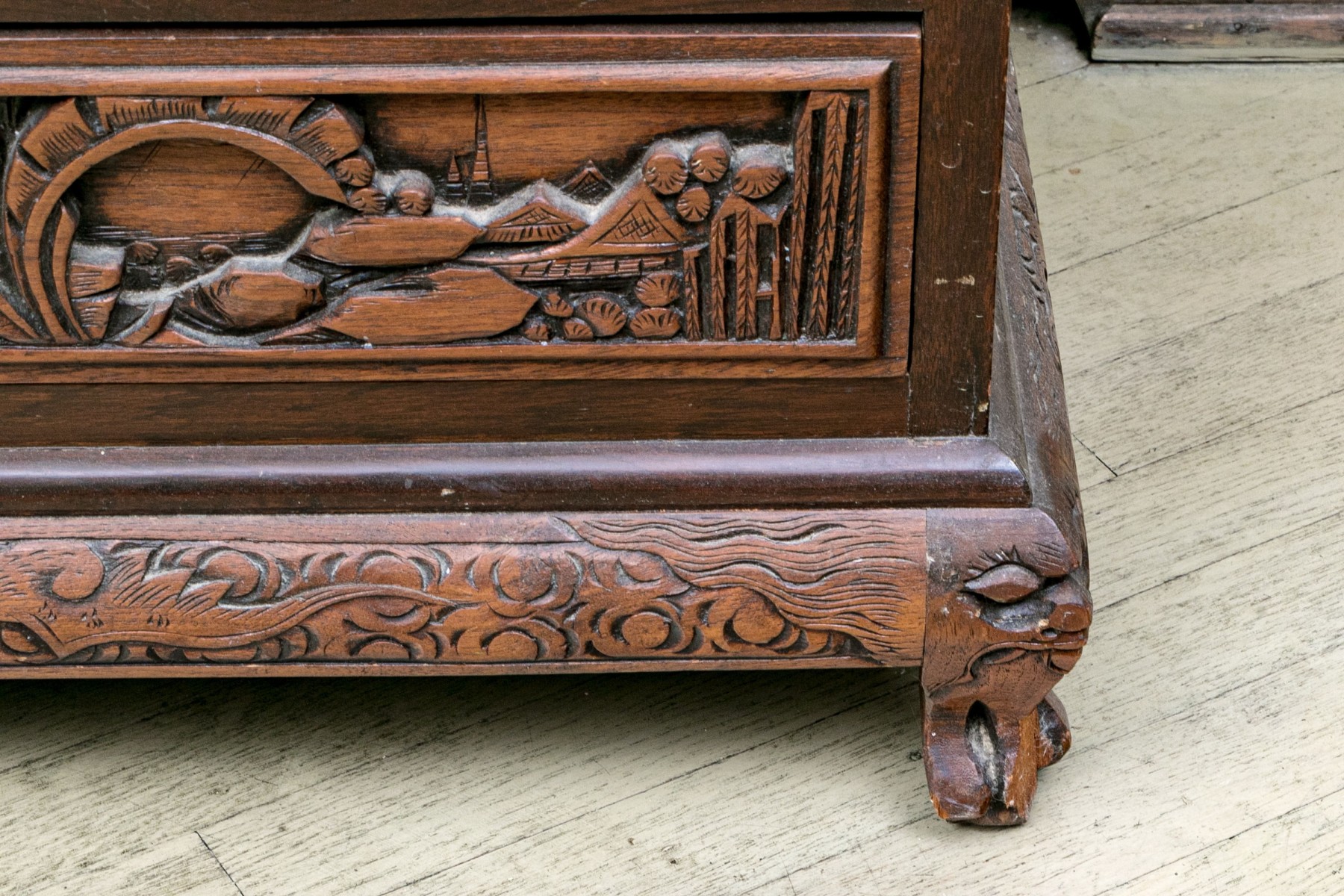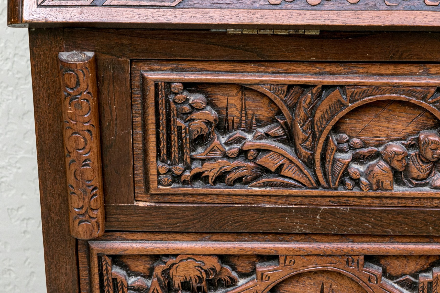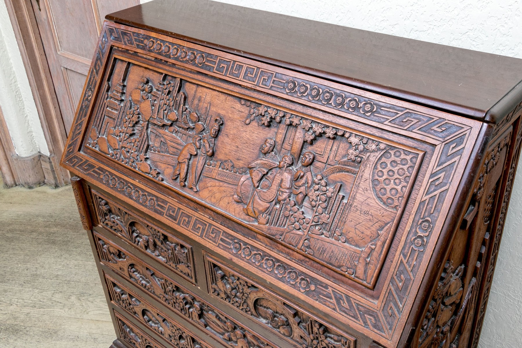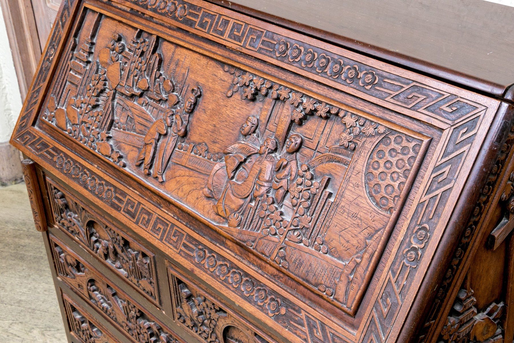 A stunning chinoiserie secretary in honeyed medium brown finished wood, boasting eye-catching carved relief throughout the flip top and five drawers to depict scenes of figues, arched architecture, and lush foliage. The flip top opens to a blue-tinted glass insert and a hutch of slotted compartments, with slide out supports flanking two short drawers over three long drawers. Raised on stout, carved paw feet with figural lion head motifs around the corners.