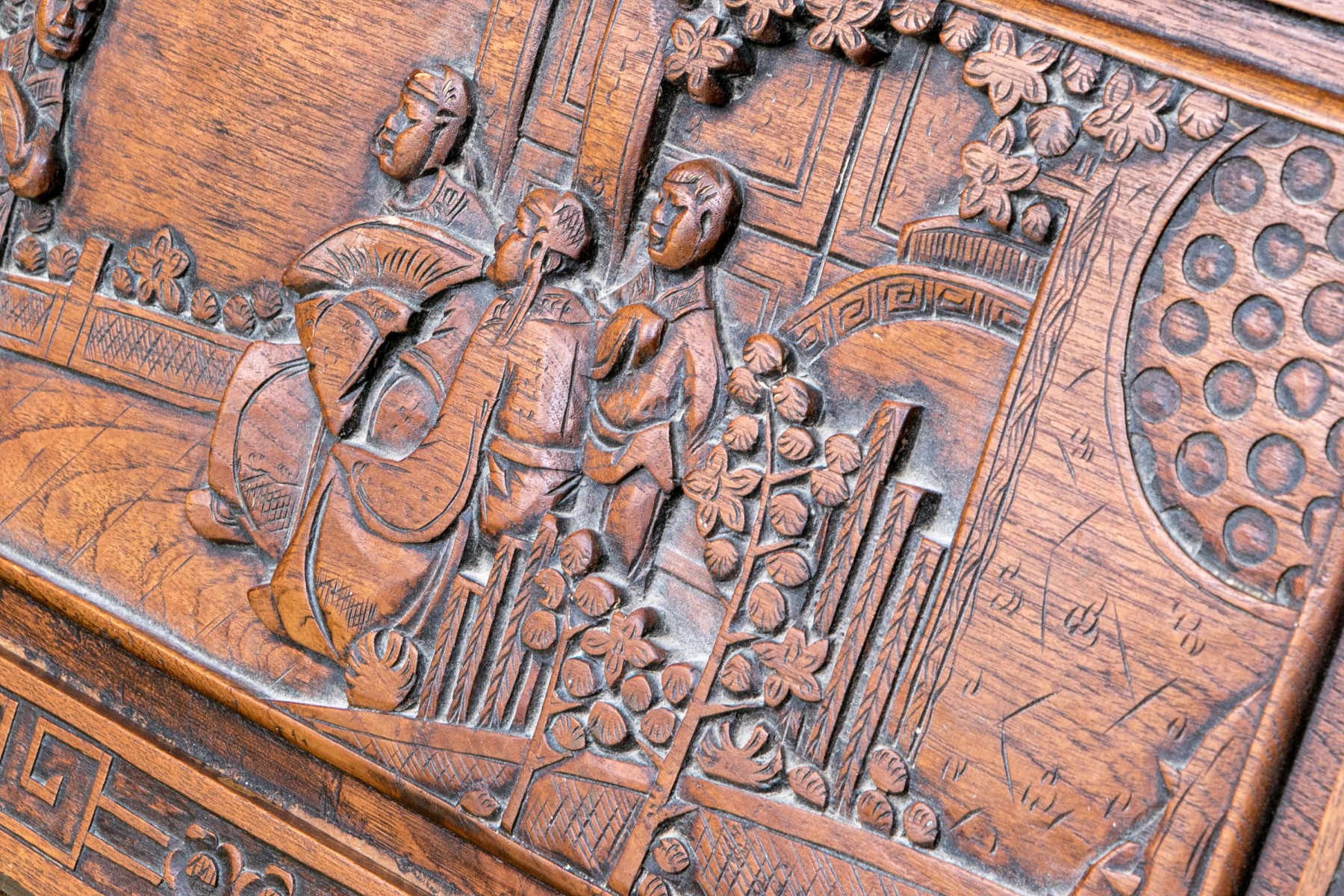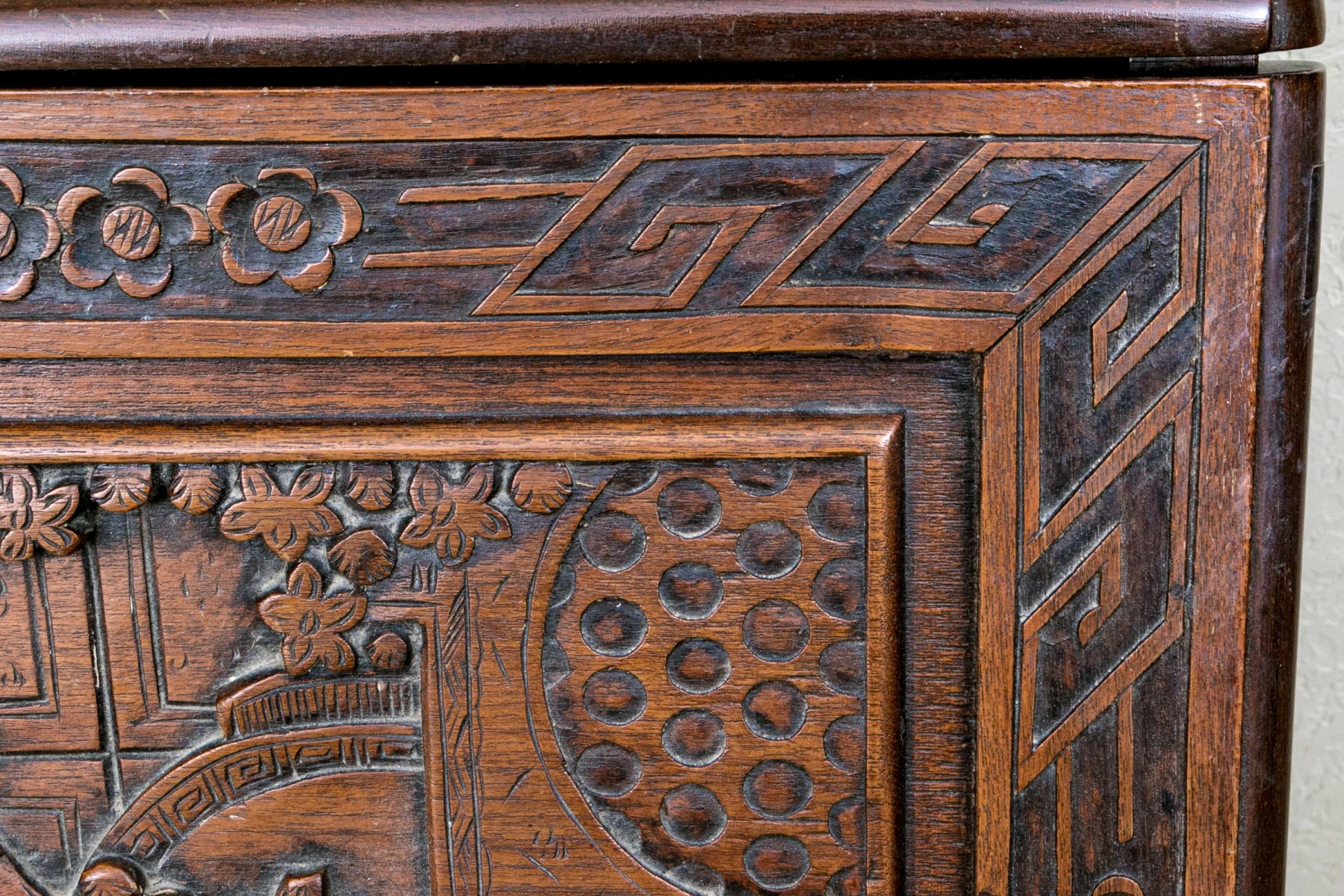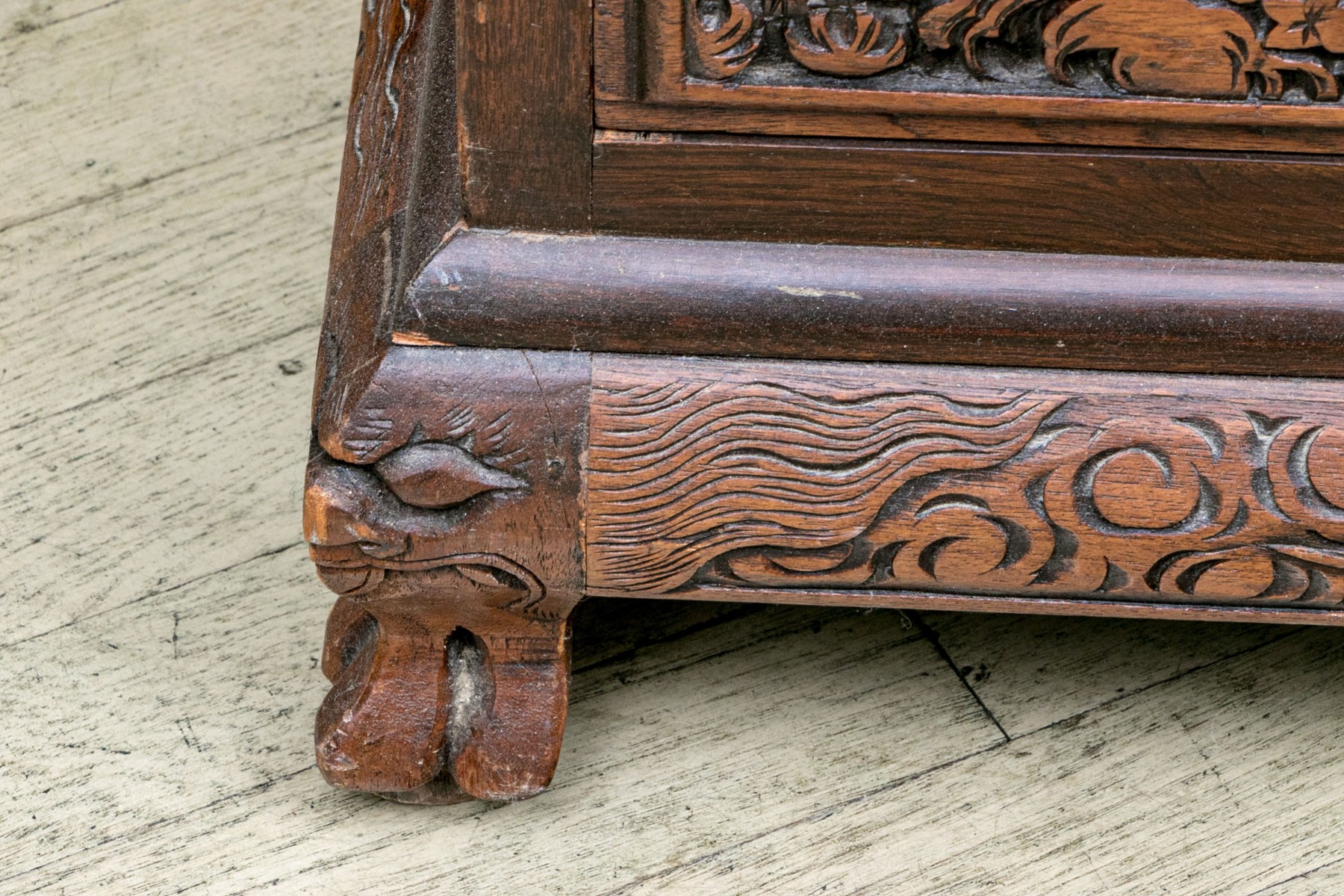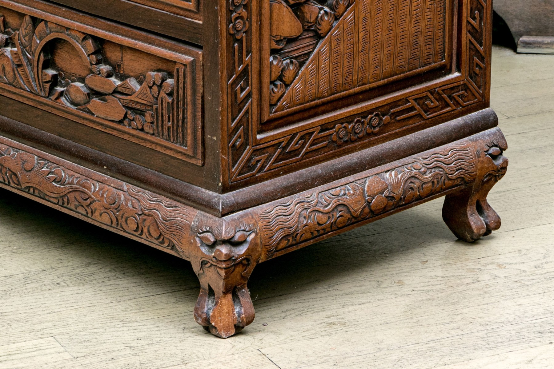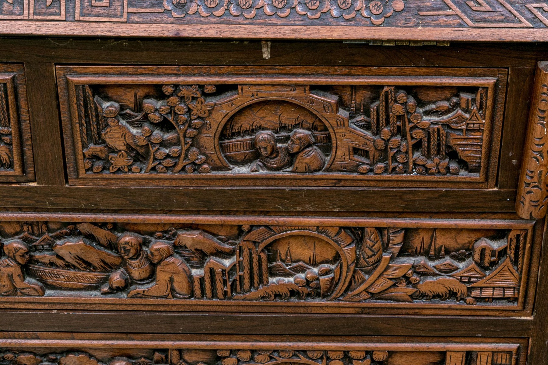 A stunning chinoiserie secretary in honeyed medium brown finished wood, boasting eye-catching carved relief throughout the flip top and five drawers to depict scenes of figues, arched architecture, and lush foliage. The flip top opens to a blue-tinted glass insert and a hutch of slotted compartments, with slide out supports flanking two short drawers over three long drawers. Raised on stout, carved paw feet with figural lion head motifs around the corners.