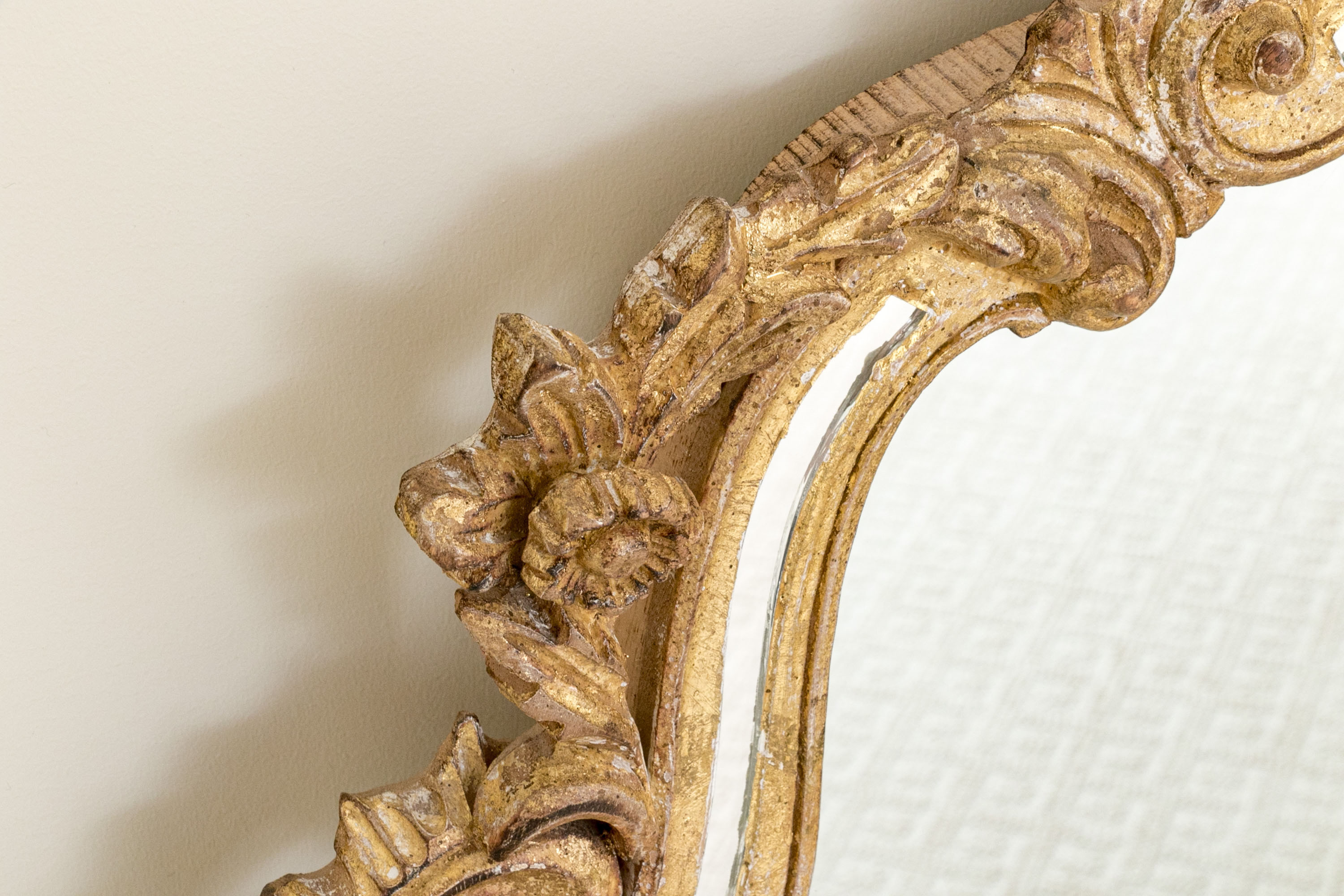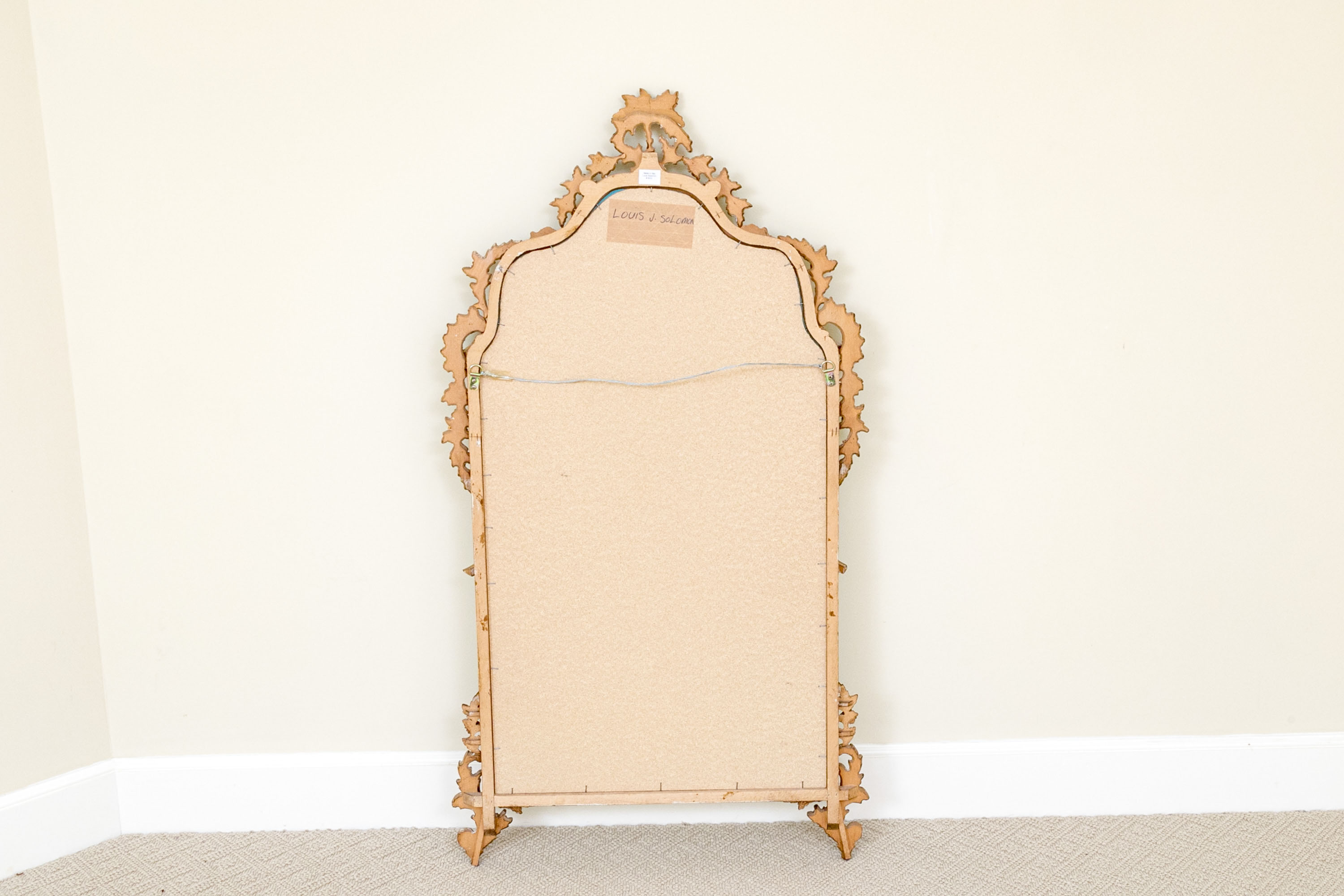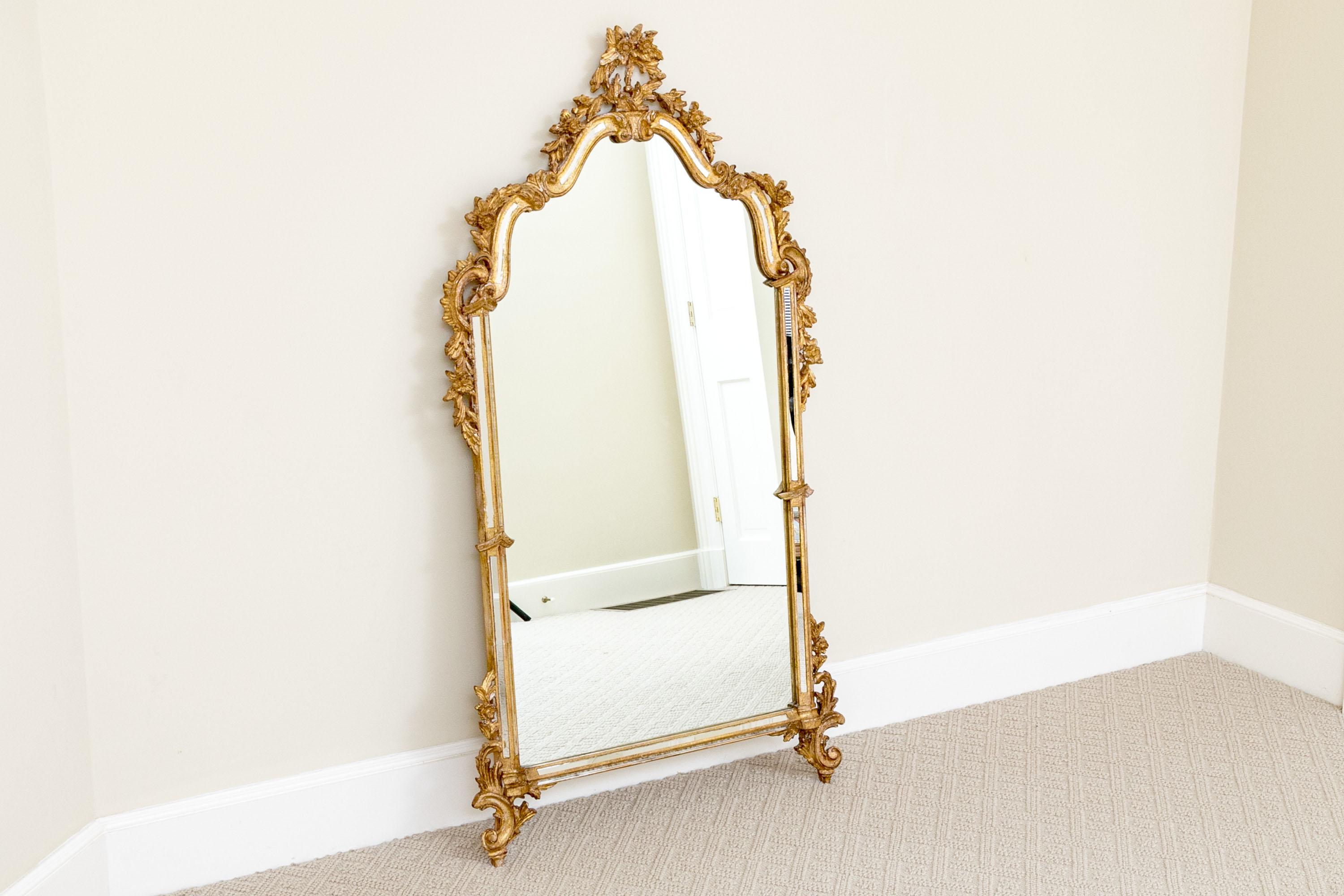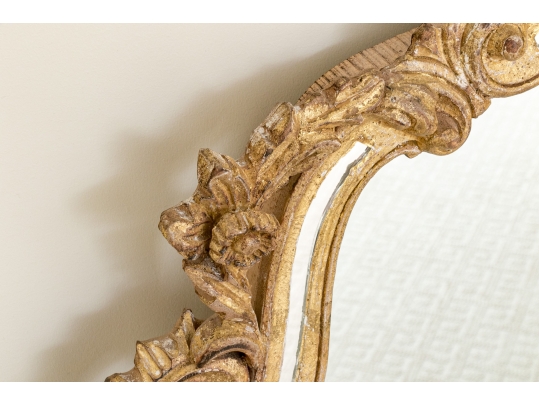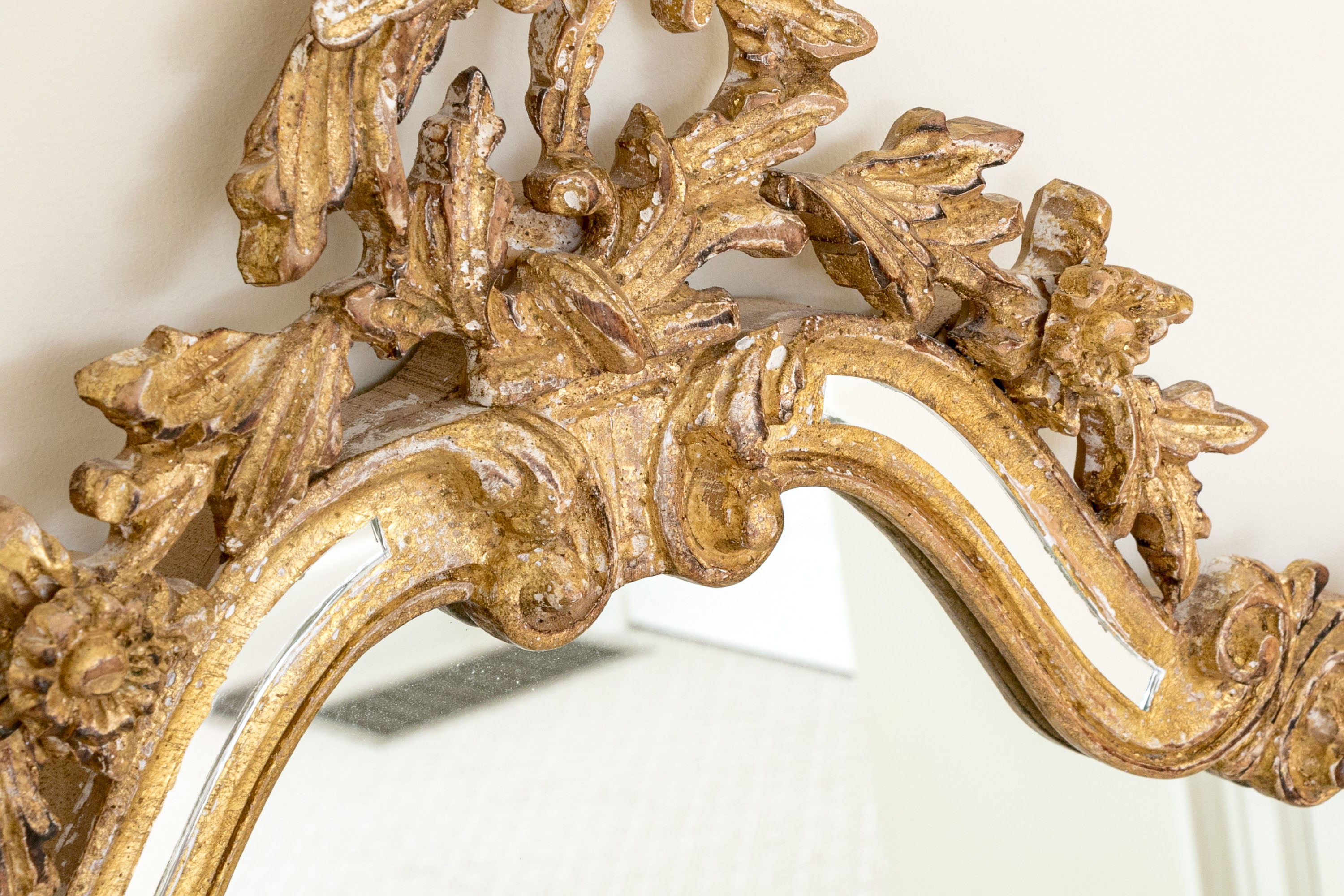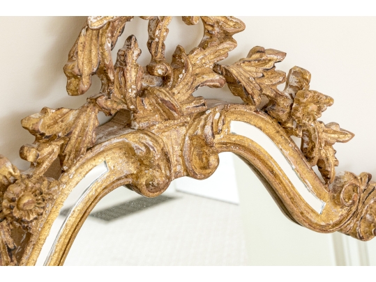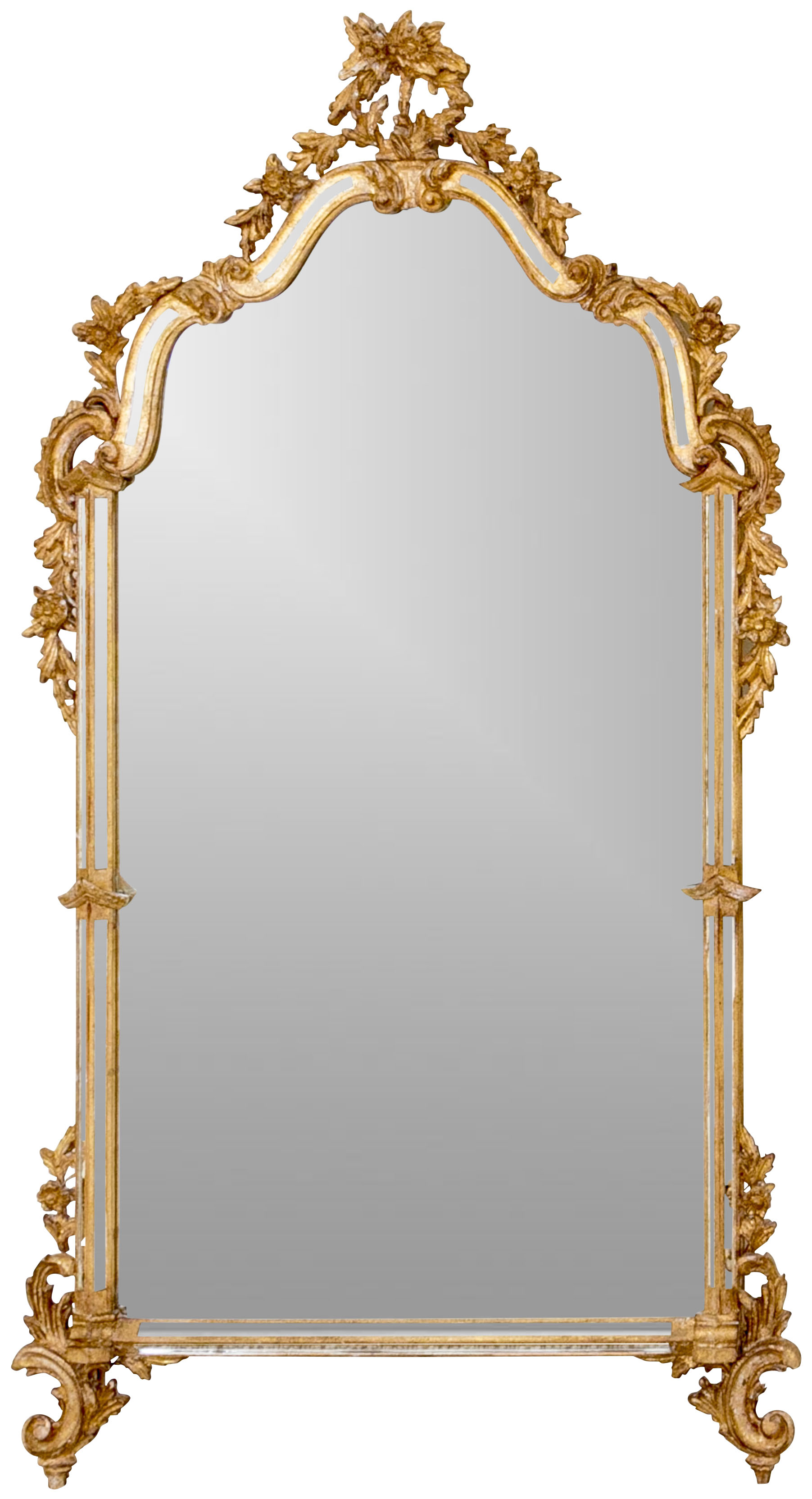 A stunning Italian Louis J. Solomon mirror in Baroque design, displaying a scalloped top arch with mirror paneling along a border surrounded by ornate carved giltwood with foliate flourishes and scrolled relief. Topped with a large floral crest at the center top and finished with scrolled feet at the bottom corners, creating a truly marvelous and elegant display.