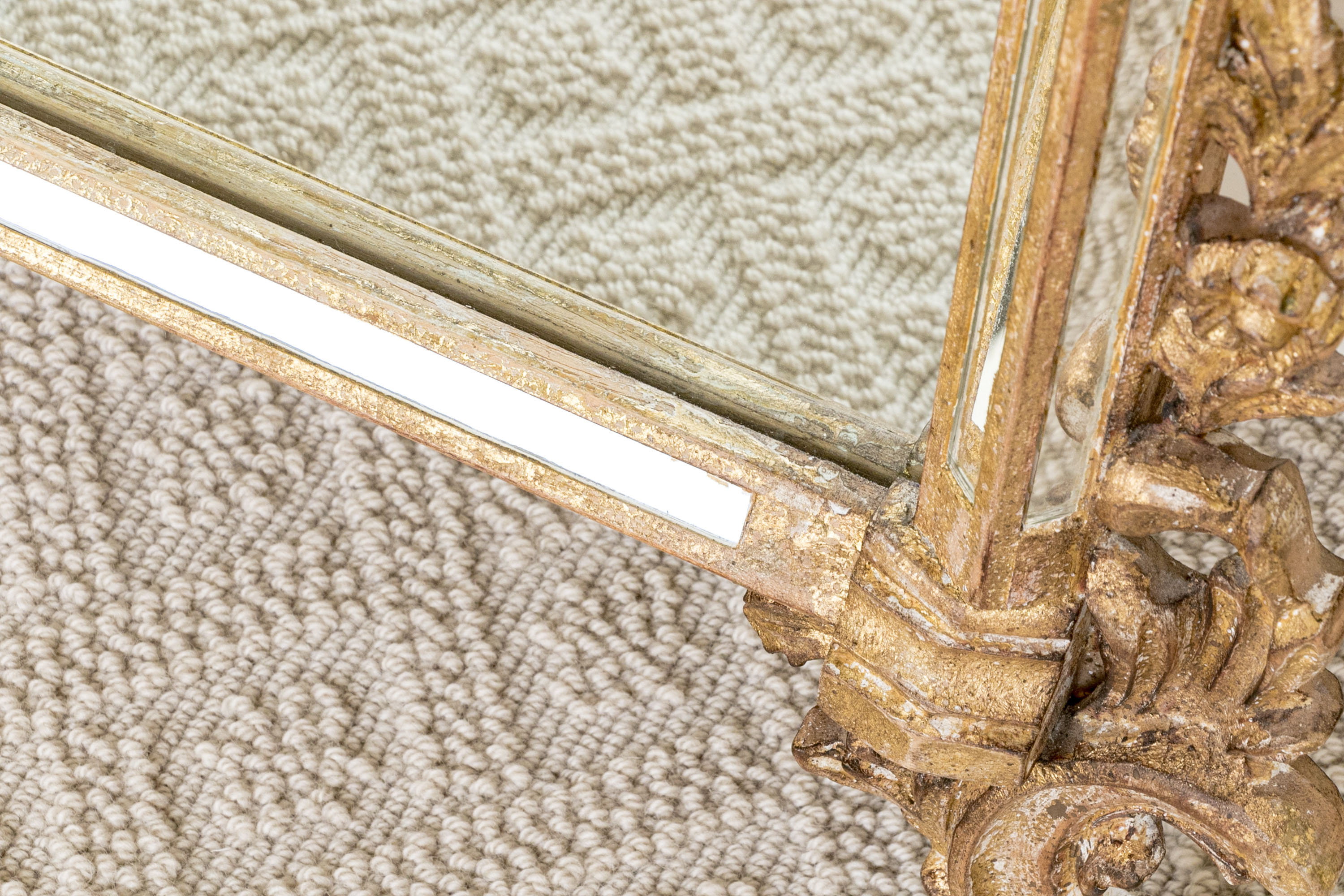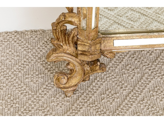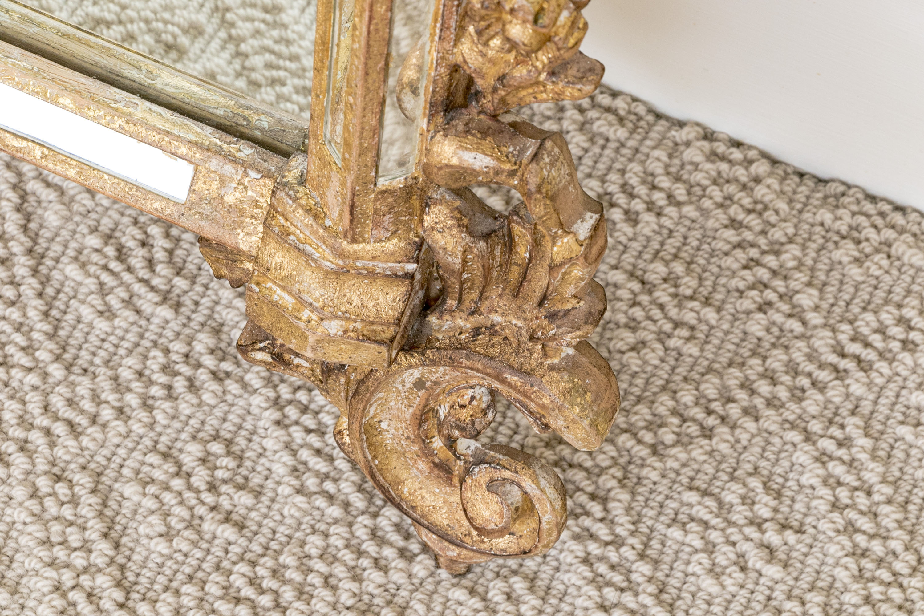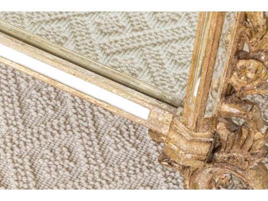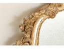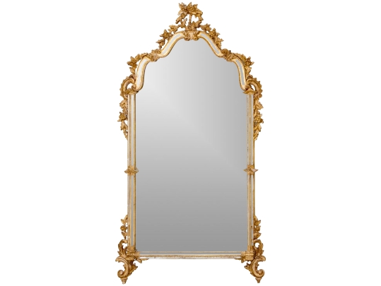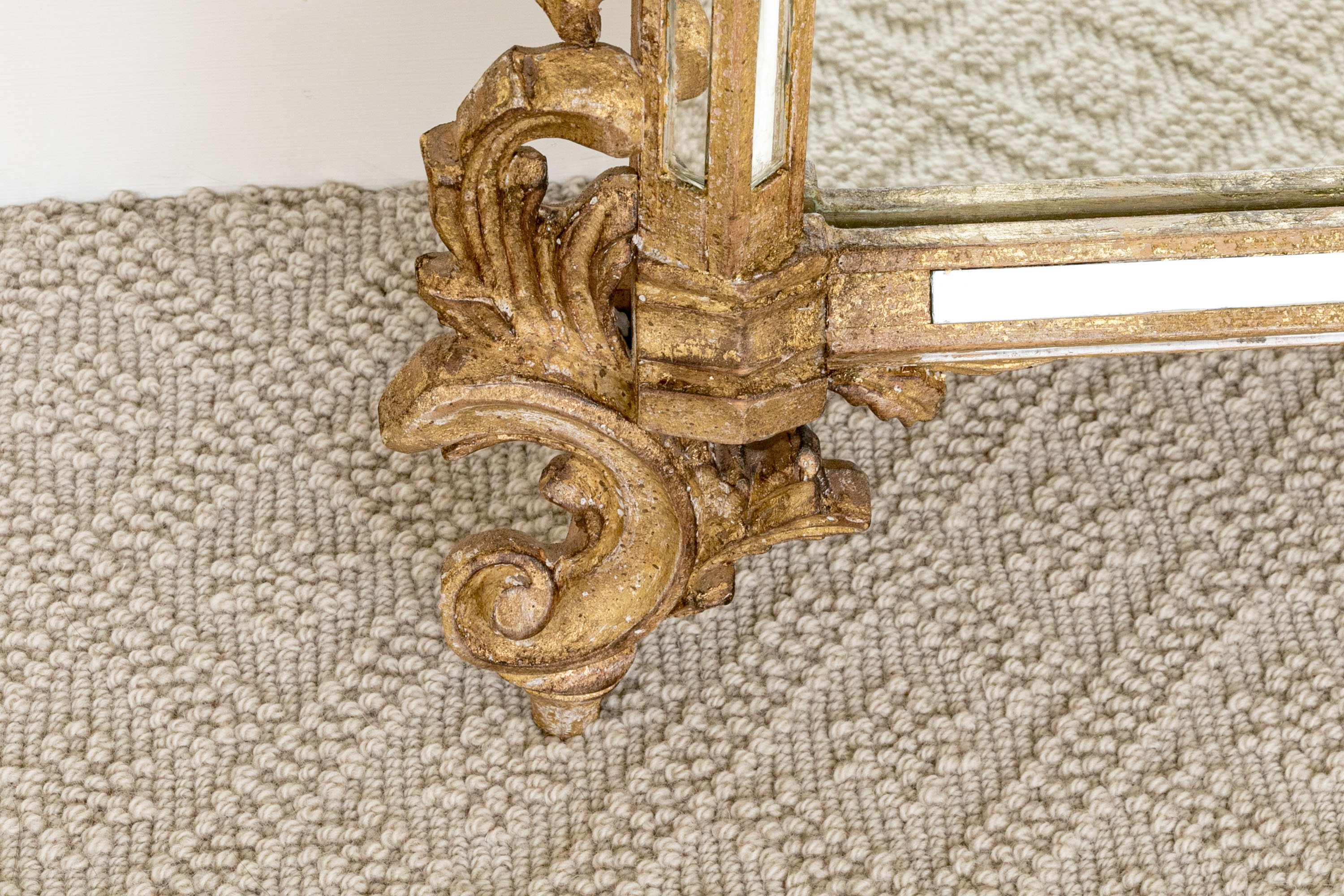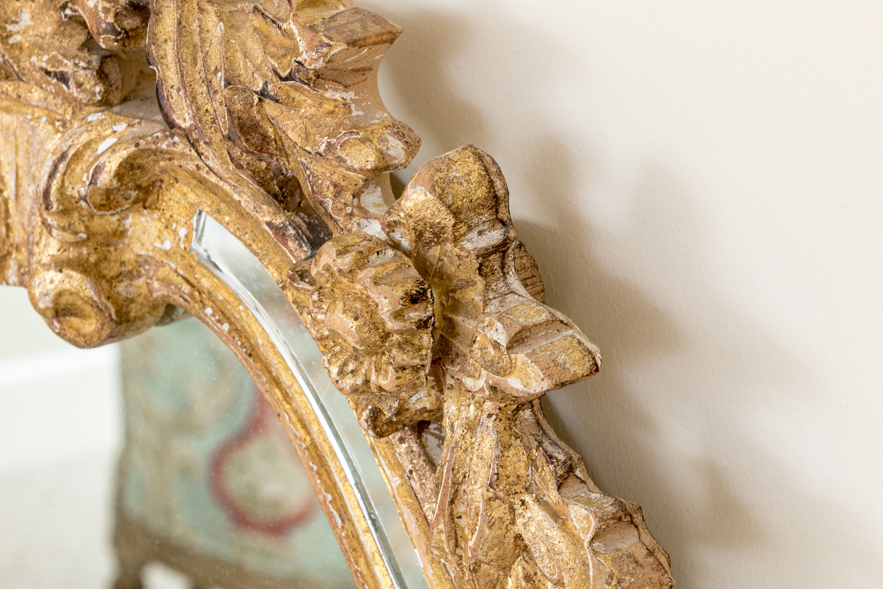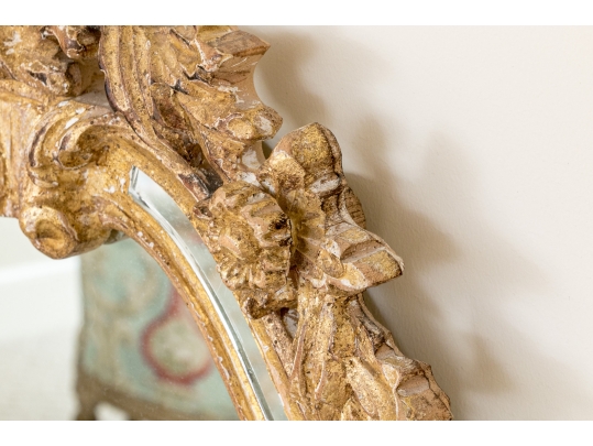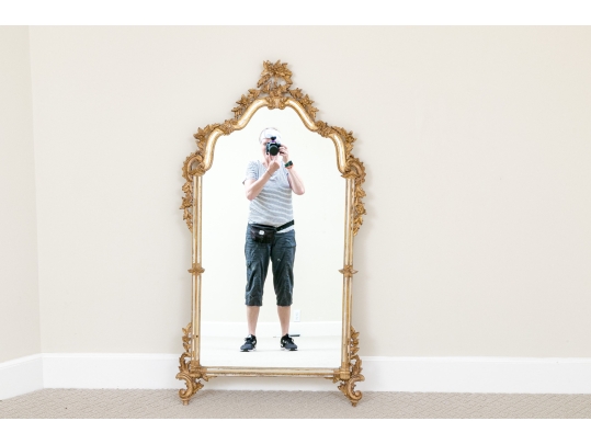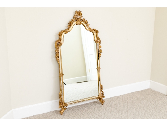 A stunning Italian Louis J. Solomon mirror in Baroque design, displaying a scalloped top arch with mirror paneling along a border surrounded by ornate carved giltwood with foliate flourishes and scrolled relief. Topped with a large floral crest at the center top and finished with scrolled feet at the bottom corners, creating a truly marvelous and elegant display.