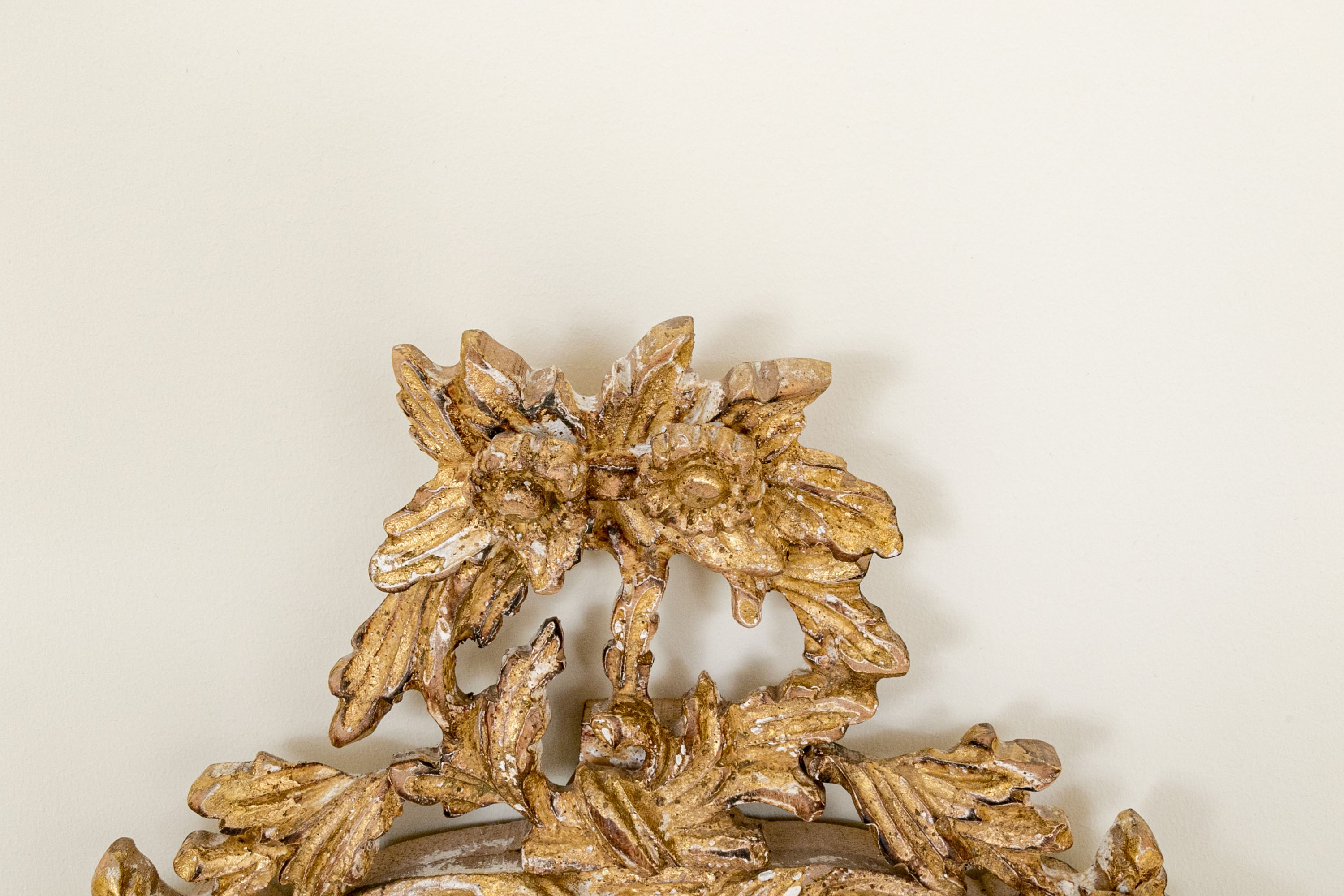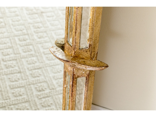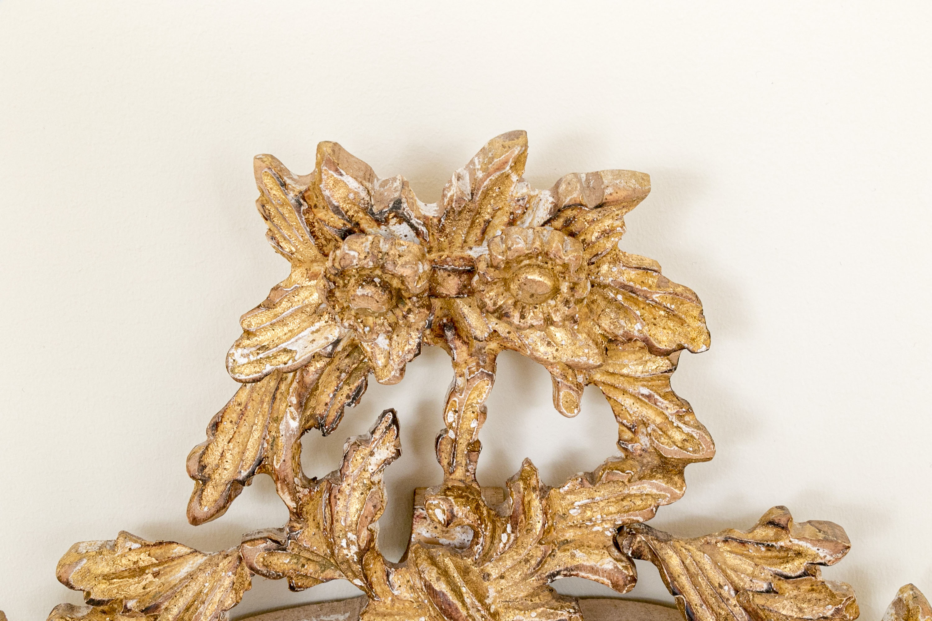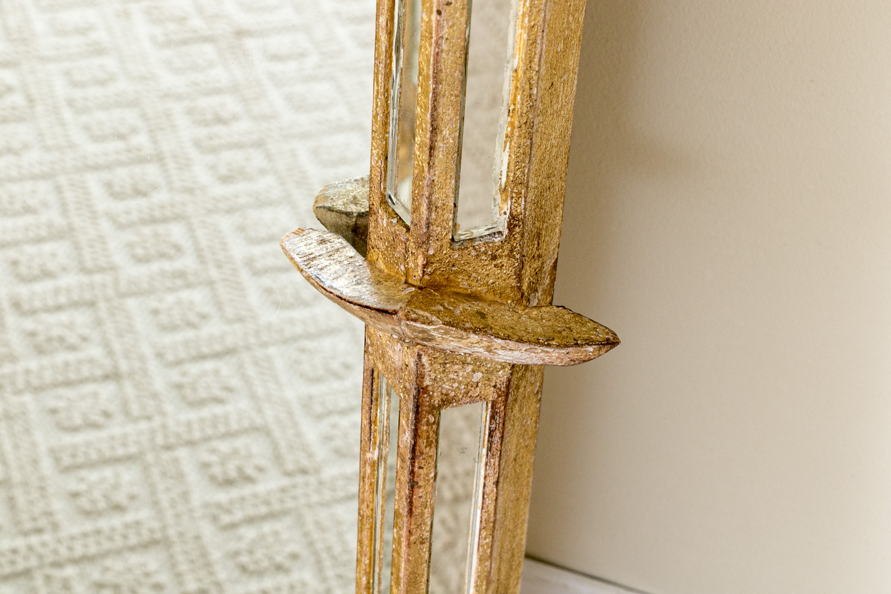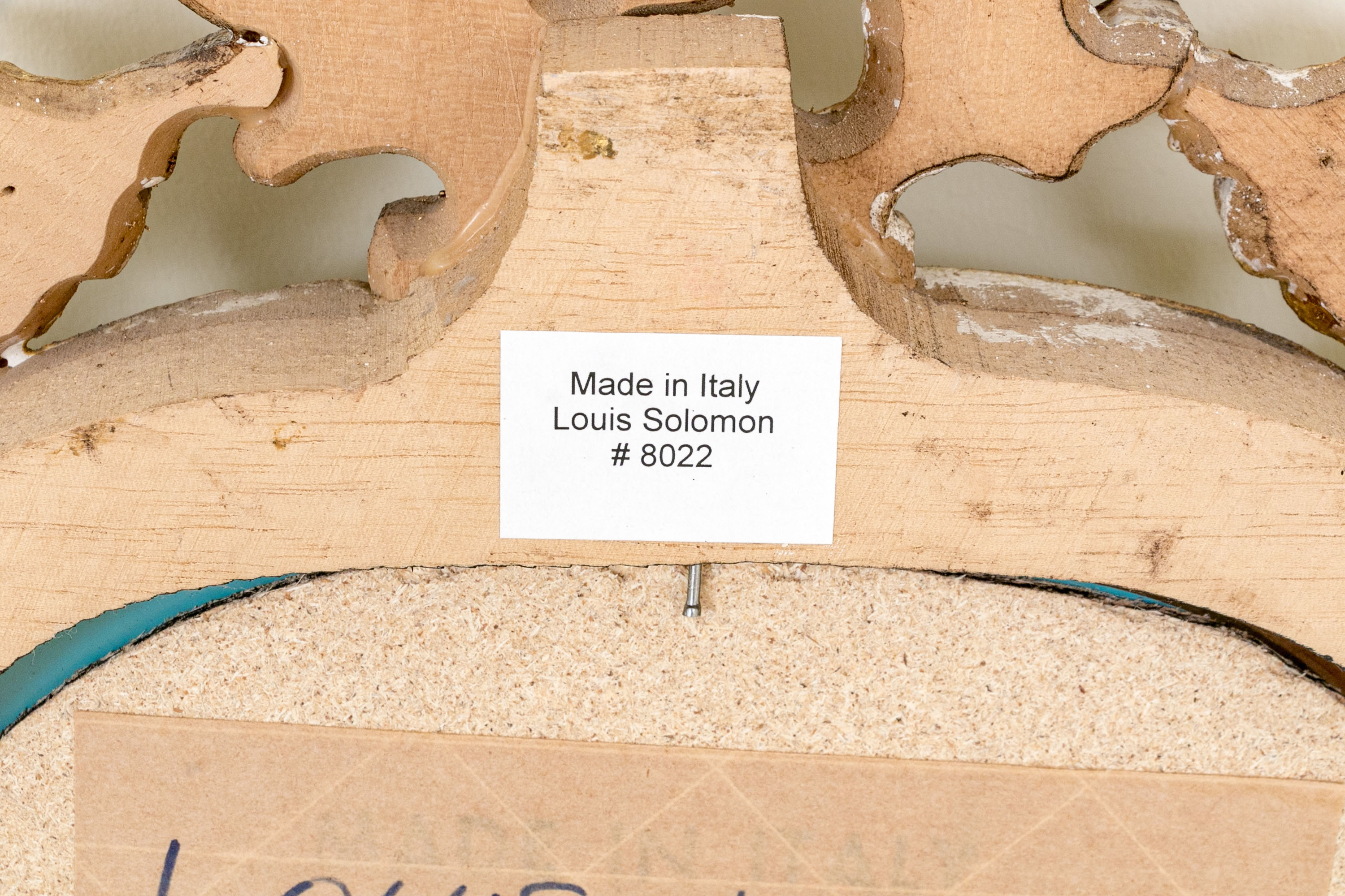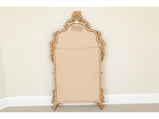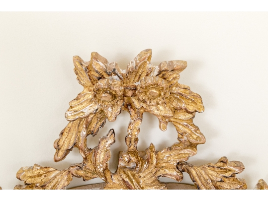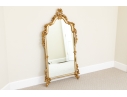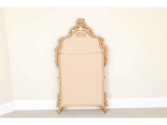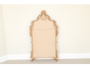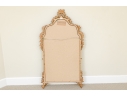 A stunning Italian Louis J. Solomon mirror in Baroque design, displaying a scalloped top arch with mirror paneling along a border surrounded by ornate carved giltwood with foliate flourishes and scrolled relief. Topped with a large floral crest at the center top and finished with scrolled feet at the bottom corners, creating a truly marvelous and elegant display.