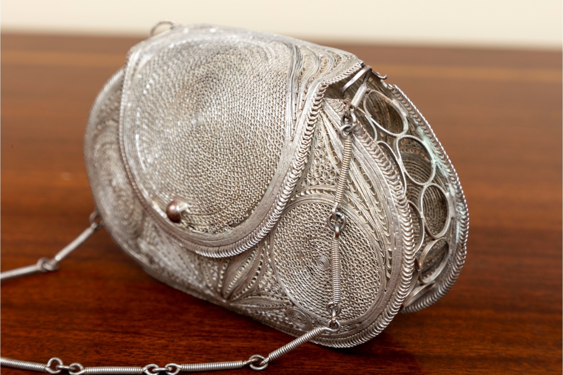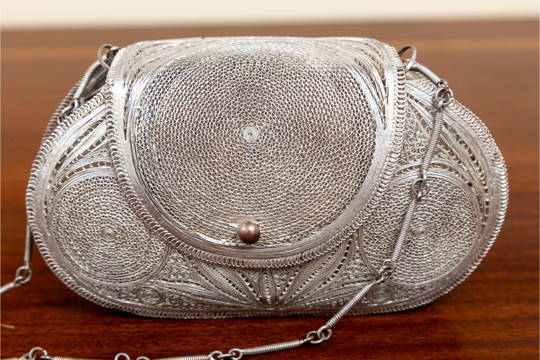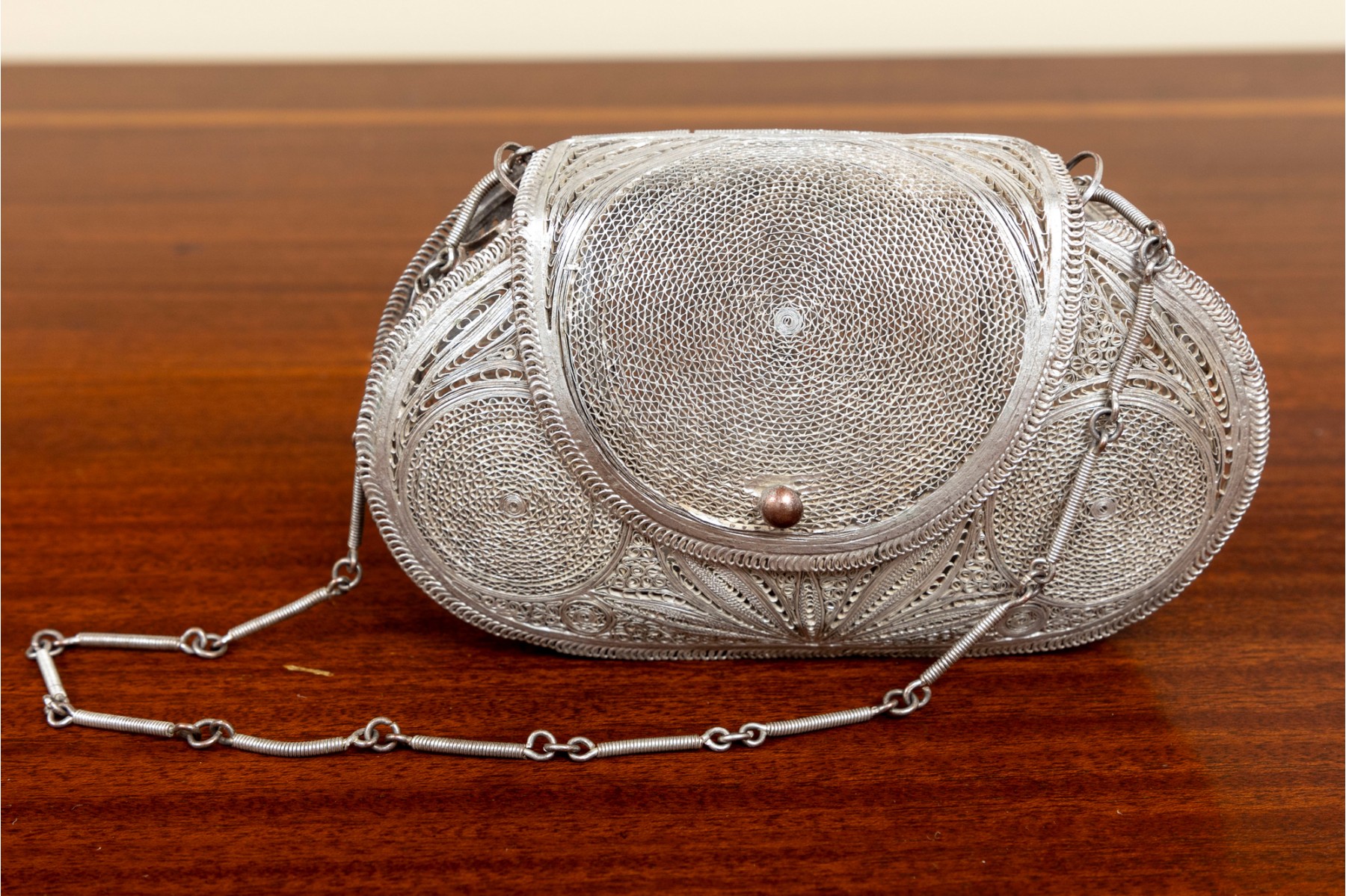 A beautiful filigree metalwork latched coin-purse, silver-plating over copper with a coil spring handle strap. Each face-plate is joined together by welded rings complete with a formed front flap cover.