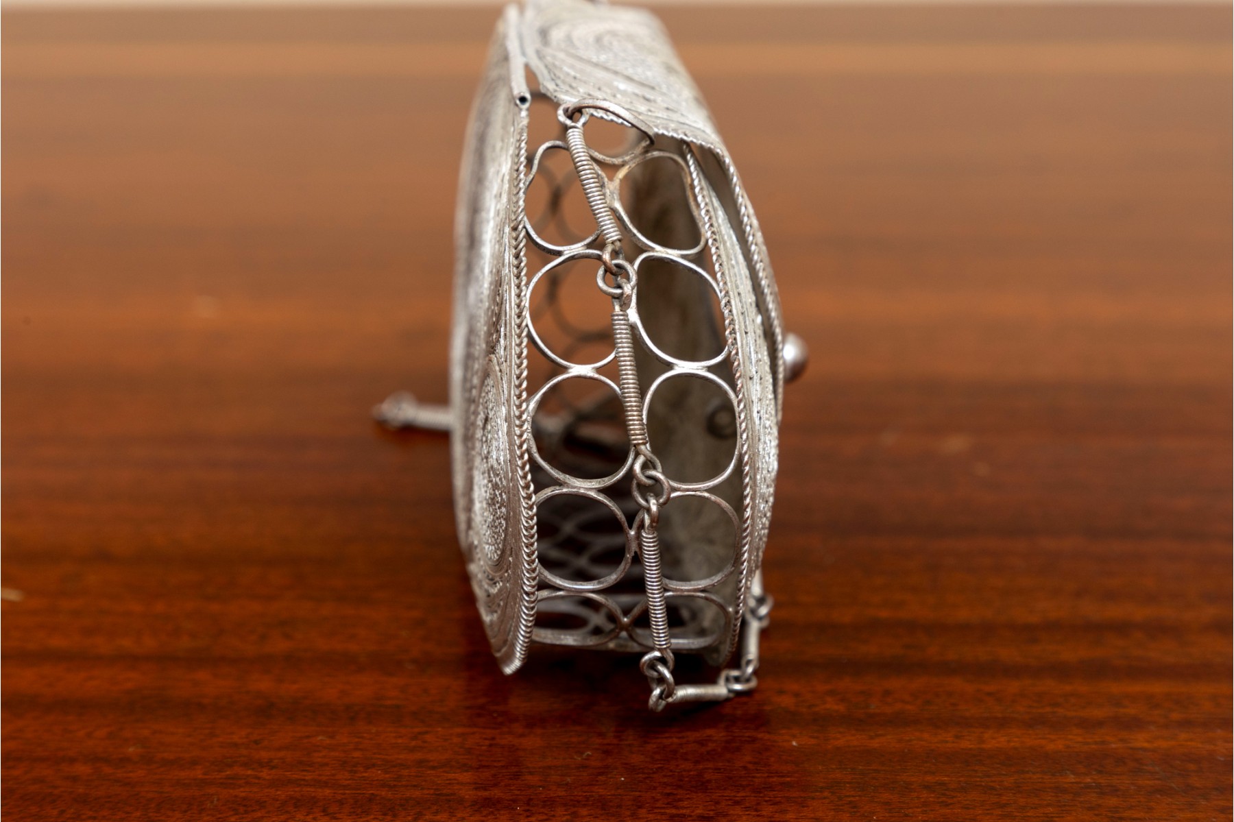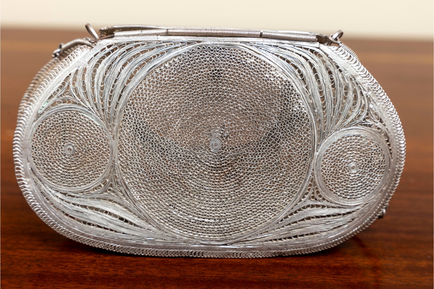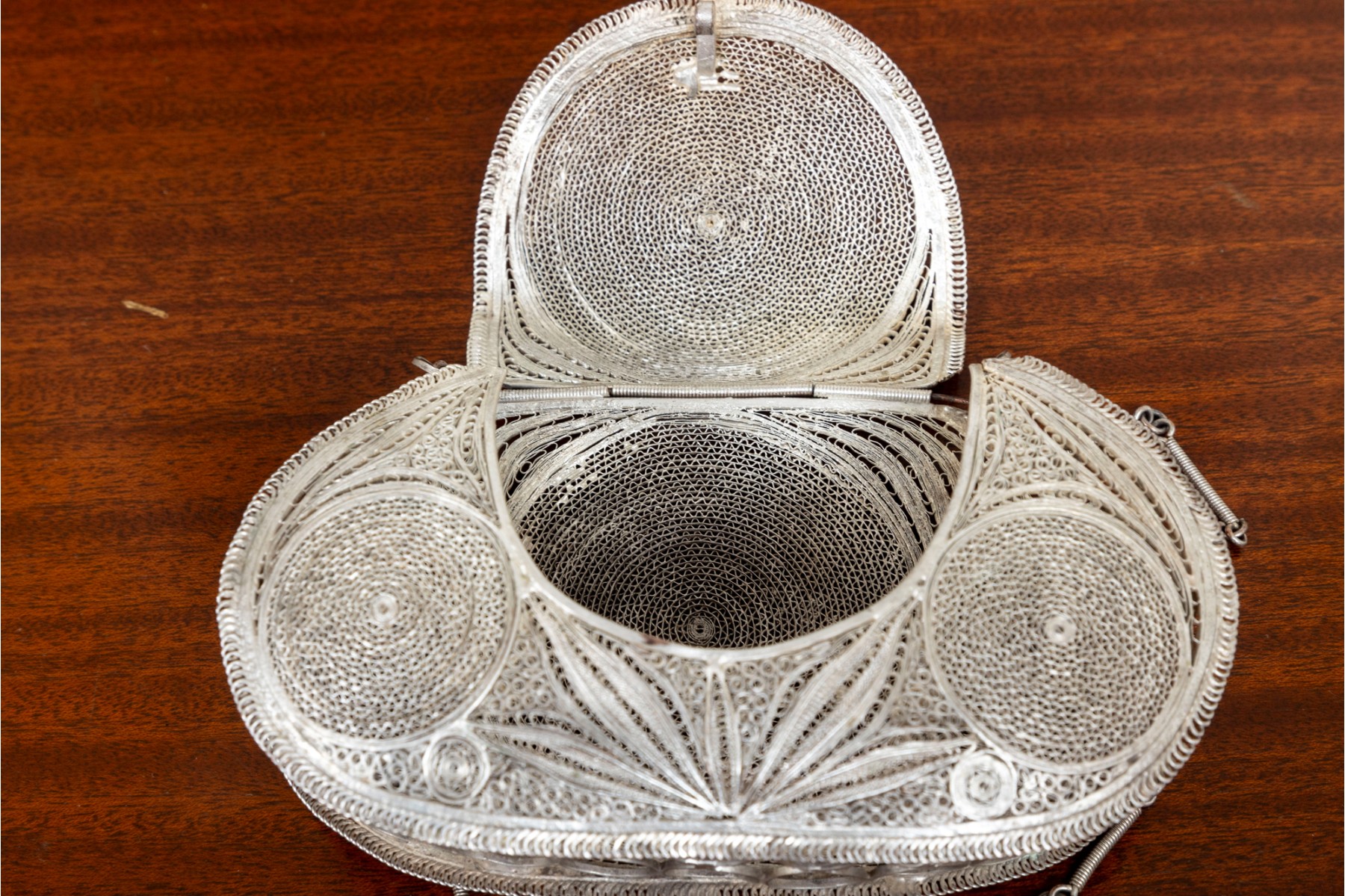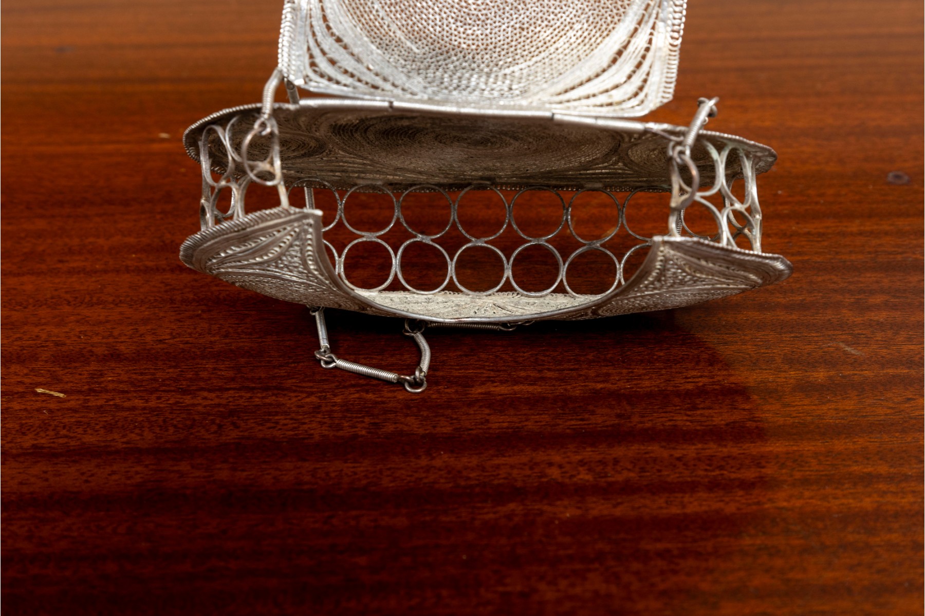 A beautiful filigree metalwork latched coin-purse, silver-plating over copper with a coil spring handle strap. Each face-plate is joined together by welded rings complete with a formed front flap cover.