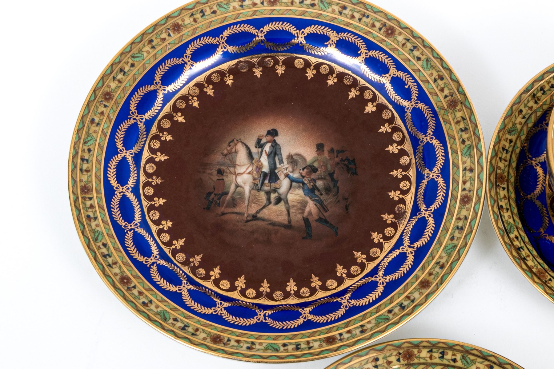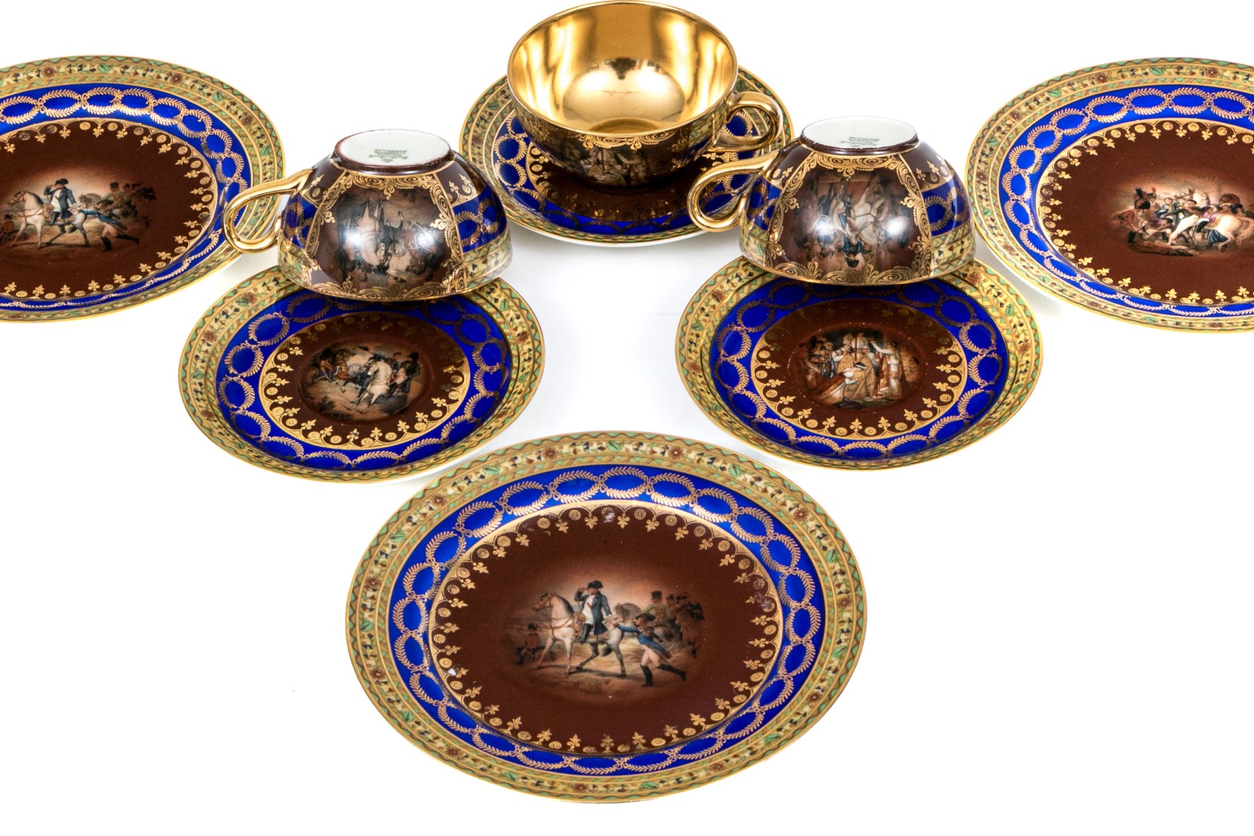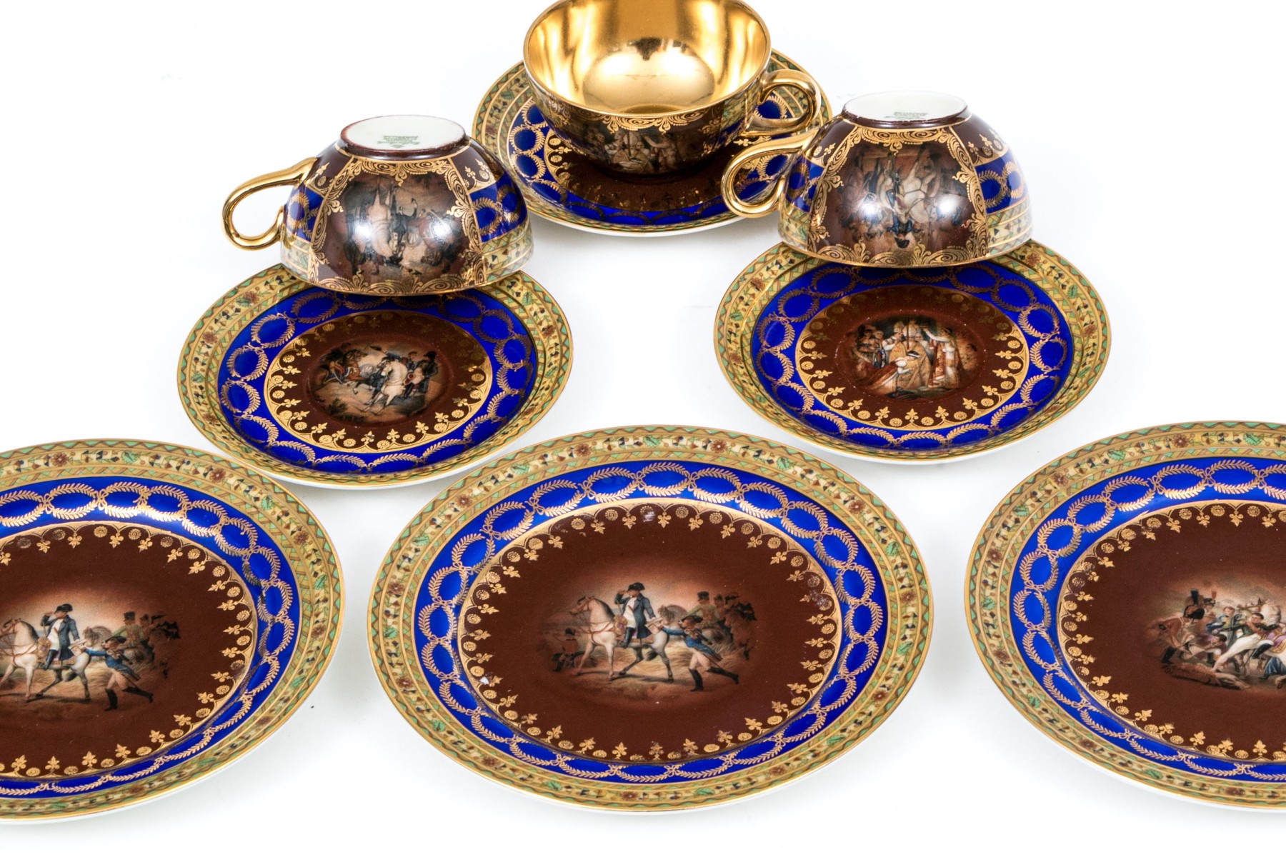 Tea set with three settings, cup, saucer and plate. The ornate pieces have a dark red and blue design with mounted solders at the centers. Gold gilt accents.