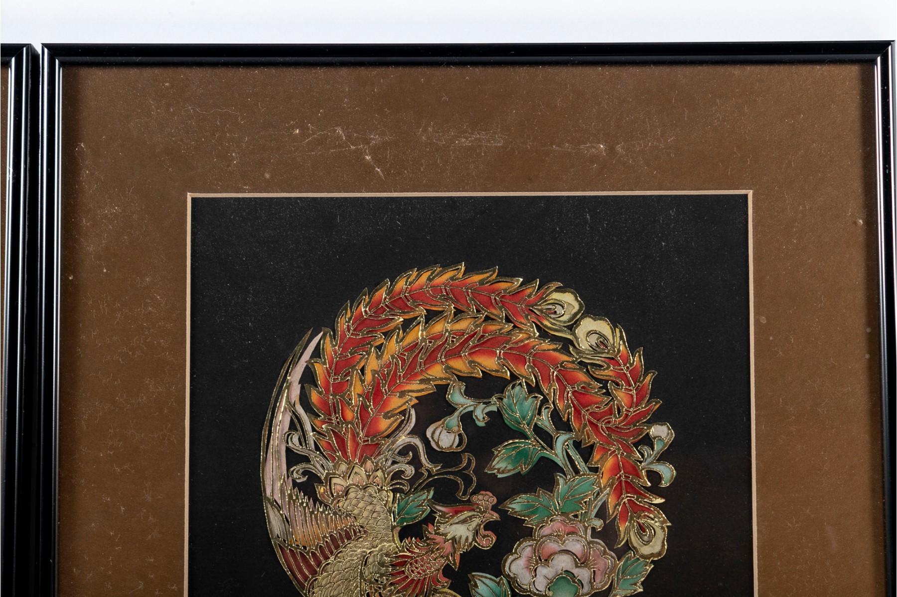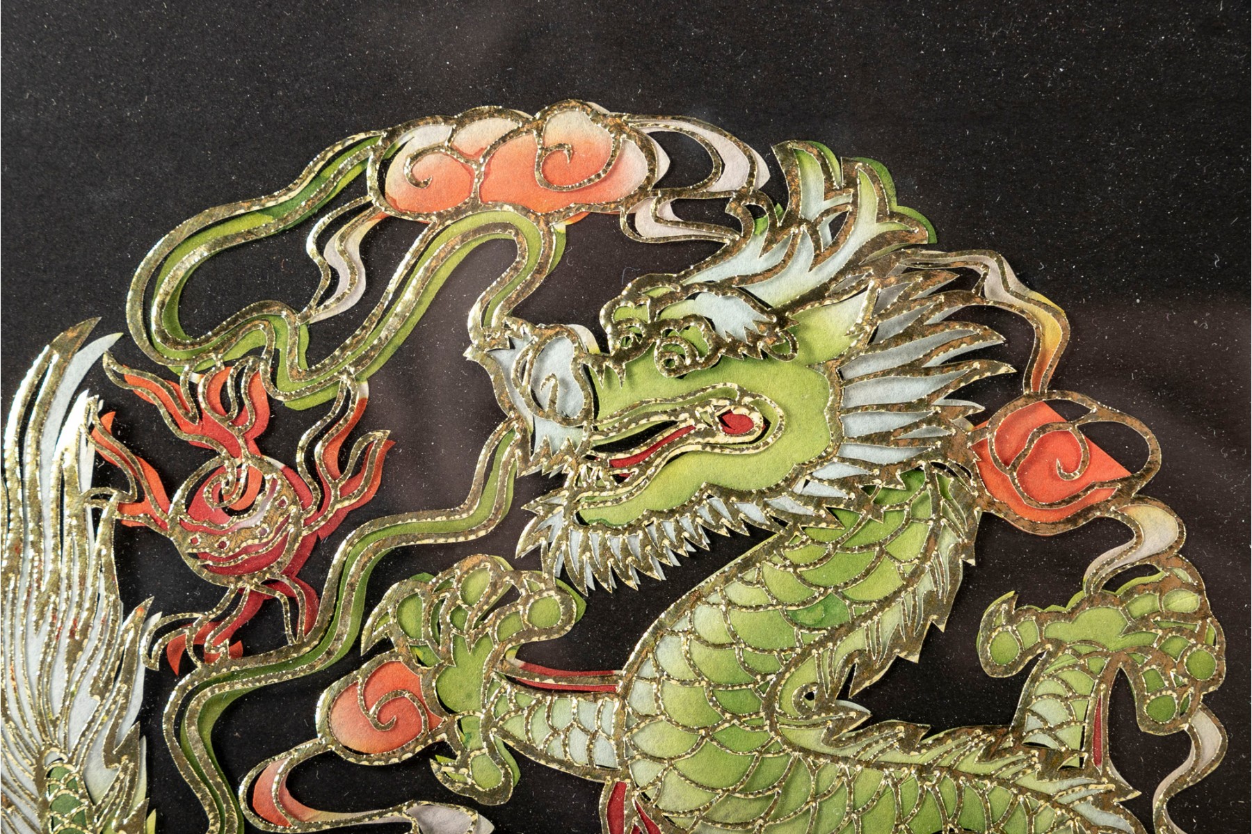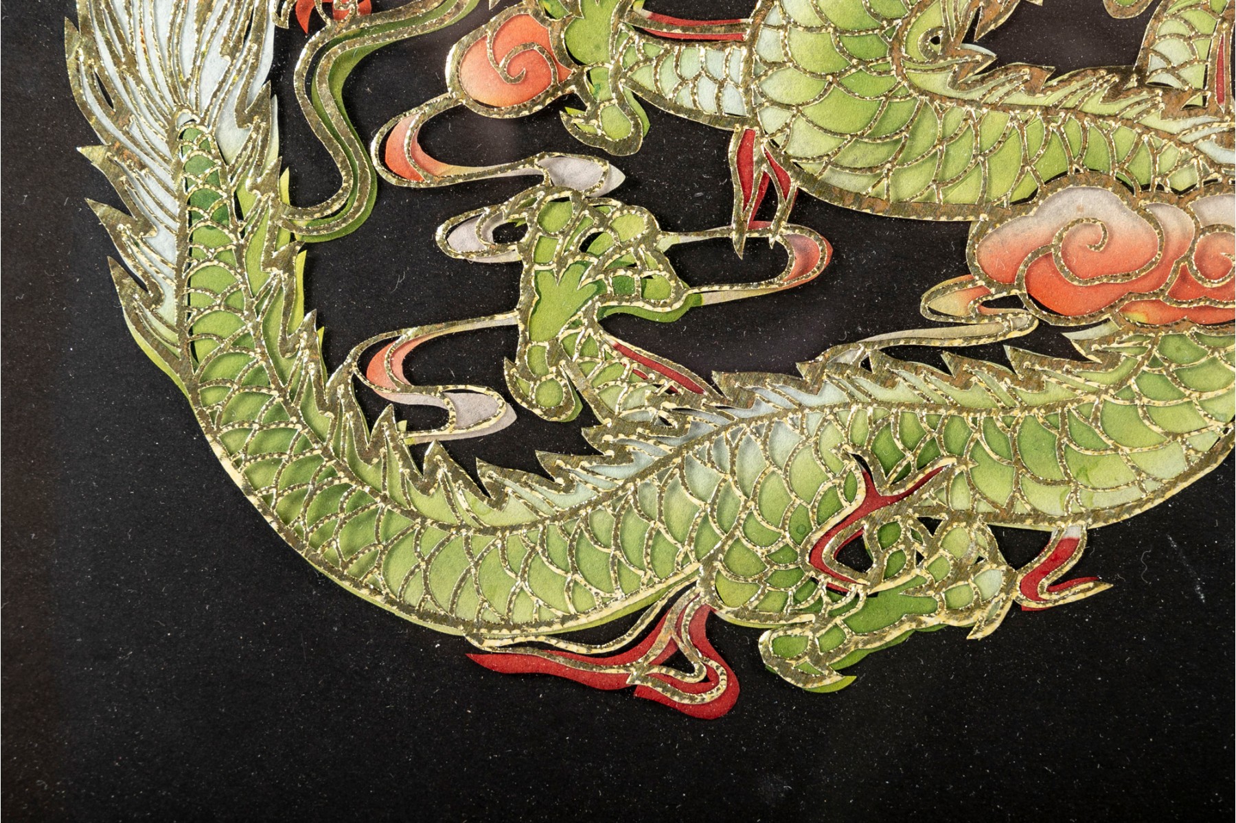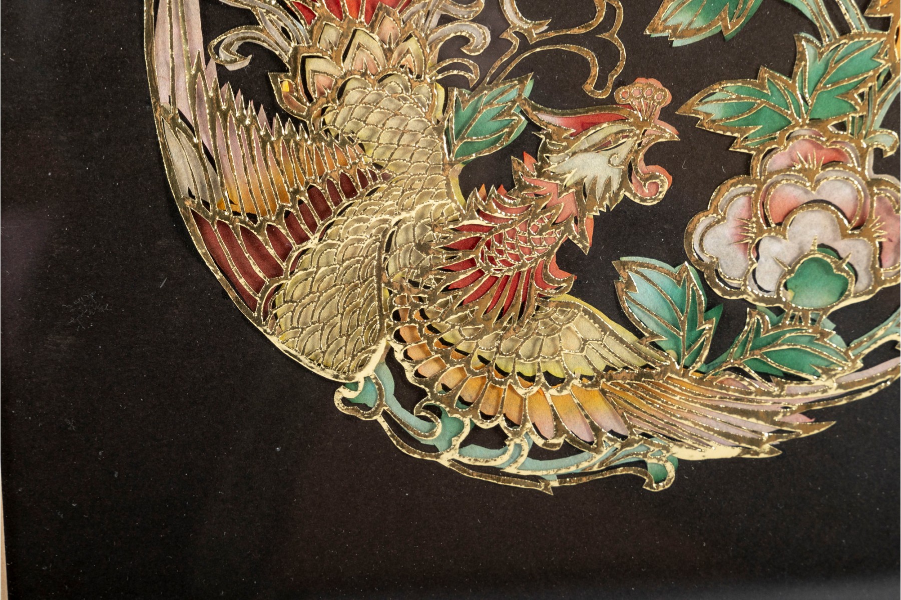 A wonderful duo of ornately detailed Chinese papercut artpieces depicting a winding, serpentine dragon around swirling red clouds; and an elegant phoenix or rooster in fiery red, orange, yellow, and pink, circling around a large pink flower. The figures are overlaid with pierced gilt linework, mounted against black backgrounds. Displayed behind glass with gilt mats in black frames.