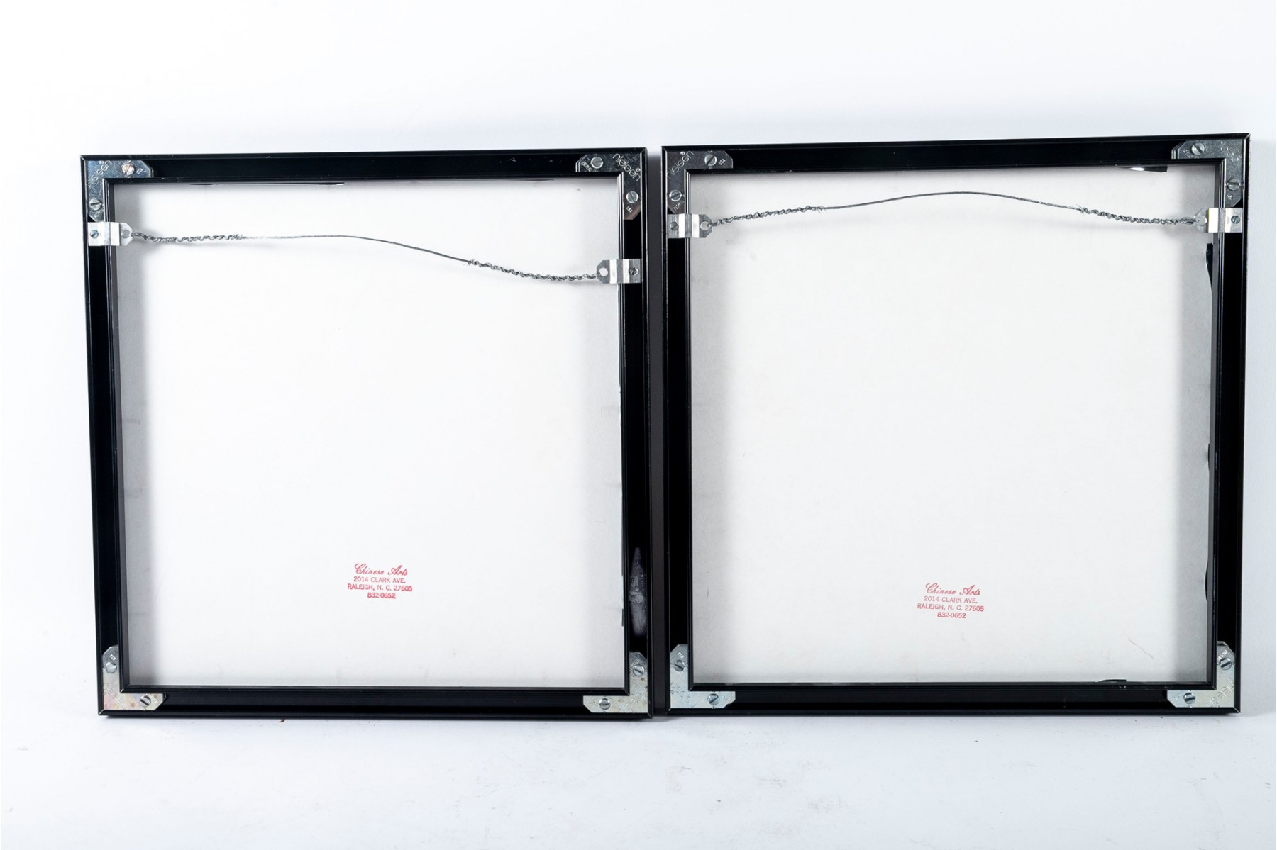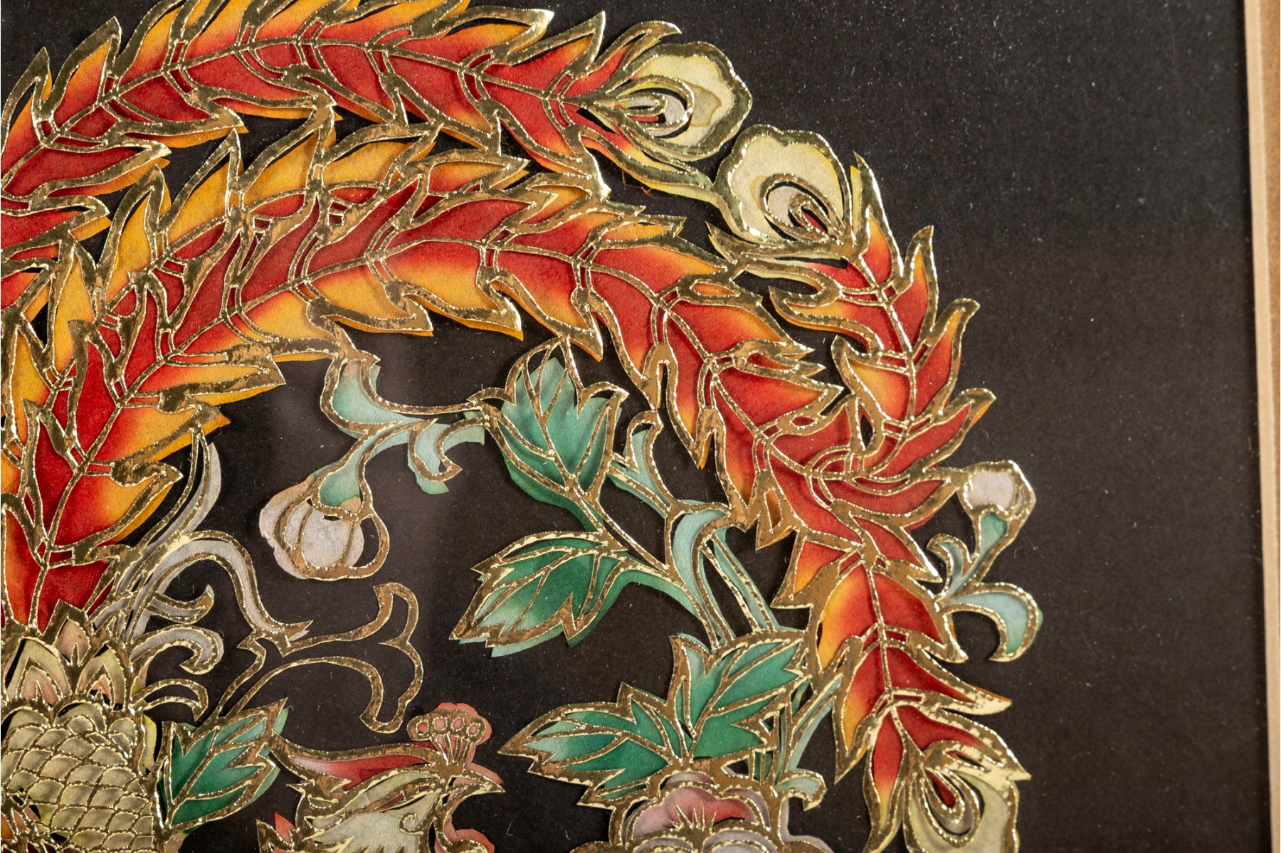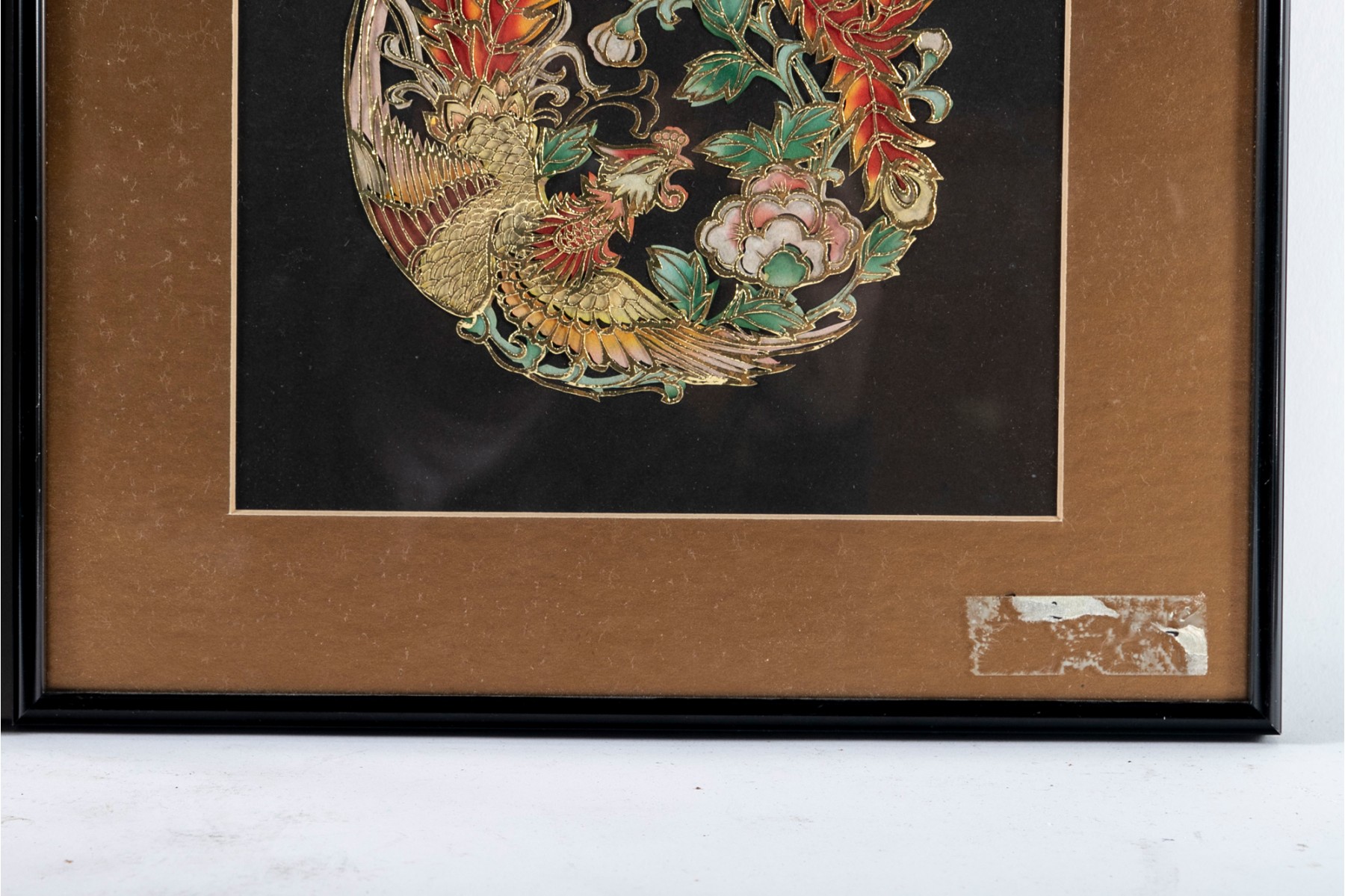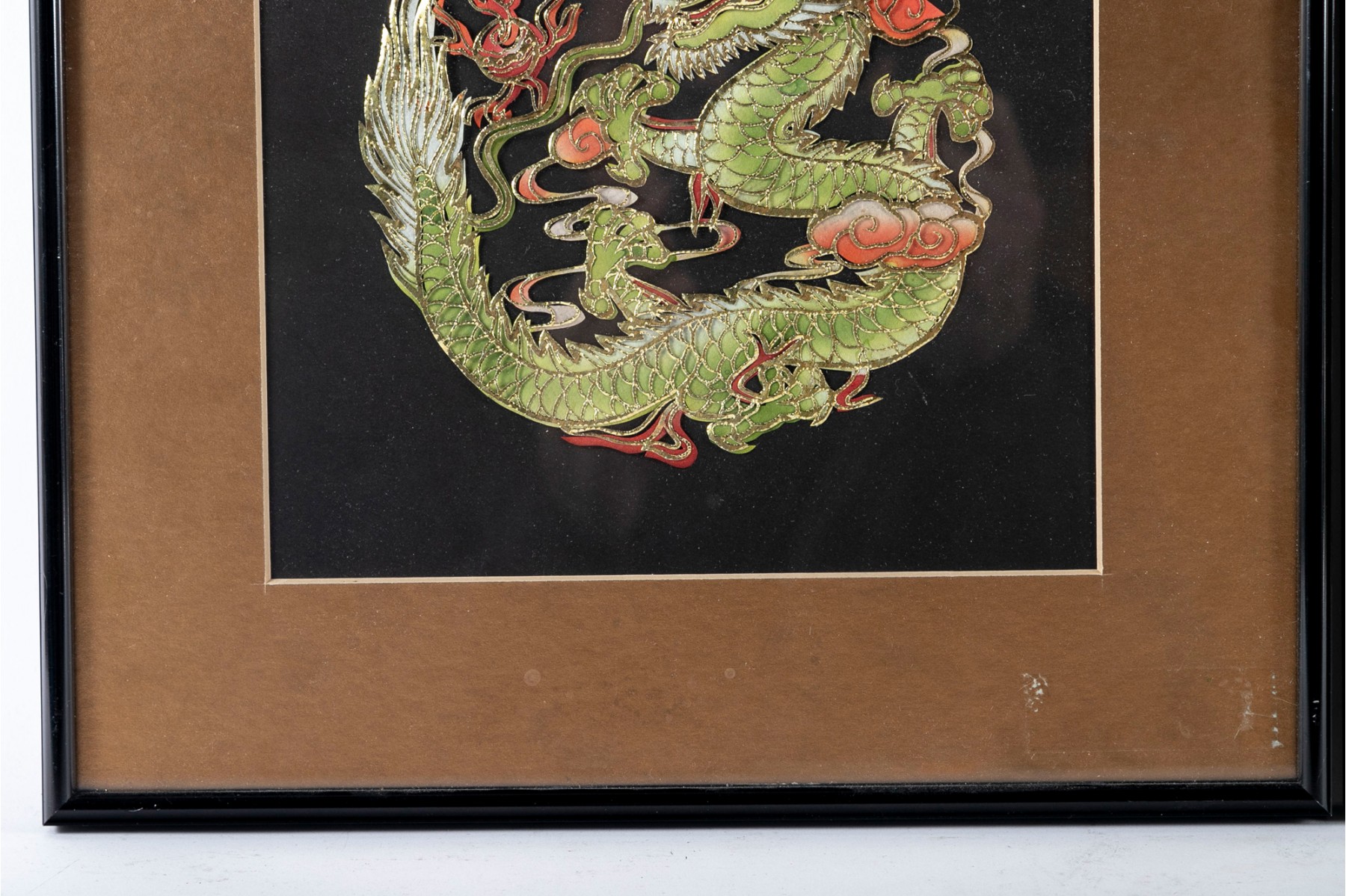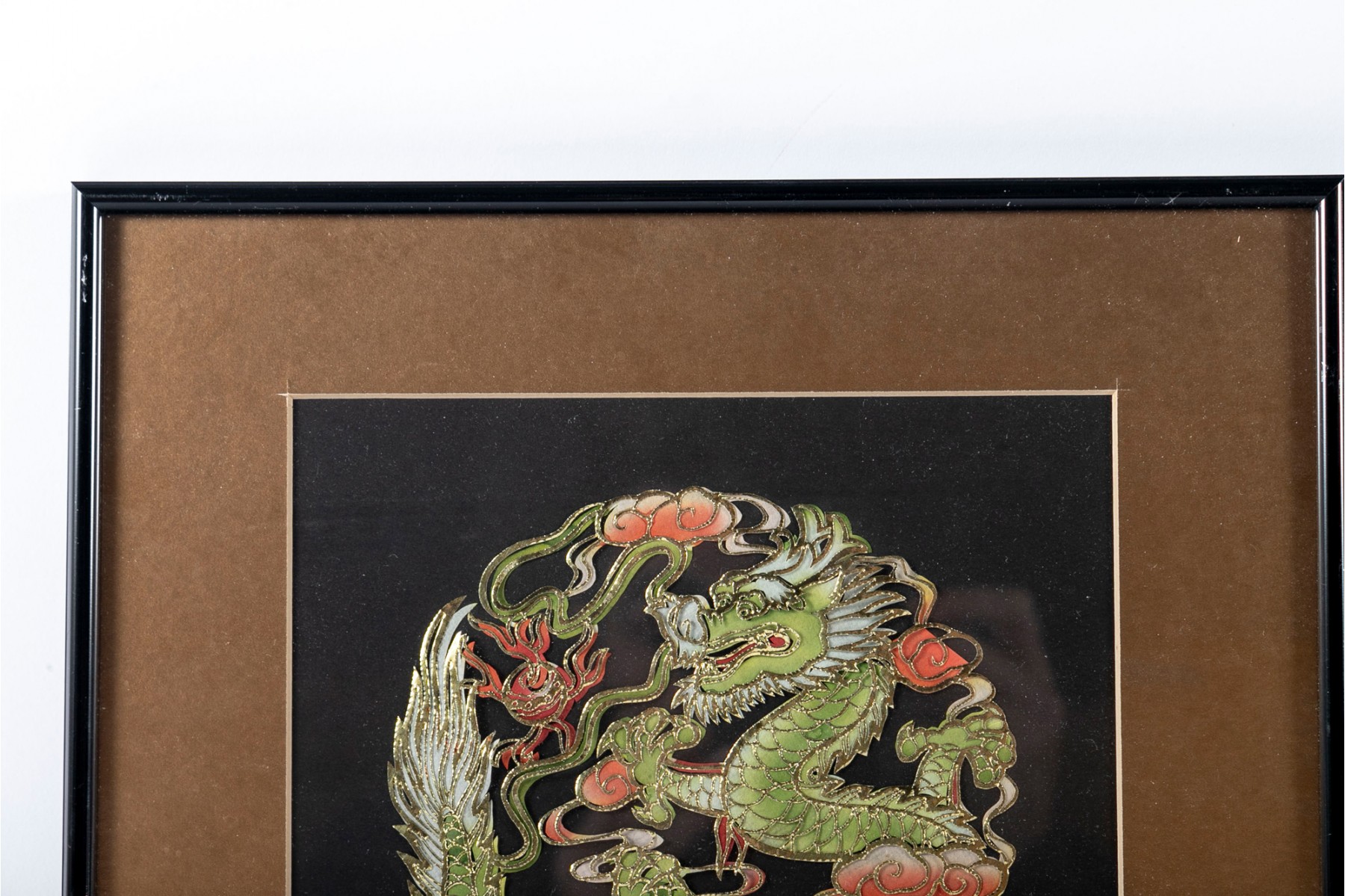 A wonderful duo of ornately detailed Chinese papercut artpieces depicting a winding, serpentine dragon around swirling red clouds; and an elegant phoenix or rooster in fiery red, orange, yellow, and pink, circling around a large pink flower. The figures are overlaid with pierced gilt linework, mounted against black backgrounds. Displayed behind glass with gilt mats in black frames.