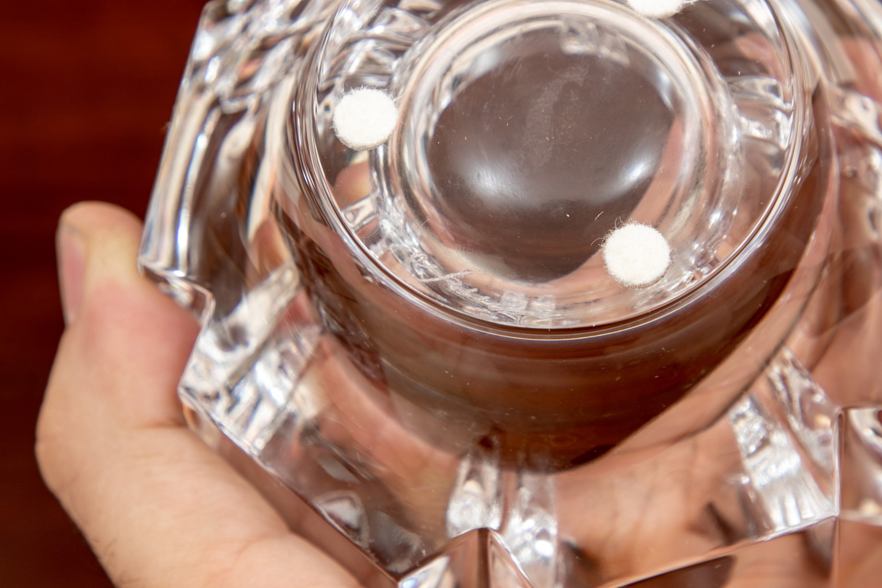 A modern design with segmented hexagonal side panels. Think ring base. Etched mark on the base.