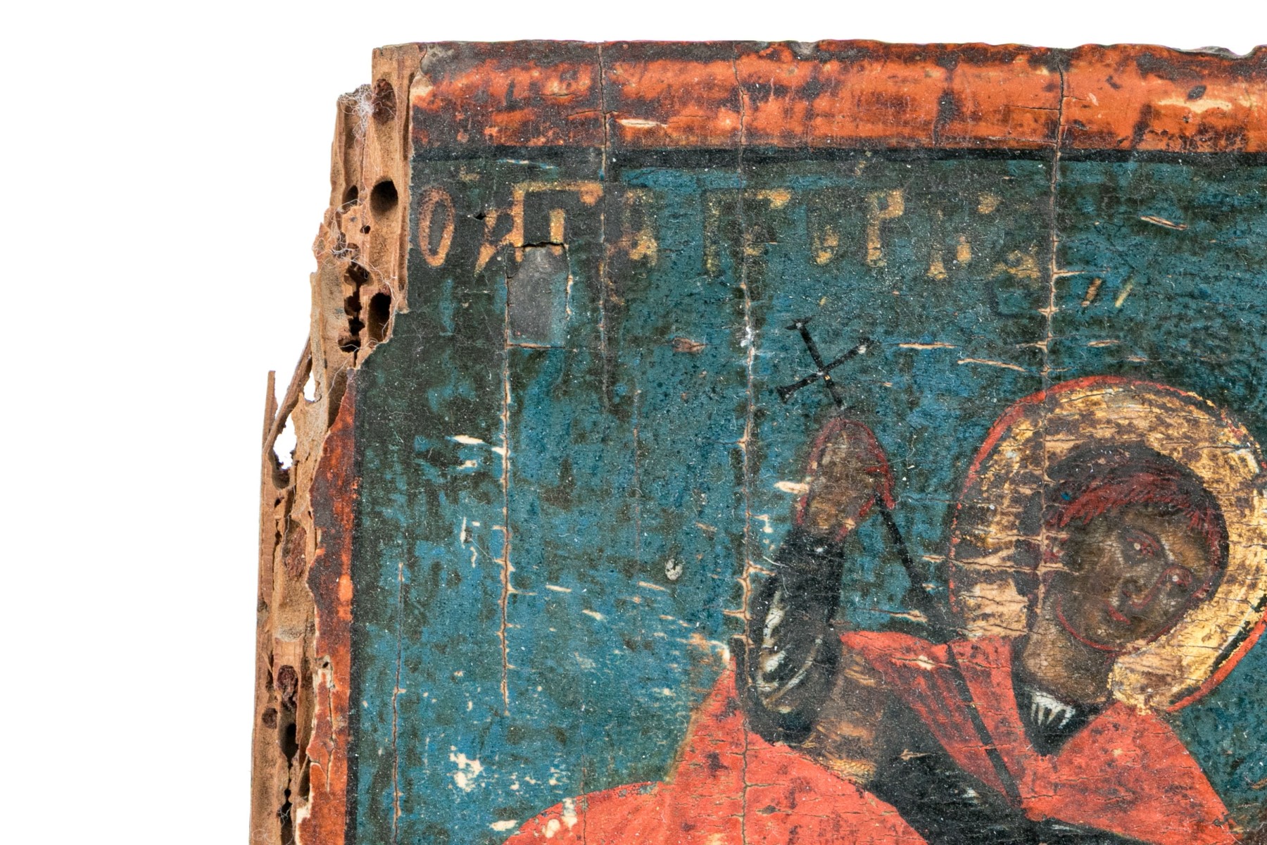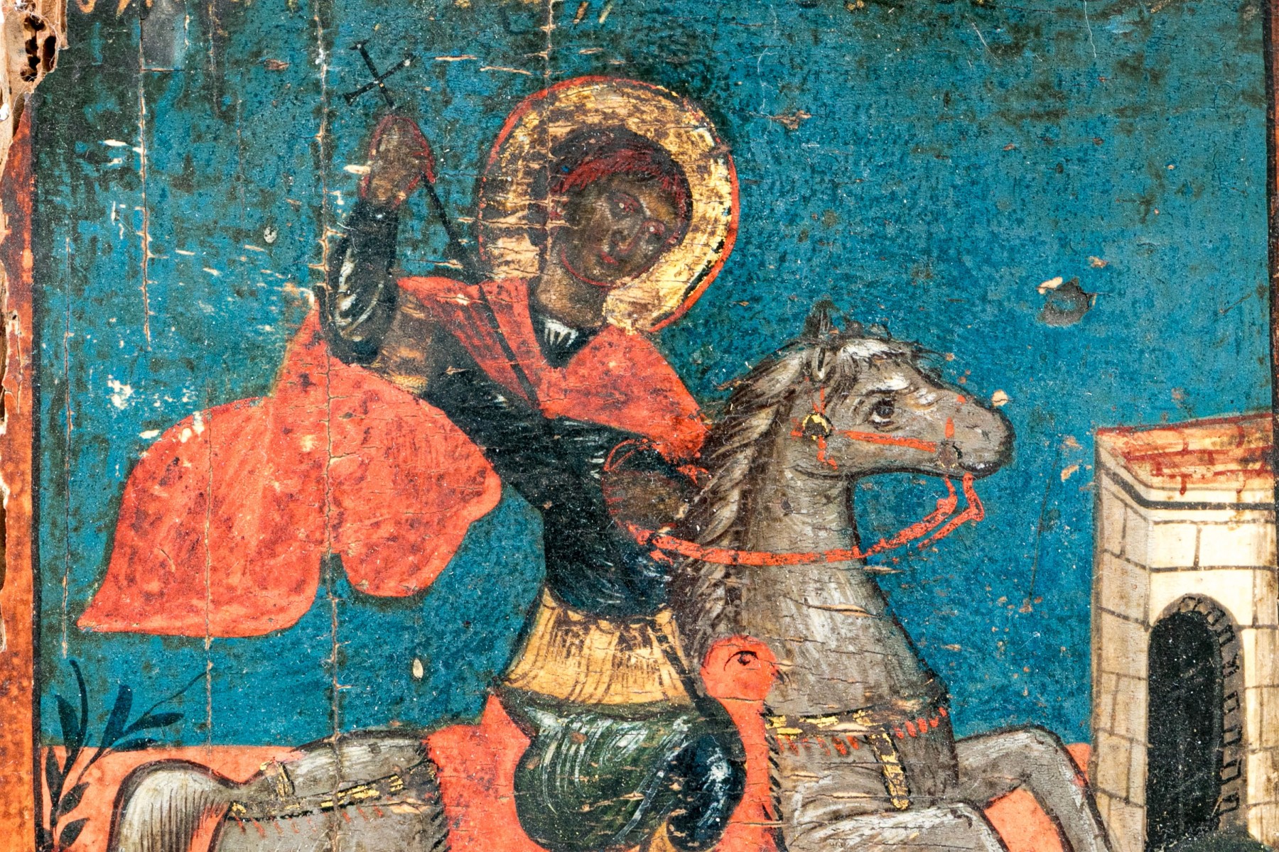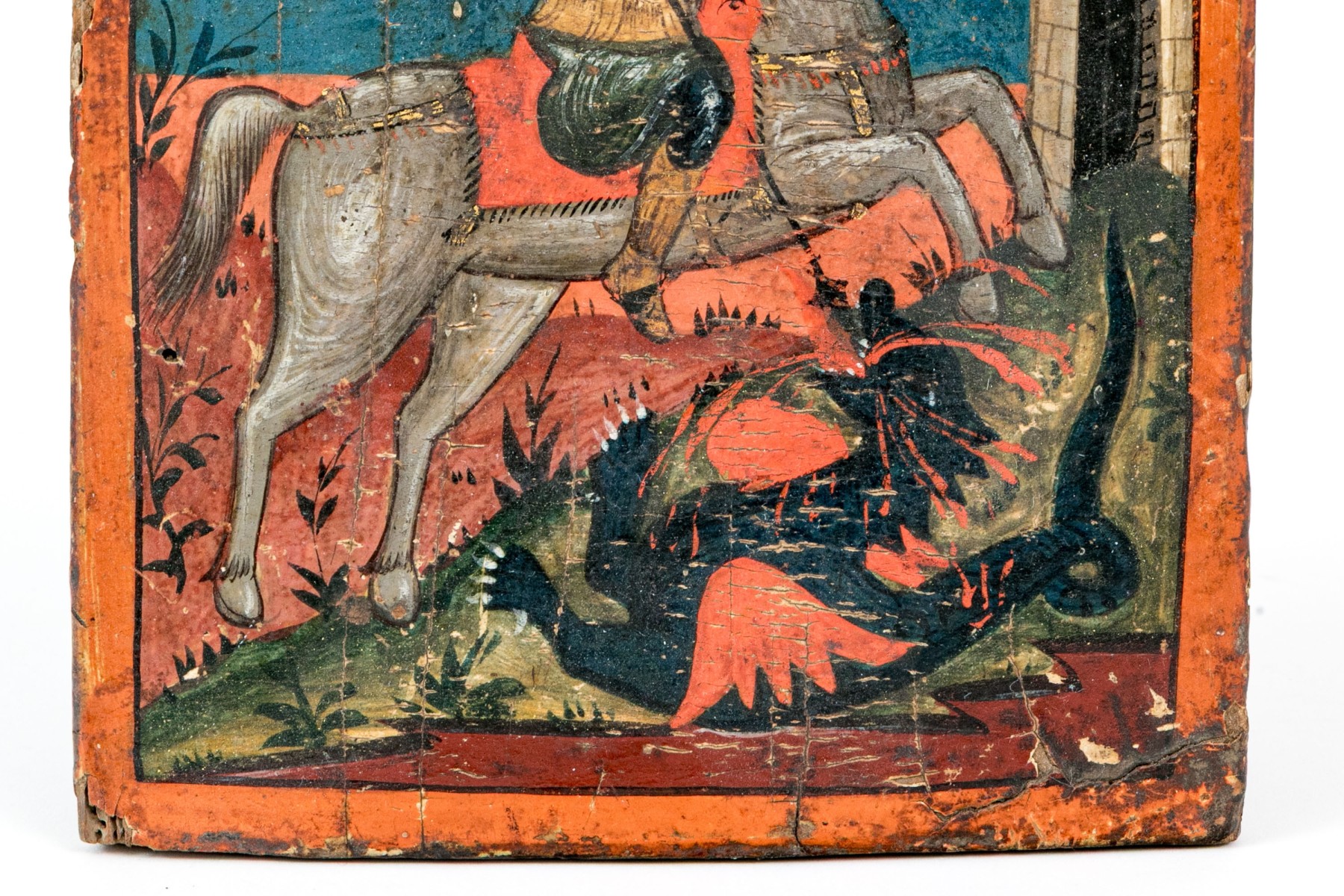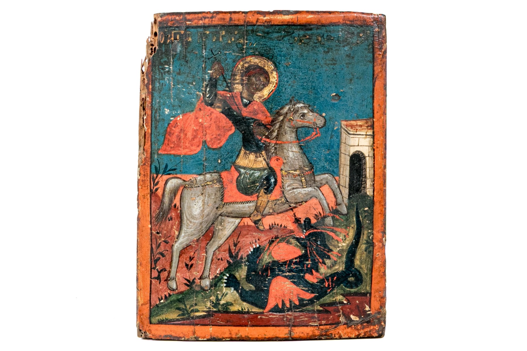 A wonderful Orthodox painted icon depicting the classic scene of St. George with a gilt halo and red cape riding a white steed while slaying a dragon with a spear.
