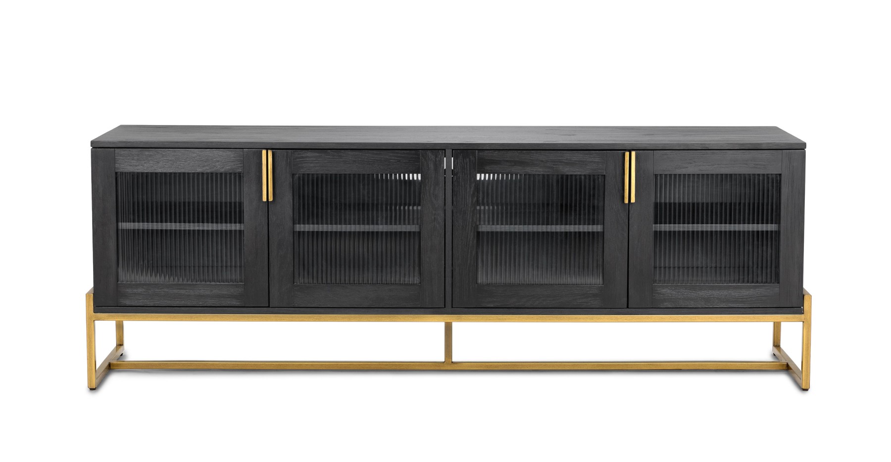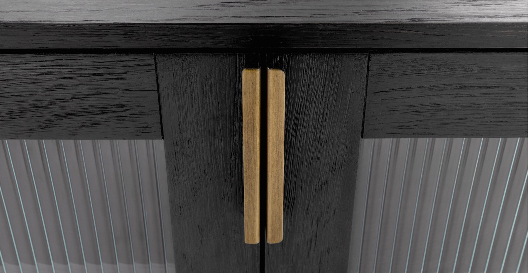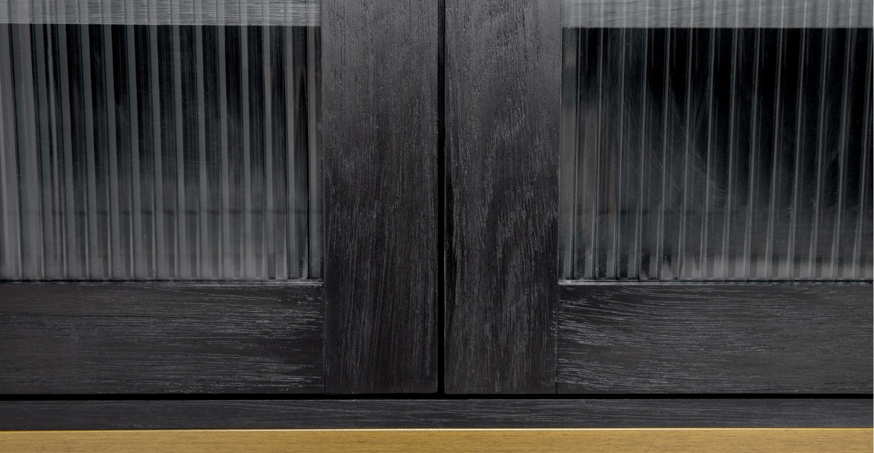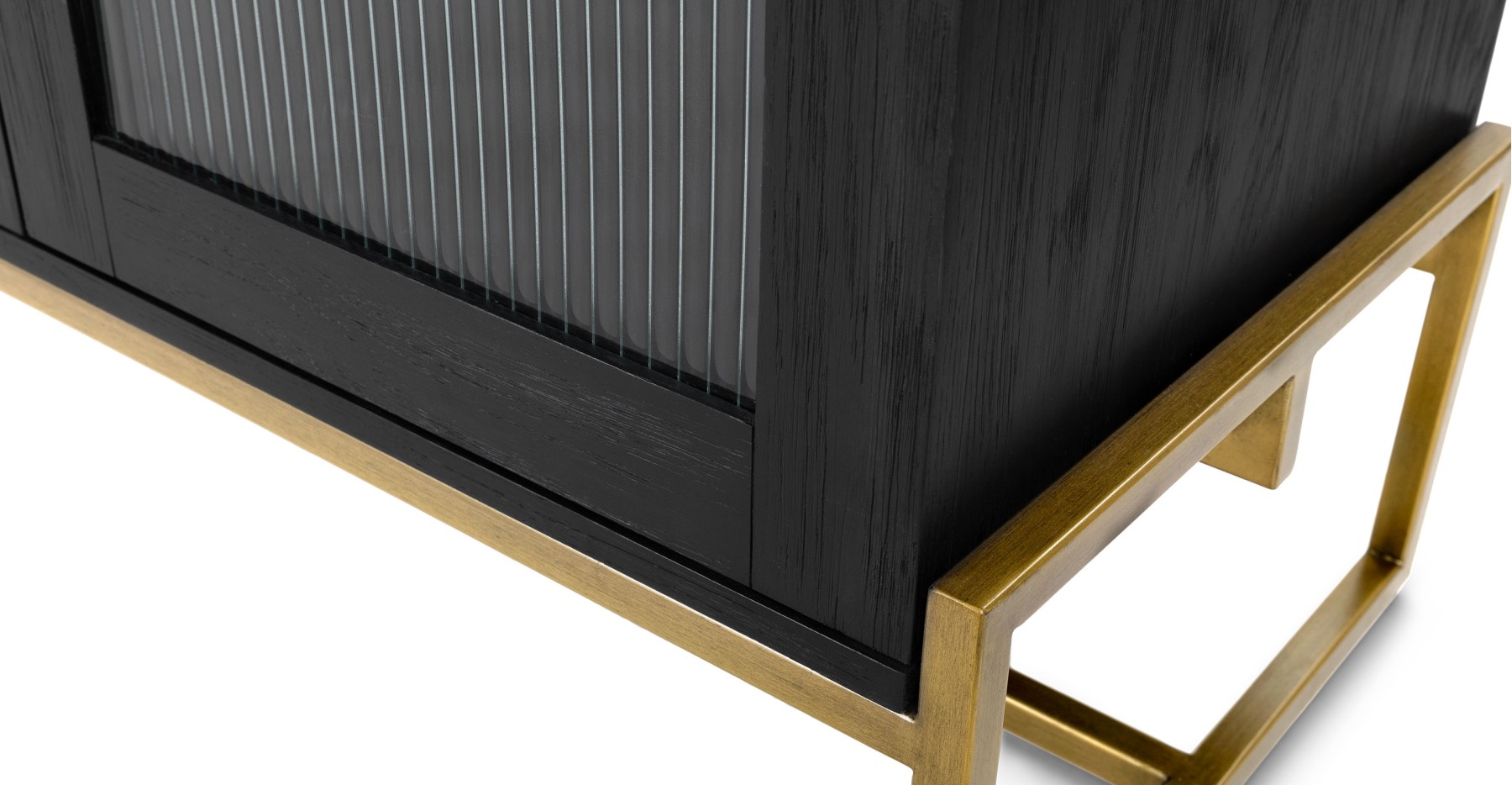The Oscuro cabinet features natural wood grain juxtaposed against brushed metal for a modern feel. With four swinging, fluted glass doors, this cabinet comes equipped with adjustable shelves and ample space to help keep your home clutter-free.