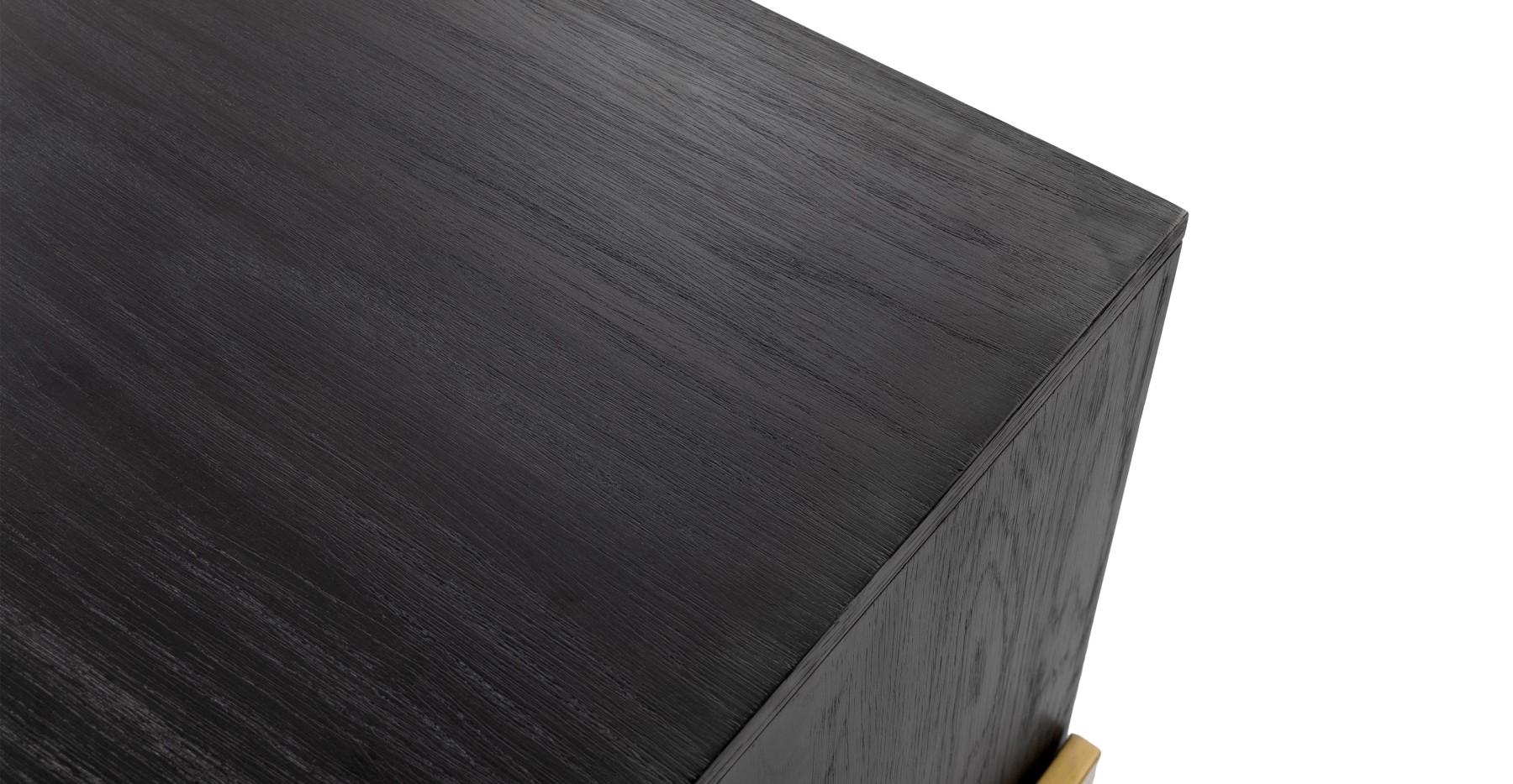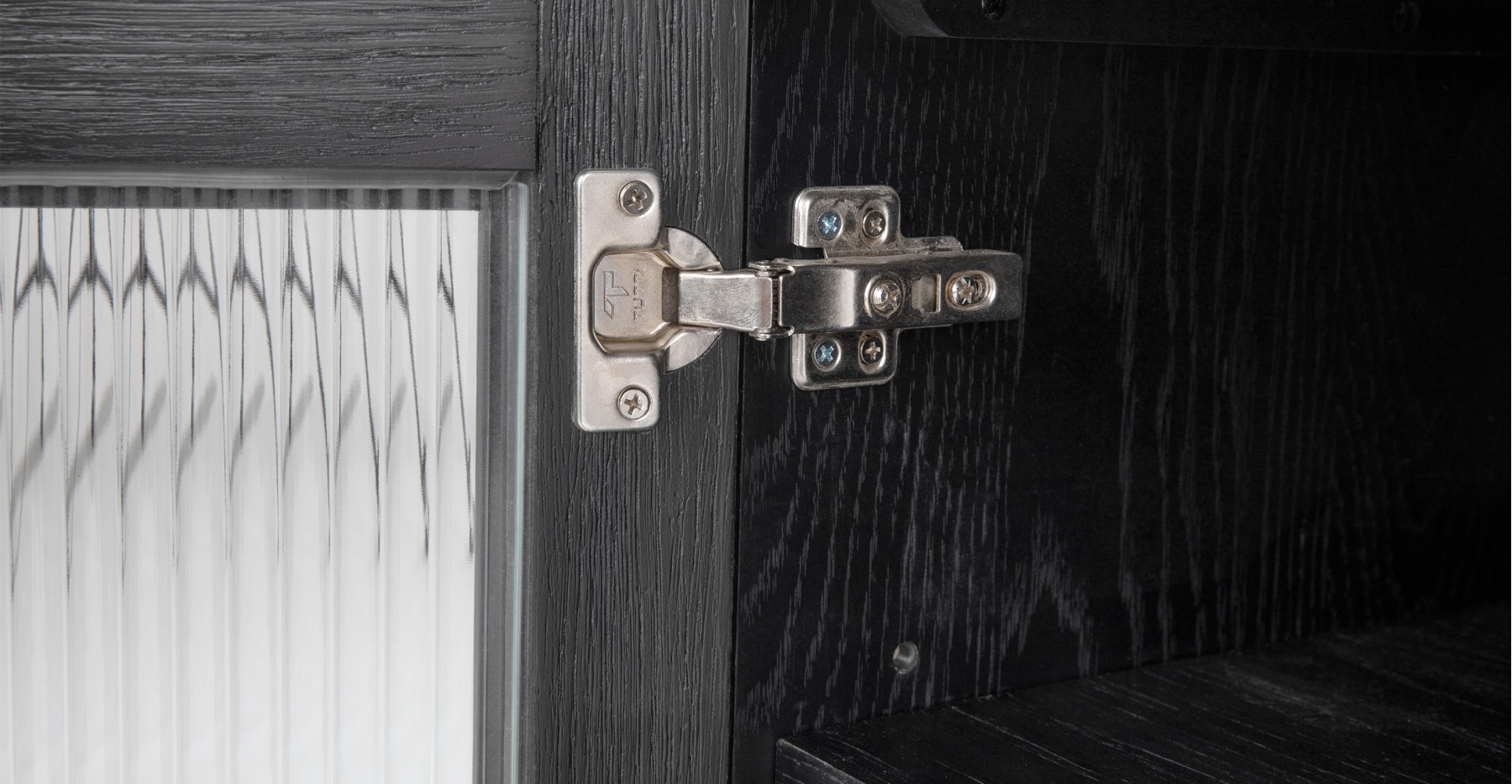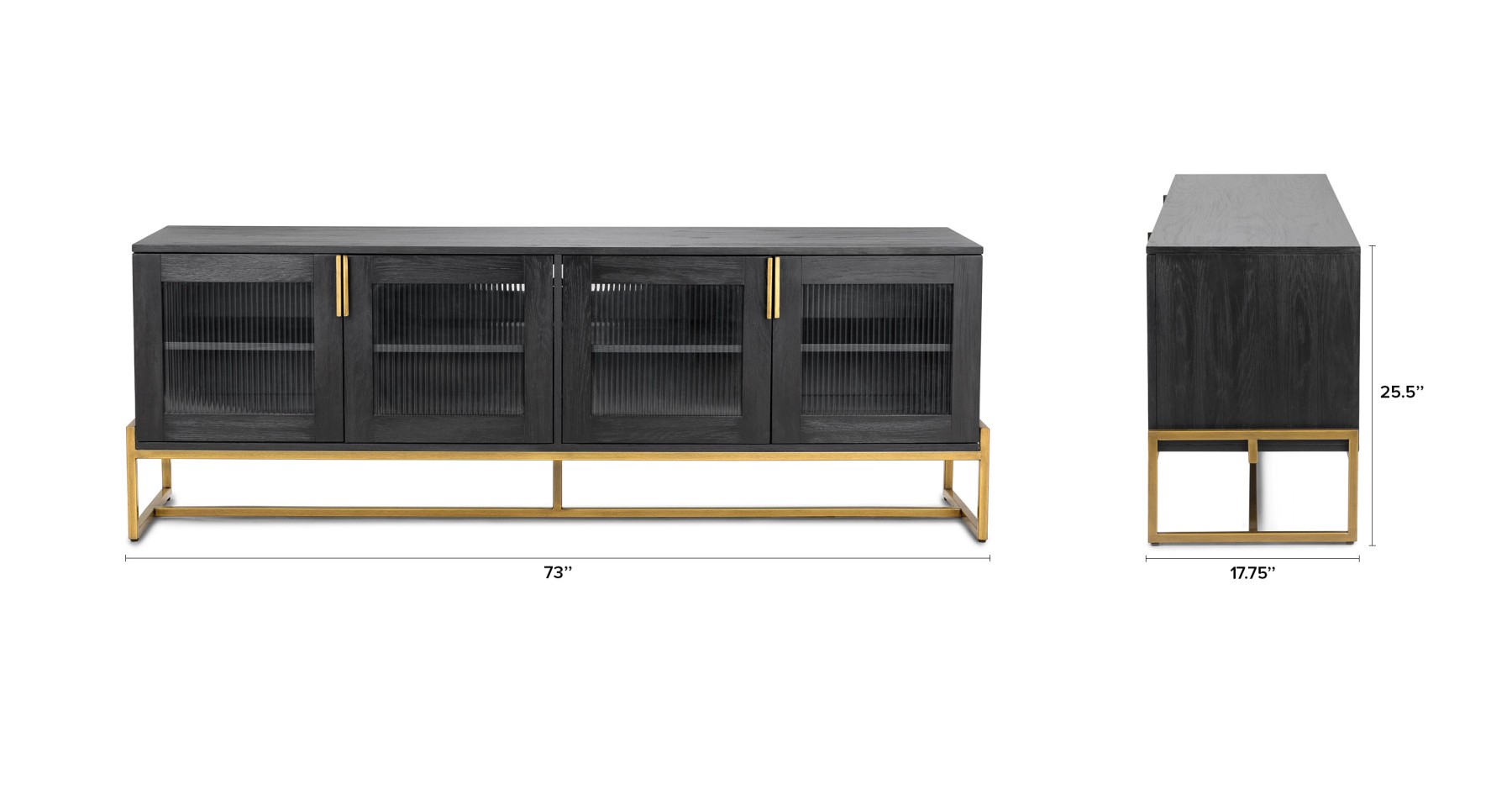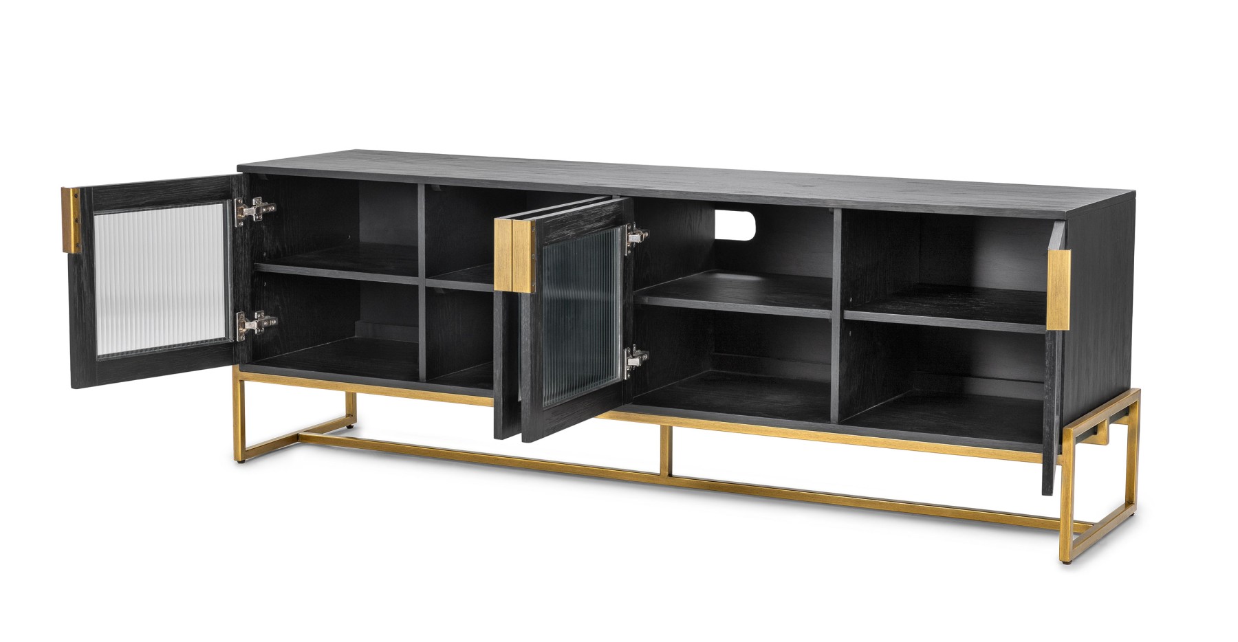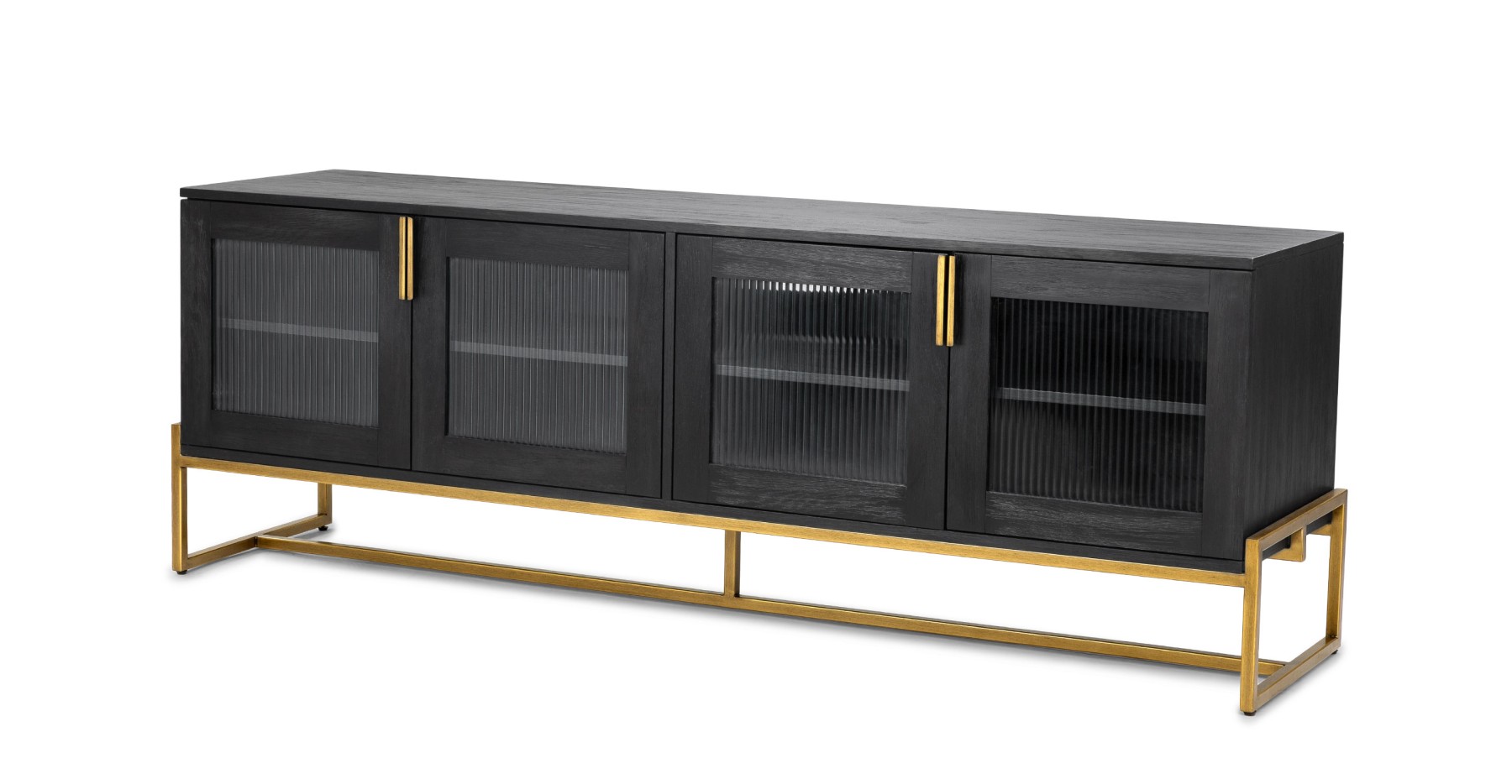 The Oscuro cabinet features natural wood grain juxtaposed against brushed metal for a modern feel. With four swinging, fluted glass doors, this cabinet comes equipped with adjustable shelves and ample space to help keep your home clutter-free.