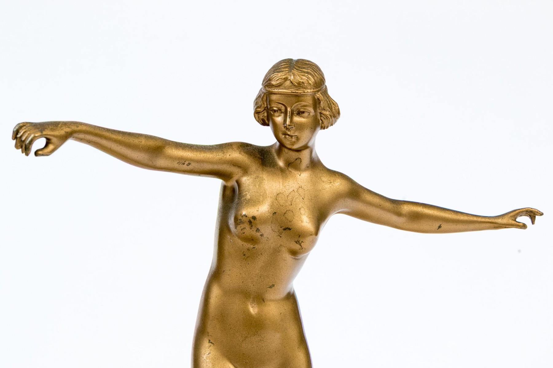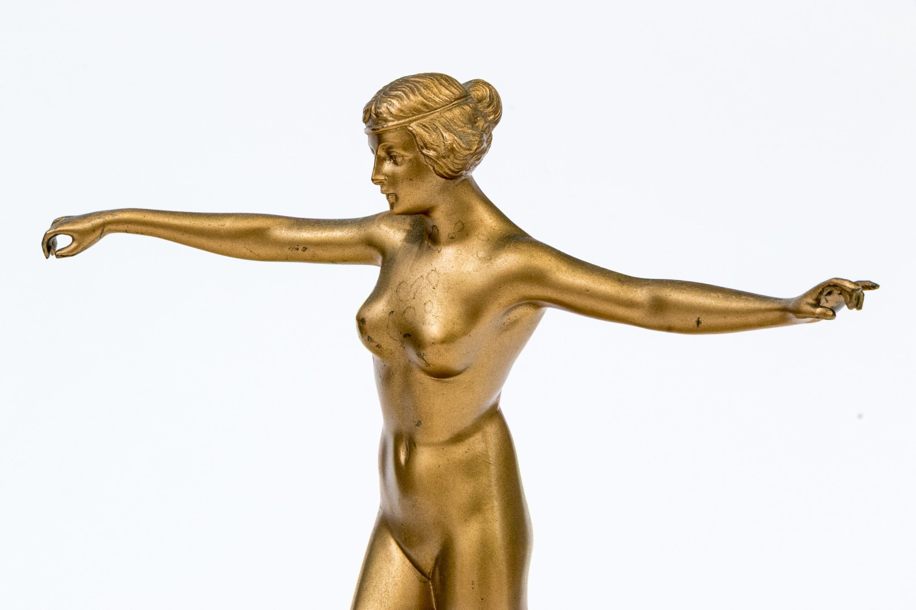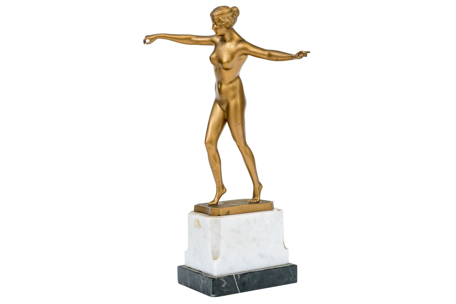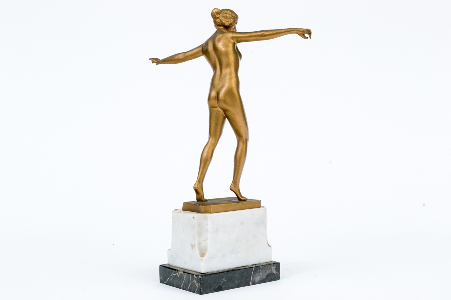 Otto Schmidt-Hofer (German, 1873-1925) gilt bronze figure of a female nude in a balancing dancing pose on her tiptoes over a rectangular cut-corner base. Signed on the base. Displayed atop a white and black stone plinth.