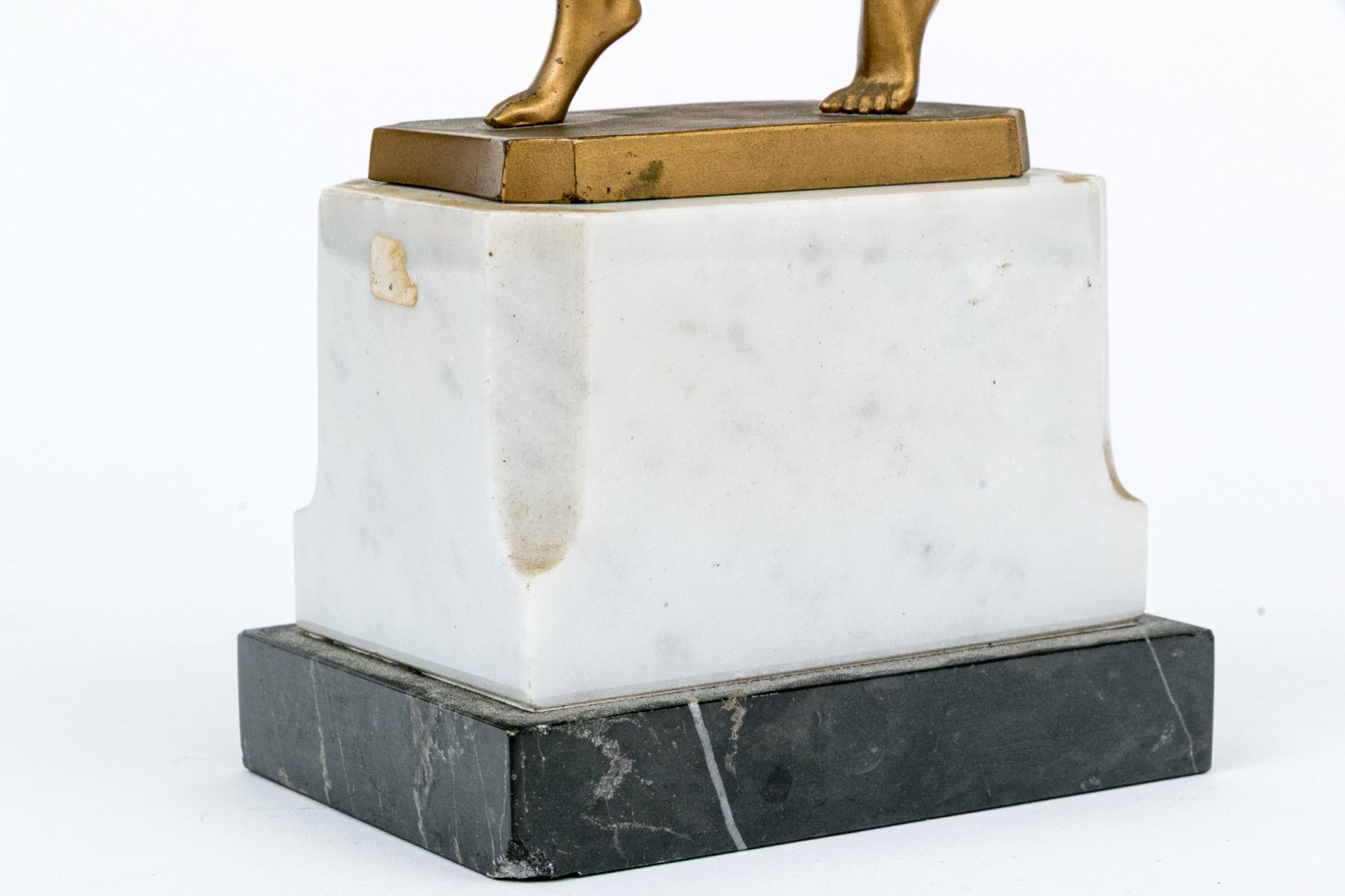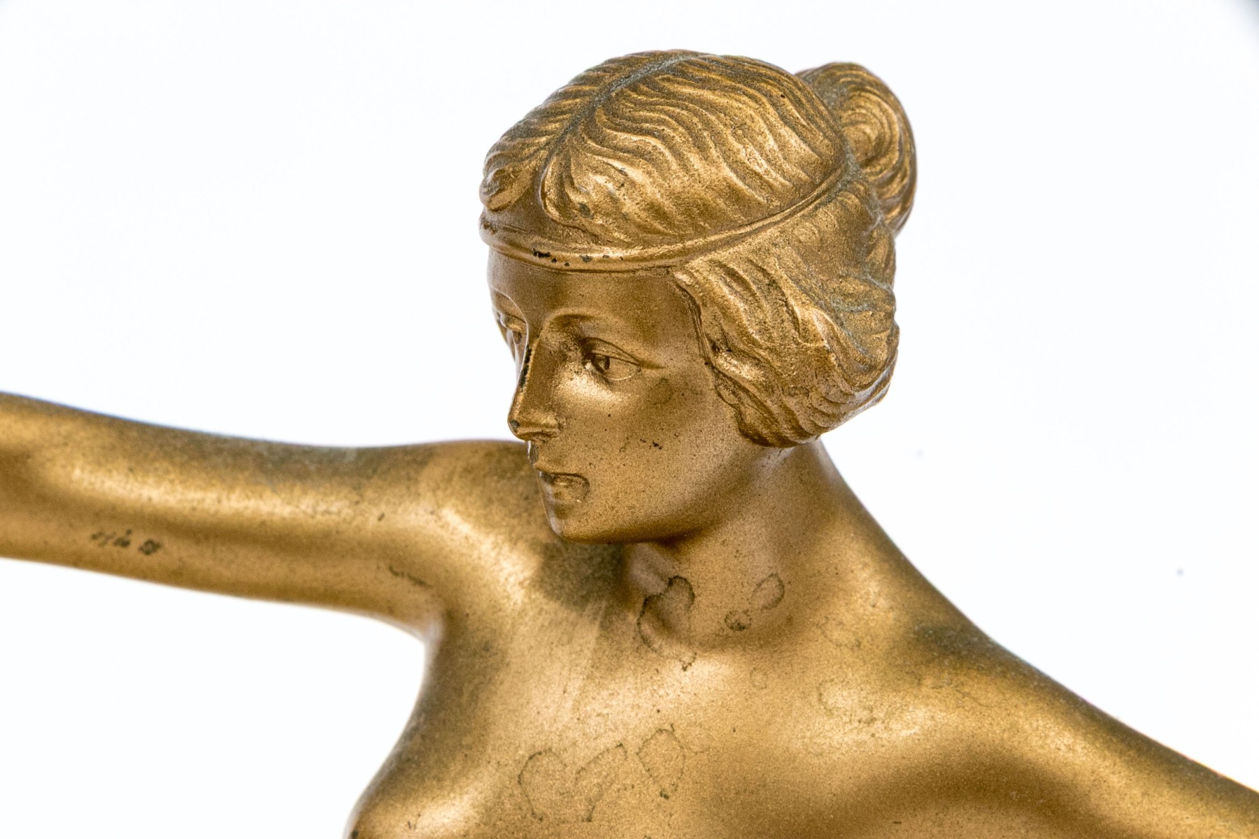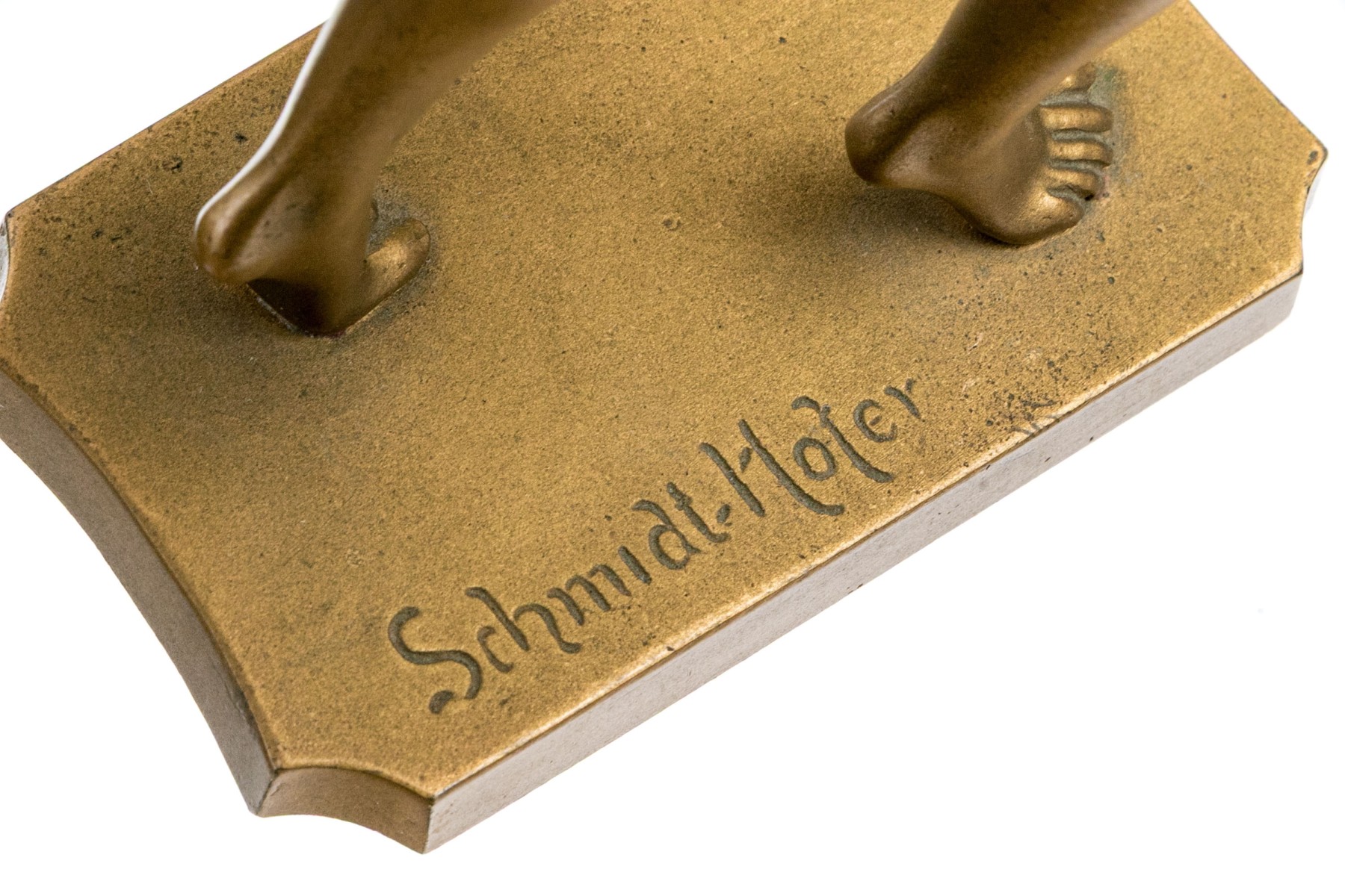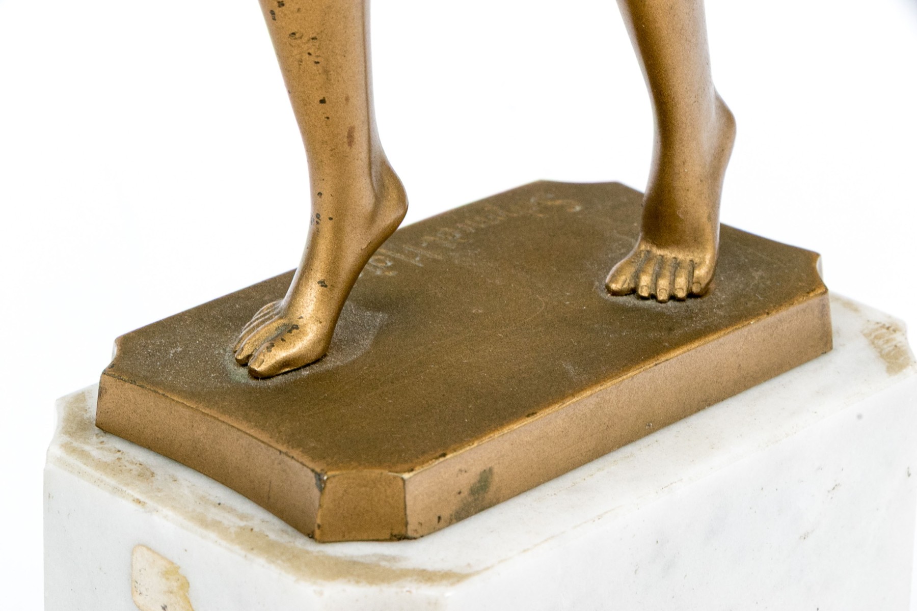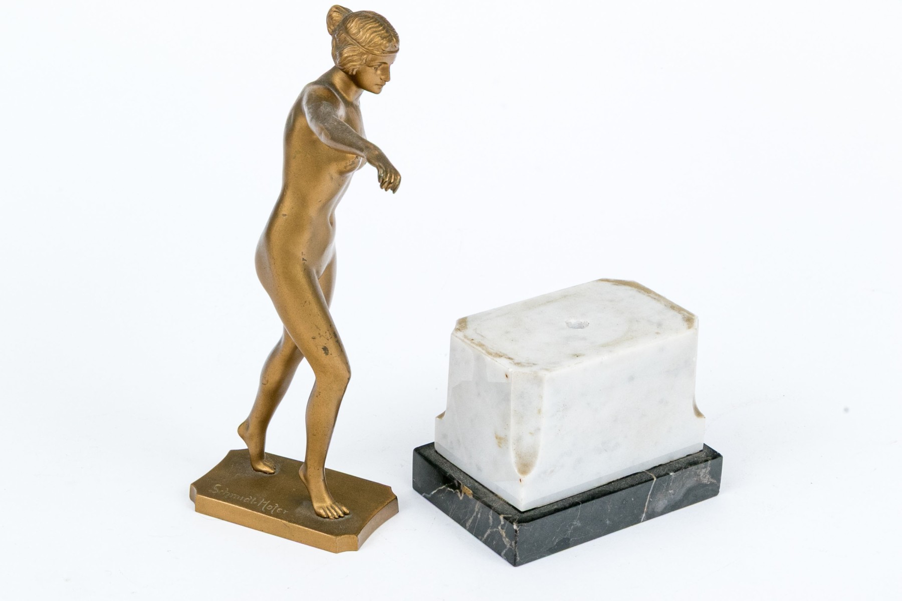 Otto Schmidt-Hofer (German, 1873-1925) gilt bronze figure of a female nude in a balancing dancing pose on her tiptoes over a rectangular cut-corner base. Signed on the base. Displayed atop a white and black stone plinth.