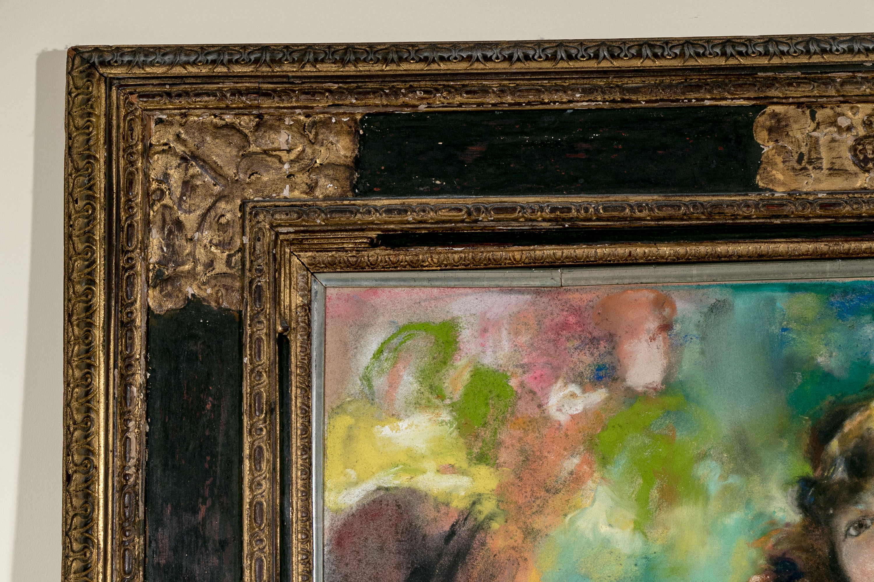 Presented in a wonderfully carved wood and gesso and gilt and ebonized finished frame.