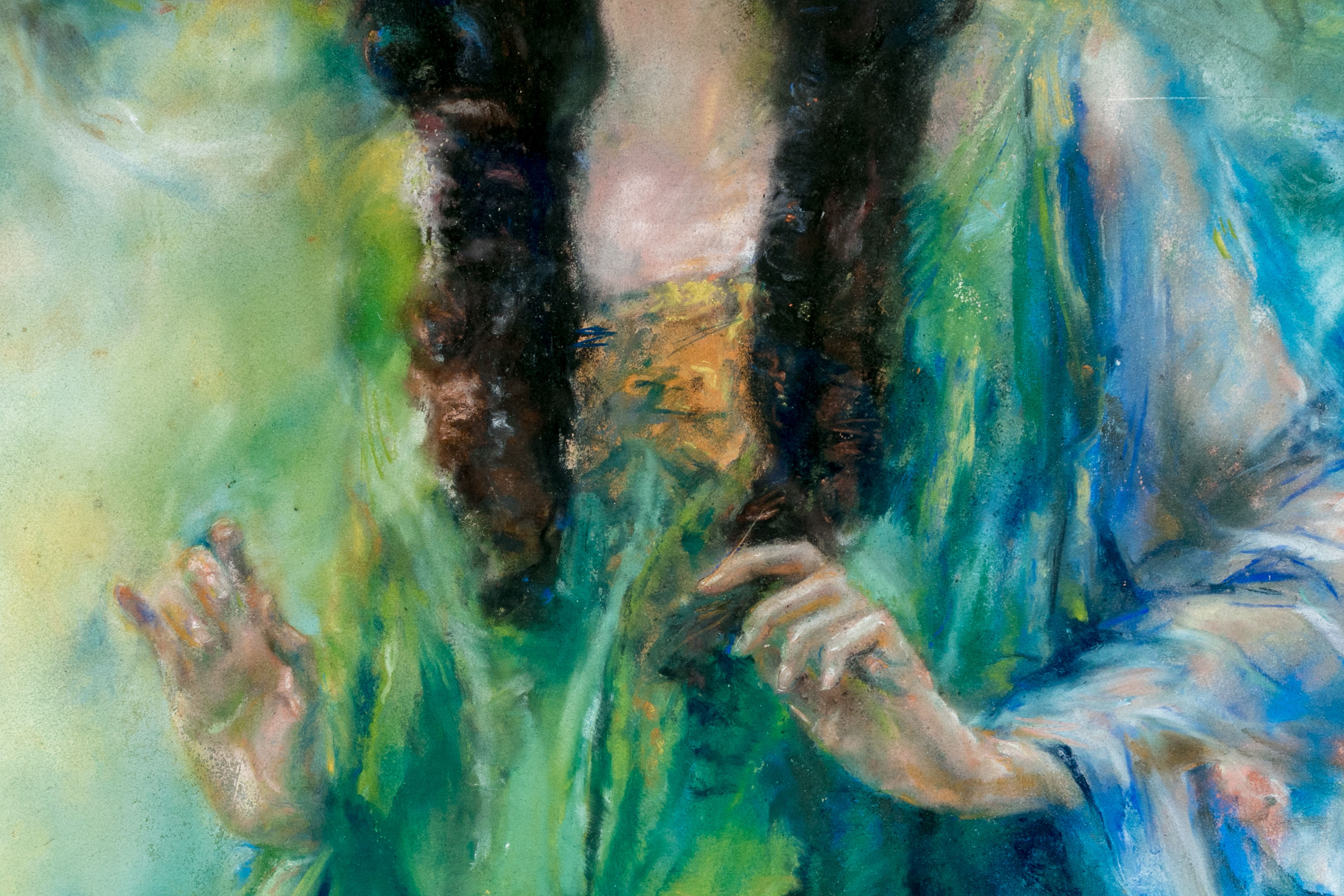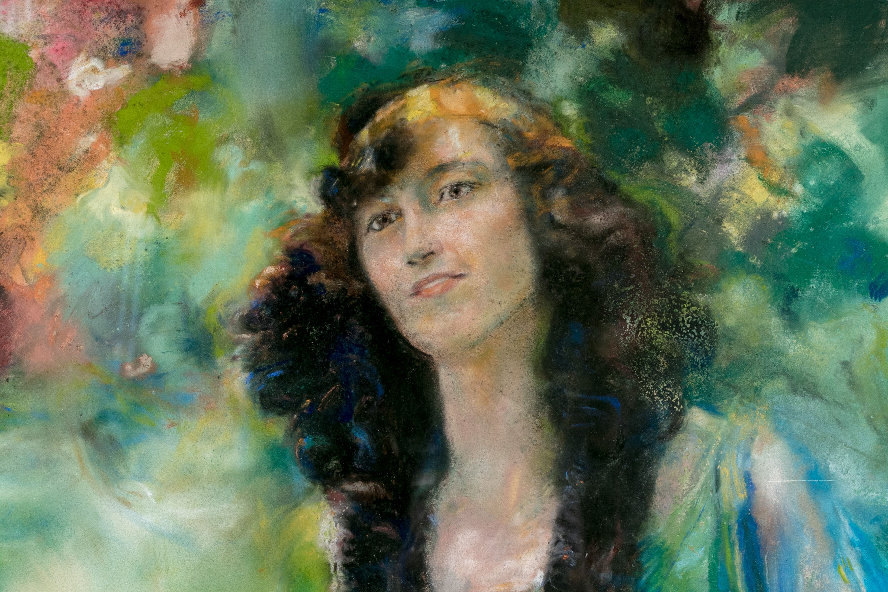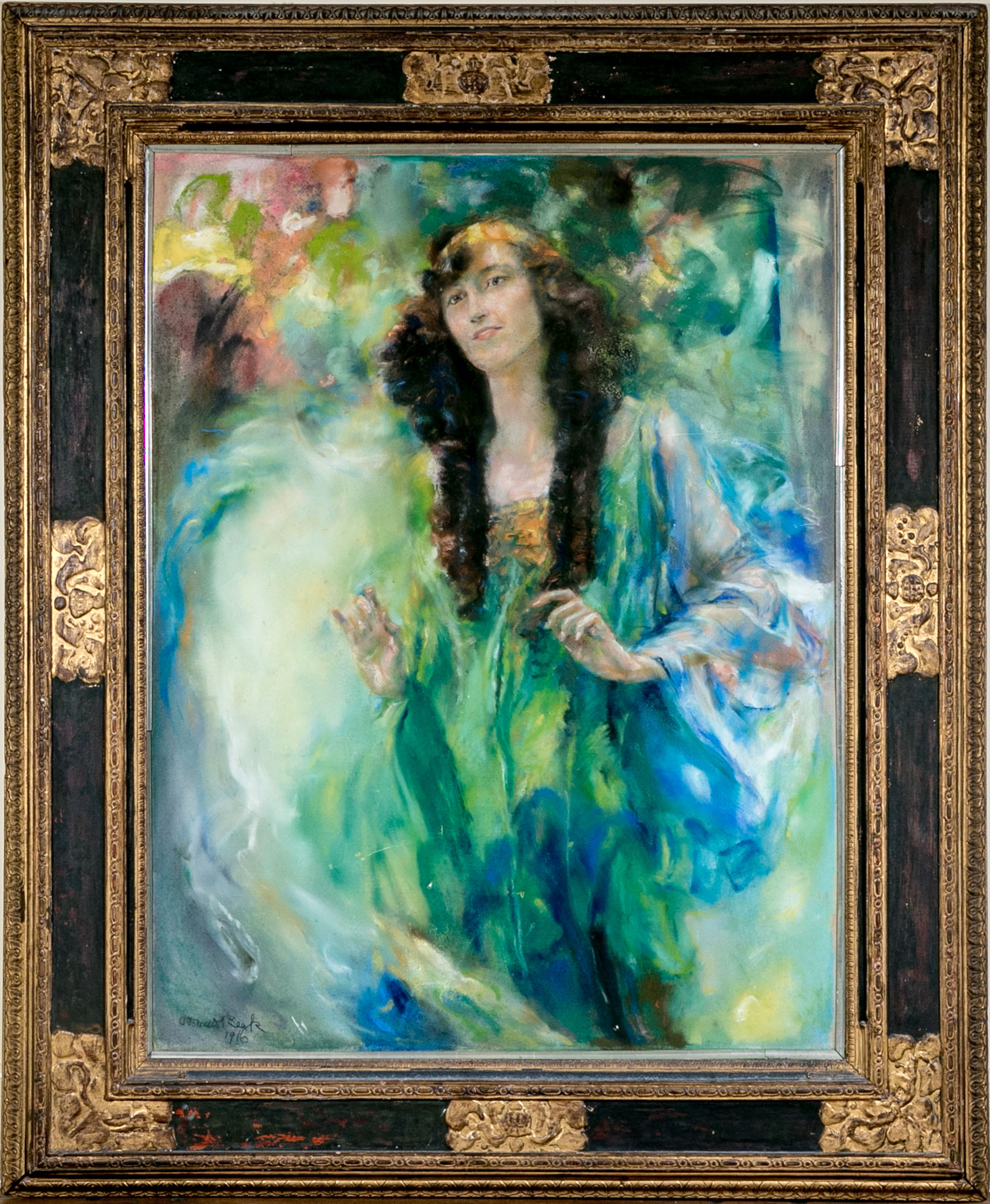 Otto Walter Beck (American, 1864-1954) large scale painting depicting a portrait of a young woman with long curly brunette hair wearing a yellow headband and green and blue dress with gossamer against a colorful dappled background. Pencil signed and dated lower left.