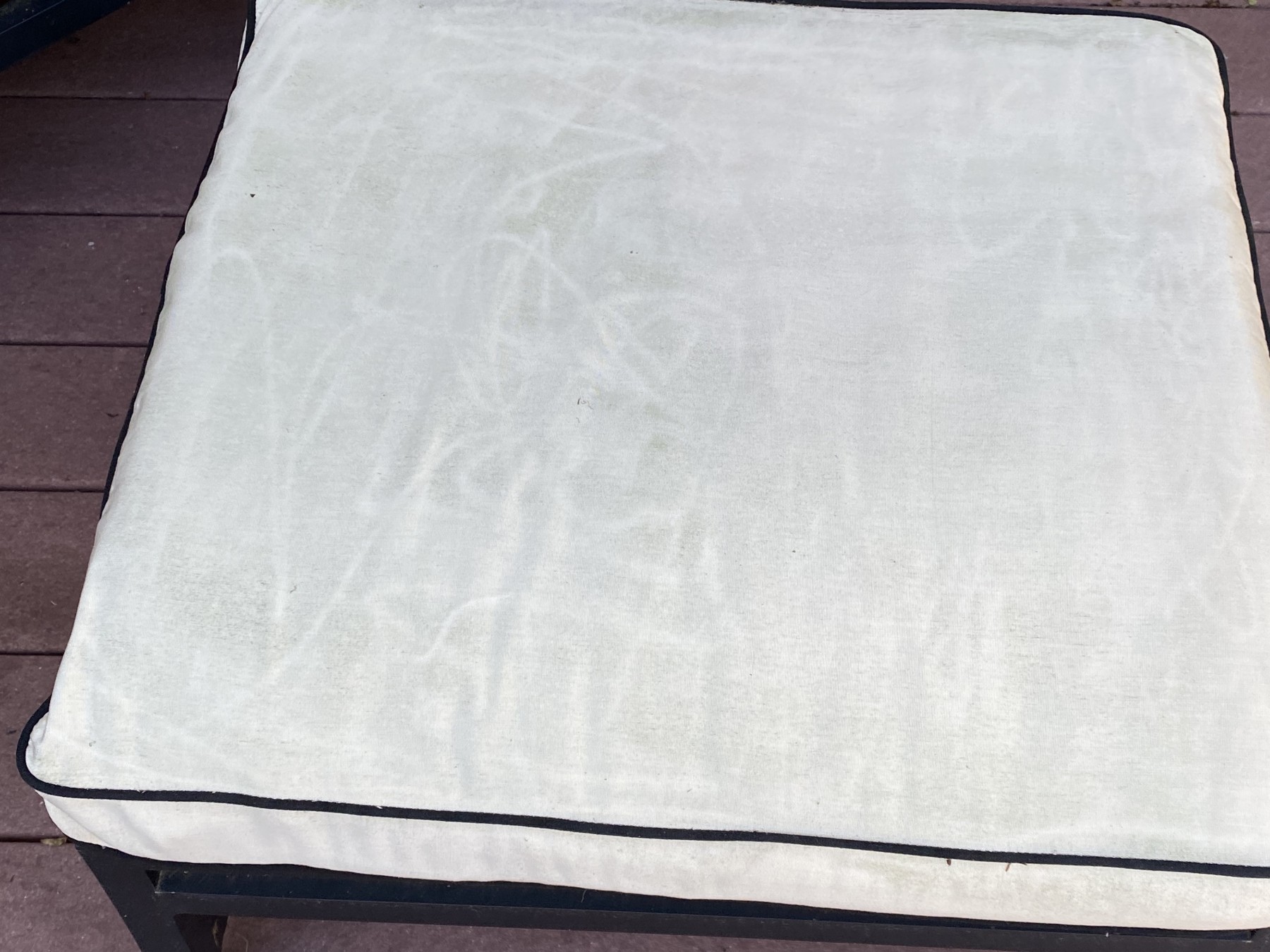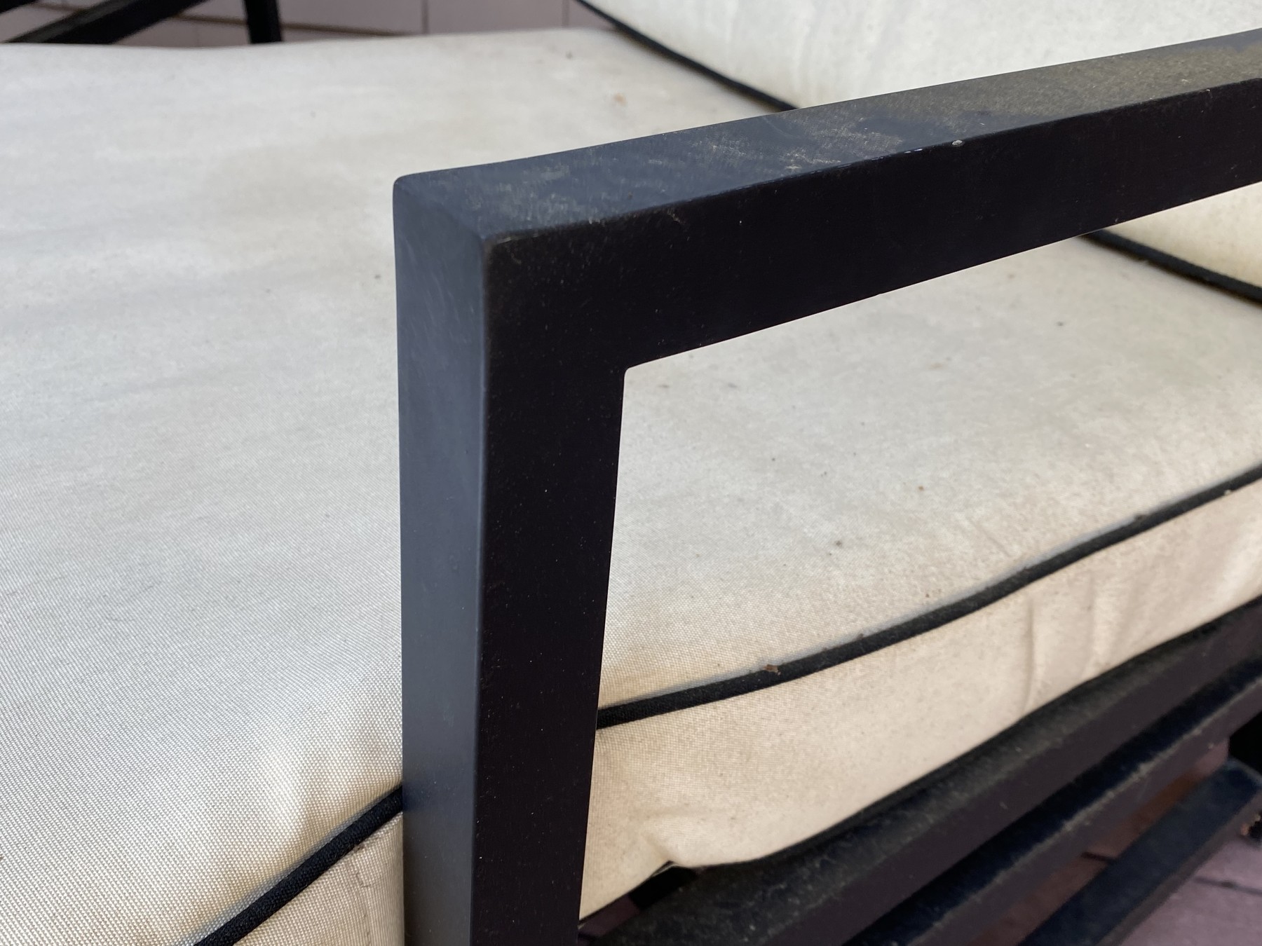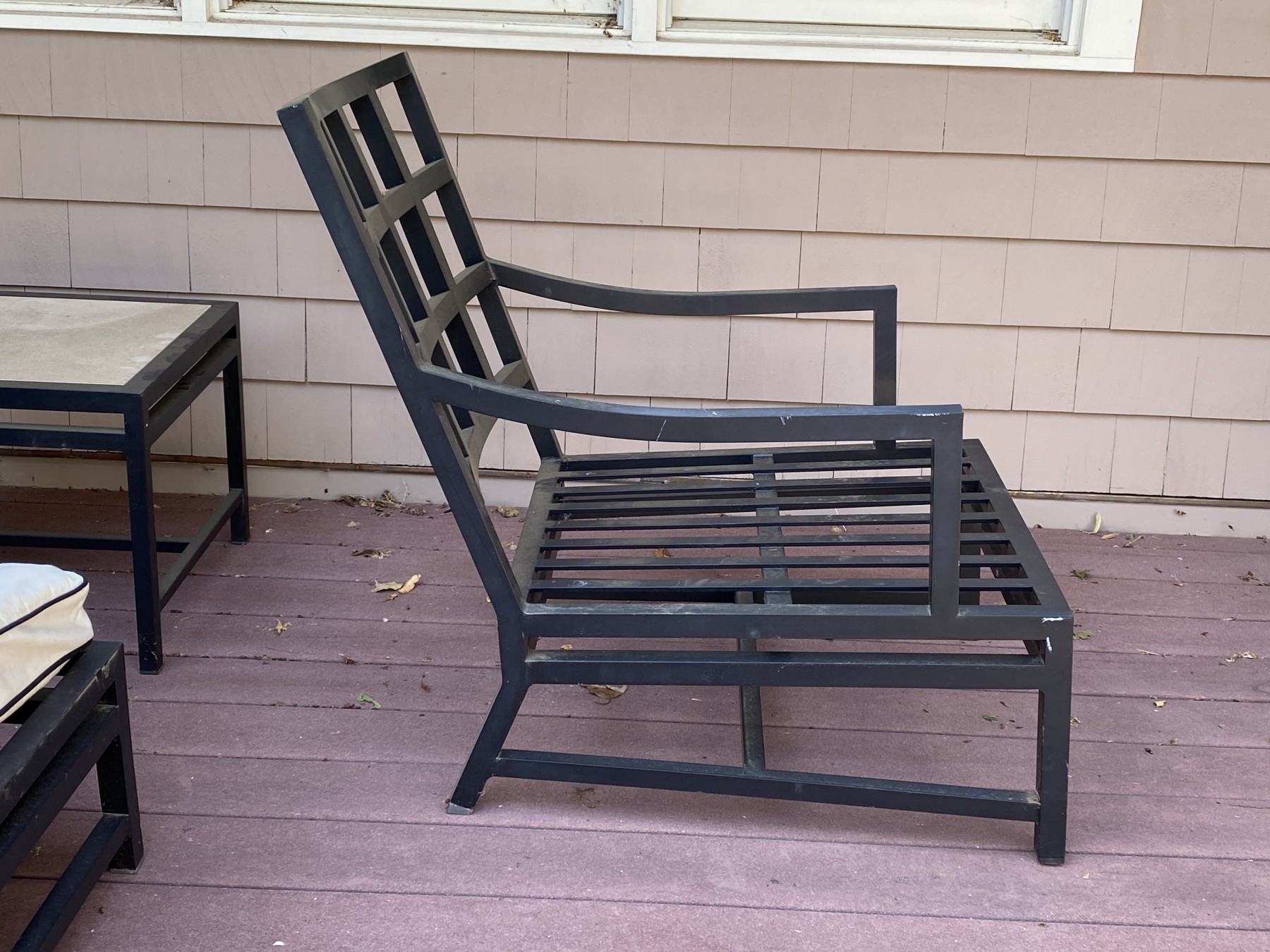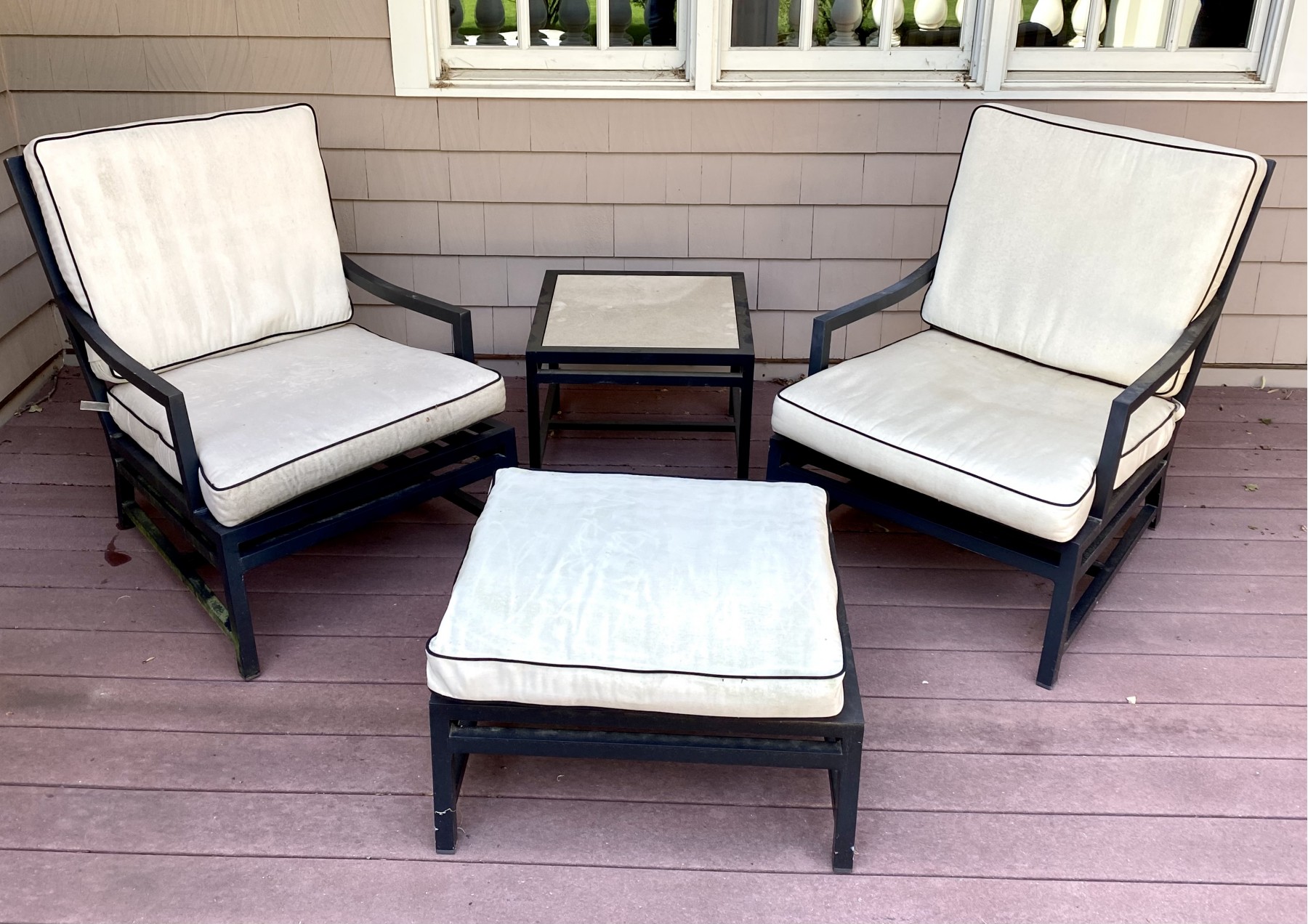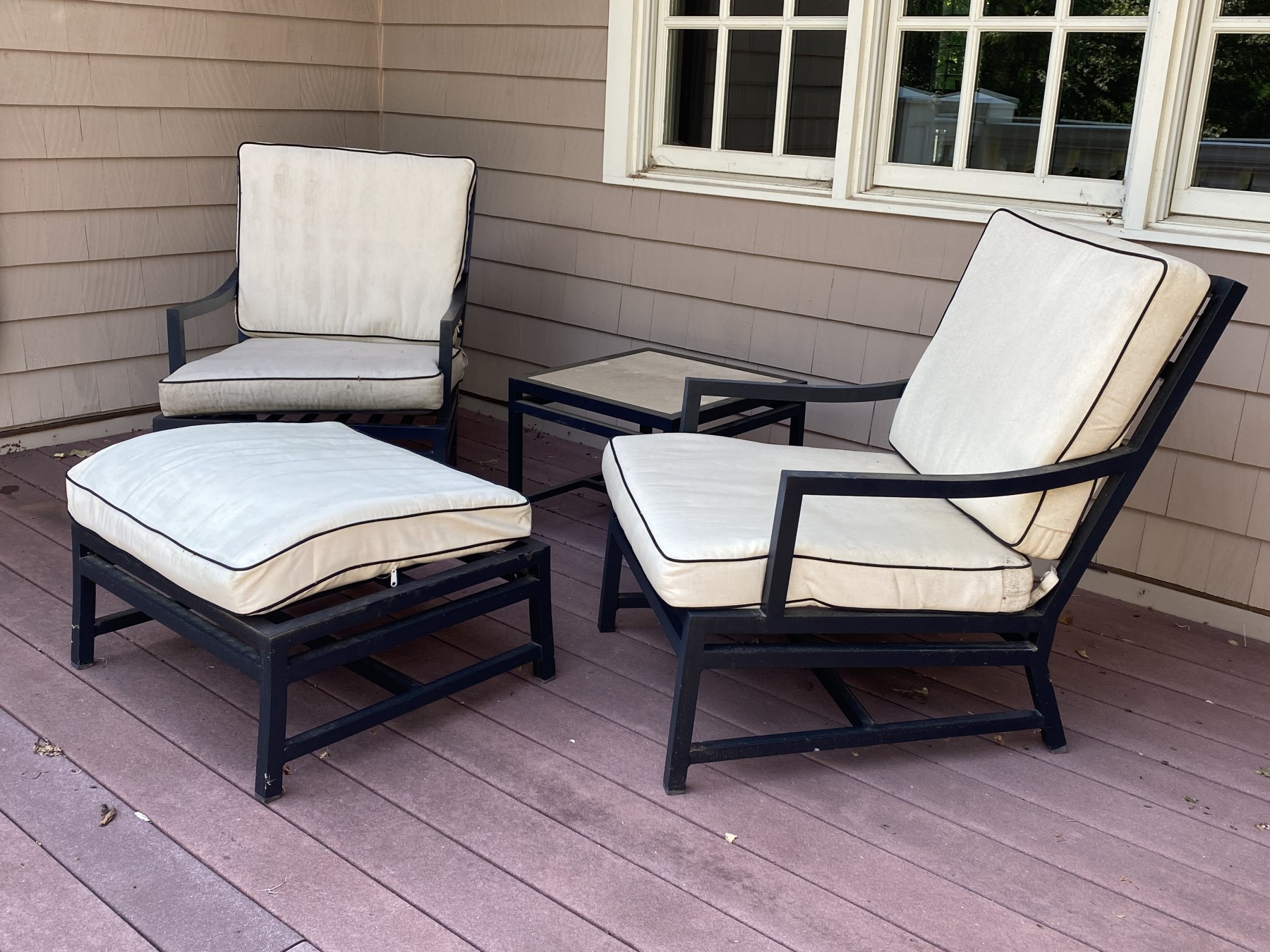 Powder-coated metal aluminum framed armchairs with Sunbrella upholstered cushions ( 32” H x 25 7/8” W x 22 1/4” D 16 3/4”, Seat height) Together with one ottoman and one side table.