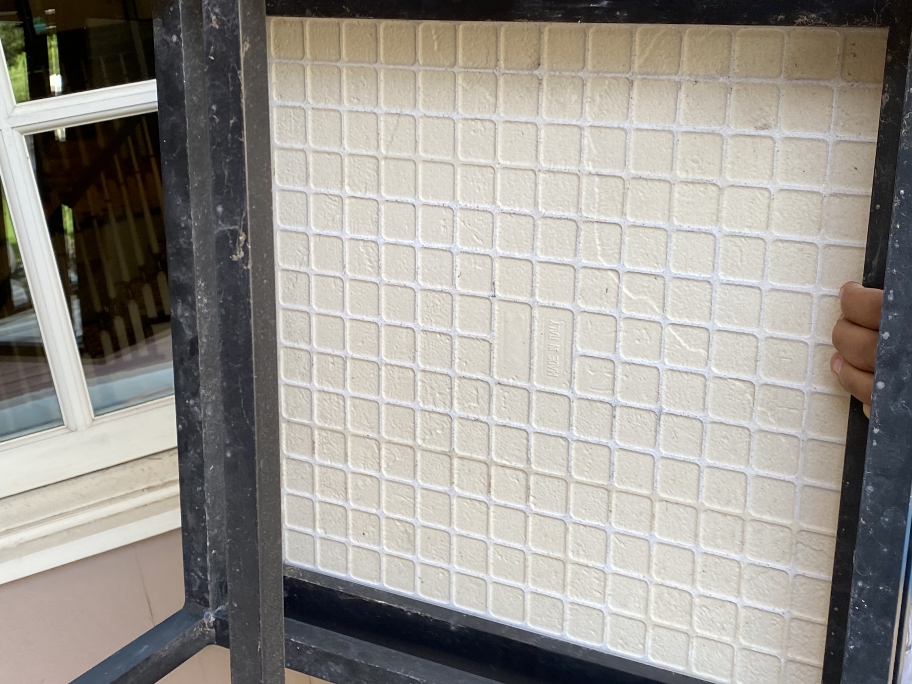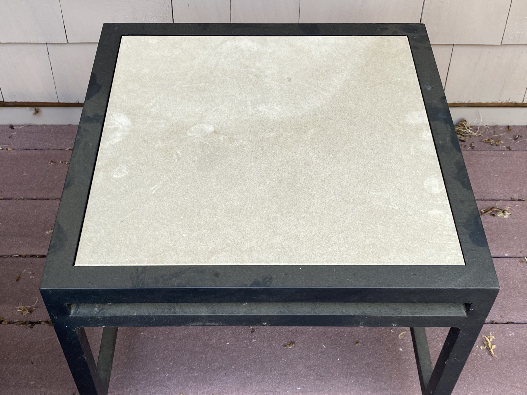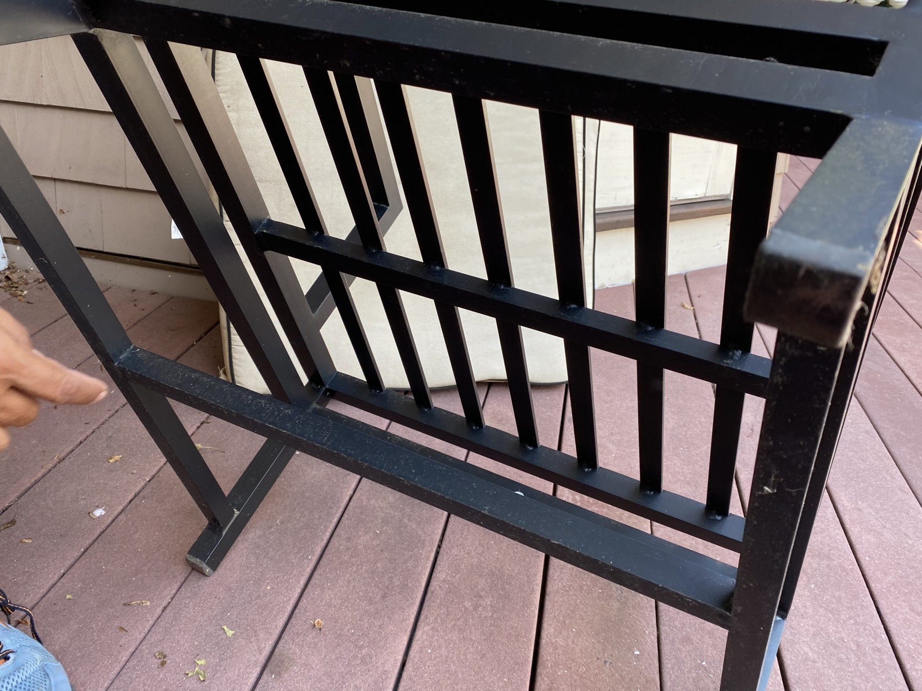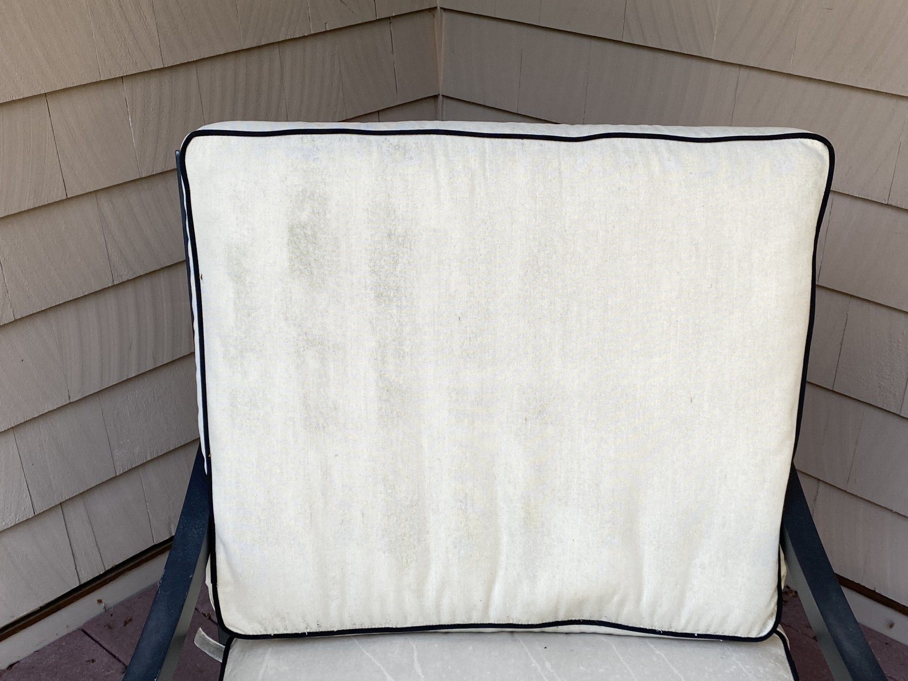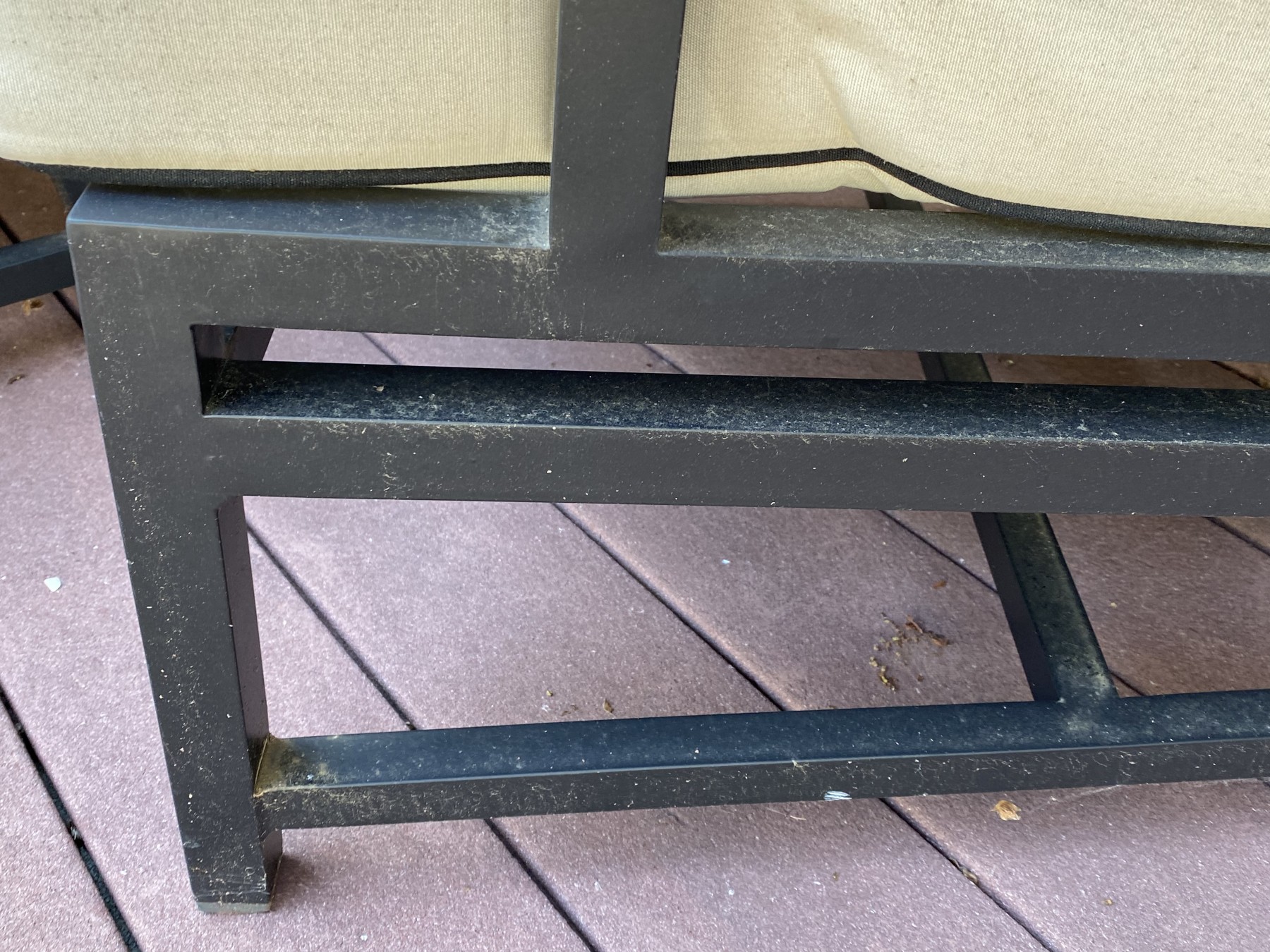 Powder-coated metal aluminum framed armchairs with Sunbrella upholstered cushions ( 32” H x 25 7/8” W x 22 1/4” D 16 3/4”, Seat height) Together with one ottoman and one side table.