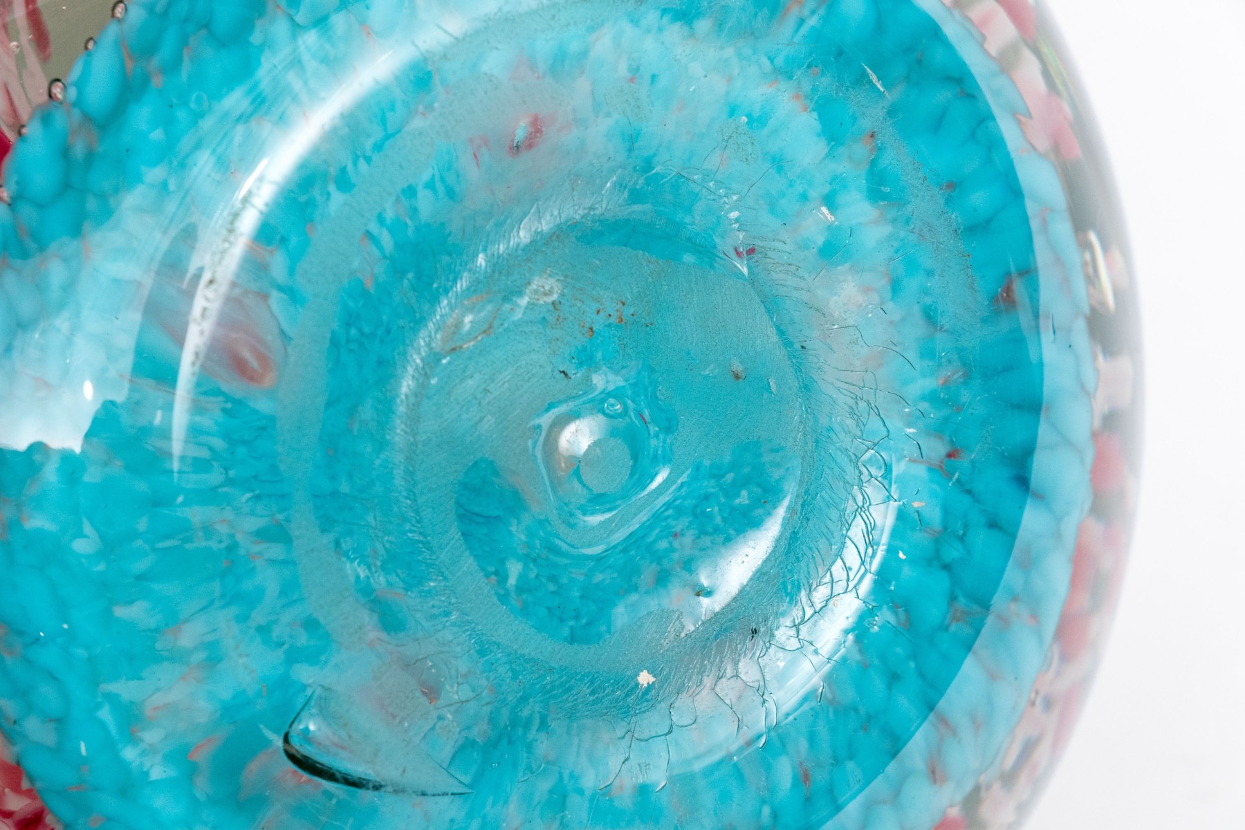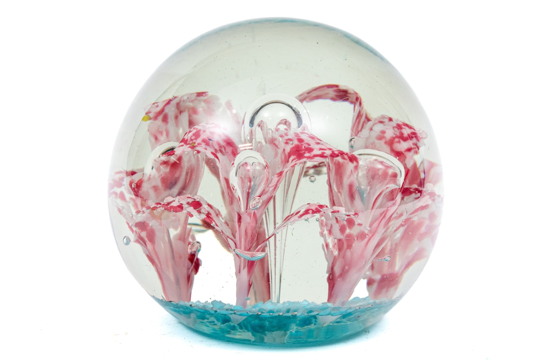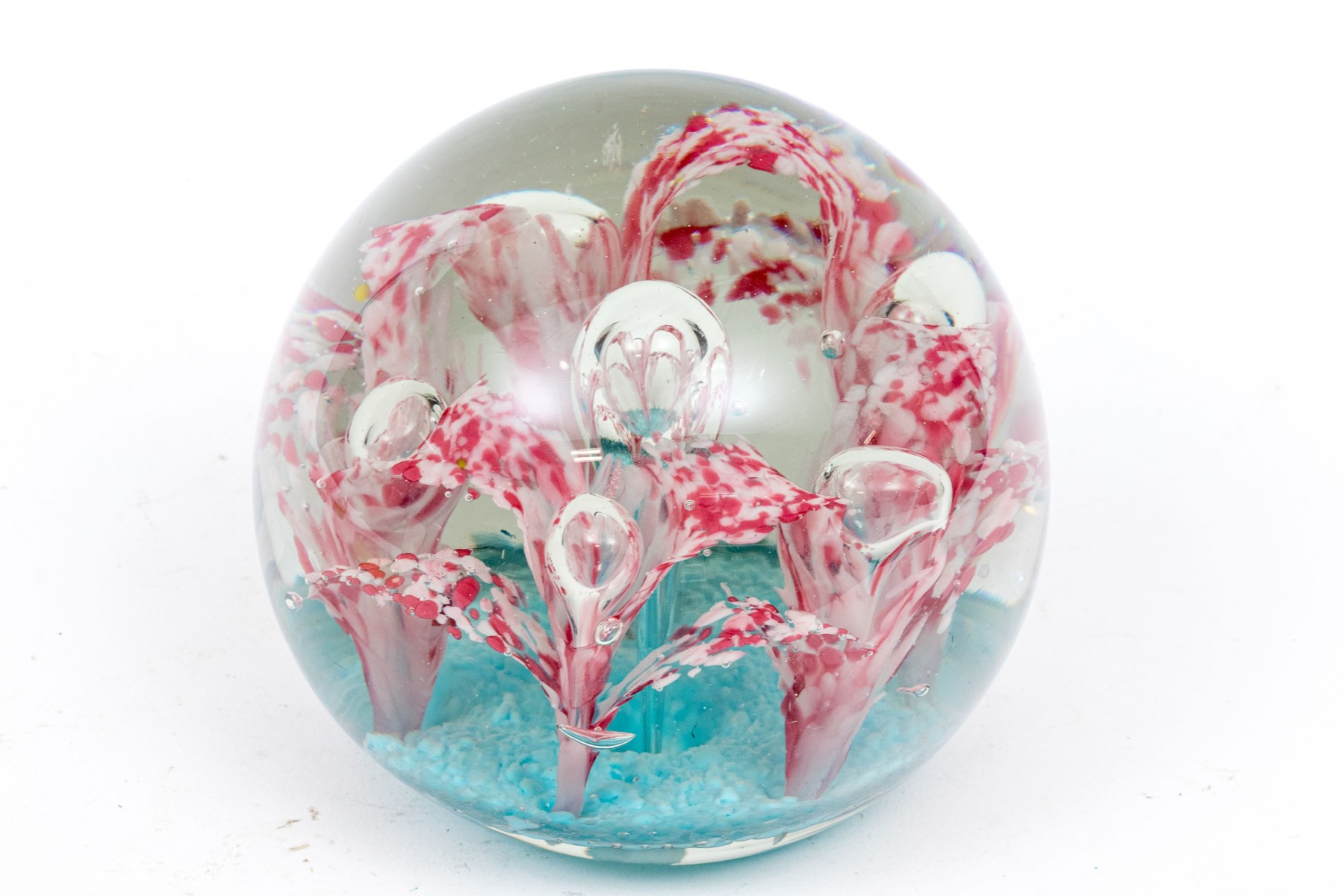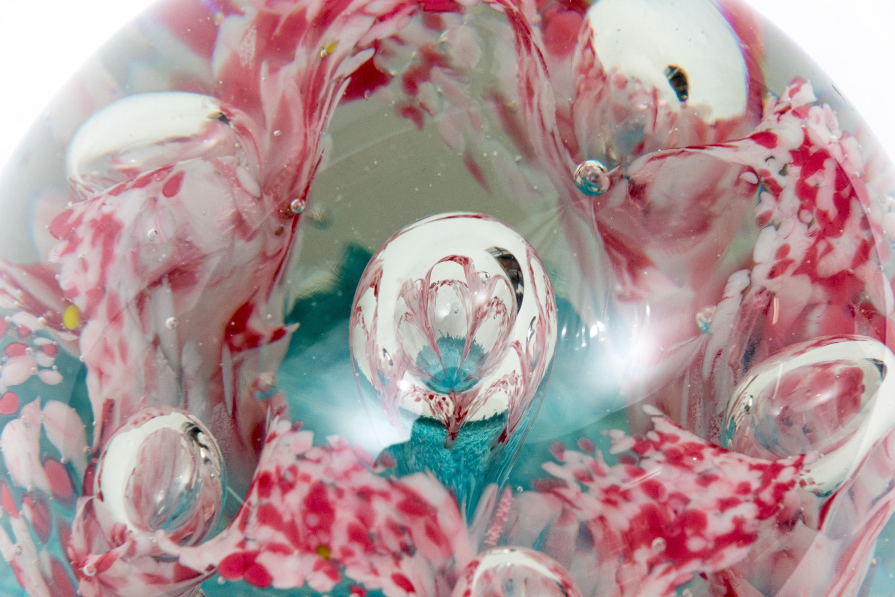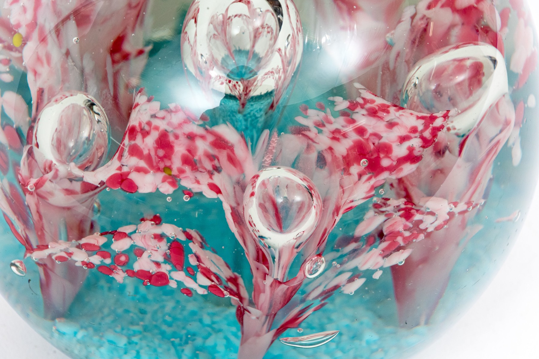 A charming oversized art glass paperweight showcasing a field of stunning white and pinkish-red flowers with suspended bubbles over an aqua blue base. The paperweight has a classic spherical form with a flattened bottom.