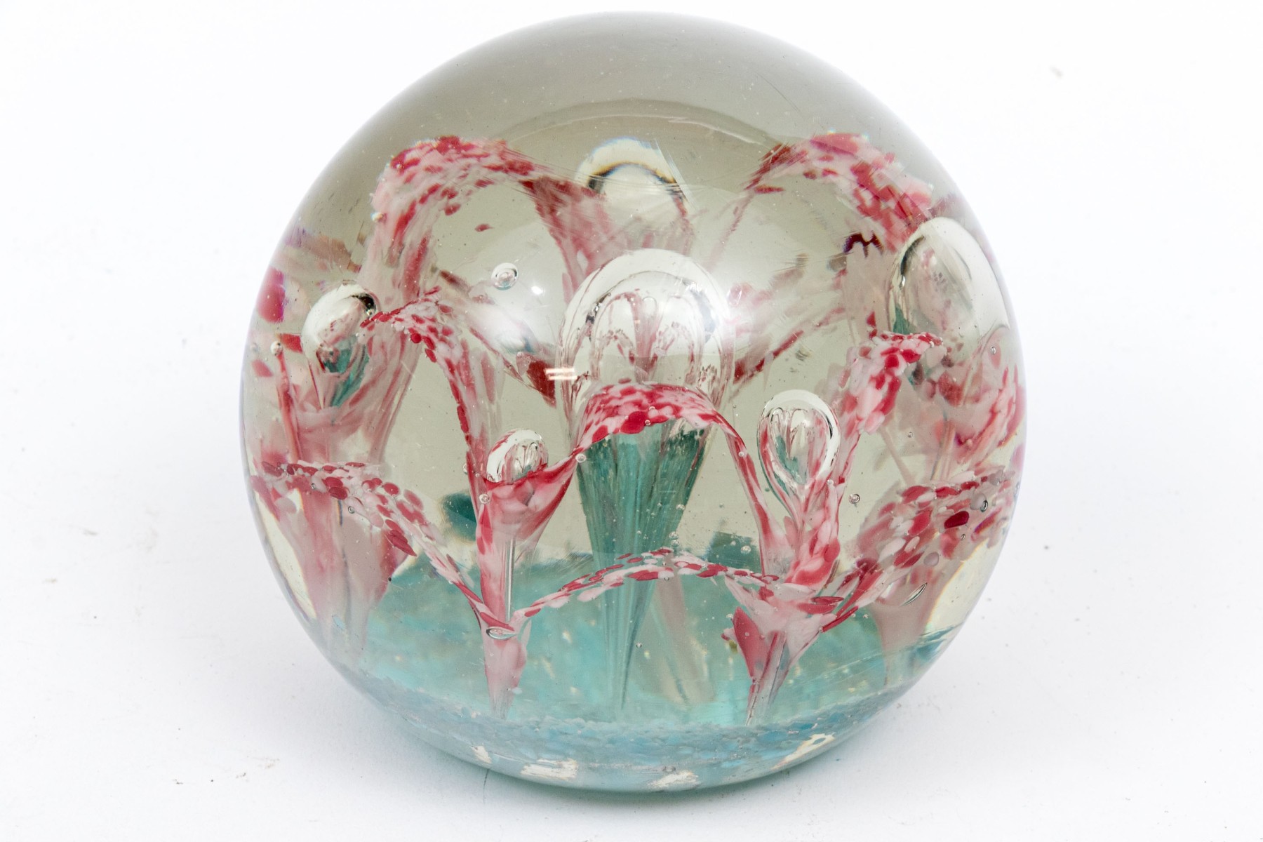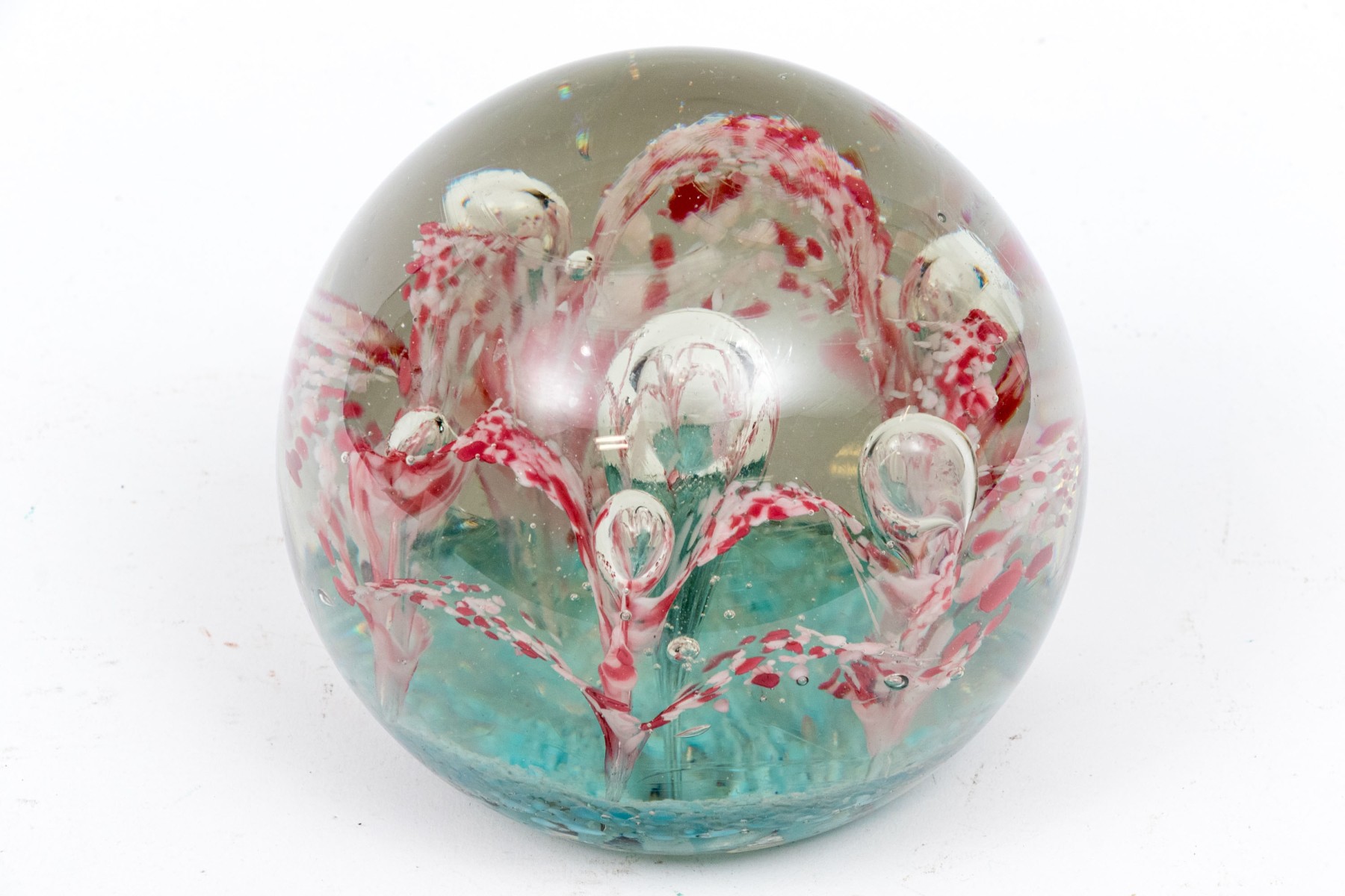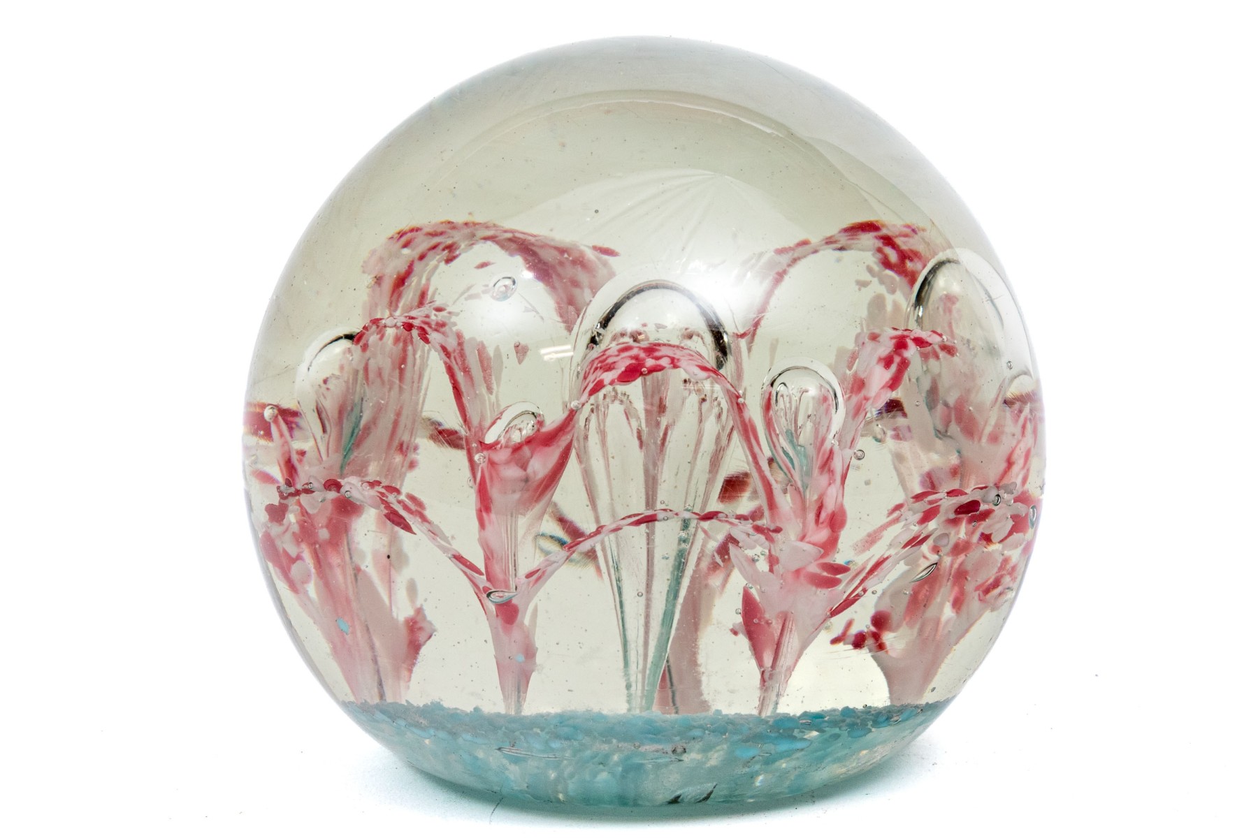 A charming oversized art glass paperweight showcasing a field of stunning white and pinkish-red flowers with suspended bubbles over an aqua blue base. The paperweight has a classic spherical form with a flattened bottom.