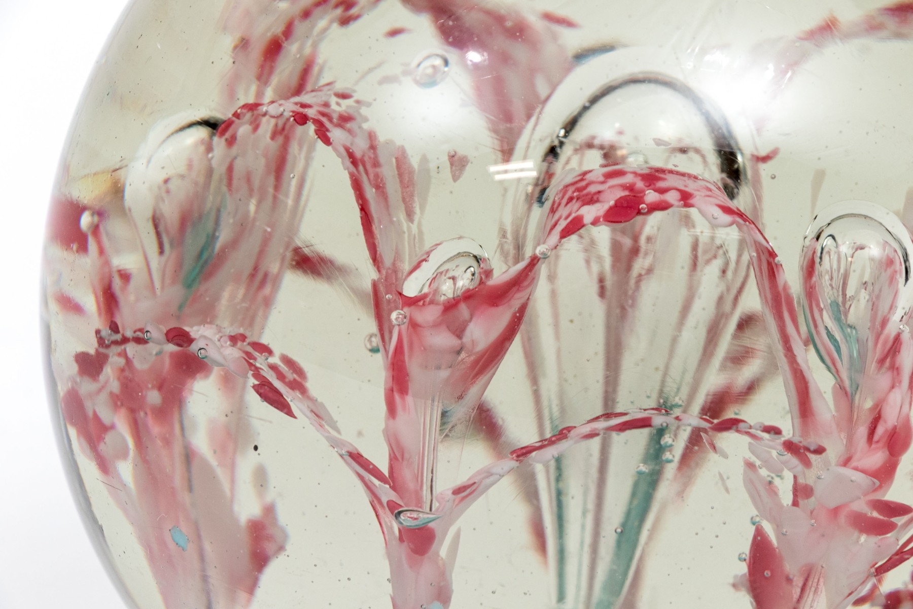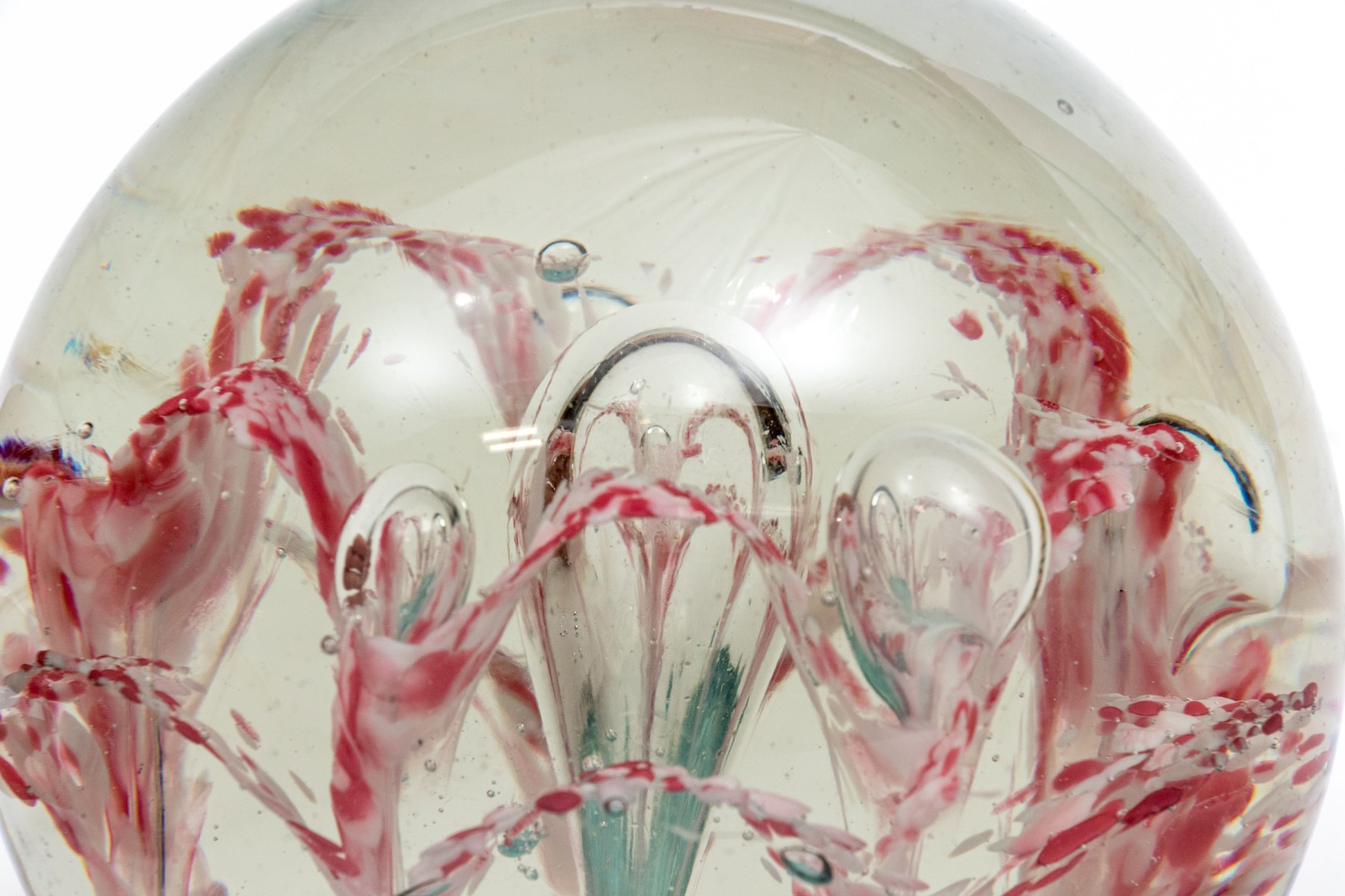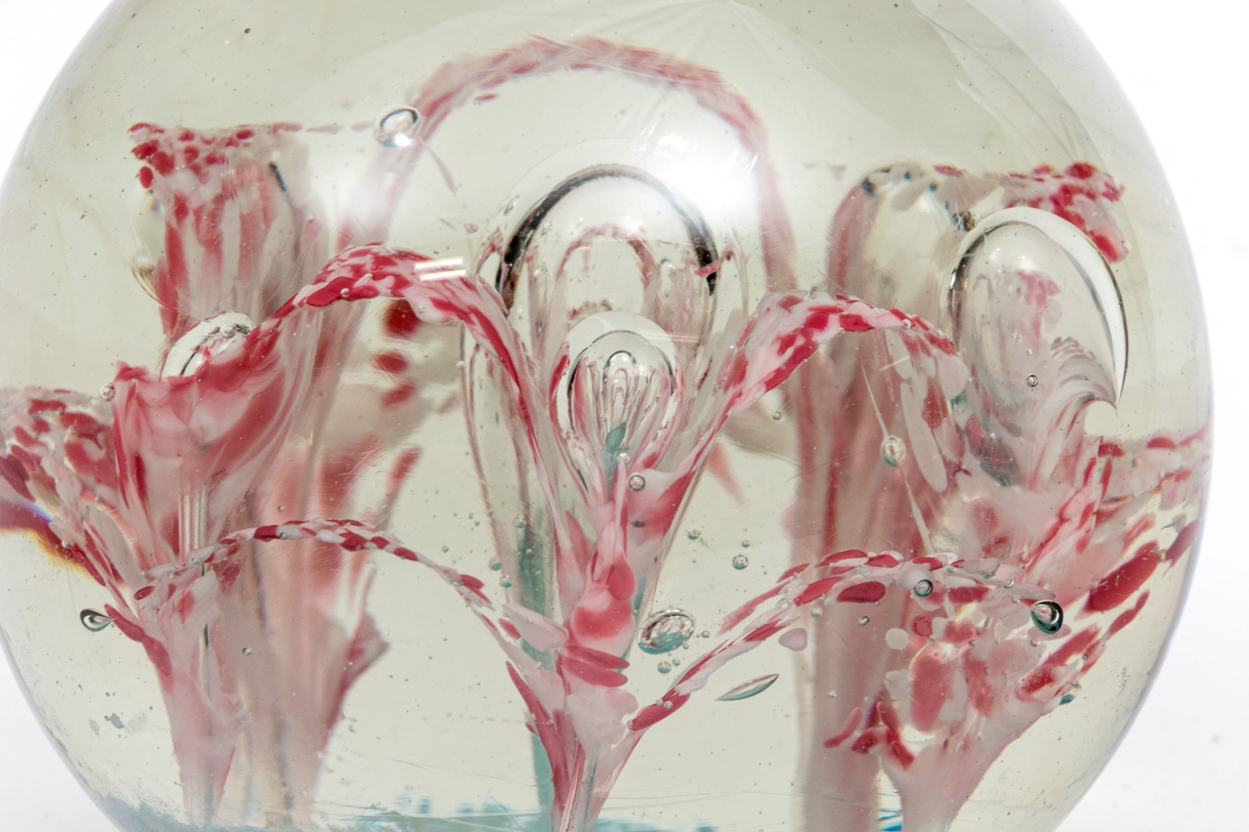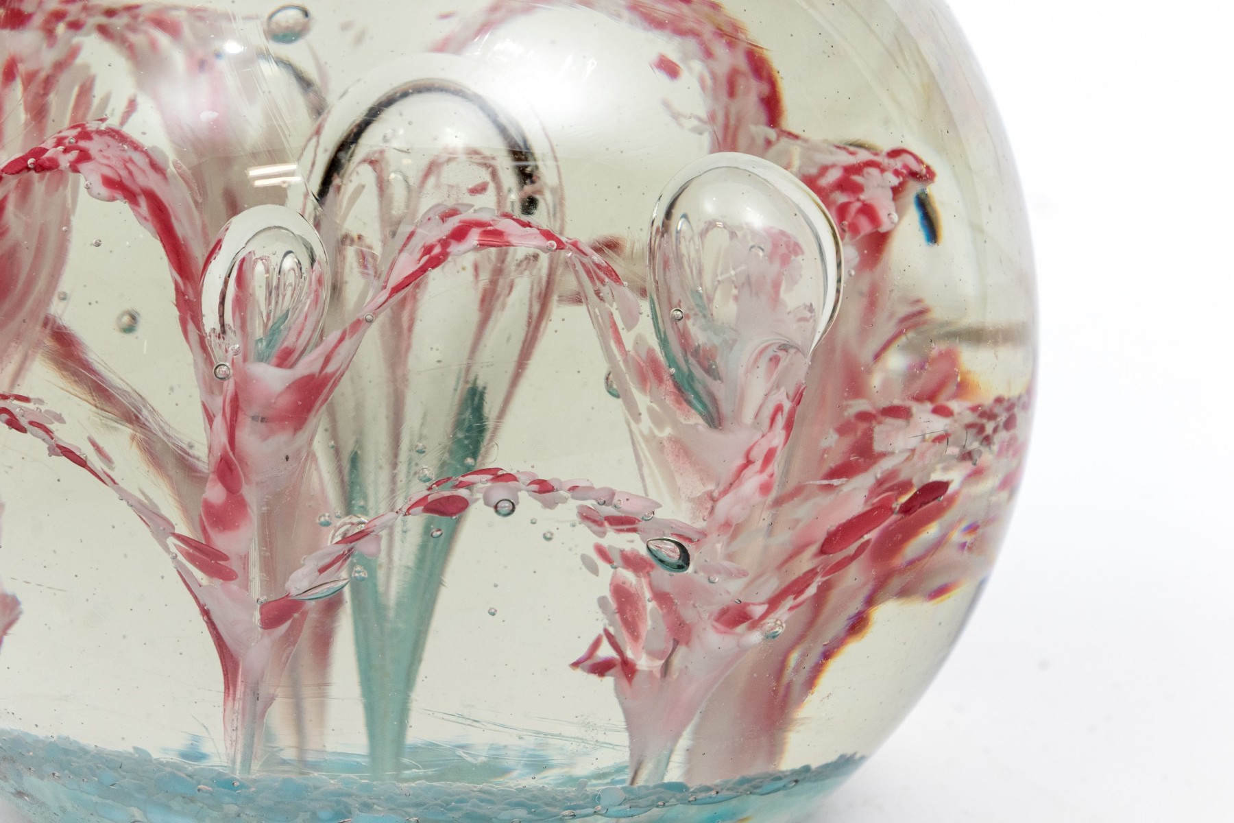 A charming oversized art glass paperweight showcasing a field of stunning white and pinkish-red flowers with suspended bubbles over an aqua blue base. The paperweight has a classic spherical form with a flattened bottom.