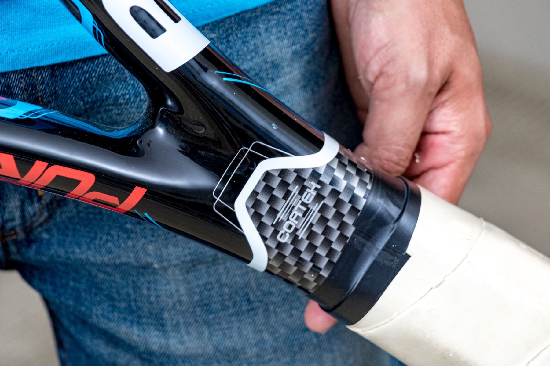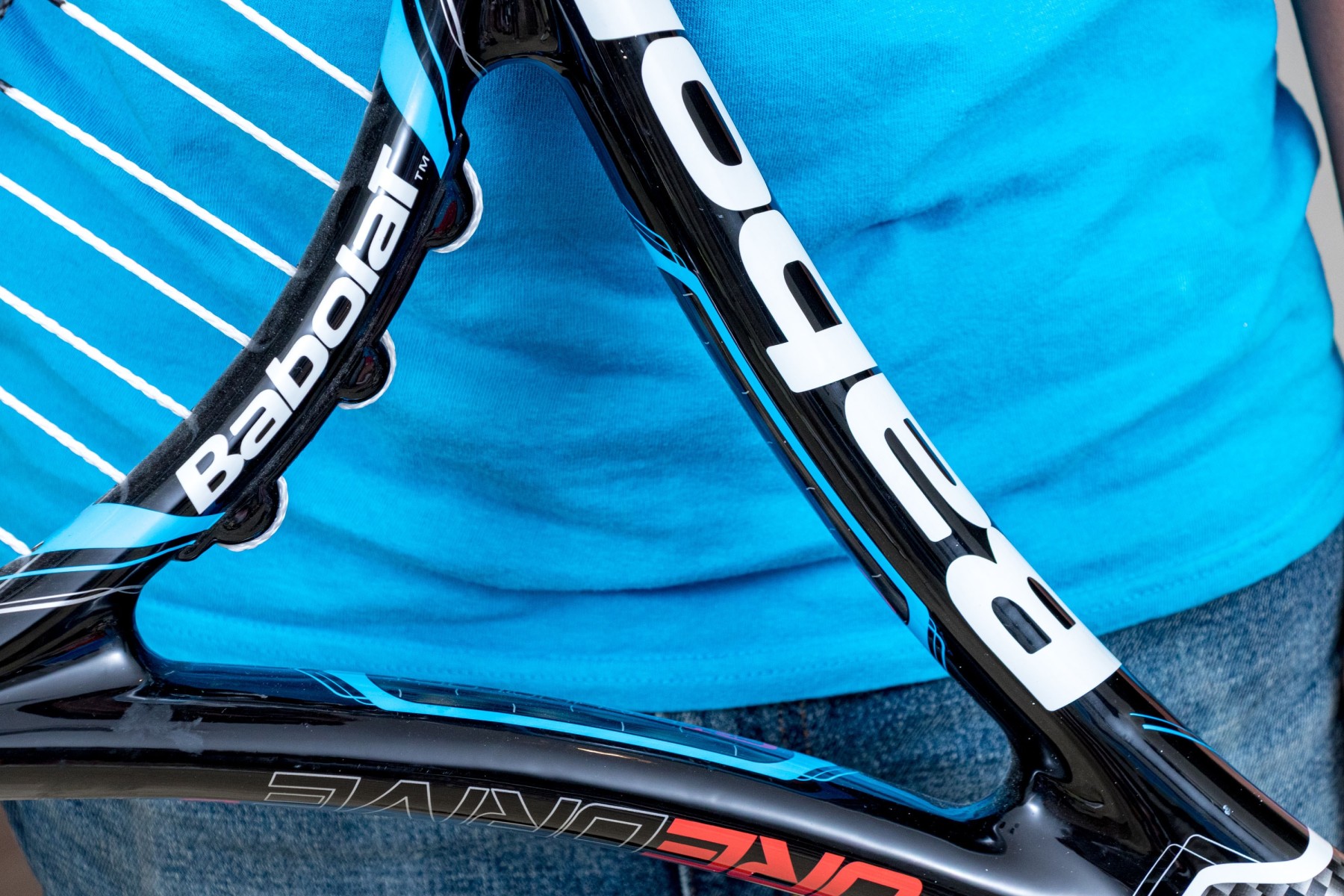 A high quality oversized Babolat AeroPro Drive tennis racket strung in white with black lower accents with a stylish black, white, and electric blue frame. Taped white down the handle.