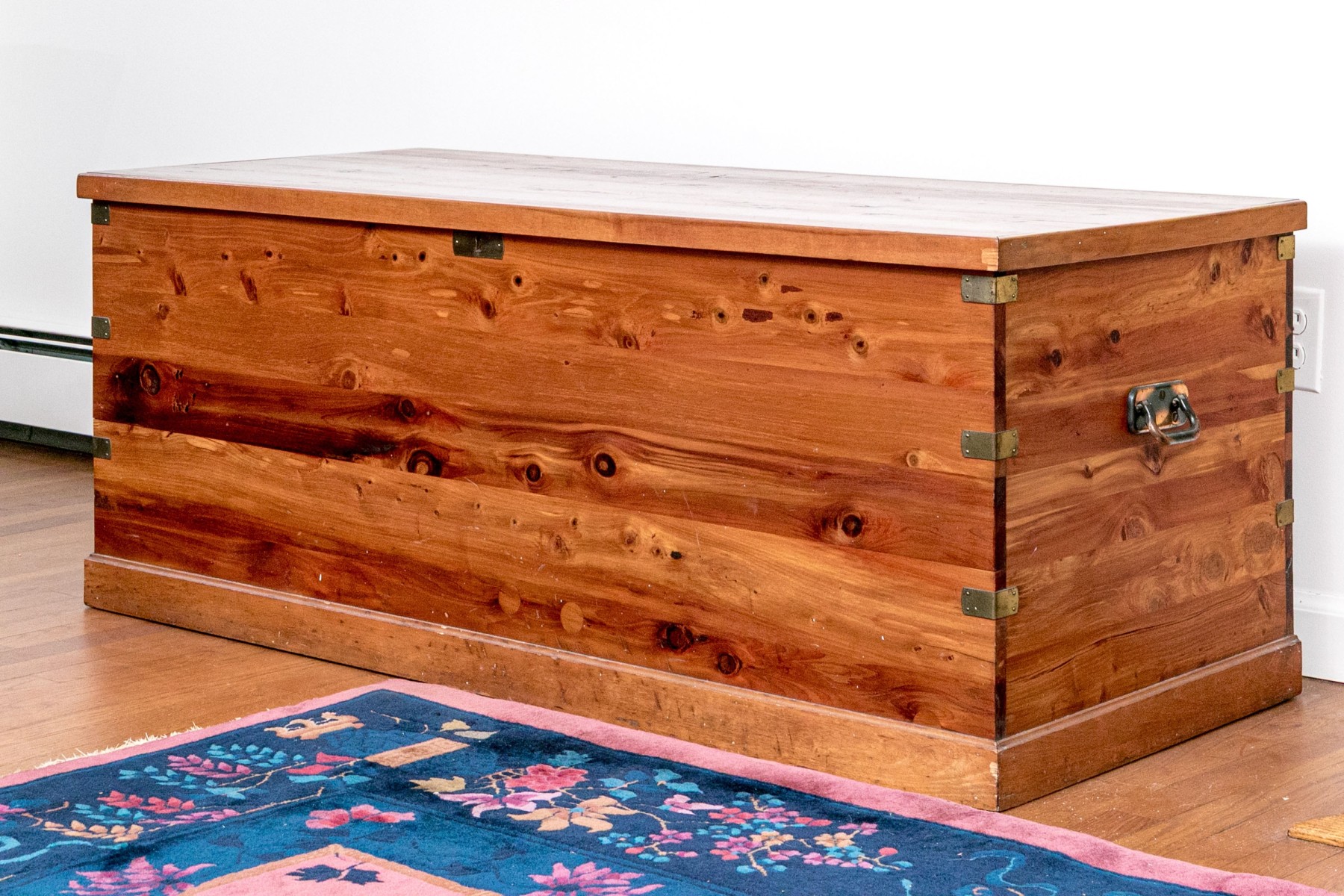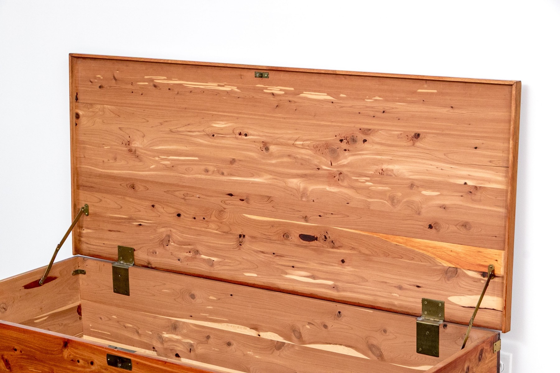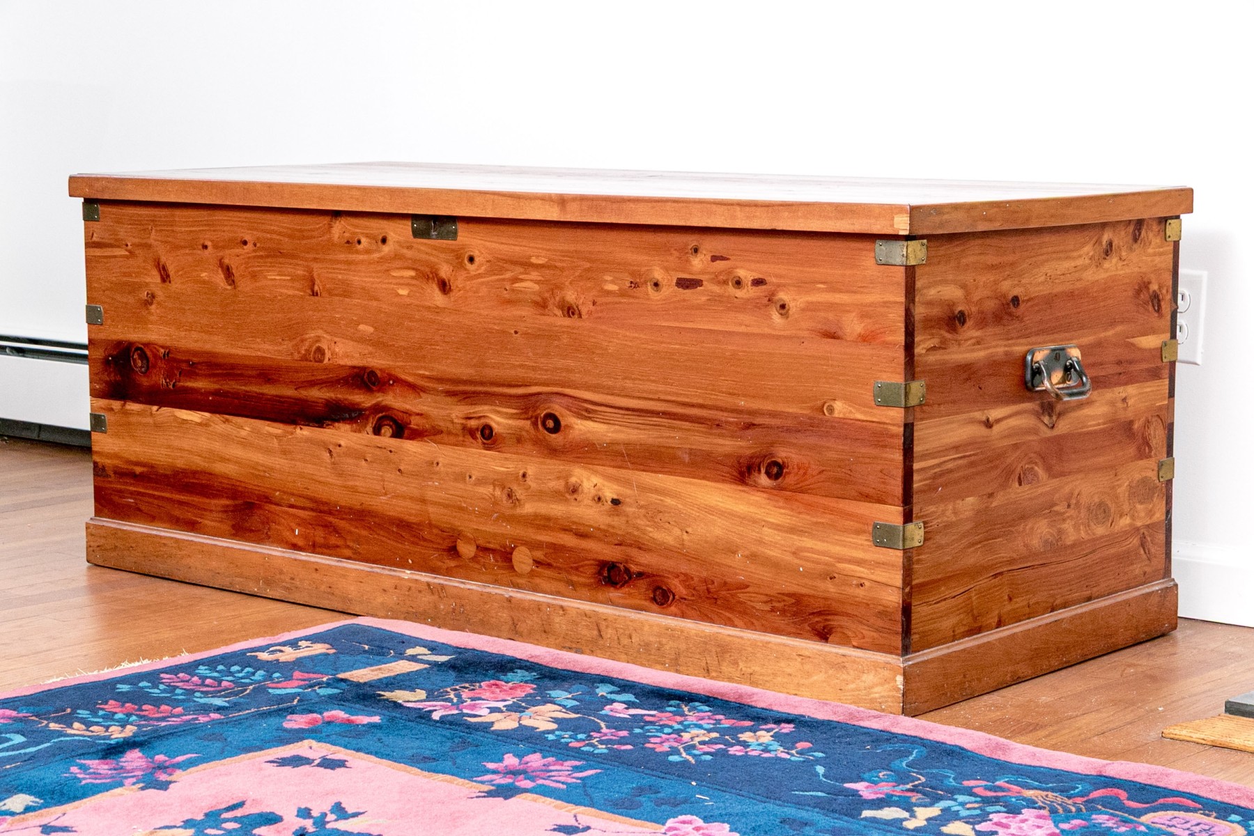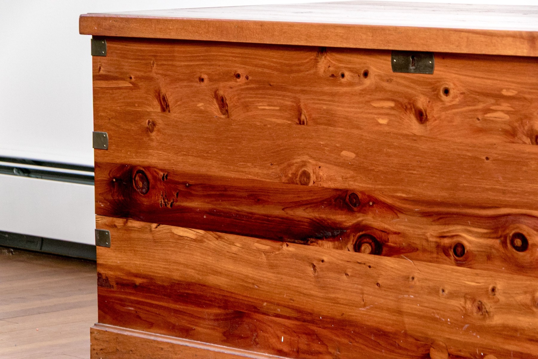 A handsome, oversized cedar blanket chest with a vibrant orange-brown finish and gorgeous wood grain with knots. The classic, simple rectangular form is accented with brass brackets around the corners, handles on the side, and a moulded trim around the foot. The hinged lid opens to ample storage space within.
