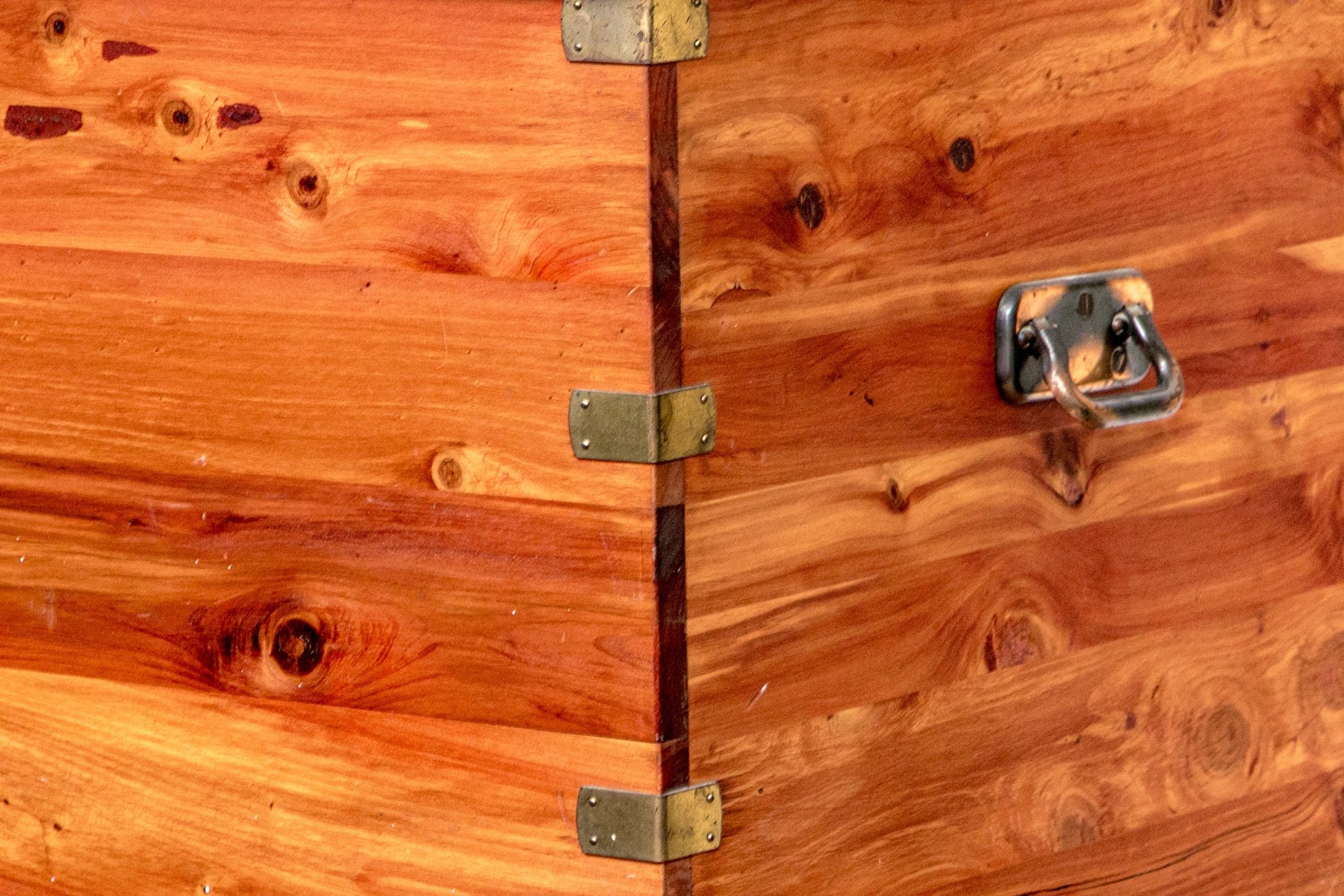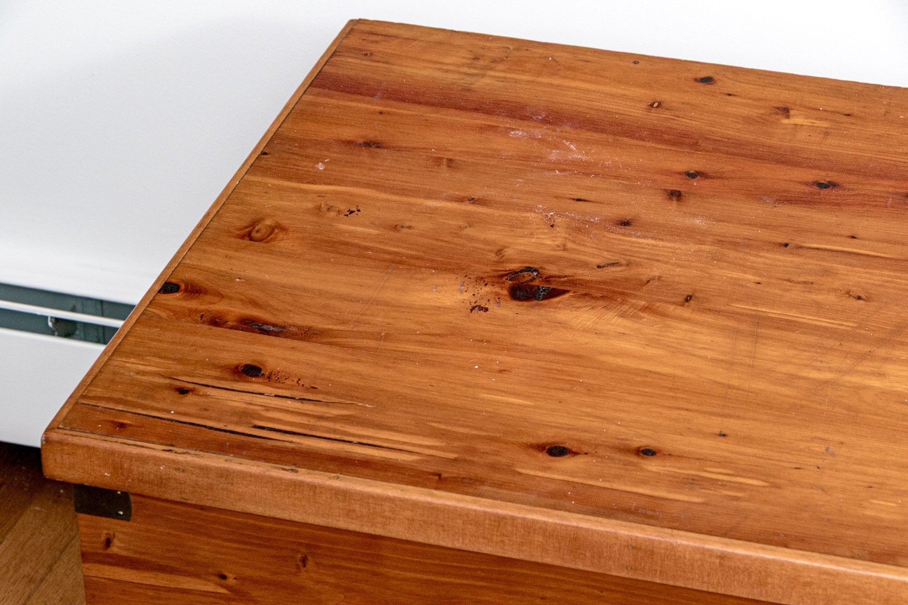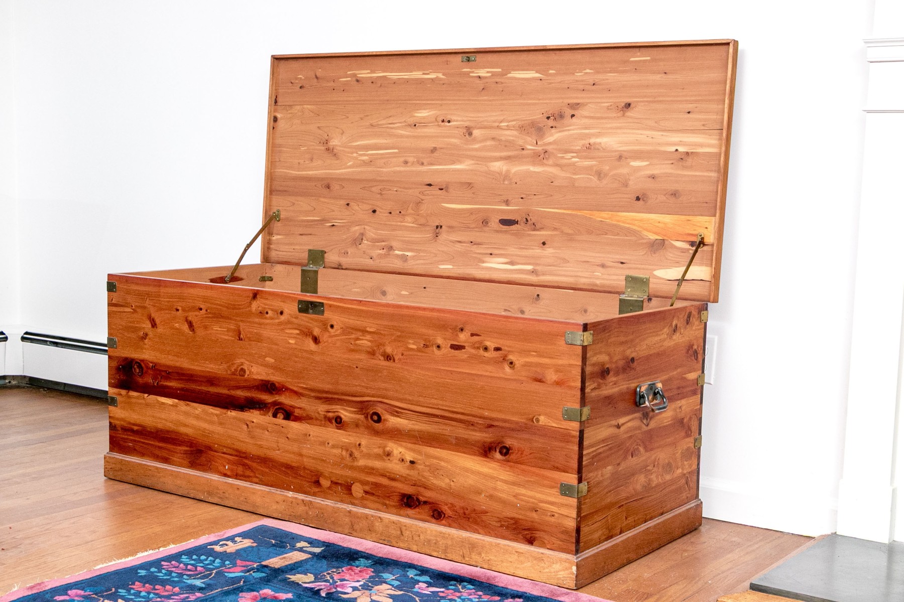 A handsome, oversized cedar blanket chest with a vibrant orange-brown finish and gorgeous wood grain with knots. The classic, simple rectangular form is accented with brass brackets around the corners, handles on the side, and a moulded trim around the foot. The hinged lid opens to ample storage space within.