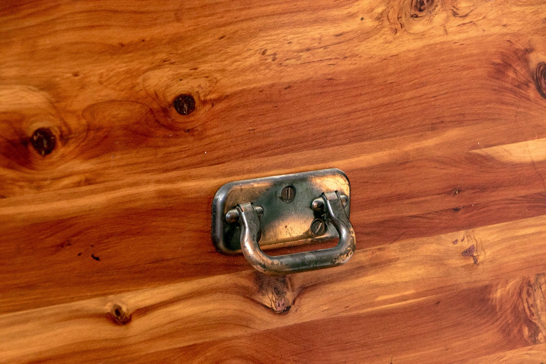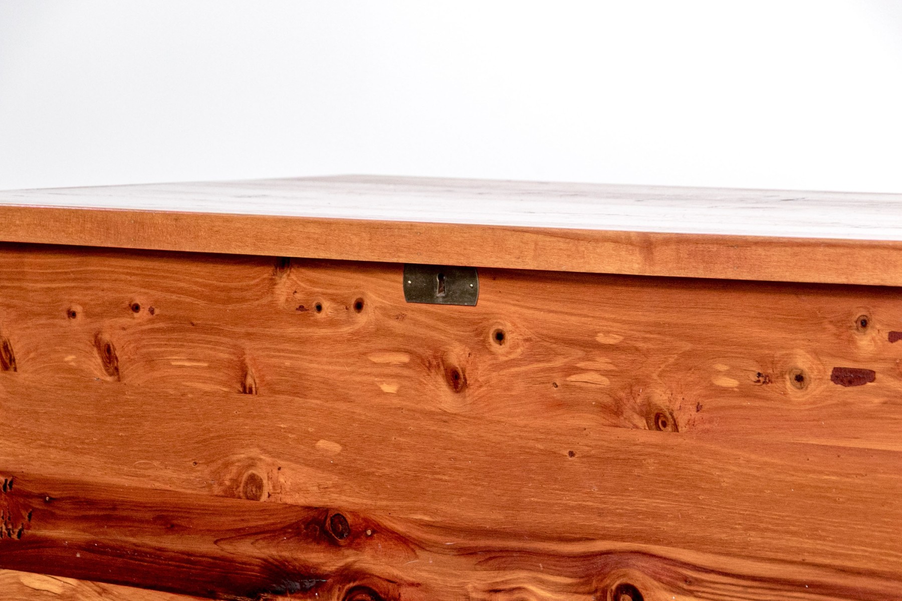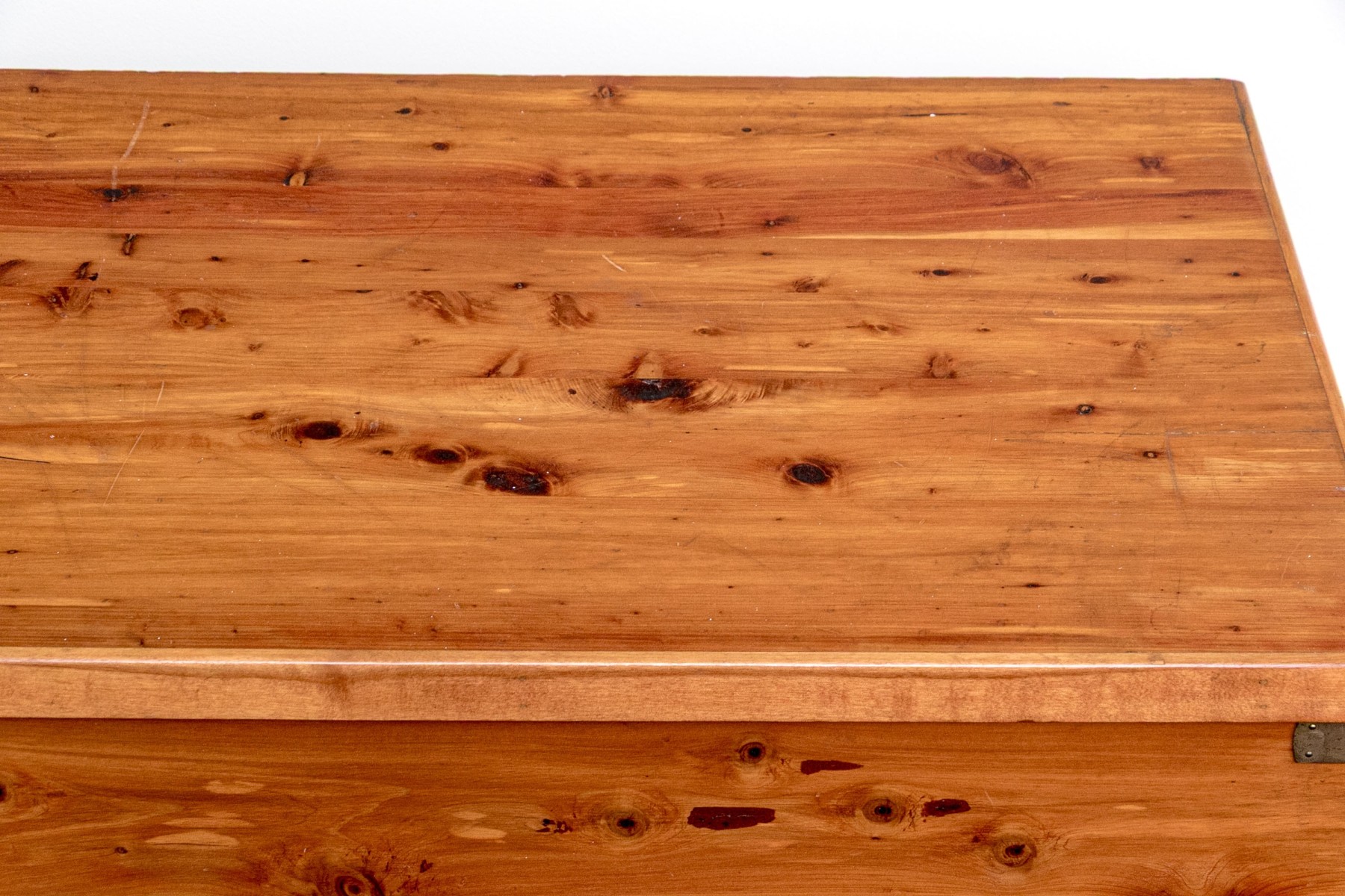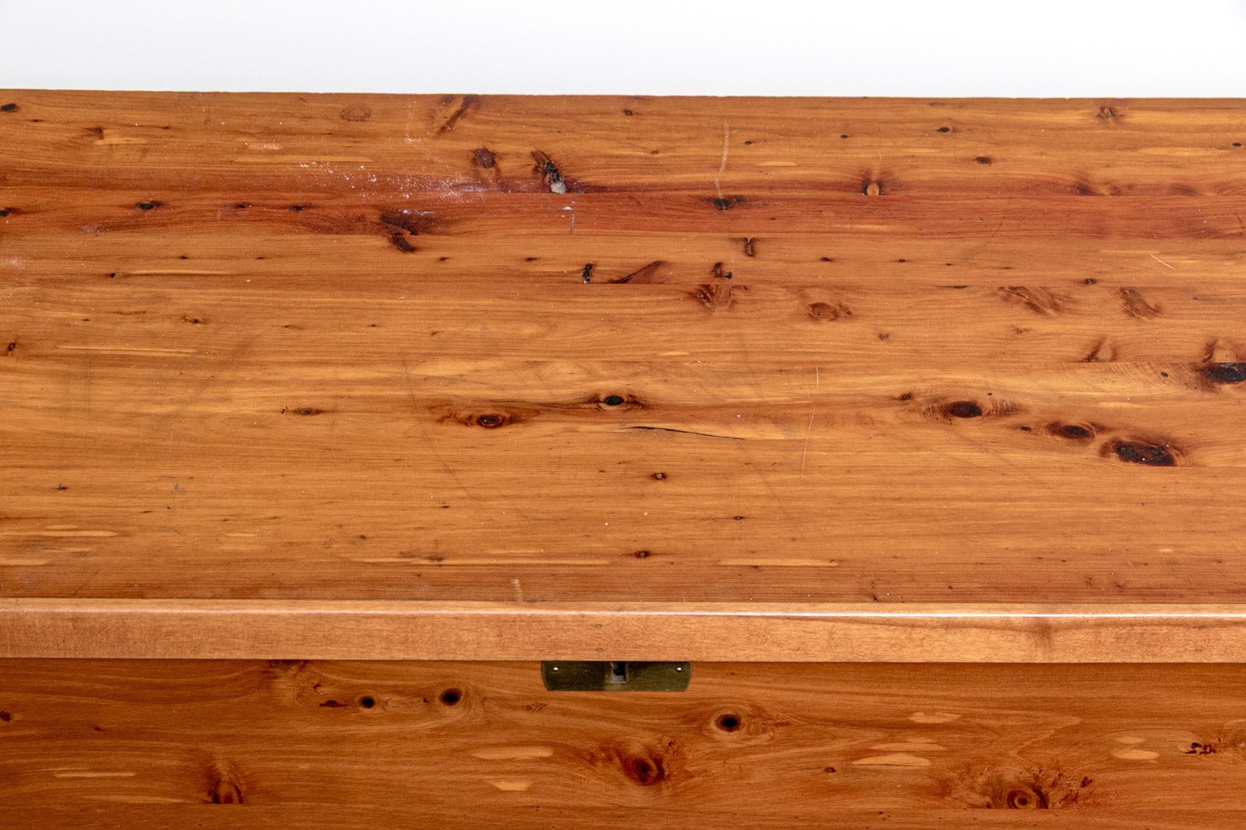 A handsome, oversized cedar blanket chest with a vibrant orange-brown finish and gorgeous wood grain with knots. The classic, simple rectangular form is accented with brass brackets around the corners, handles on the side, and a moulded trim around the foot. The hinged lid opens to ample storage space within.