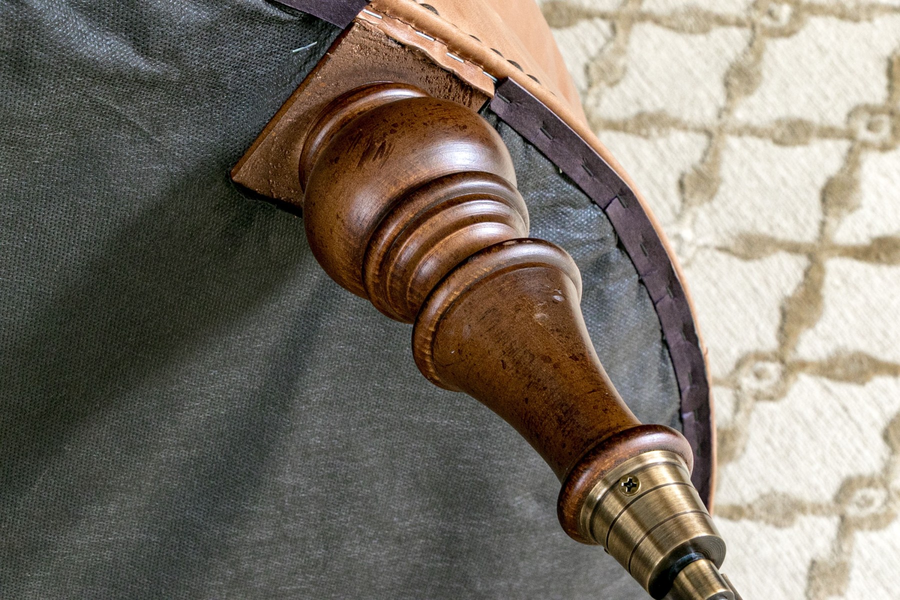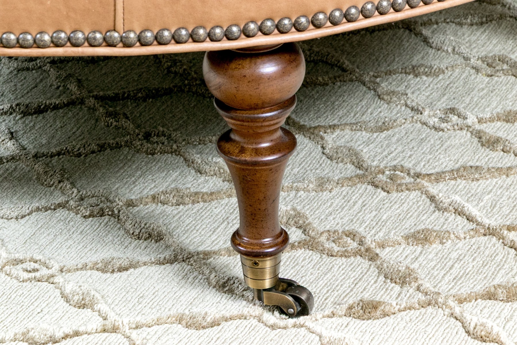 A gorgeous circular ottoman with great classic English elegance, upholstered in caramel brown leather with button tufting, piped trims, and nailhead borders. raised on five nicely turned warm brown wood legs on brass casters.