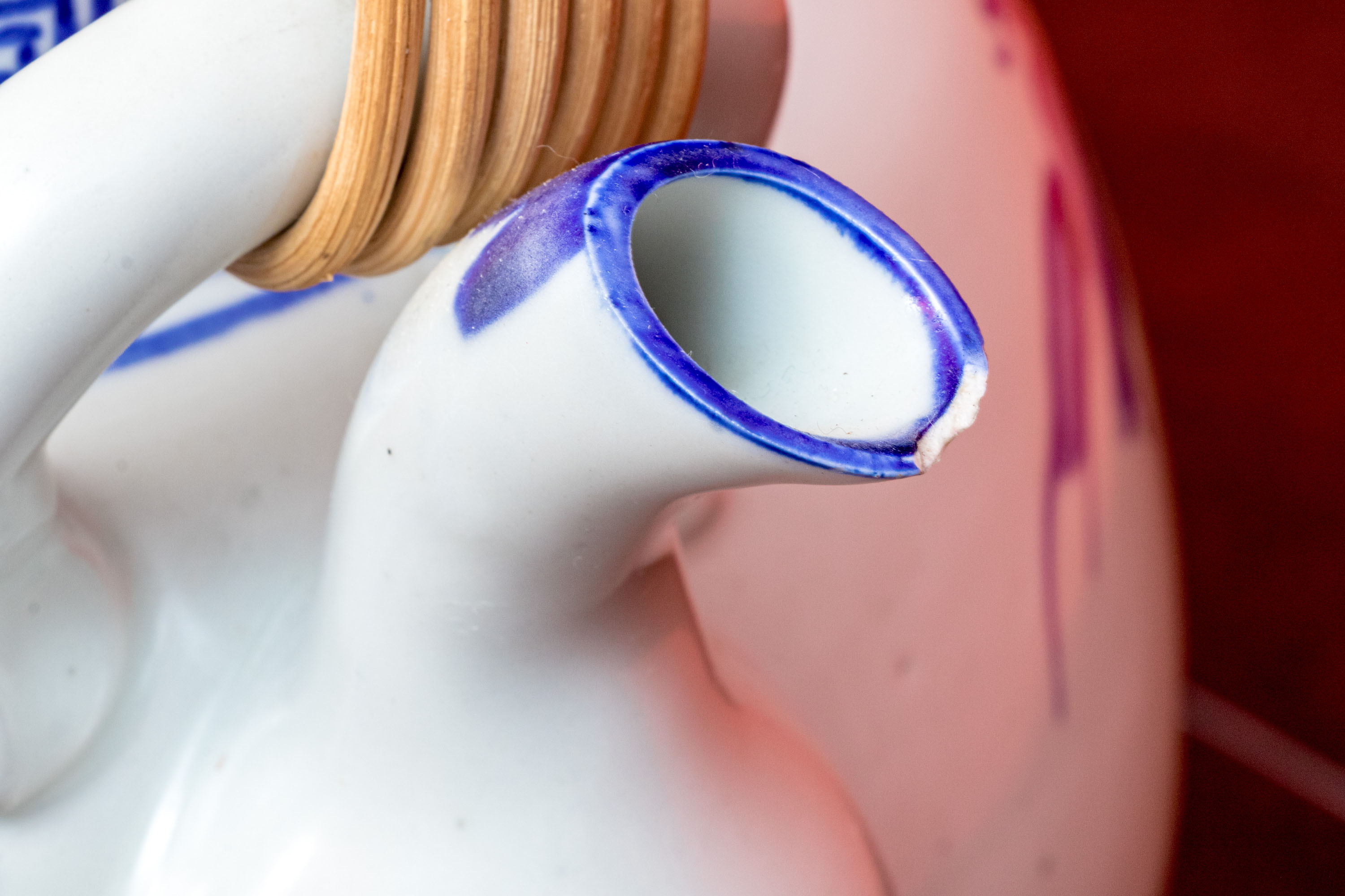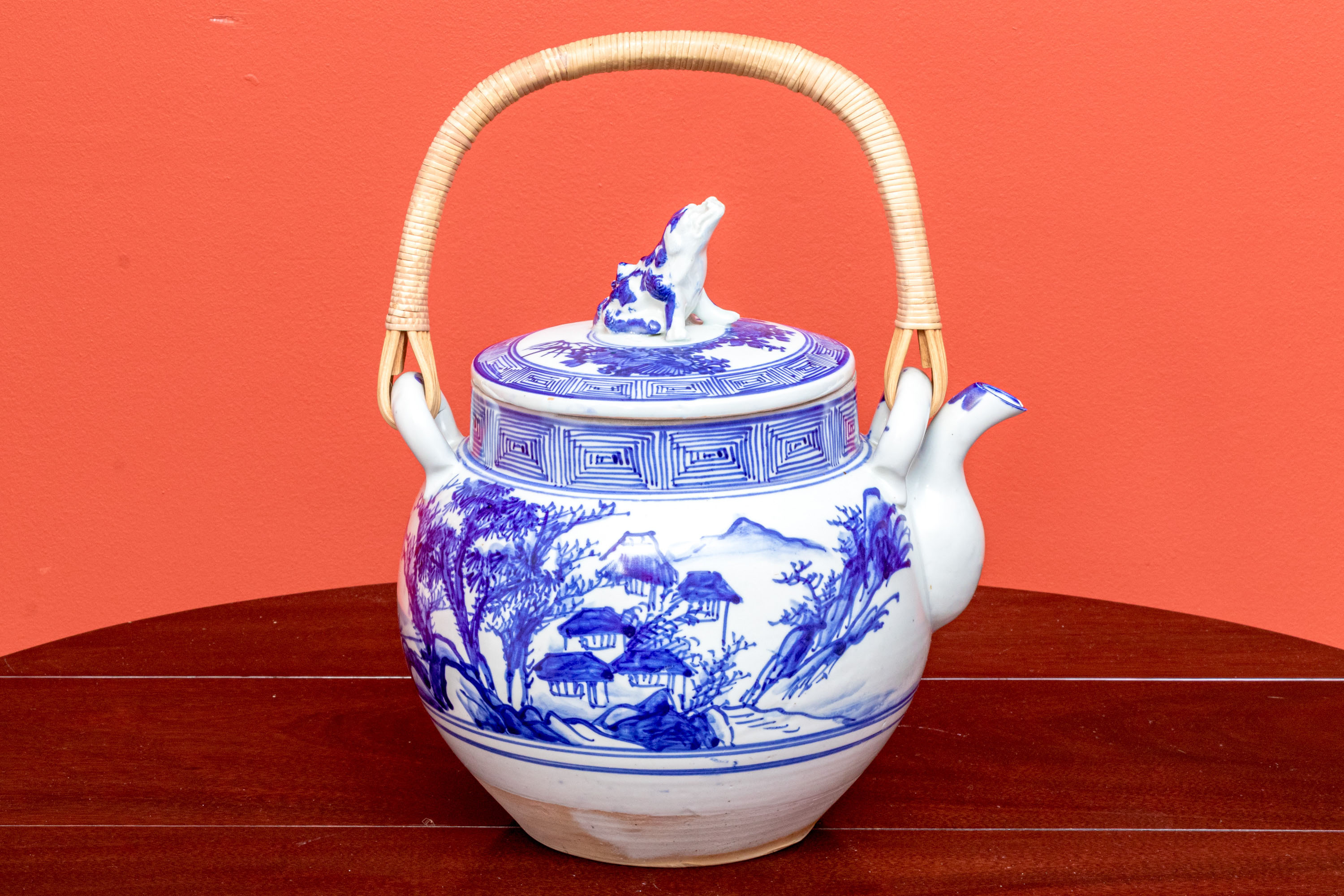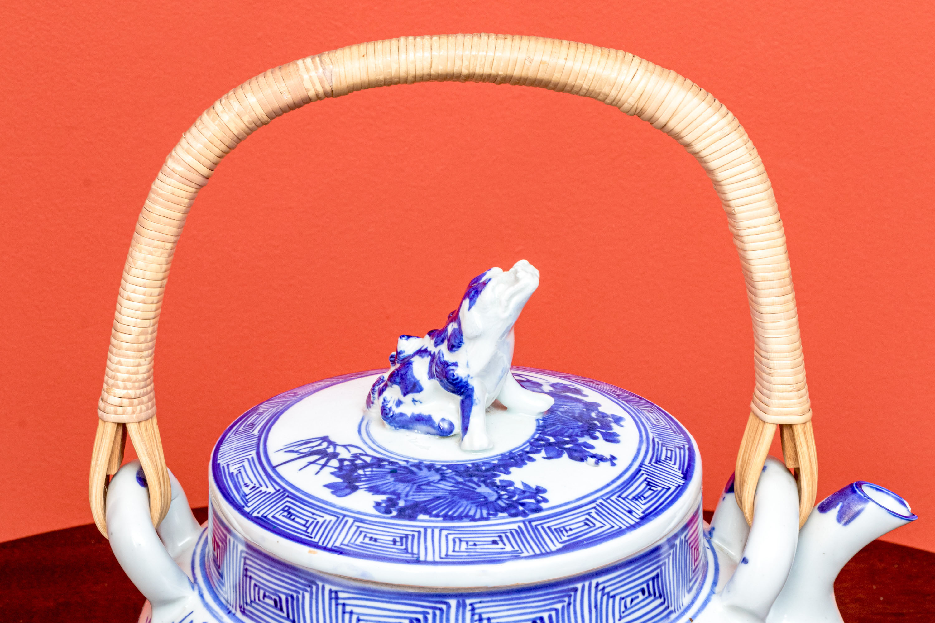 Exaggerated Chinese blue and white porcelain tea pot with applied woven rattan handle, as watering can.