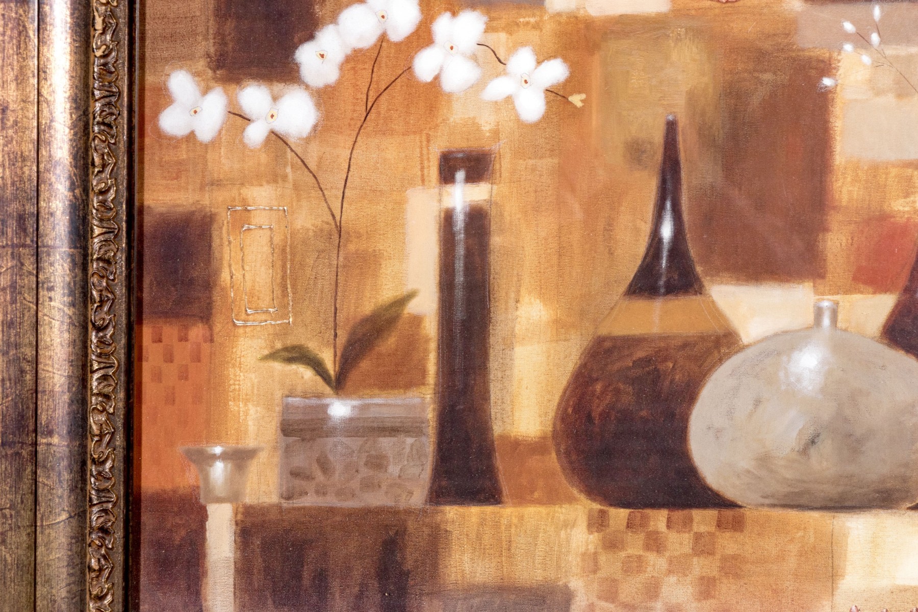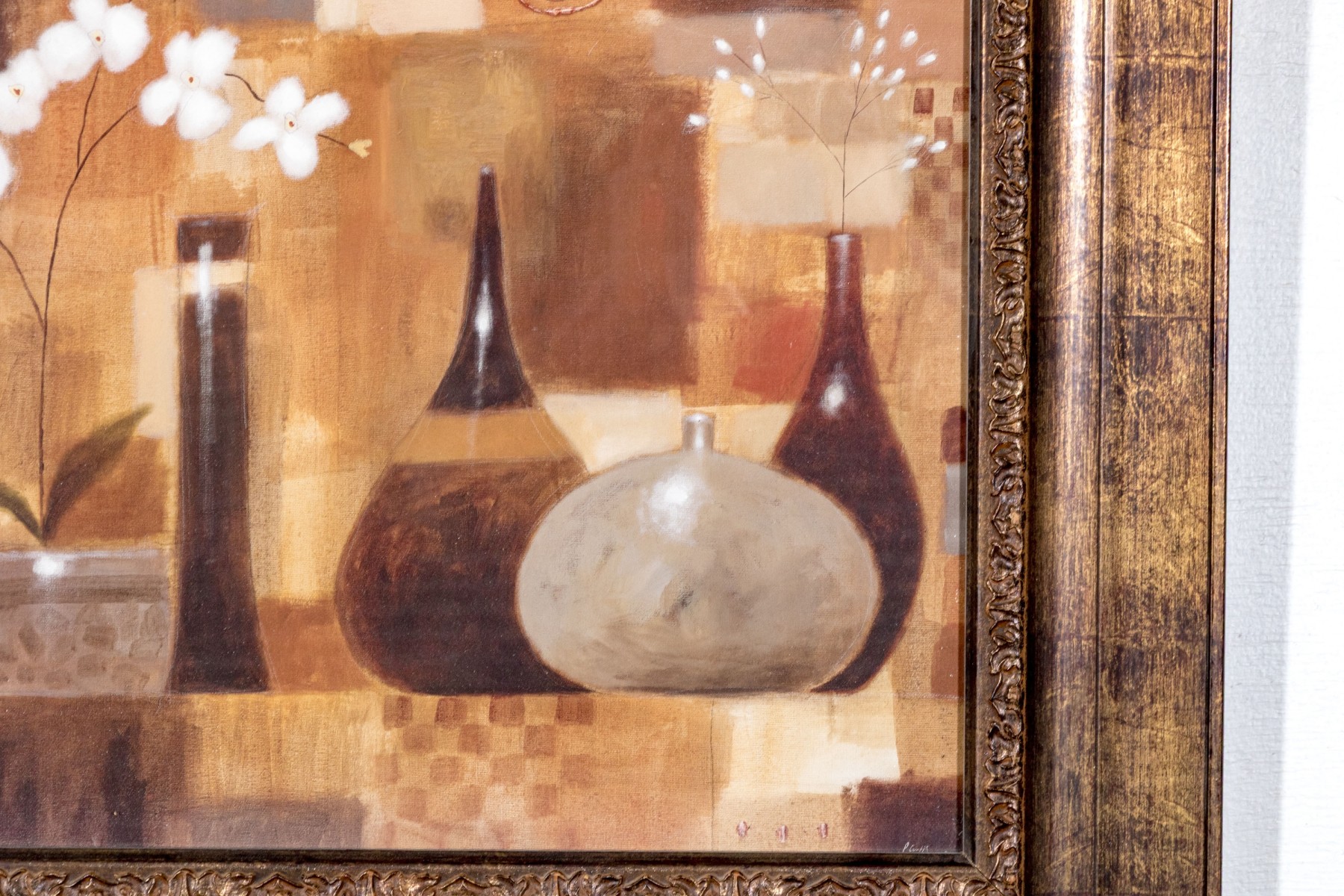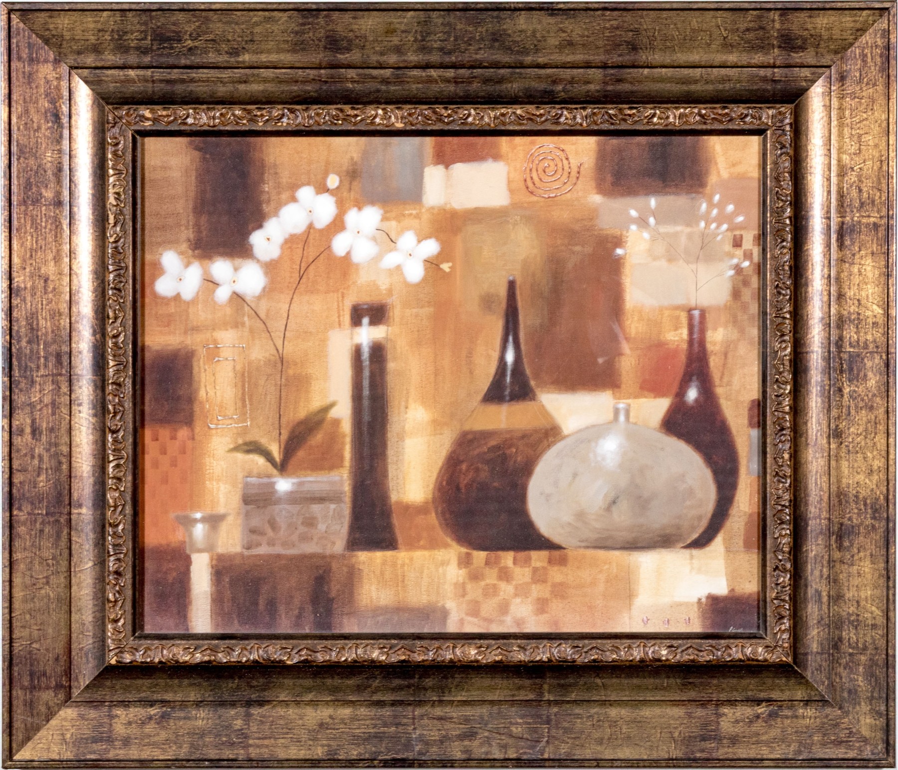Signed in plate lower right. Depicting a still life with Asian glazed ceramic vases with a planter having an orchid in bloom against color field flat background. All in warm hues.