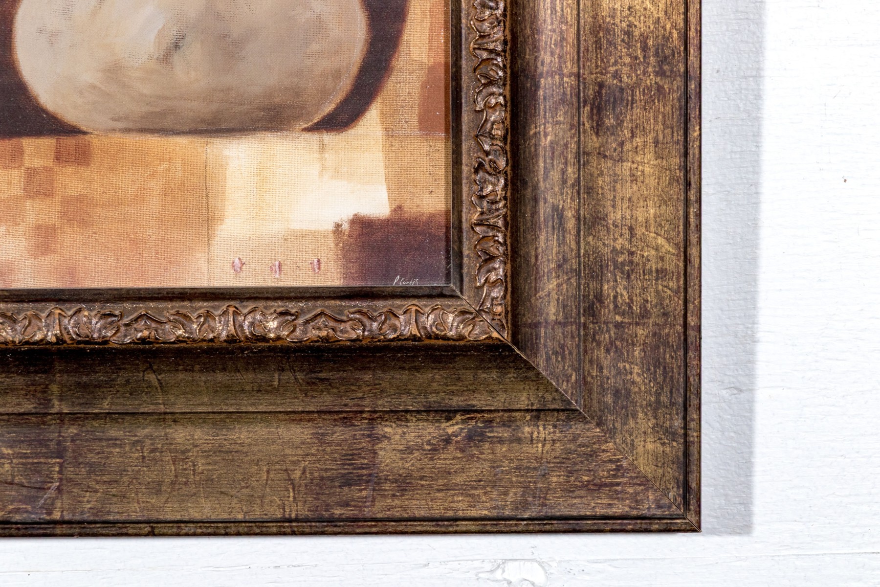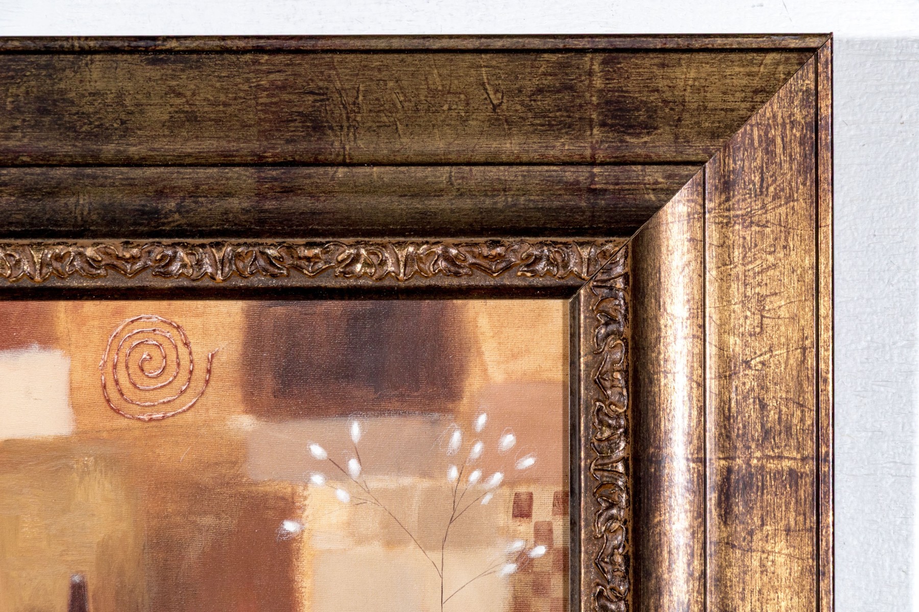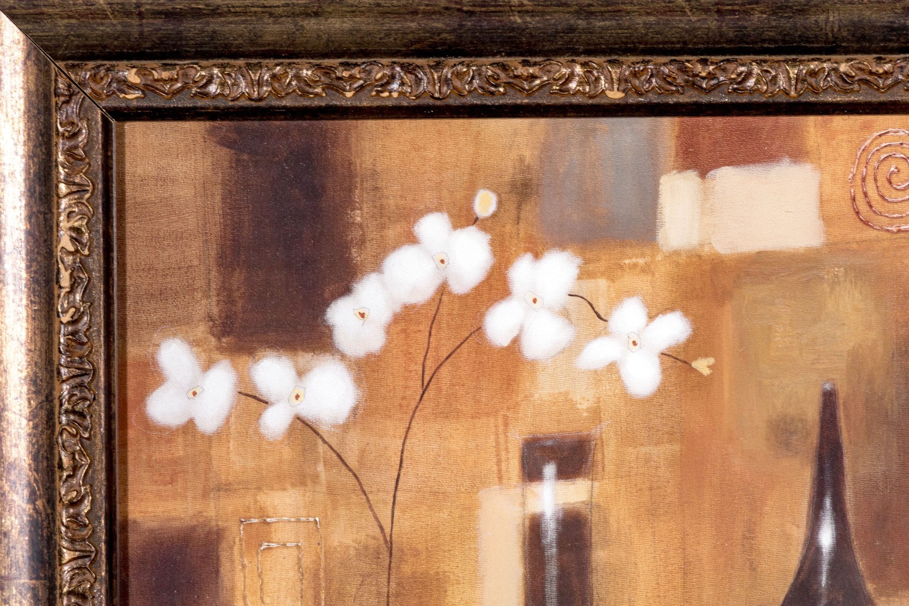Signed in plate lower right. Depicting a still life with Asian glazed ceramic vases with a planter having an orchid in bloom against color field flat background. All in warm hues.