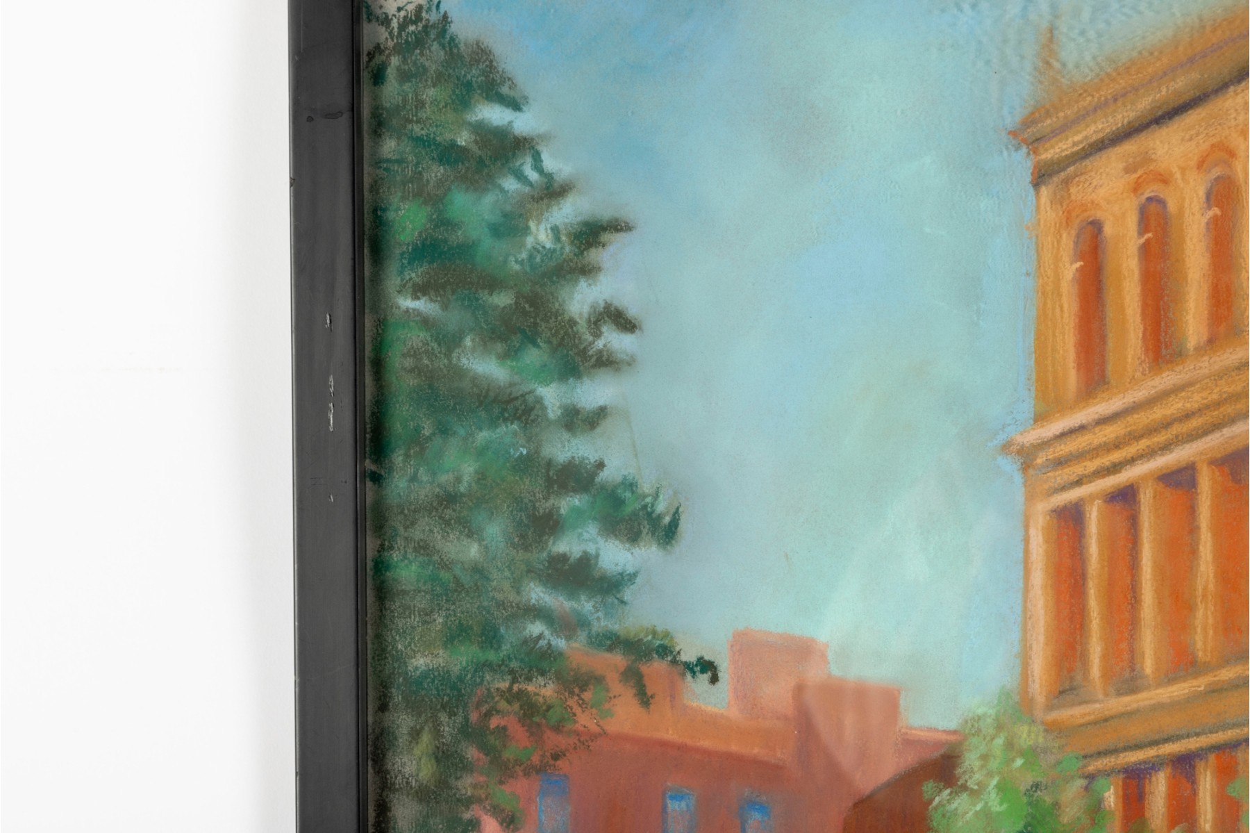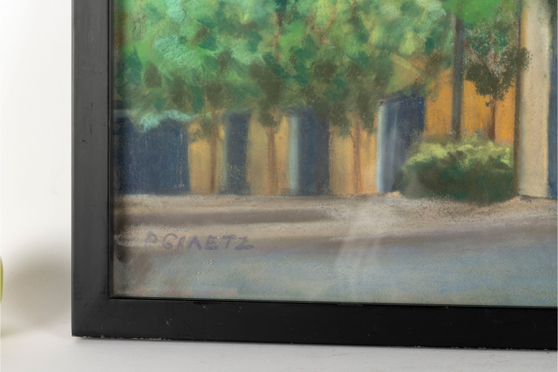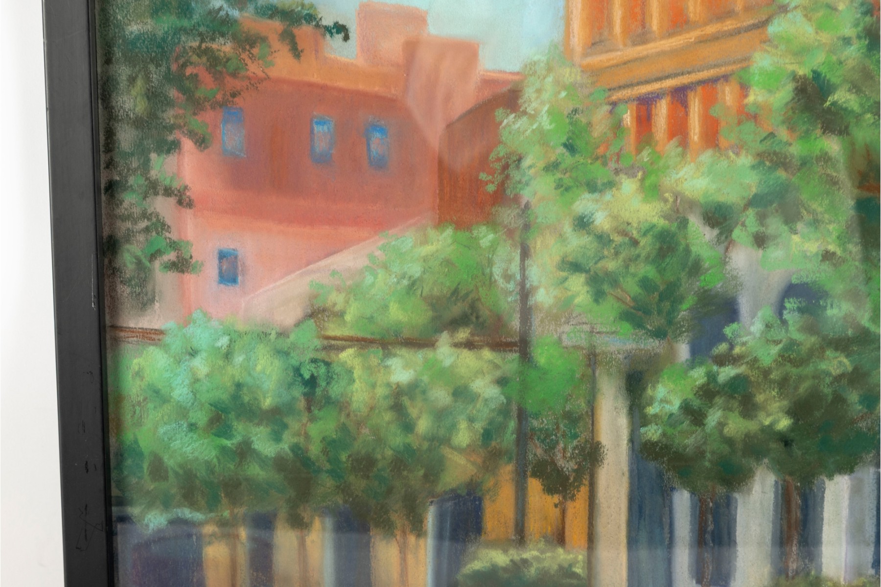 A lovely pastel on paper urban landscape illustration by P. Graetz, capturing a soft, atmospheric city scene — signed at the bottom left, and presented within a modern black wood frame, behind glass.