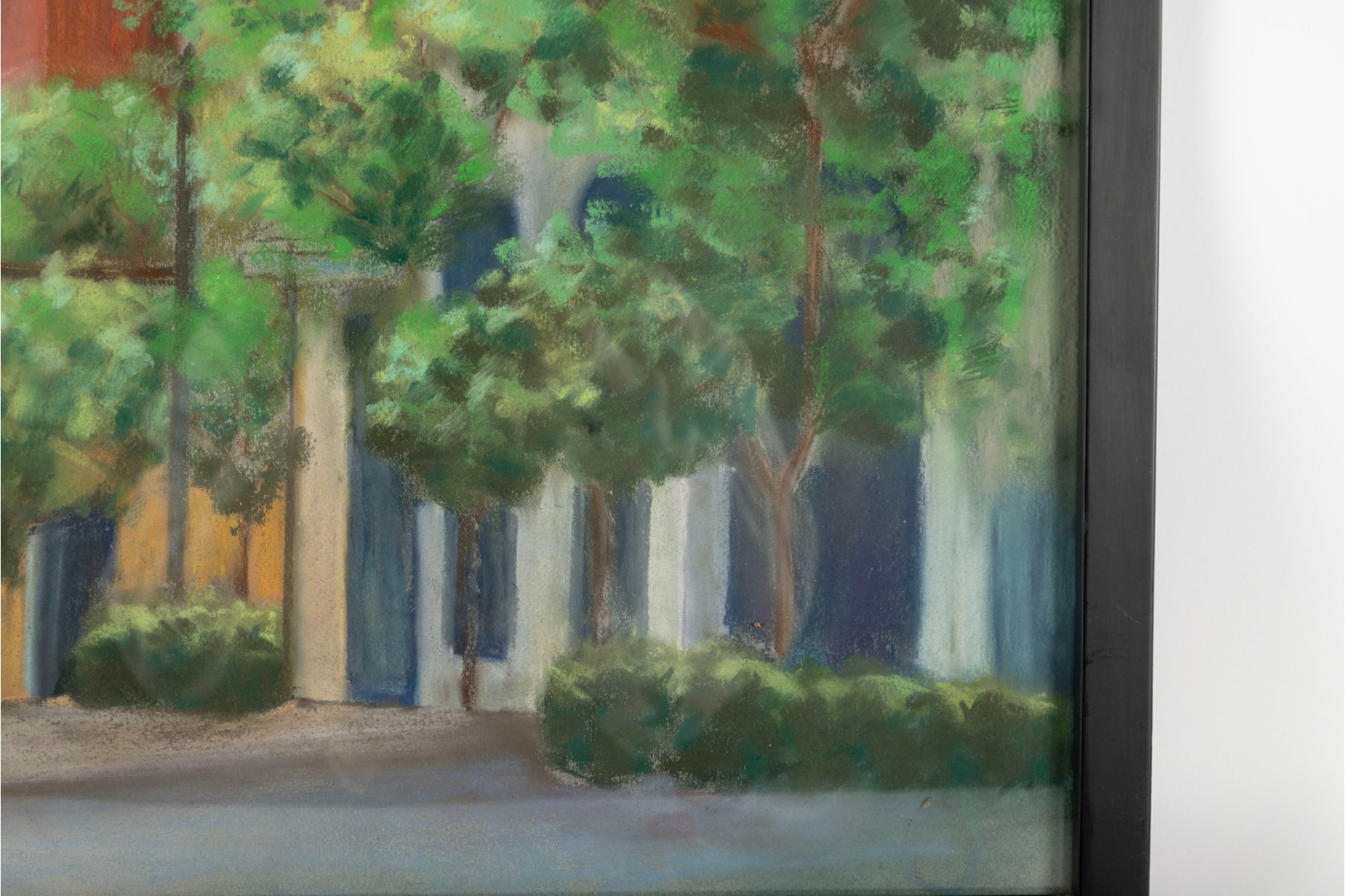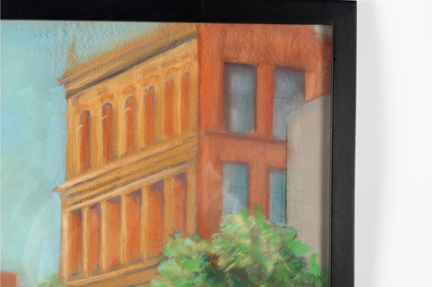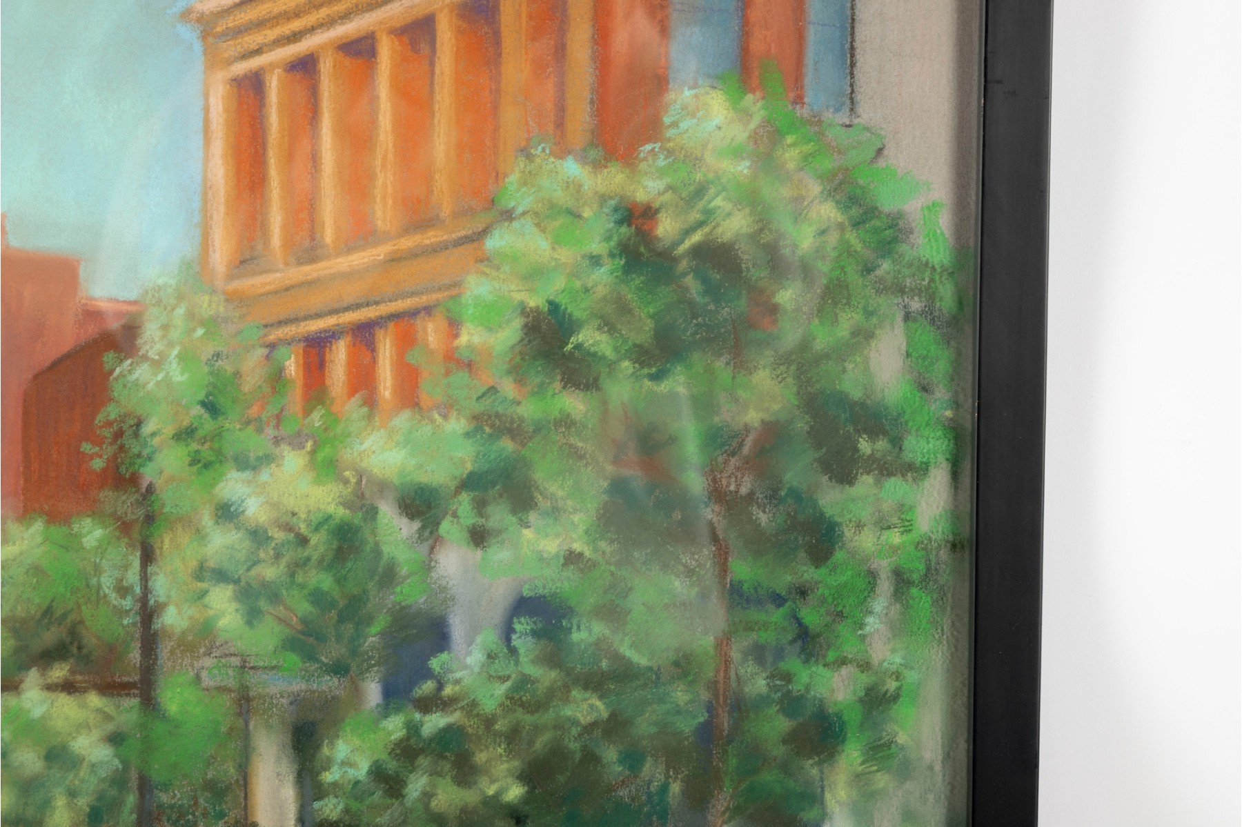 A lovely pastel on paper urban landscape illustration by P. Graetz, capturing a soft, atmospheric city scene — signed at the bottom left, and presented within a modern black wood frame, behind glass.