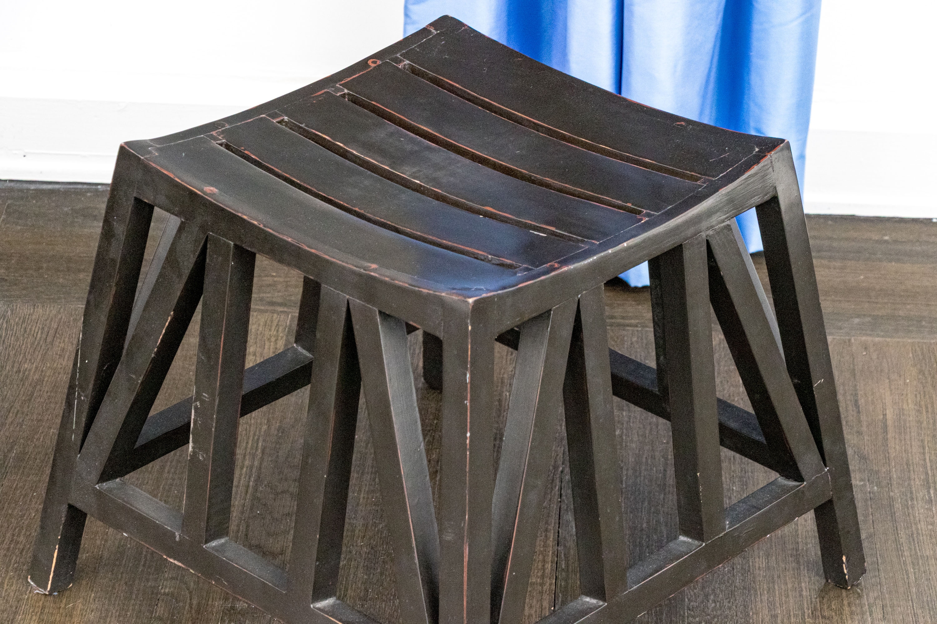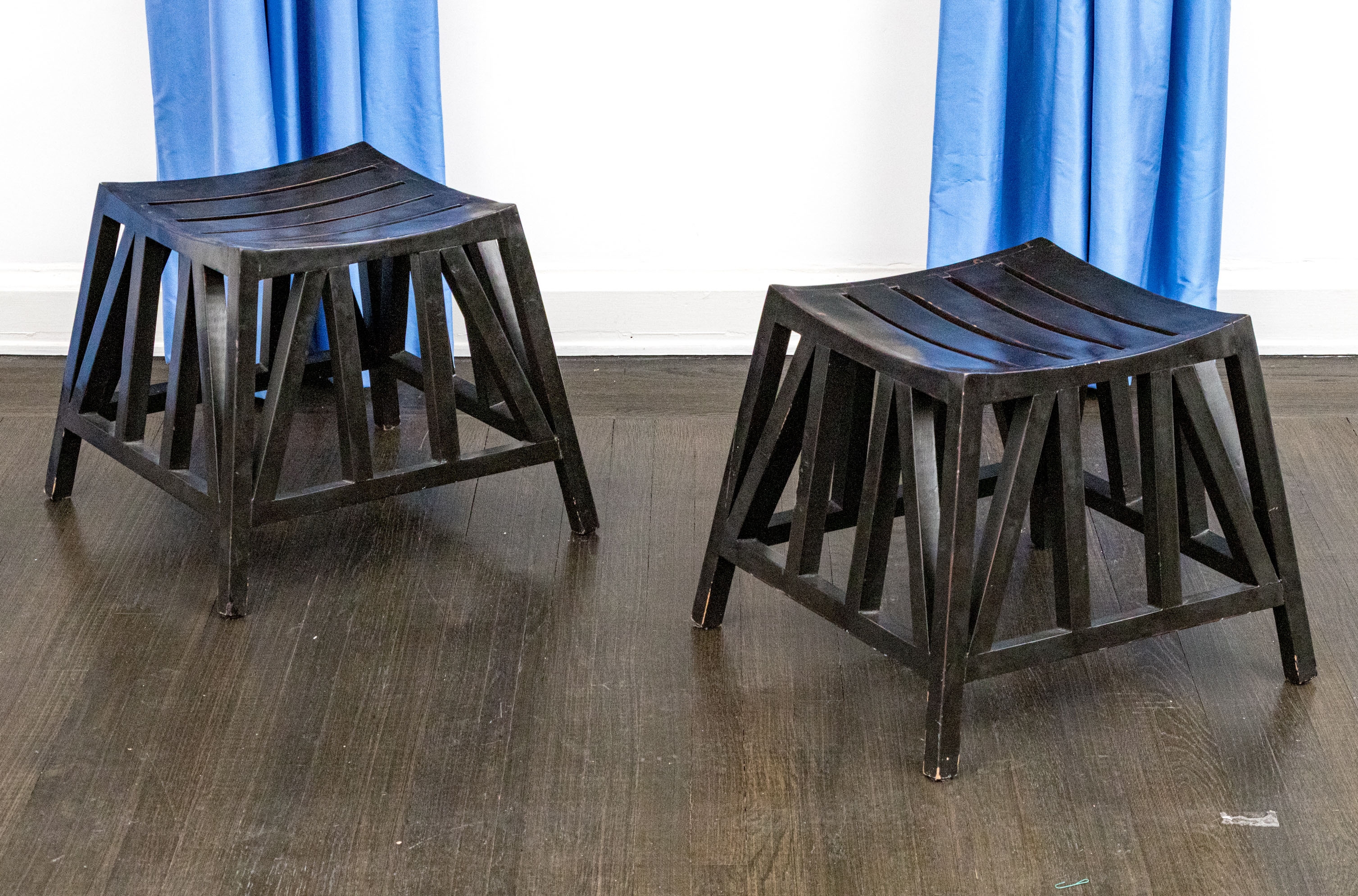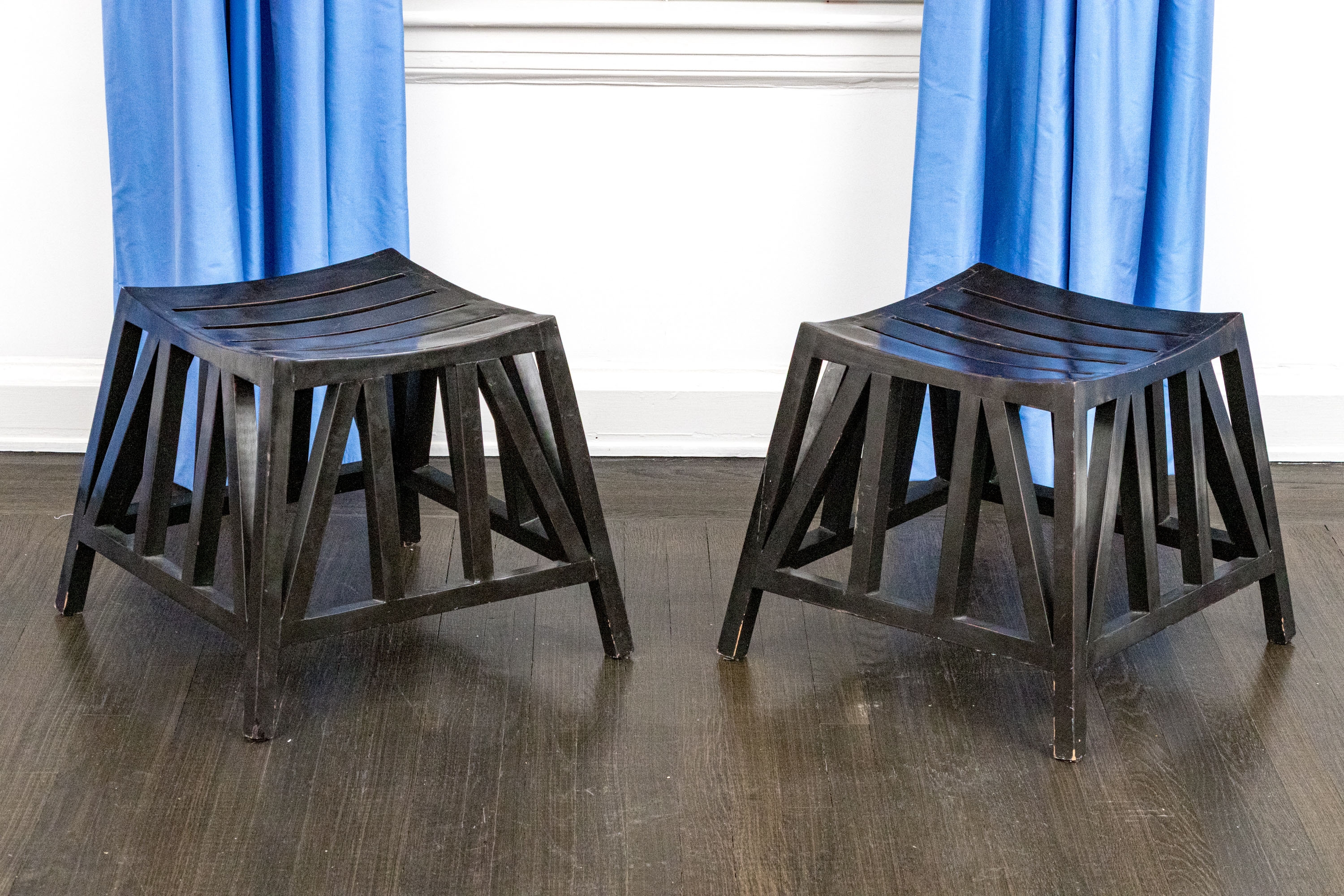The stylistic form with four plated legs and an array of vertical and horizontal stretcher supports, supporting the arched saddle seats all in a dark finish. The stools are purportedly modeled after stools that had been found in King Tut's tomb.