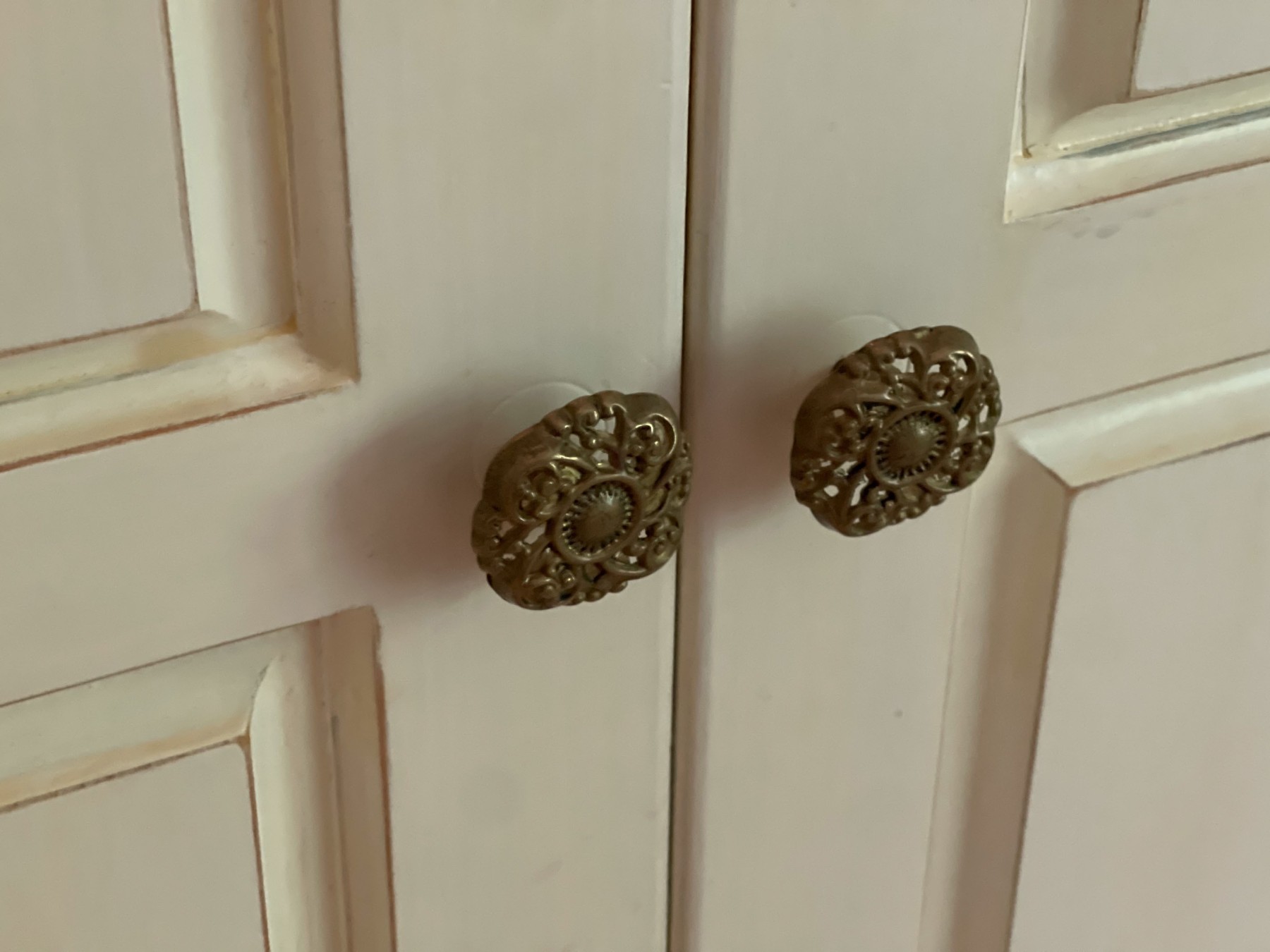 A stain spot to one front door which can be seen in the lot photos. Either could be cleaned or refinished if desired. Good overall, drawers stick slightly. Please review the photos as they are part of the condition report.