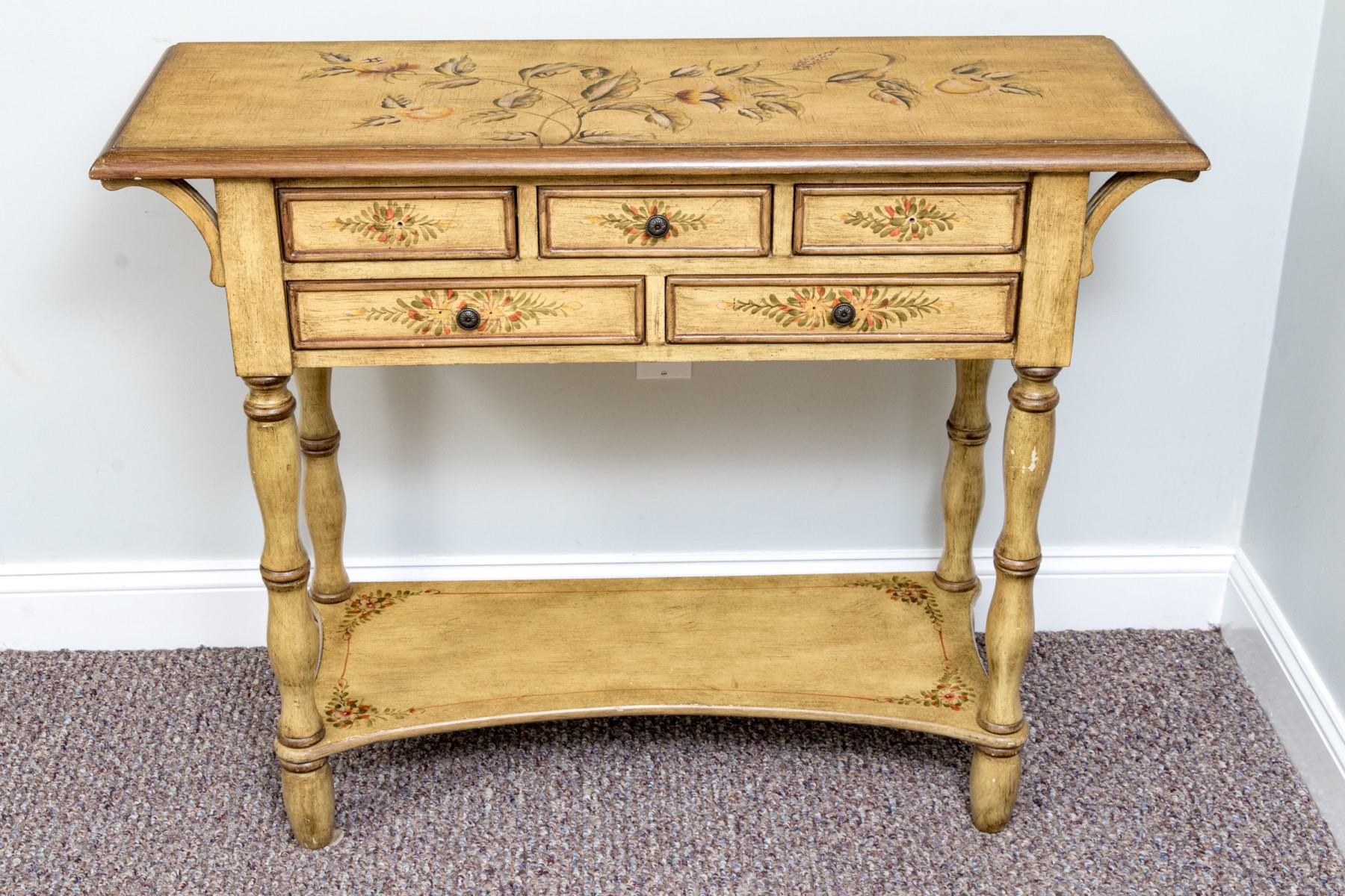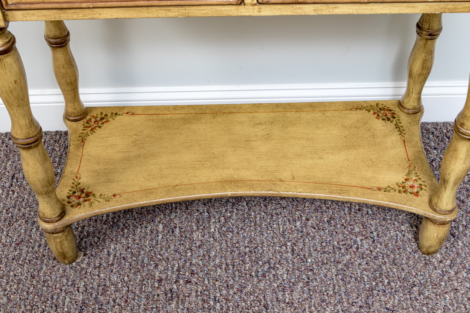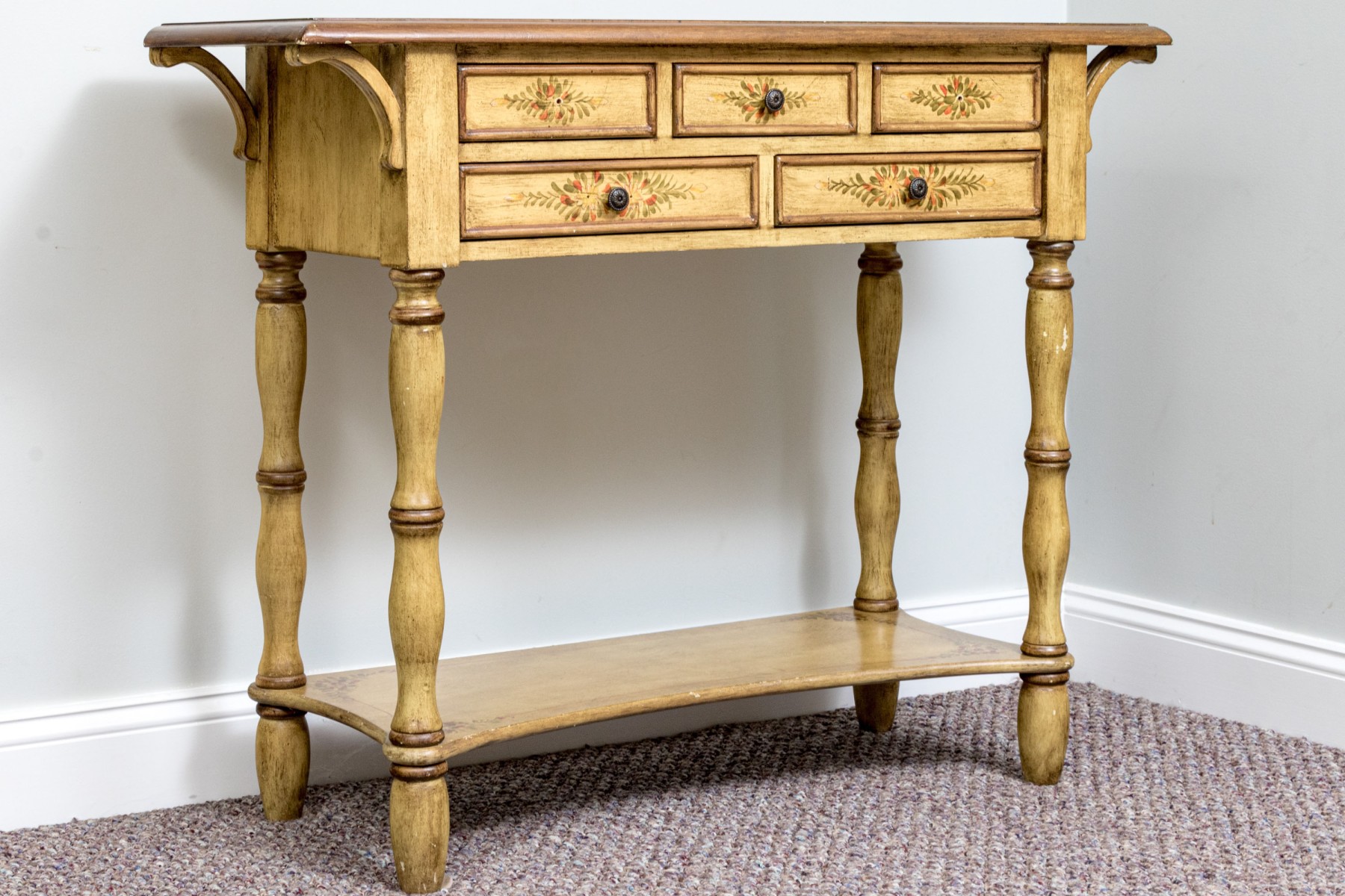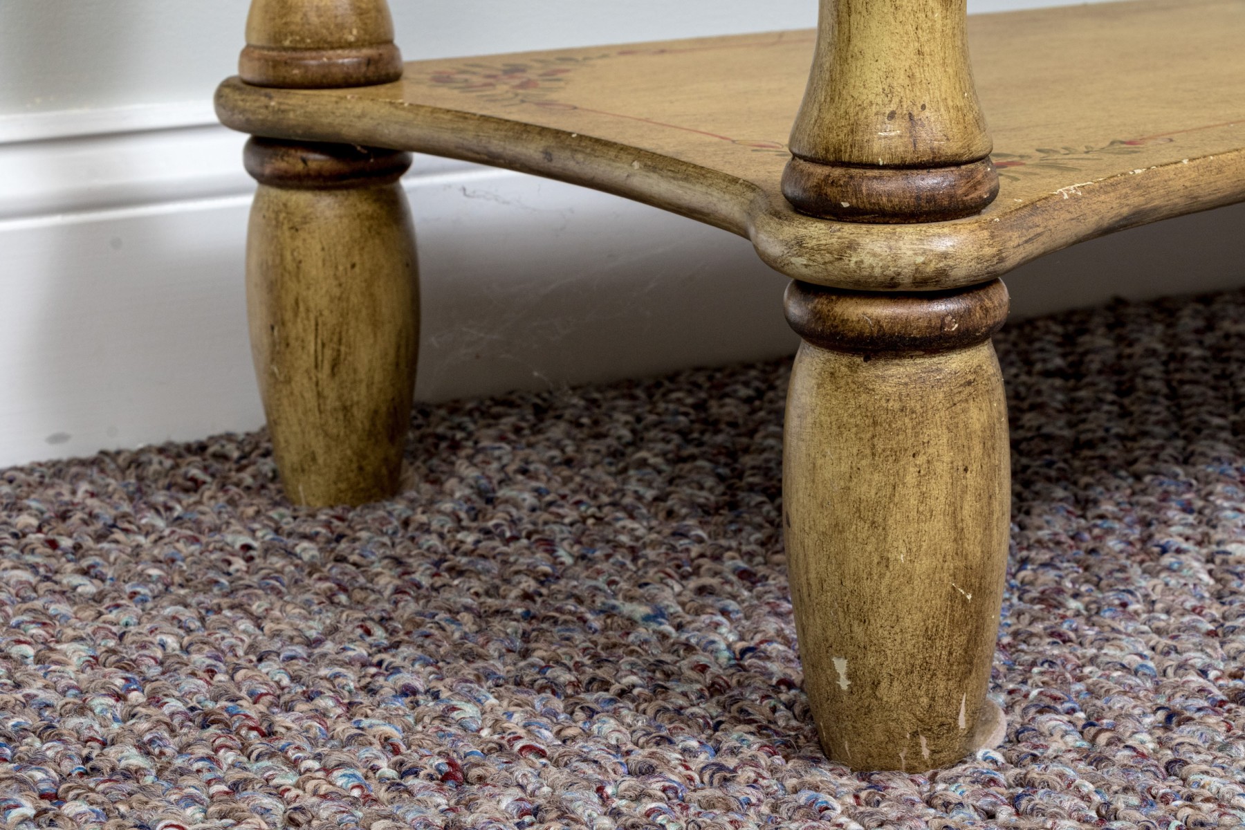 Raised on four turned and finished legs with contoured lower shelf with floral motifs painted to lower tiered shelf and upper table top.
