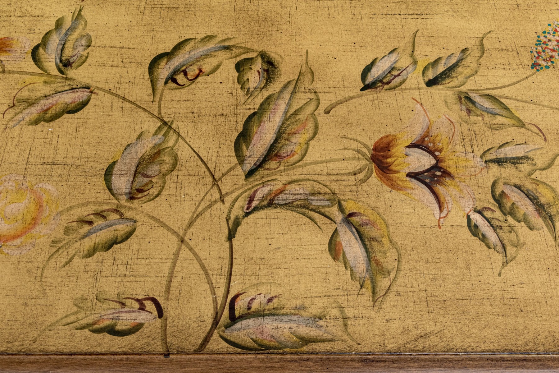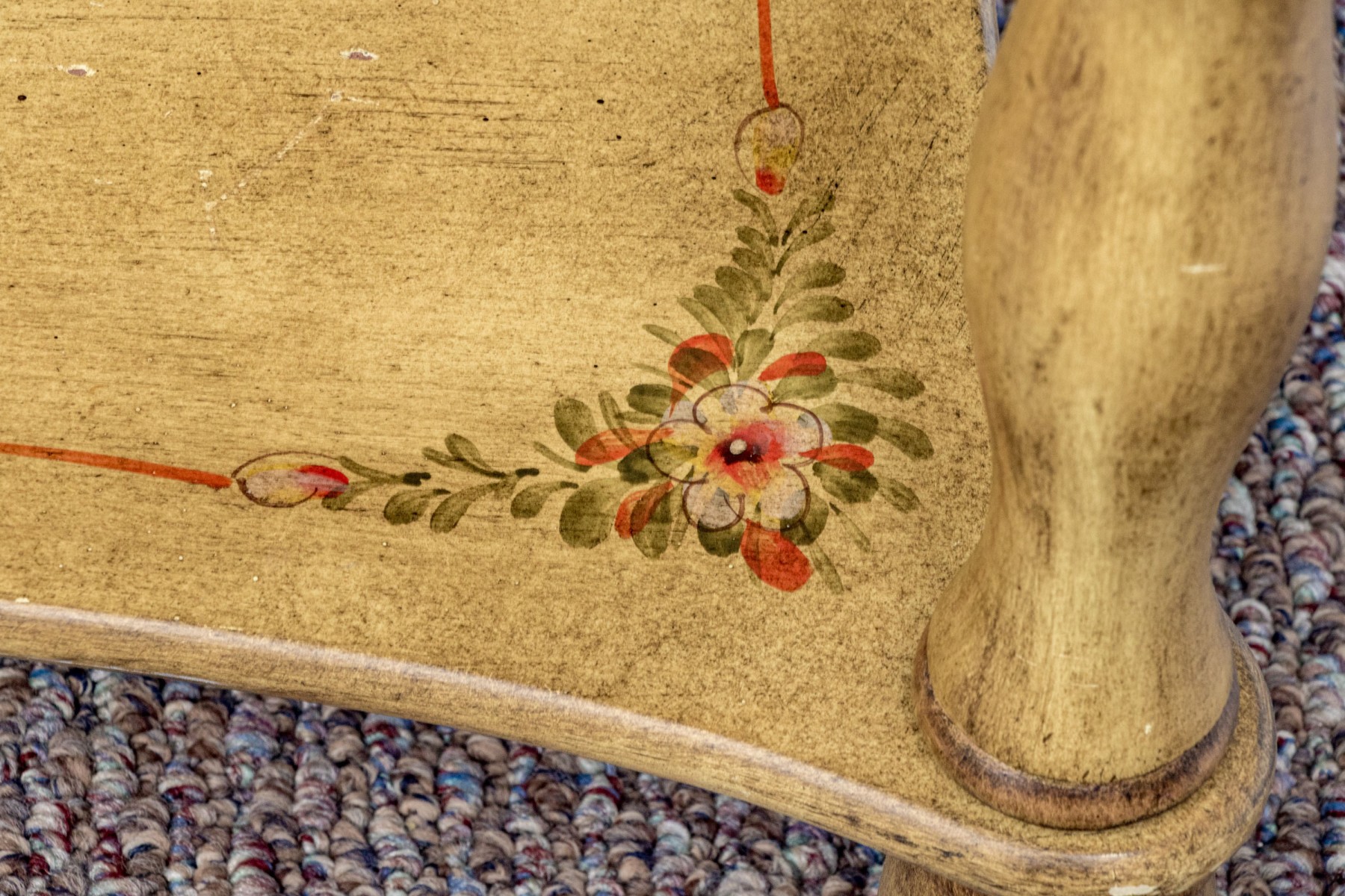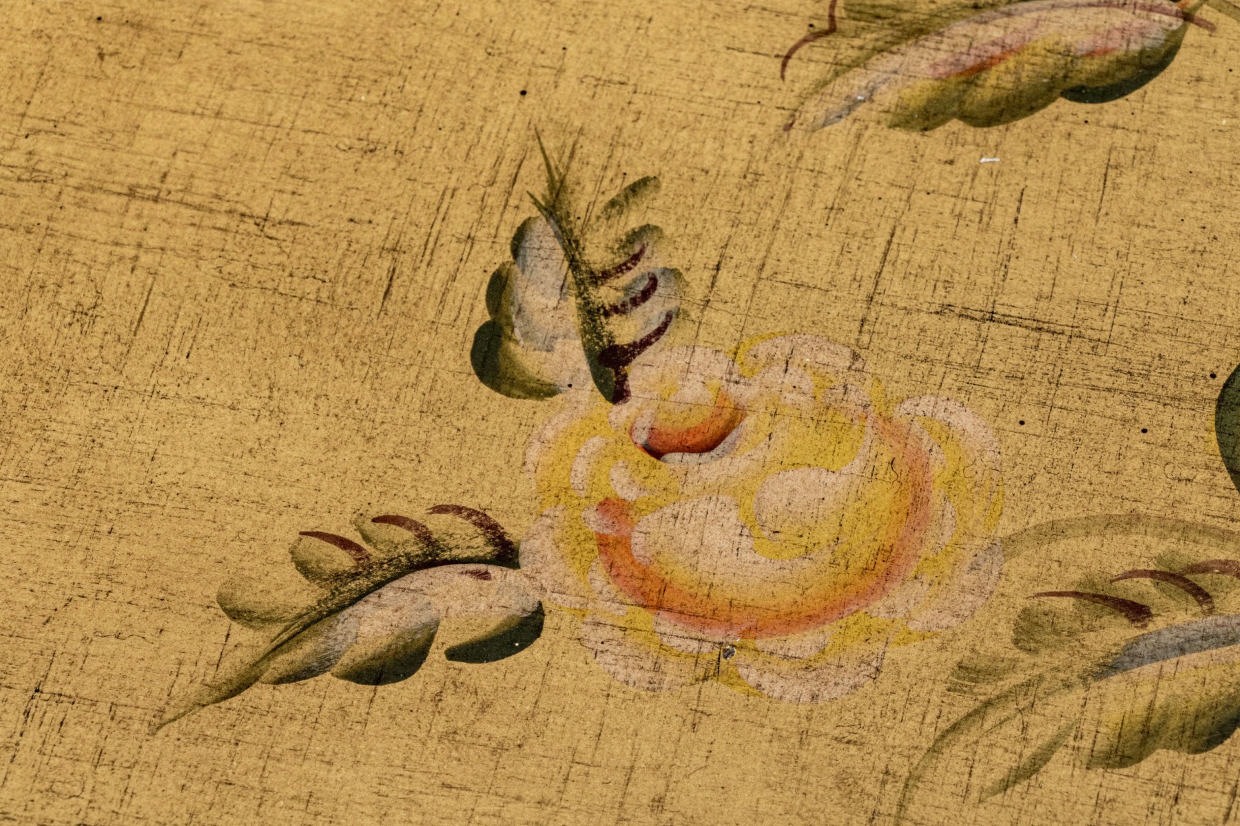 Raised on four turned and finished legs with contoured lower shelf with floral motifs painted to lower tiered shelf and upper table top.