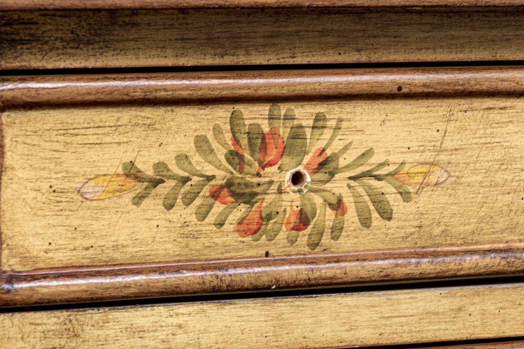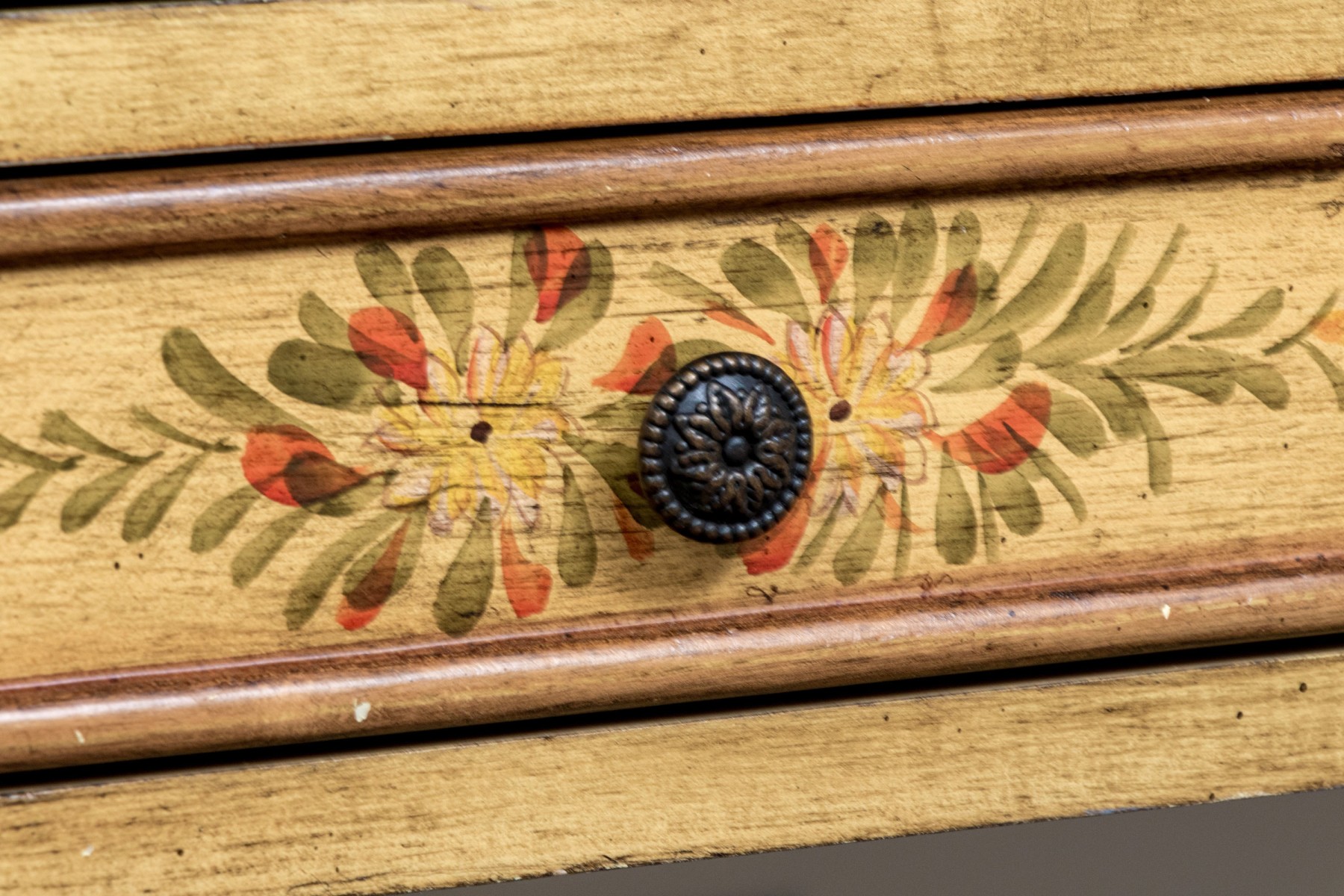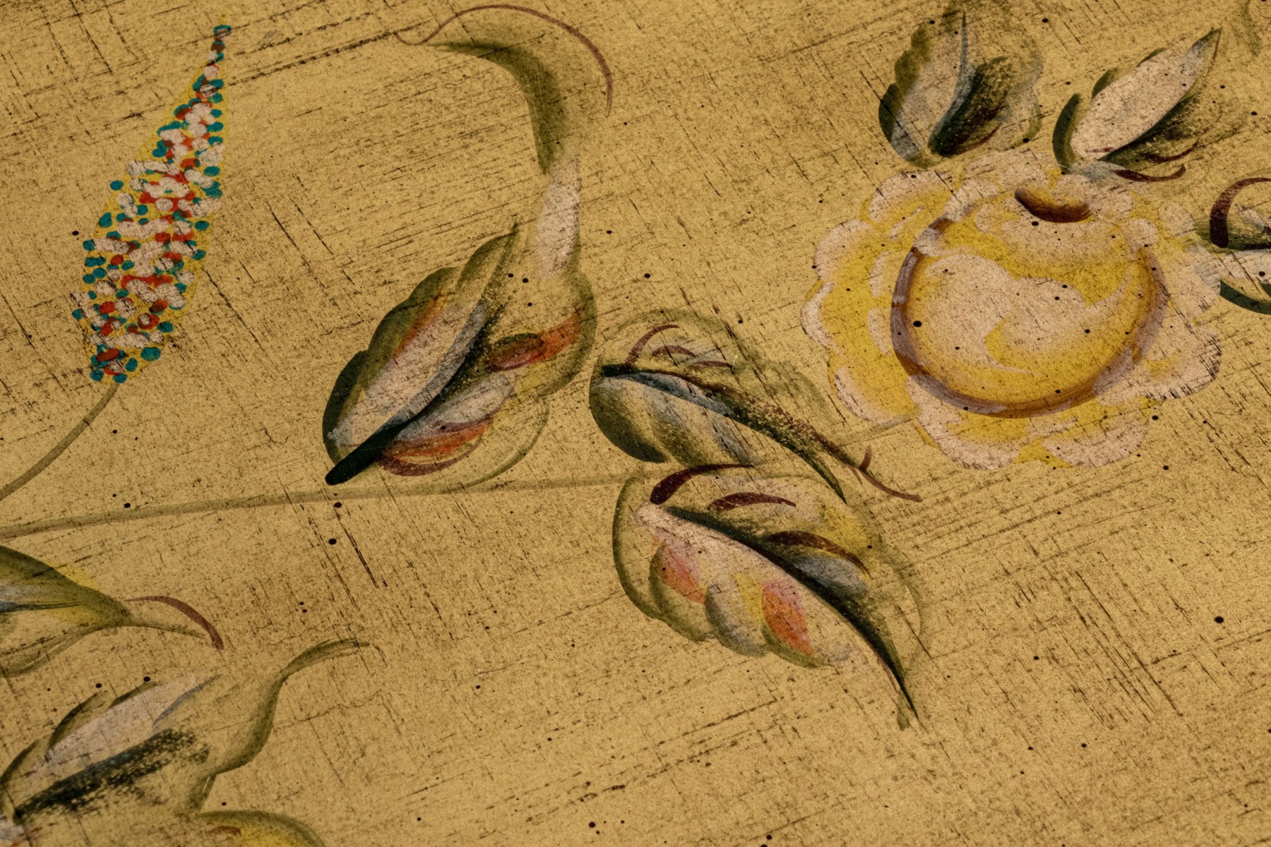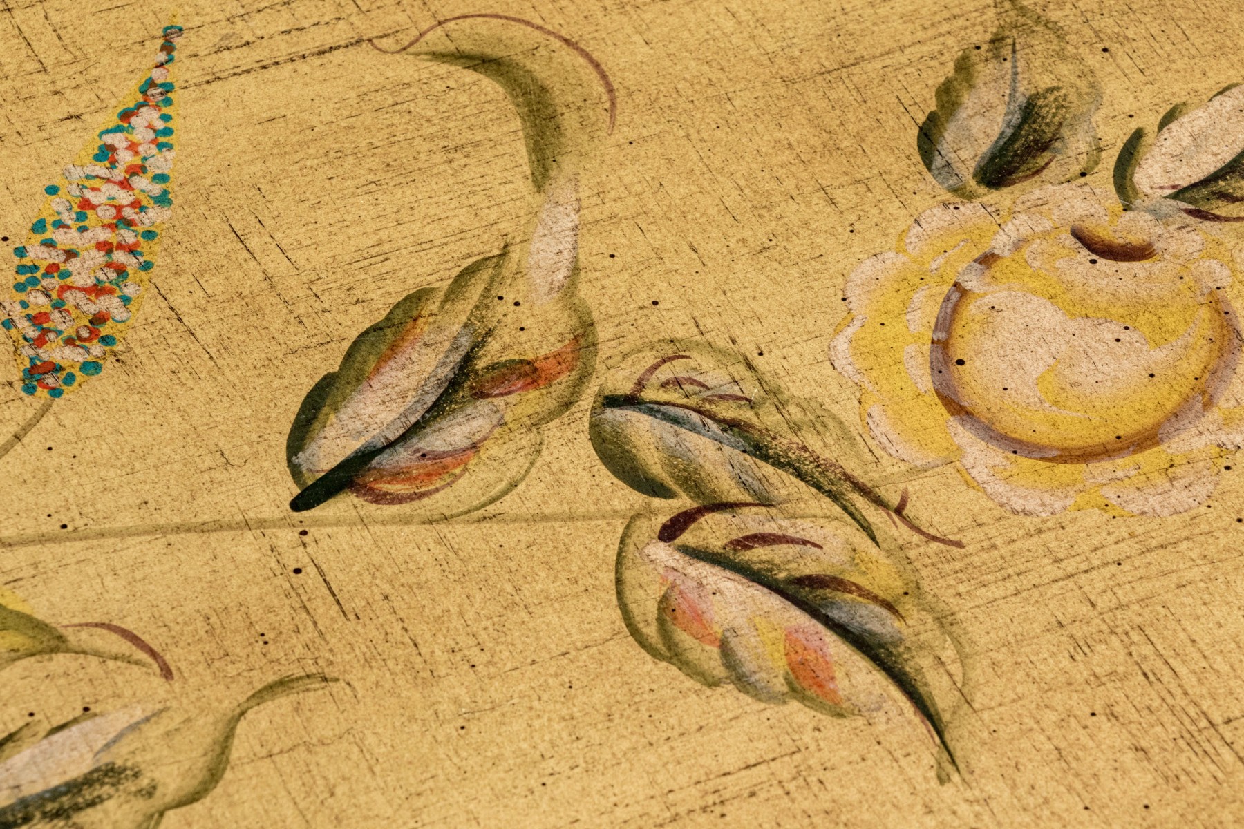 Raised on four turned and finished legs with contoured lower shelf with floral motifs painted to lower tiered shelf and upper table top.