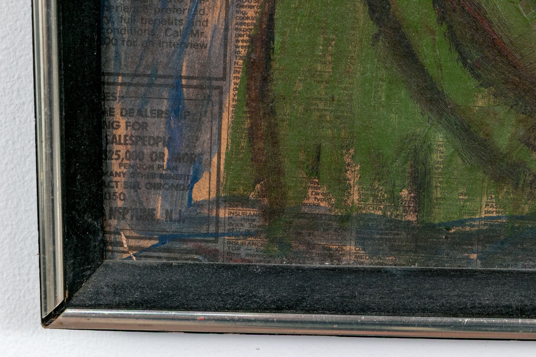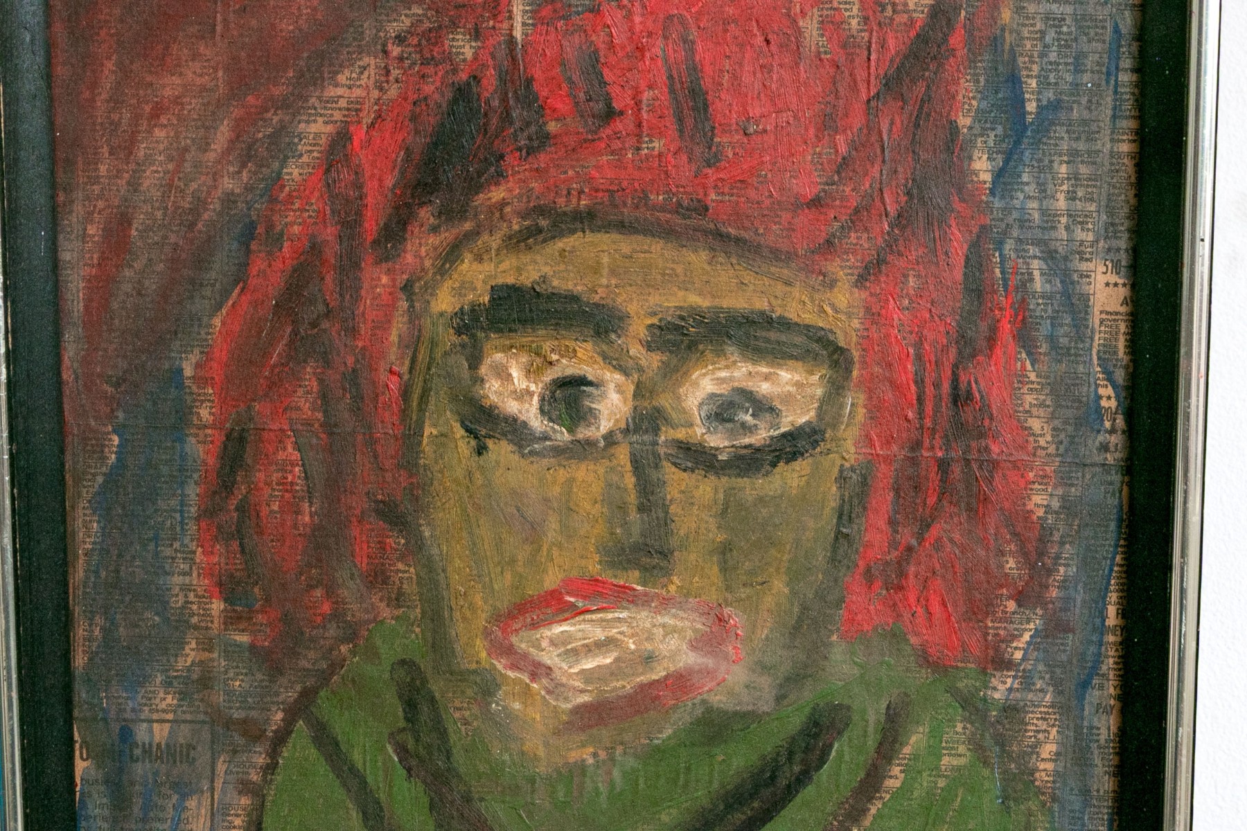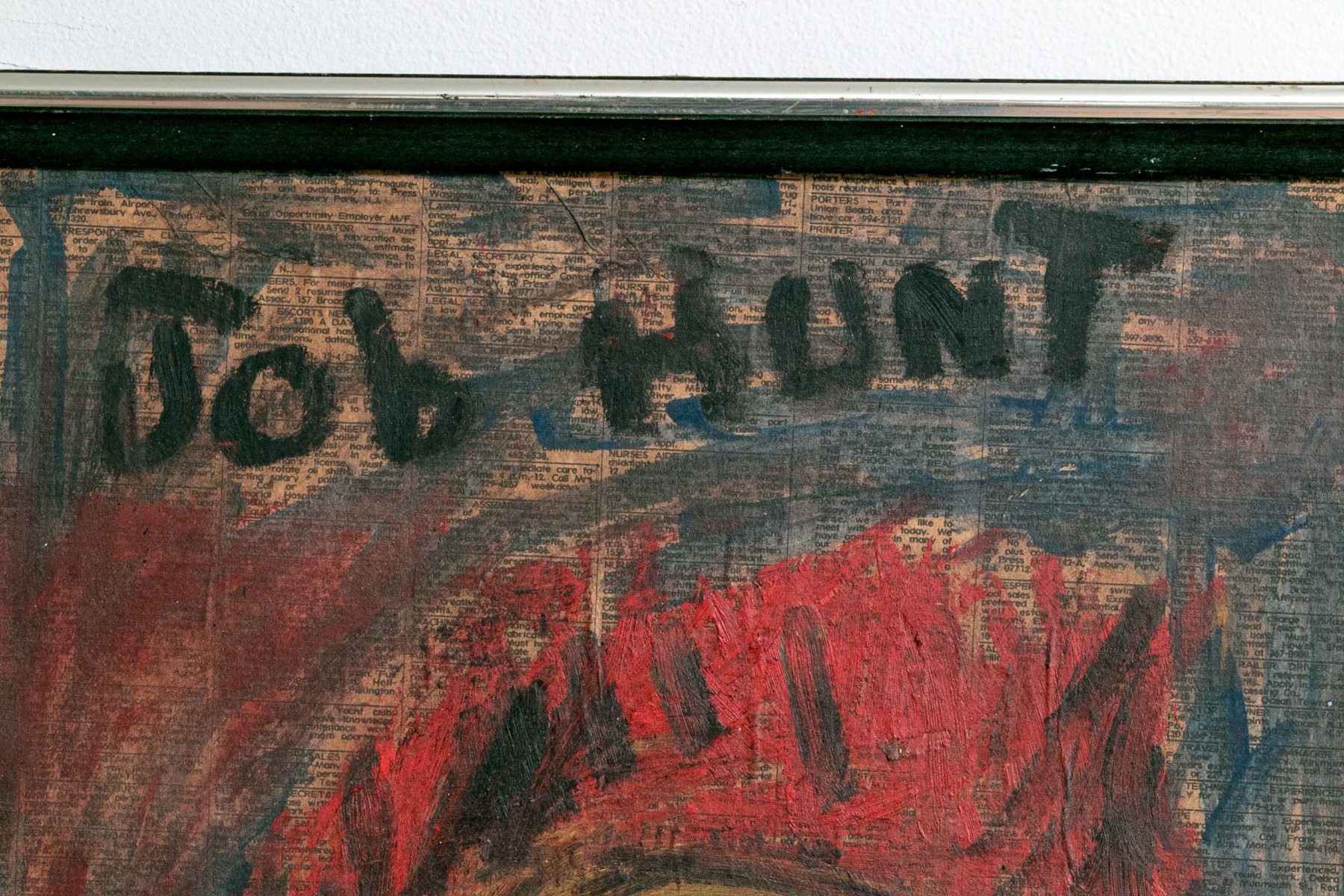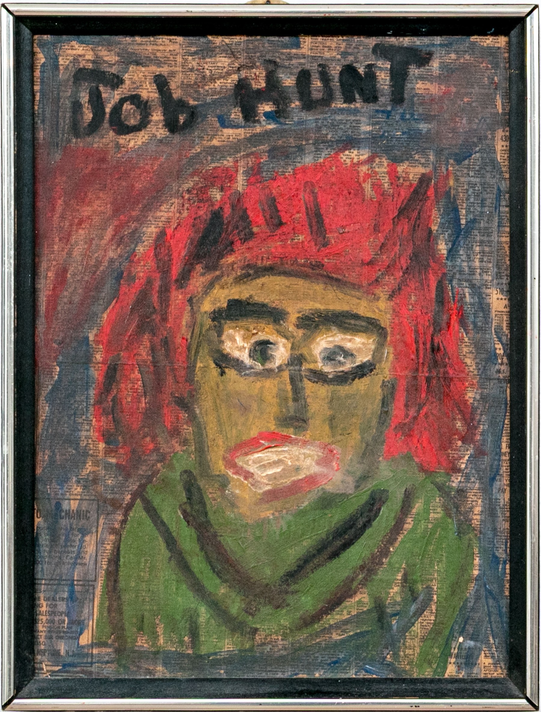 An evocative painting on newspaper mounted to board depicting a woman with fiery red hair and wide eyes wearing a green shirt against a blue and red ground with the phrase "Job Hunt" across the top, overlaying the classifieds section of a newspaper. Appears to be unsigned.