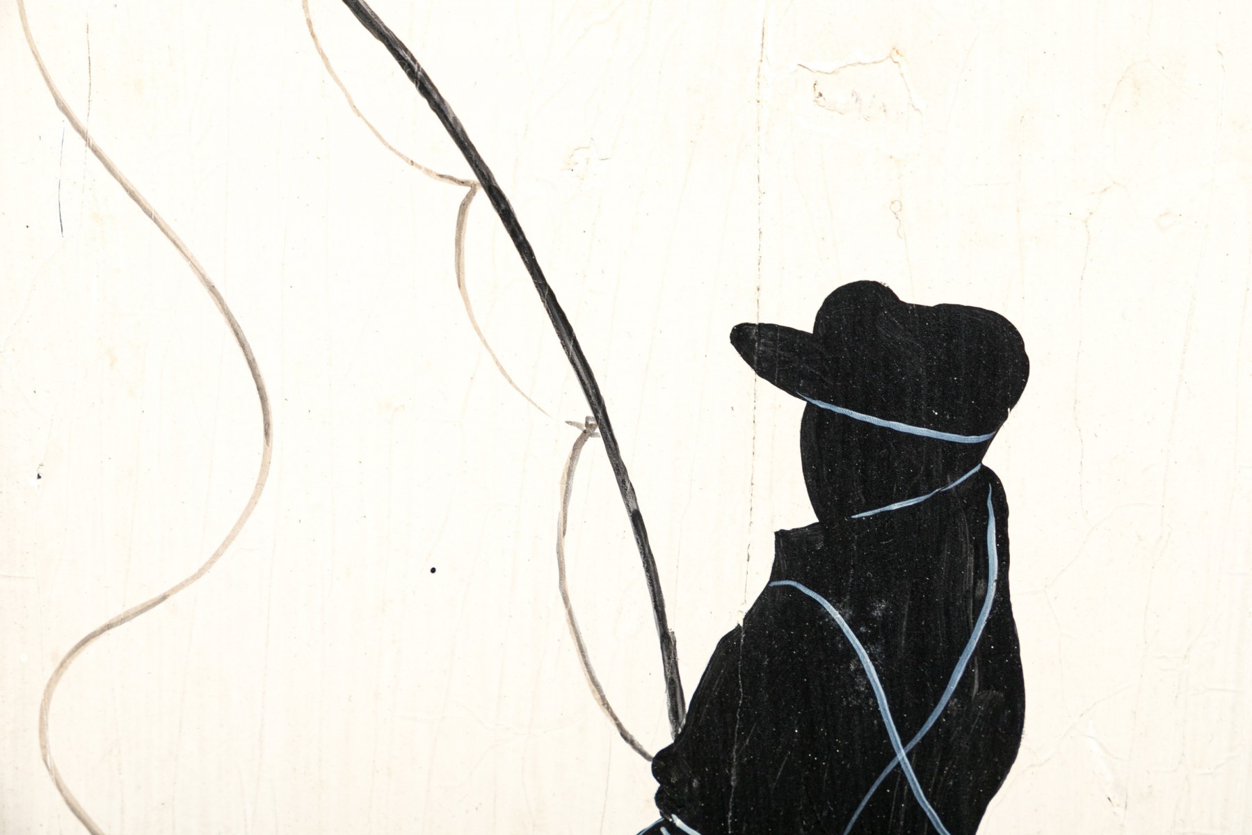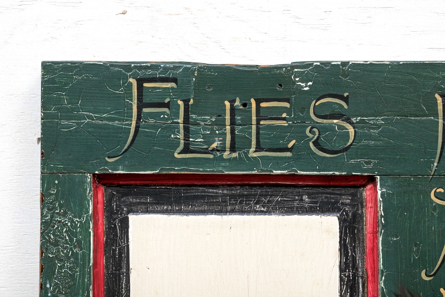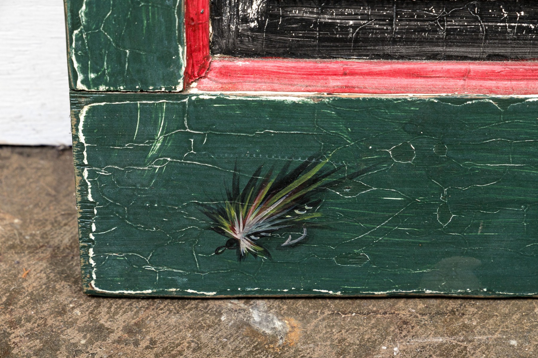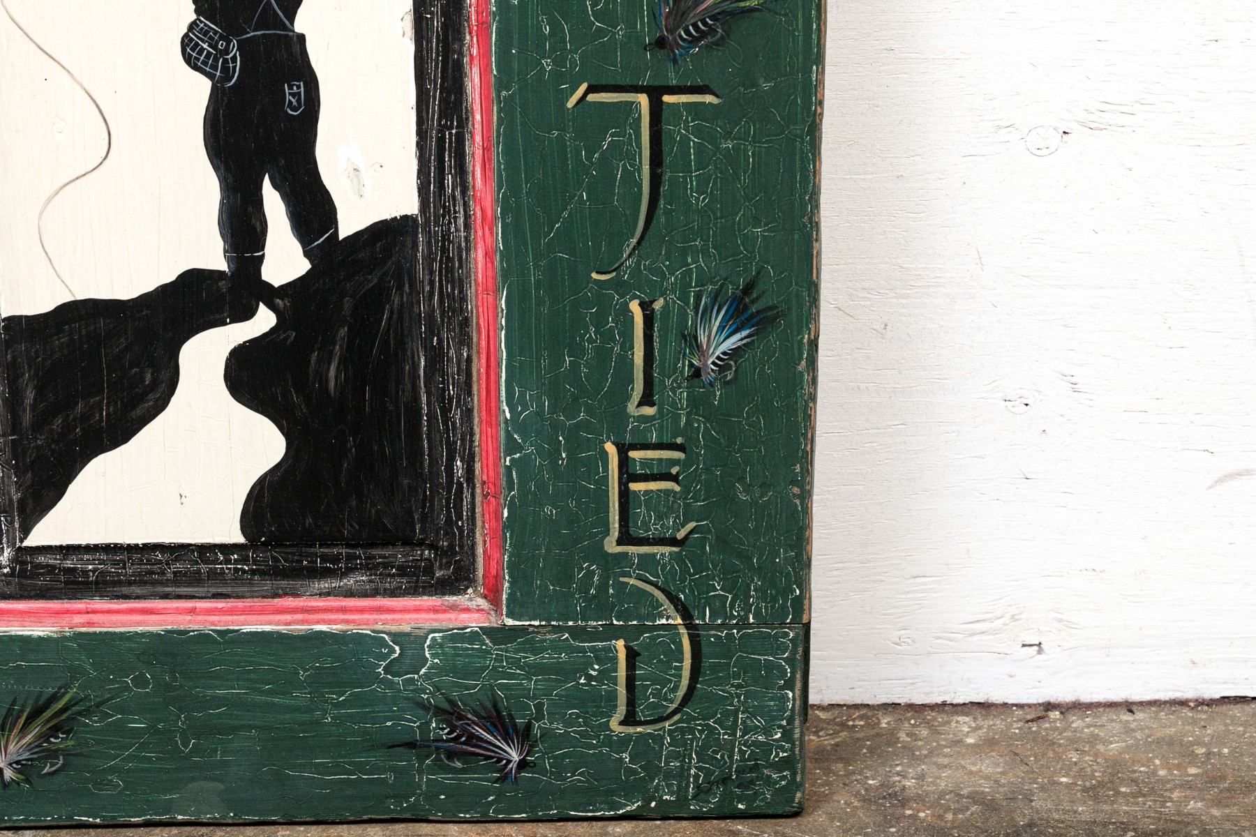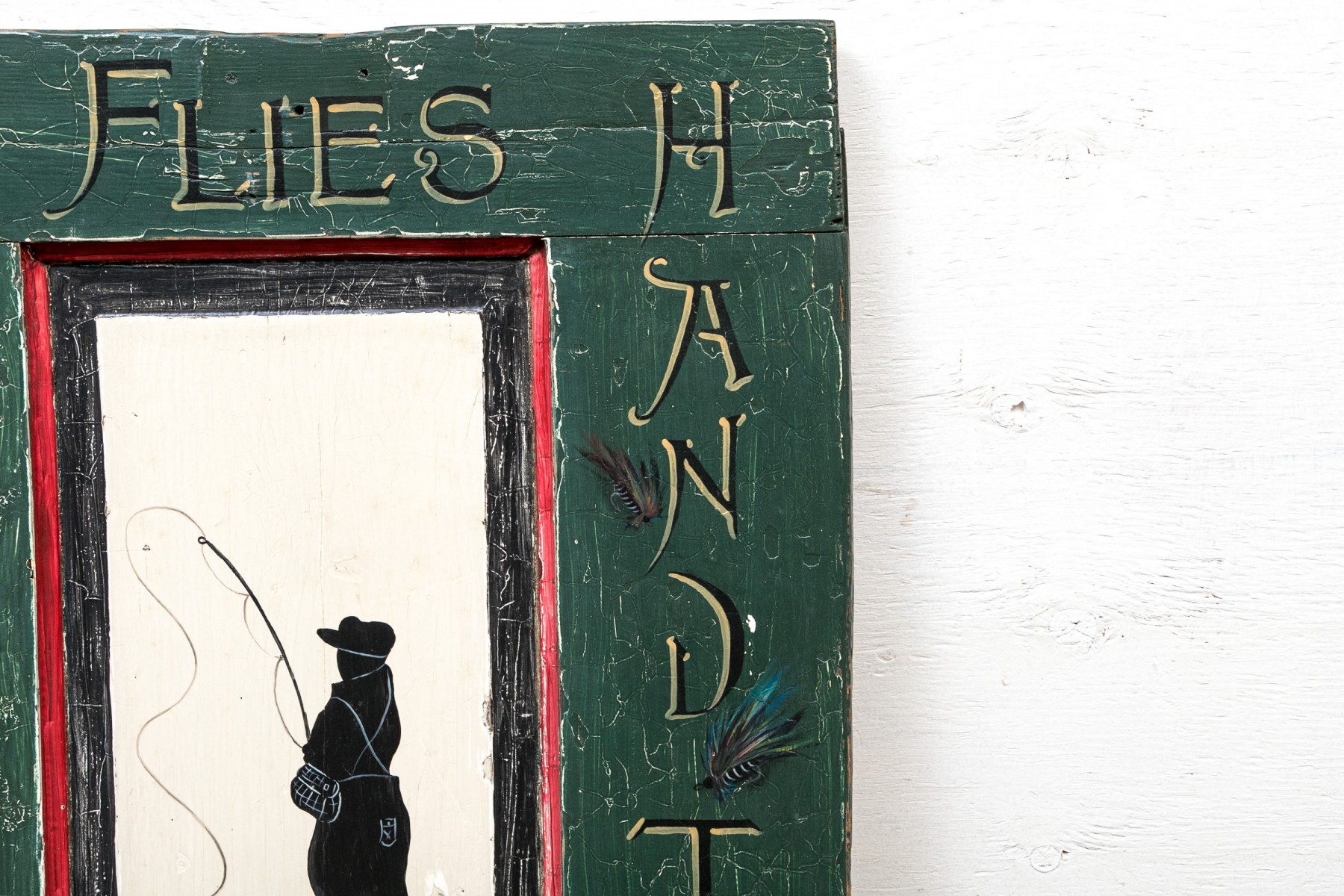 Featuring a fisherman at a stream with his rod with the advertisement on the margins. Unframed reused painted wooden panel.
