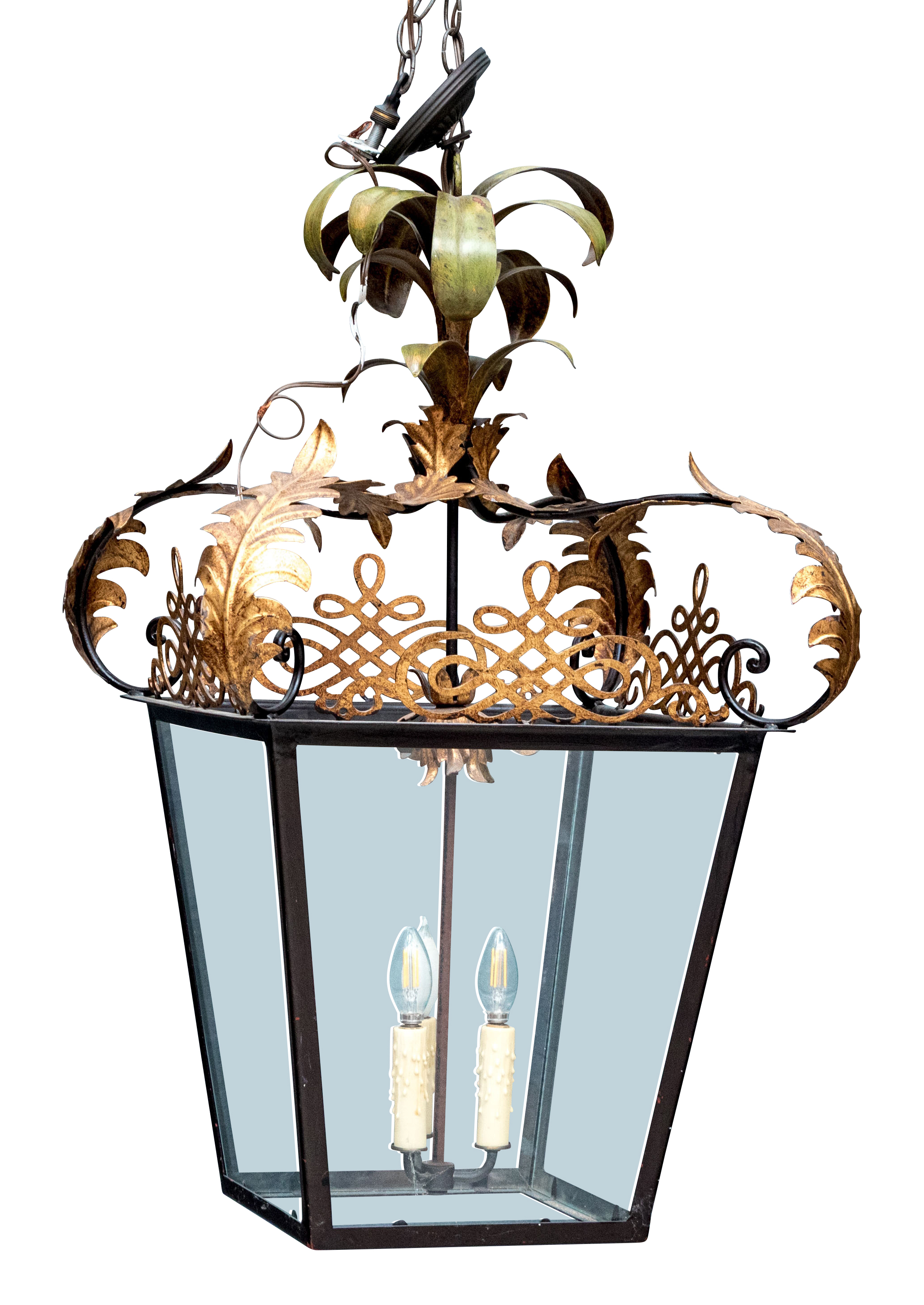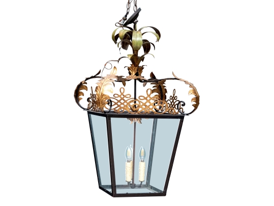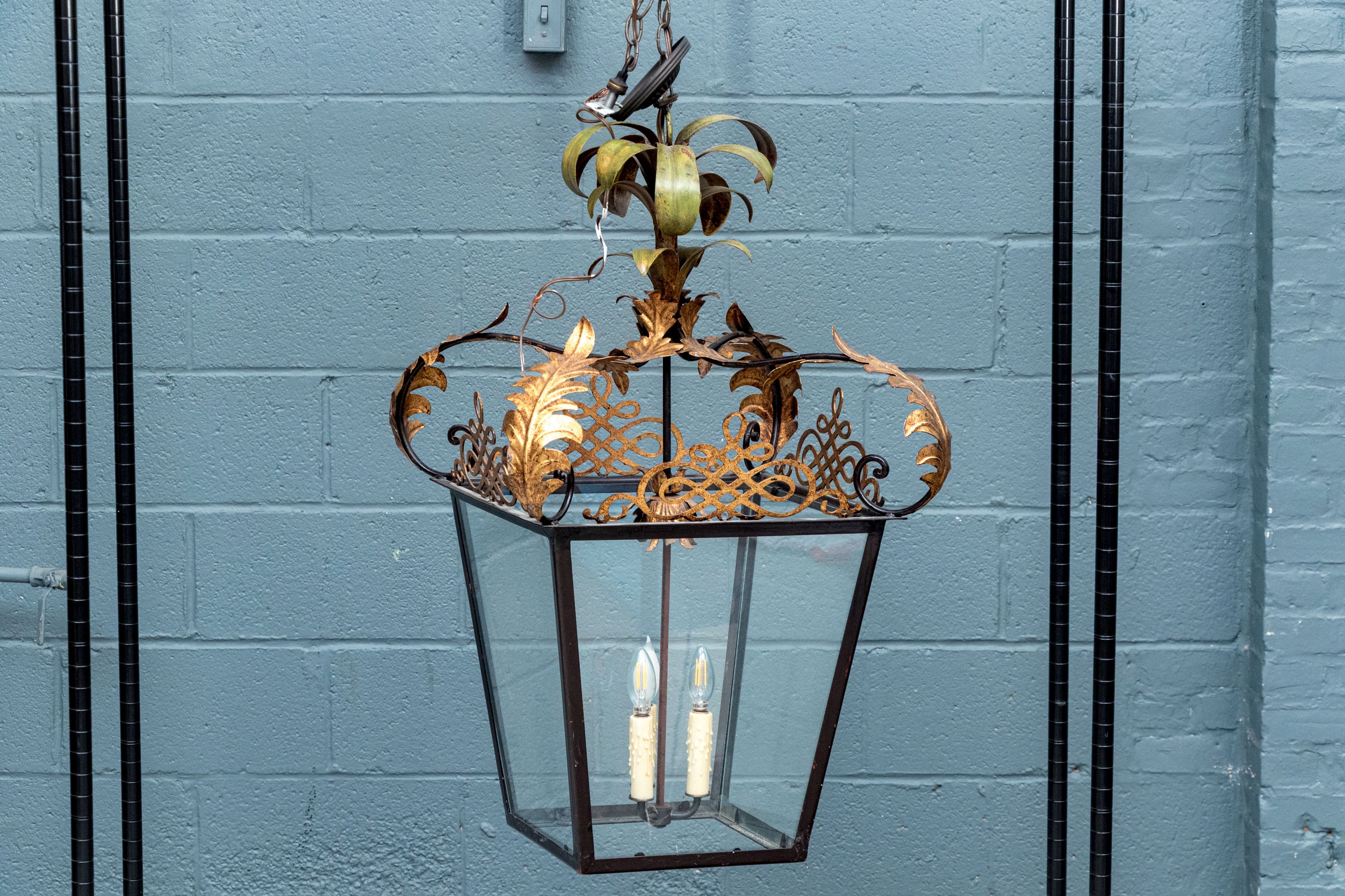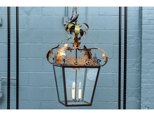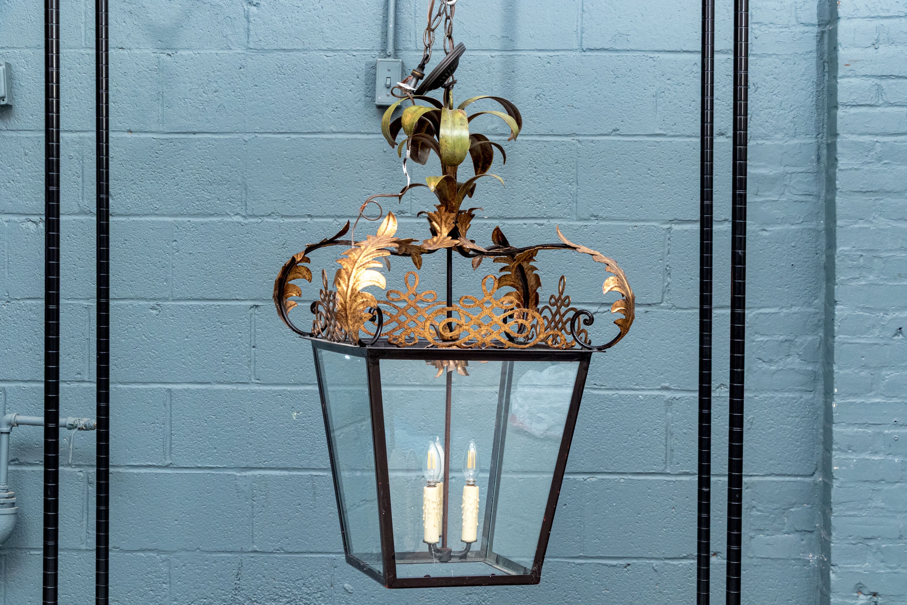 The elegant large scale three light lantern has a classic square glass and black painted frame. It is decorated with tiers of green painted leaves at the top over the large curved gilt acanthus leaves in an antique finish attached to the standard. Double gilt leaves decorate the center of the standard. The top of the frame has upright interlaced gilt panels on each side framing the whole. Along with a chain and ceiling plate.