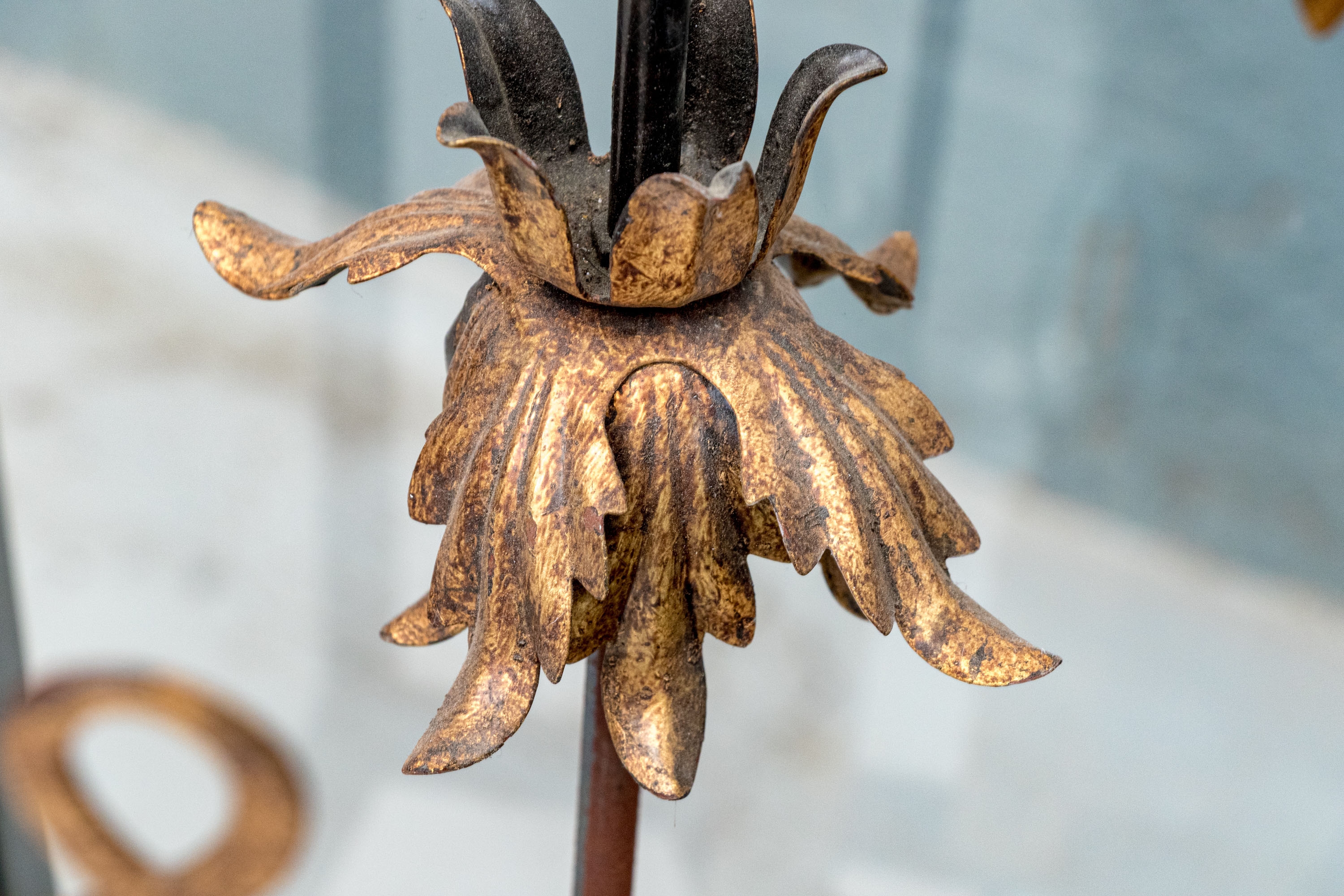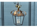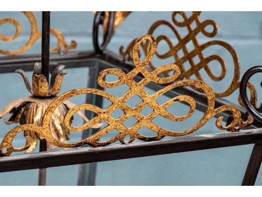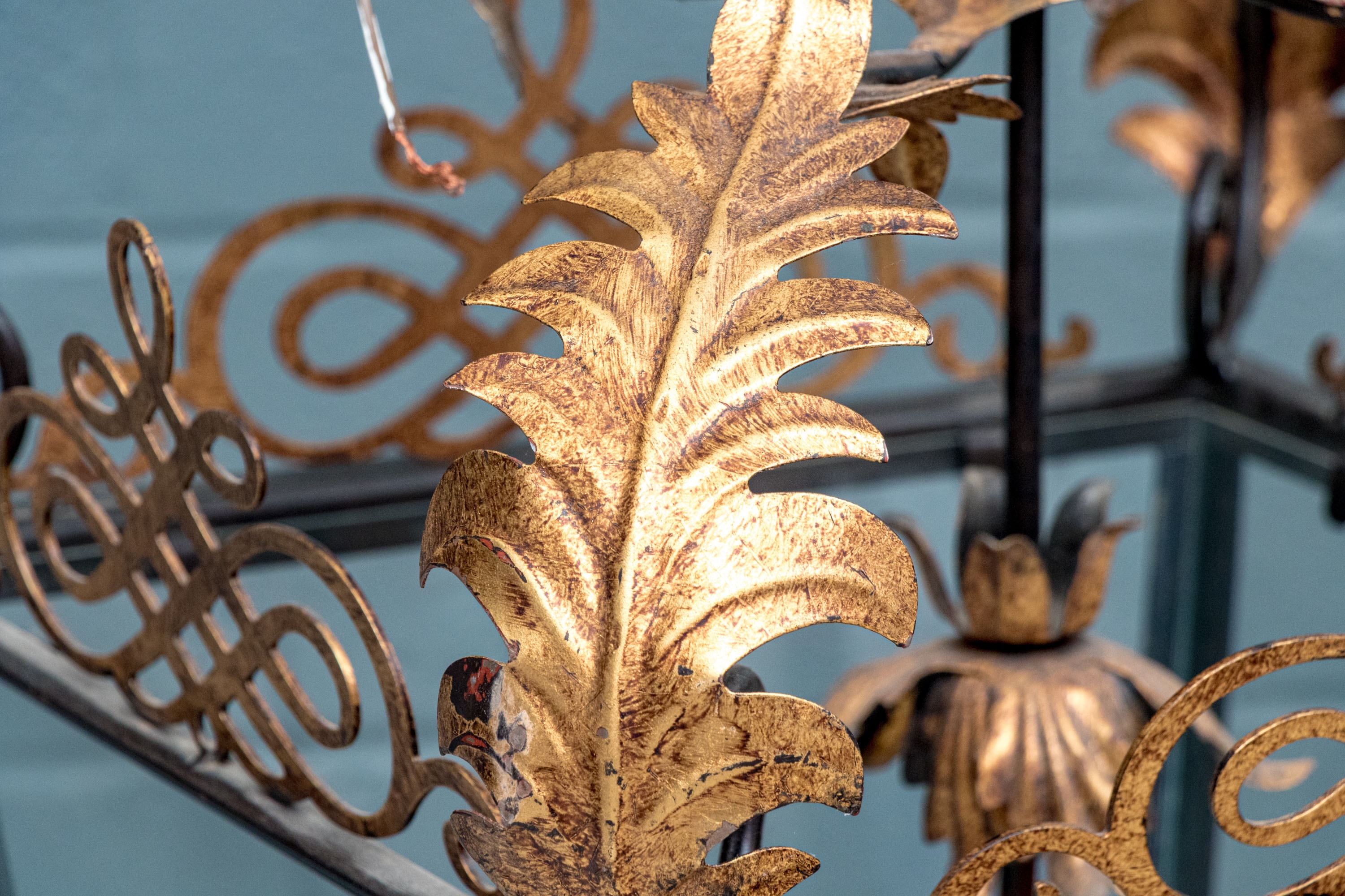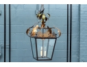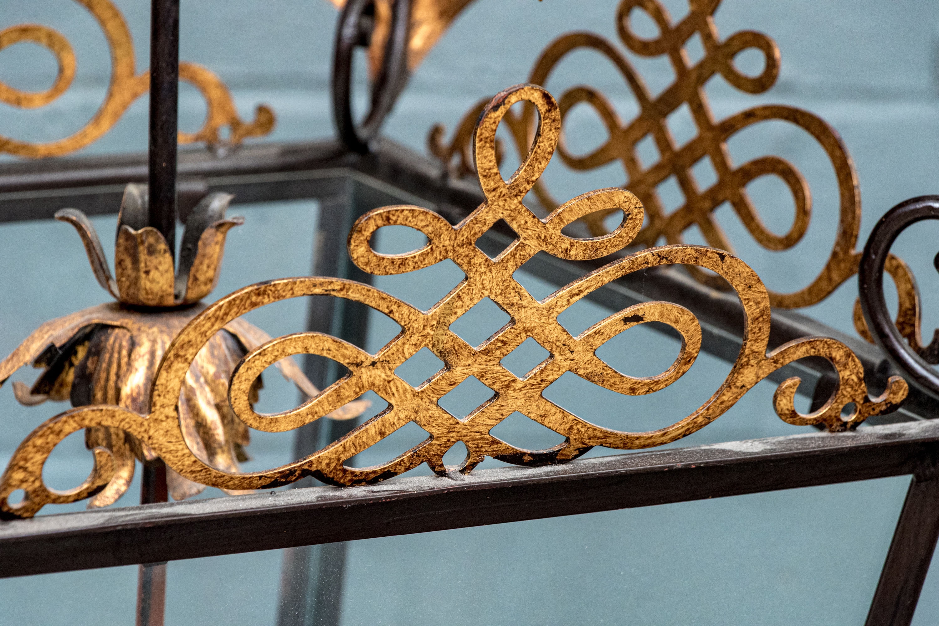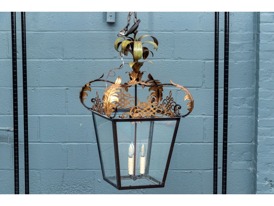 The elegant large scale three light lantern has a classic square glass and black painted frame. It is decorated with tiers of green painted leaves at the top over the large curved gilt acanthus leaves in an antique finish attached to the standard. Double gilt leaves decorate the center of the standard. The top of the frame has upright interlaced gilt panels on each side framing the whole. Along with a chain and ceiling plate.