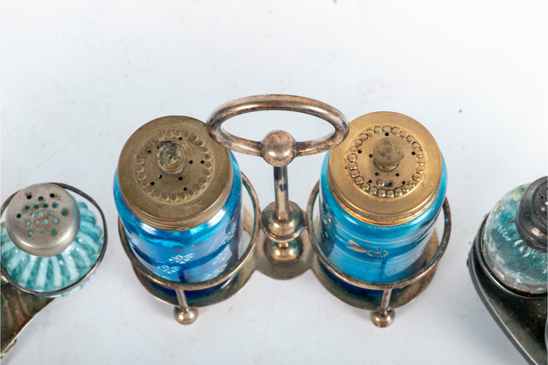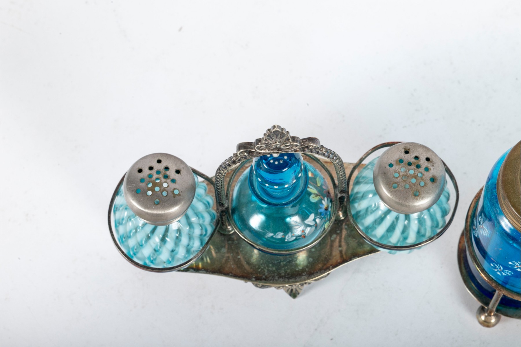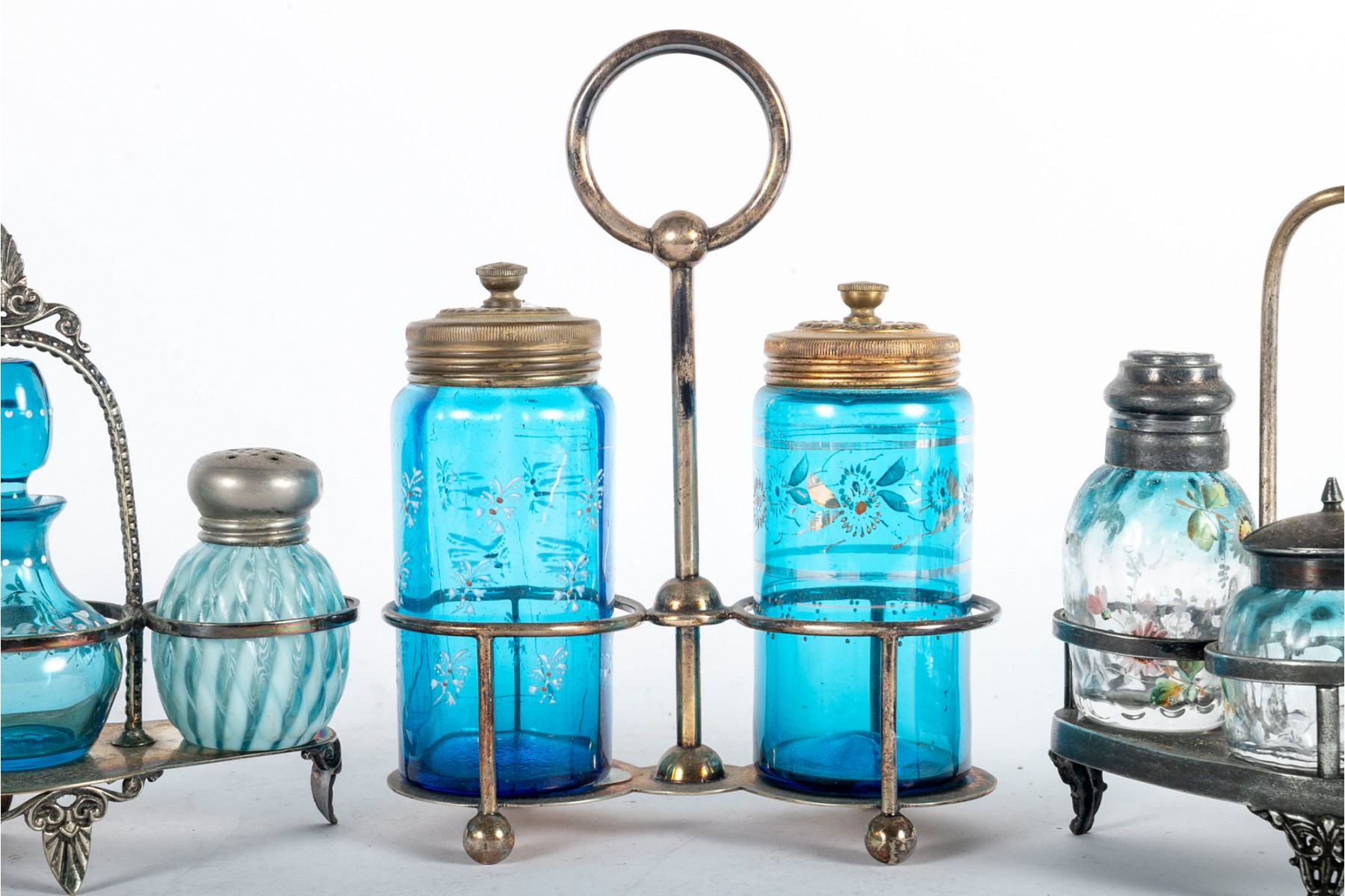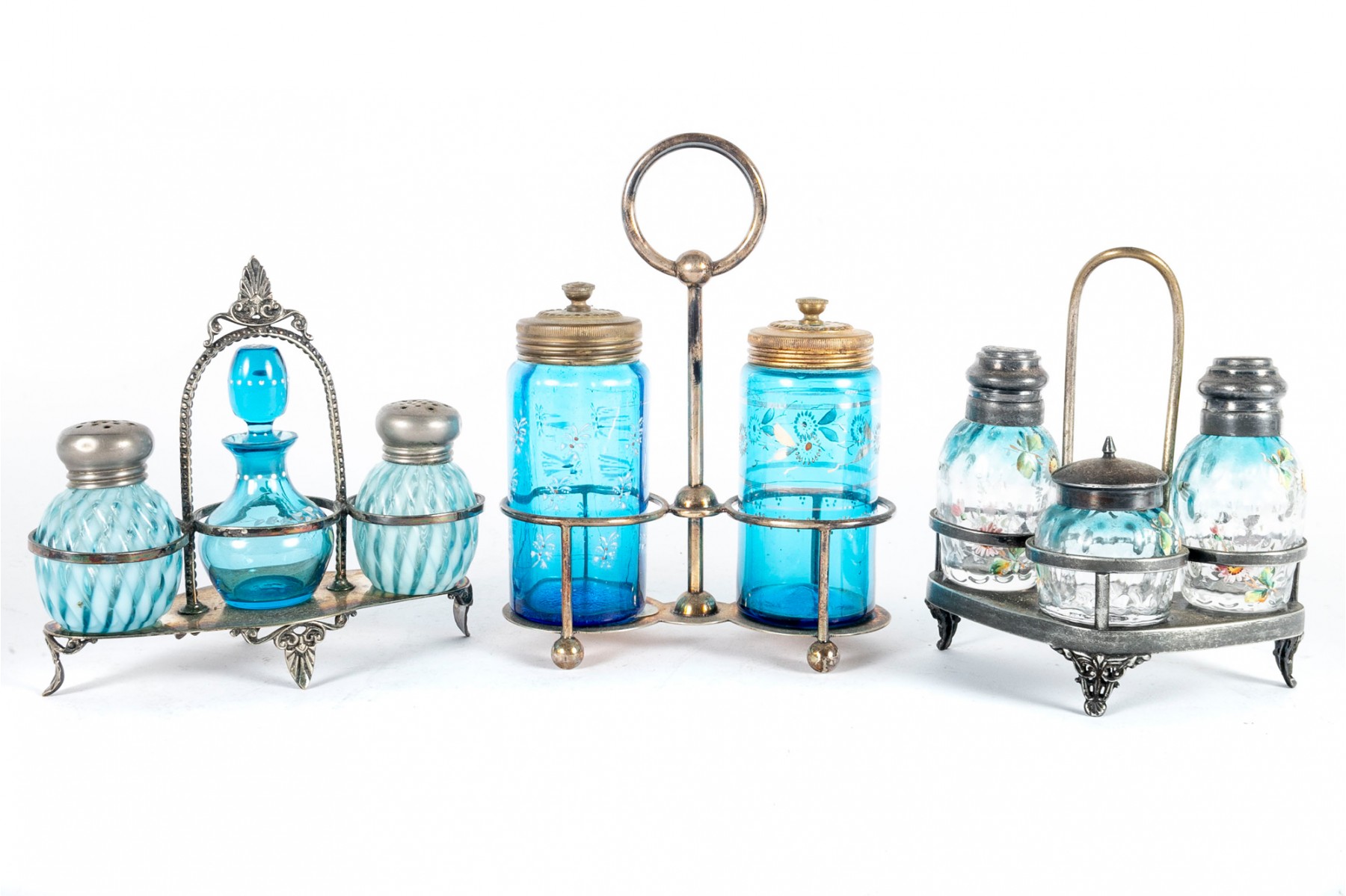 Three cruet sets displaying dainty hand-painted floral sprays over blue glass, in silverplated stands.