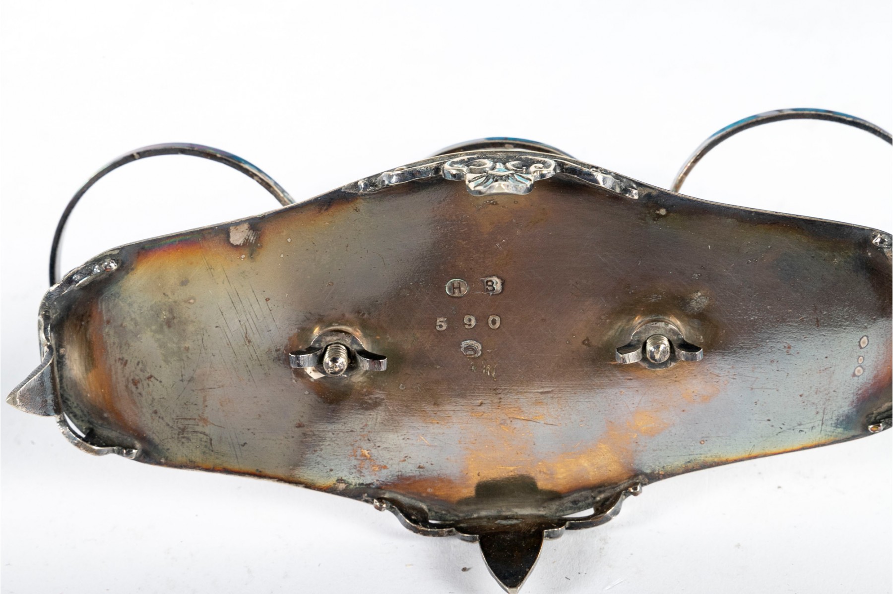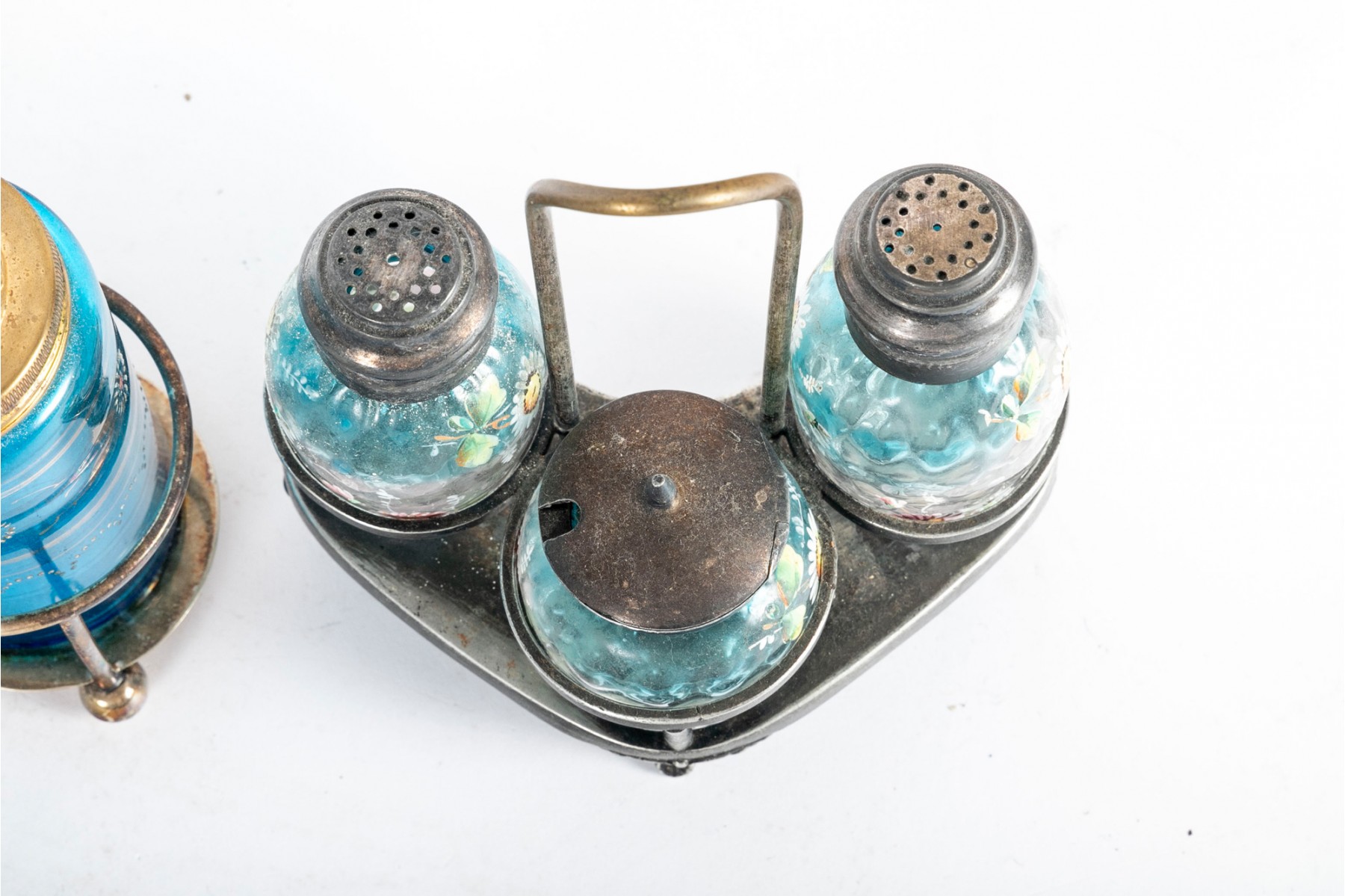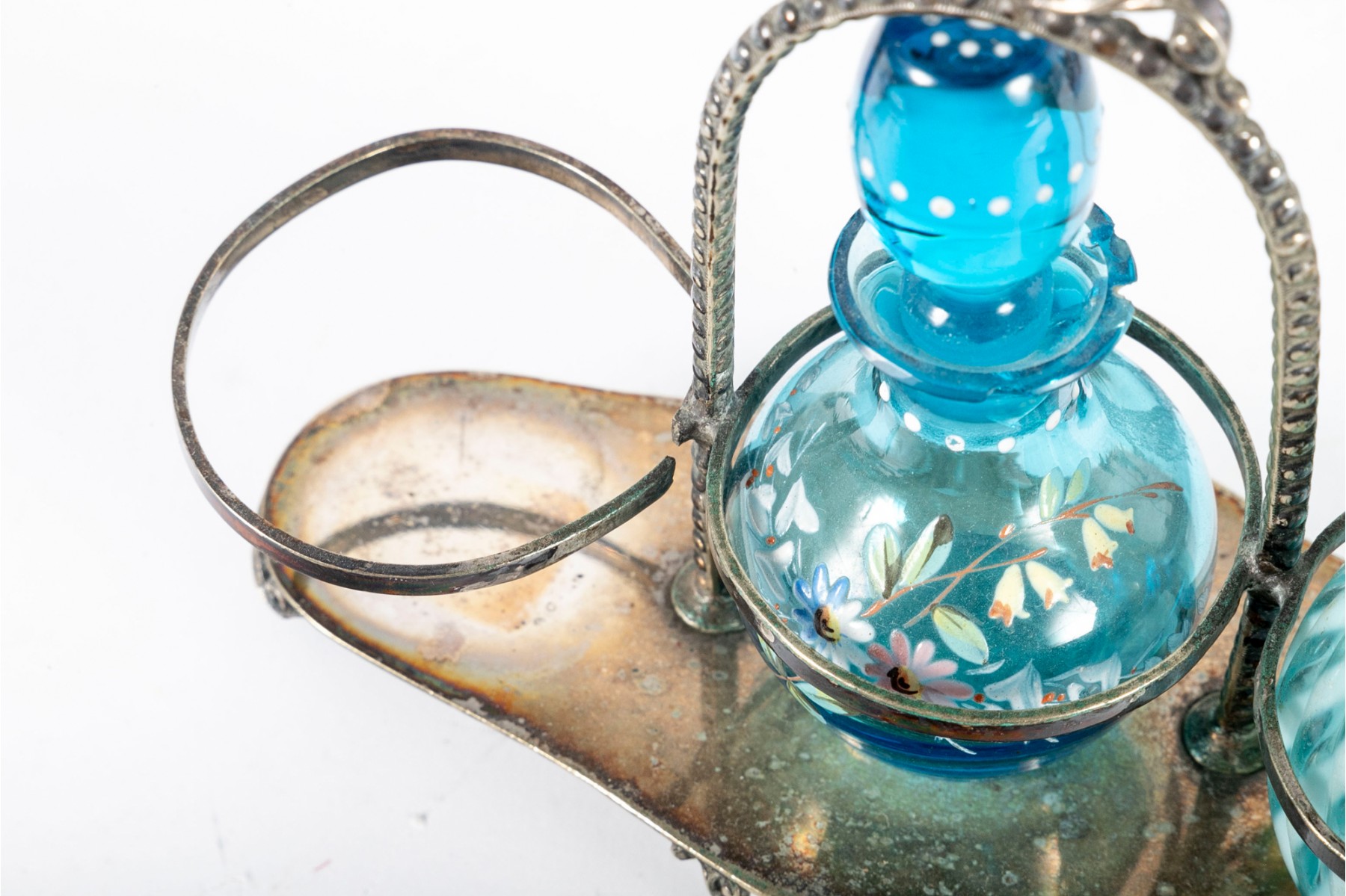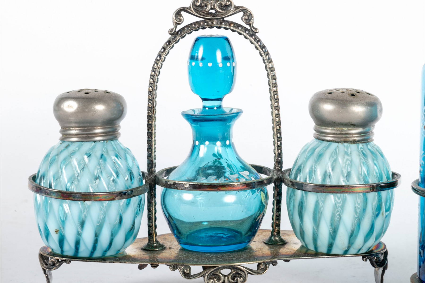 Three cruet sets displaying dainty hand-painted floral sprays over blue glass, in silverplated stands.