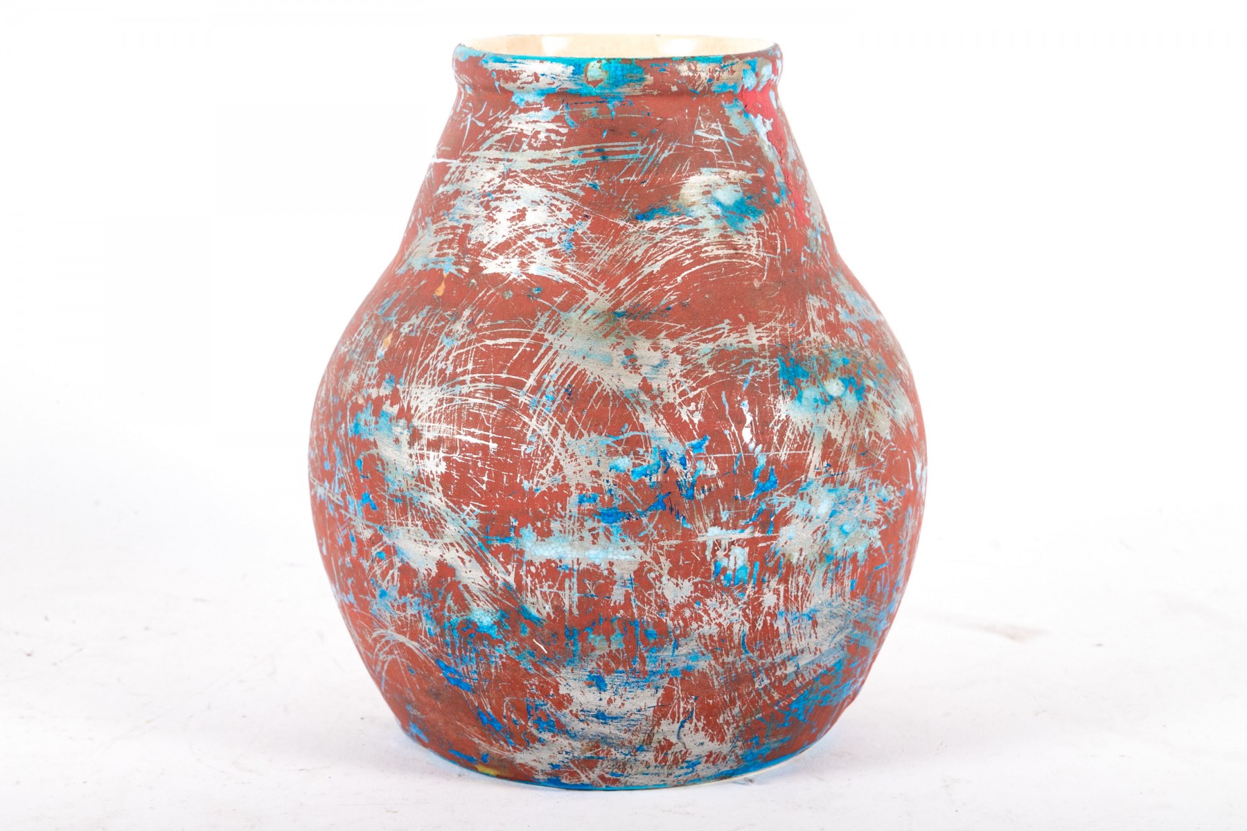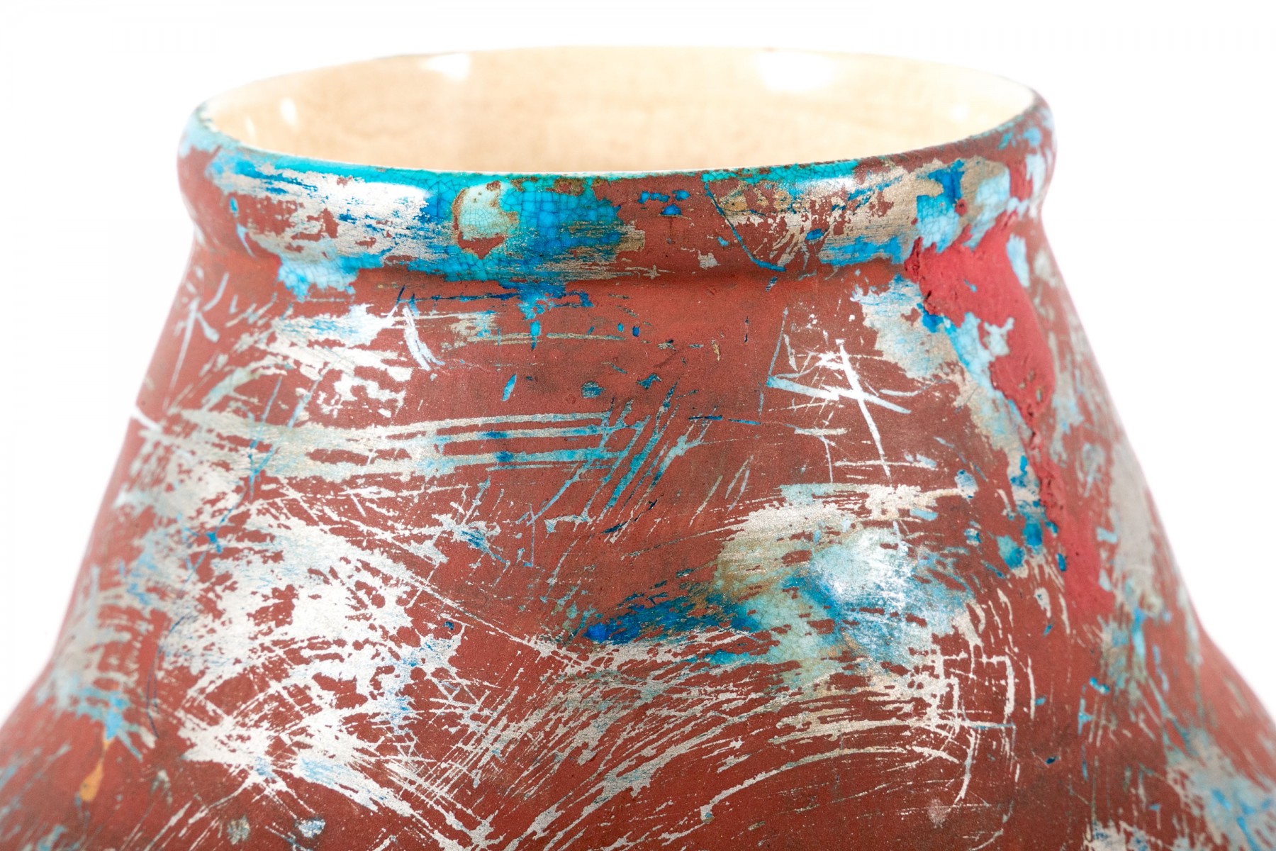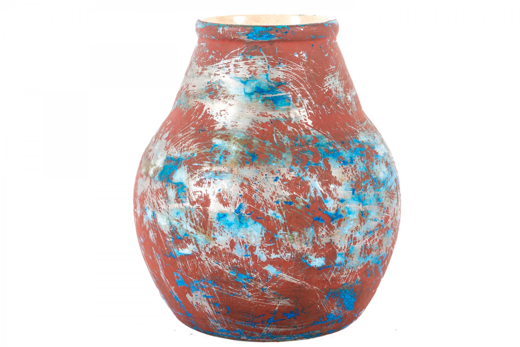 A Boch Freres Belgian ceramic vase, painted in matte oxblood red, metallic gray, and hints of bronzetone over a vibrant blue glaze. Finished with a cream interior. Marked on the underside.