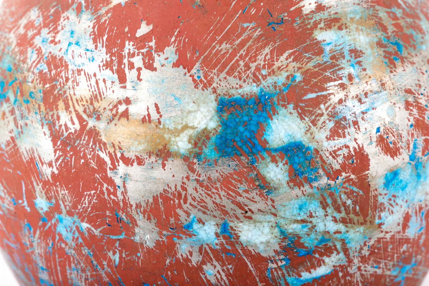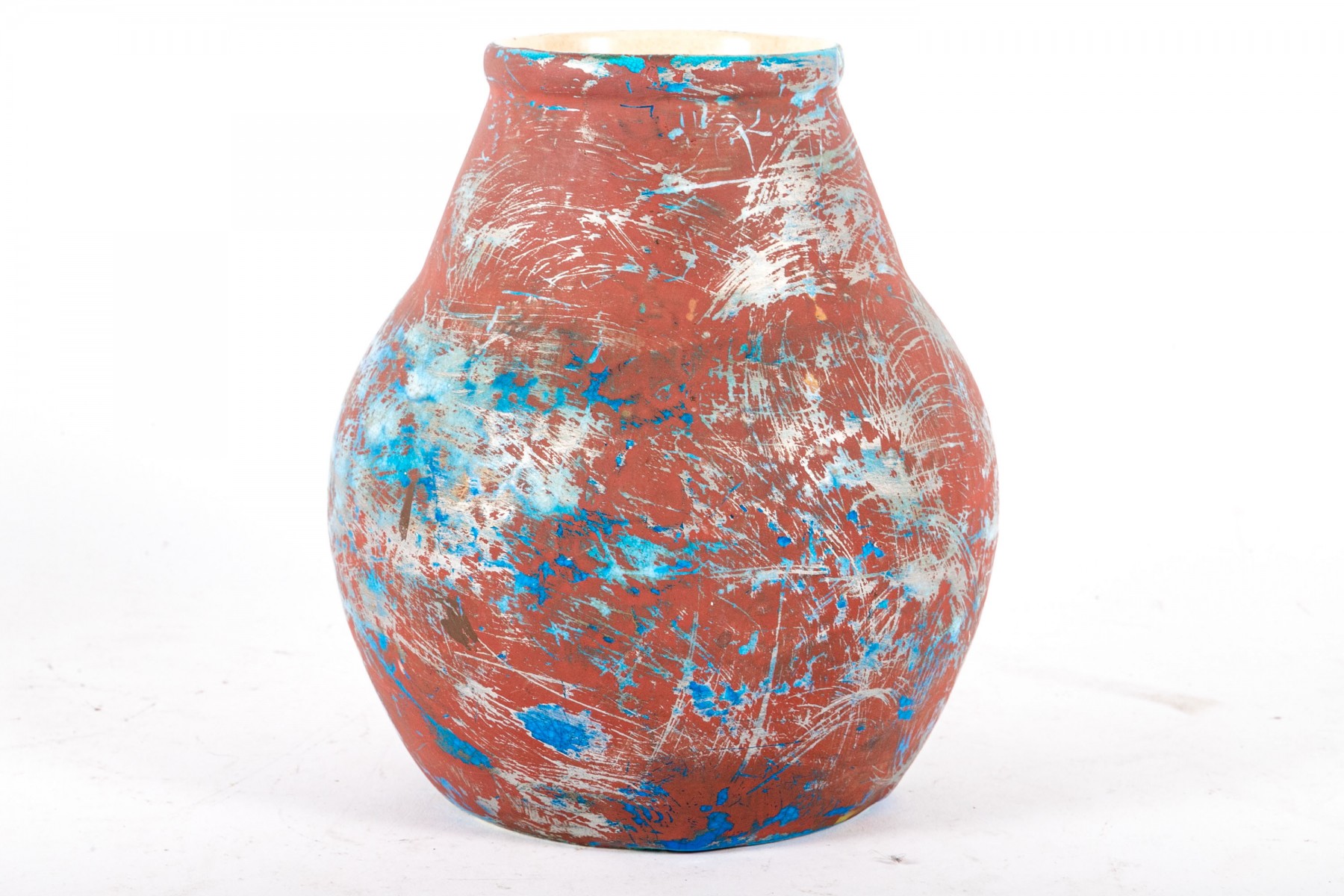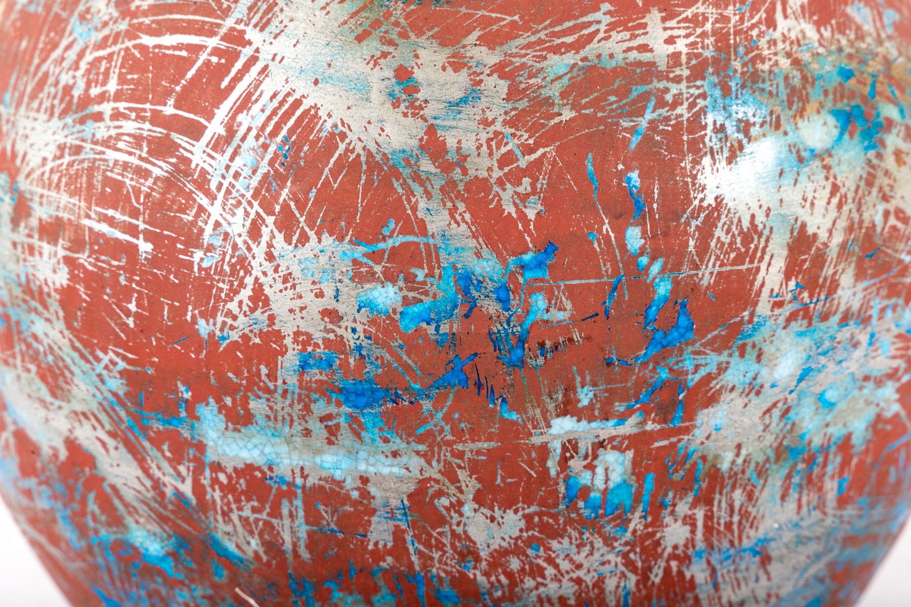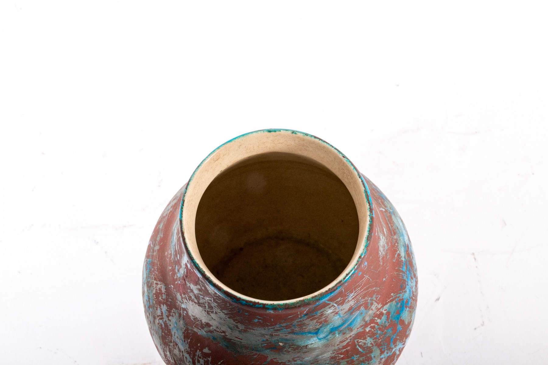 A Boch Freres Belgian ceramic vase, painted in matte oxblood red, metallic gray, and hints of bronzetone over a vibrant blue glaze. Finished with a cream interior. Marked on the underside.
