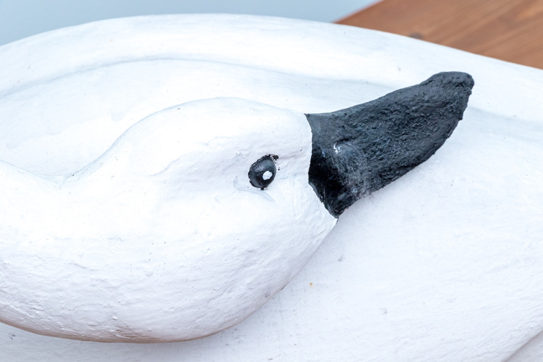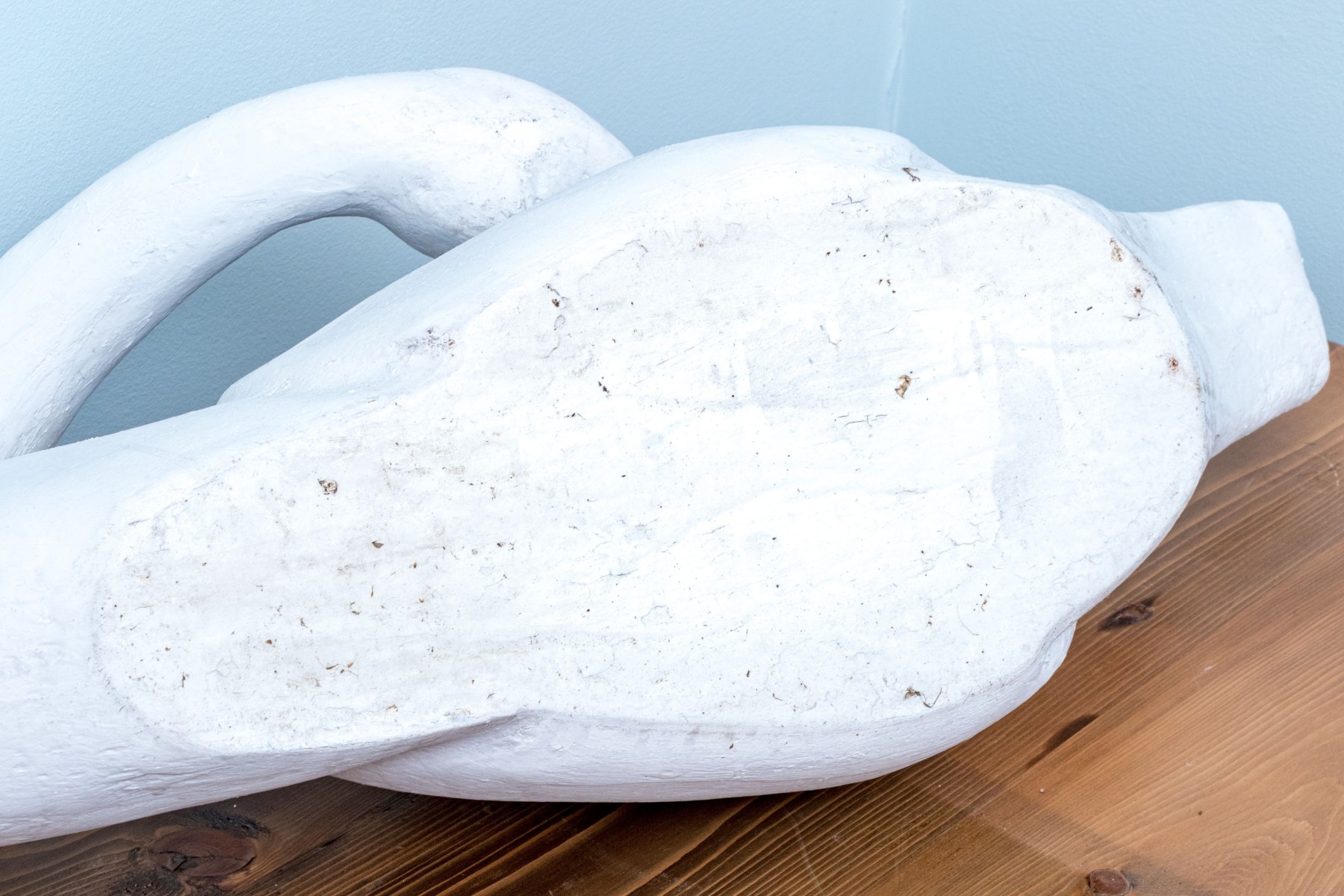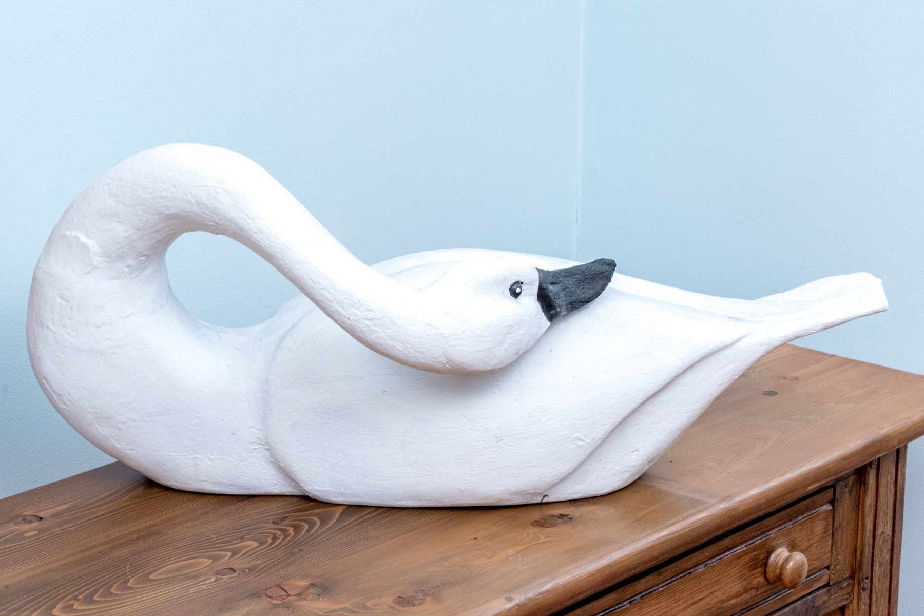 A delightful model or decoy of a swan in plaster/composite with a faux bois texture, painted clean white with a black beak and eyes. The swan elegantly poses with its beak resting on its wing, its long neck dramatically curved as it sits with its wings tucked by its sides and short tail flared.