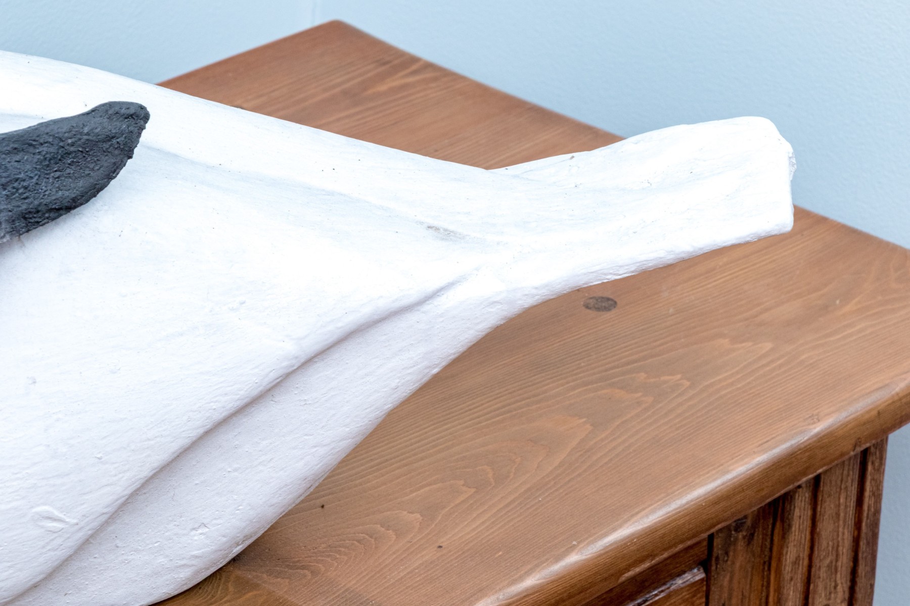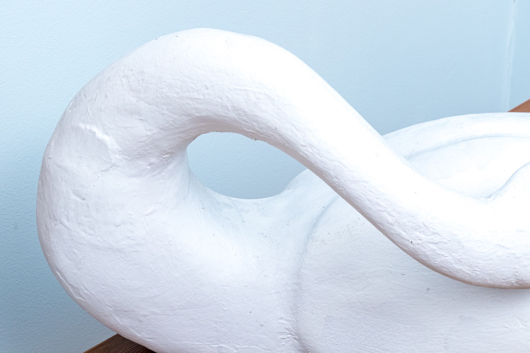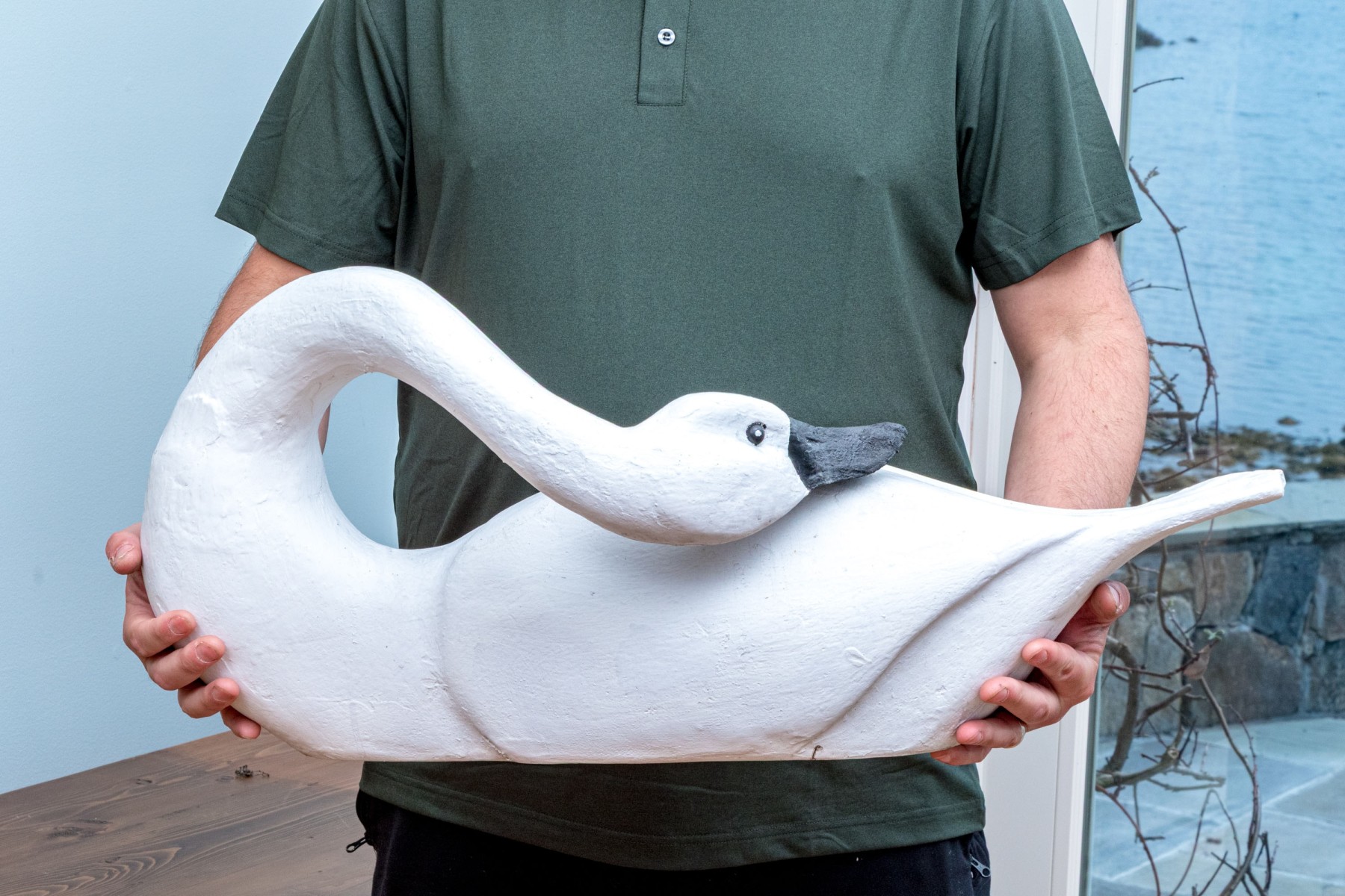 A delightful model or decoy of a swan in plaster/composite with a faux bois texture, painted clean white with a black beak and eyes. The swan elegantly poses with its beak resting on its wing, its long neck dramatically curved as it sits with its wings tucked by its sides and short tail flared.
